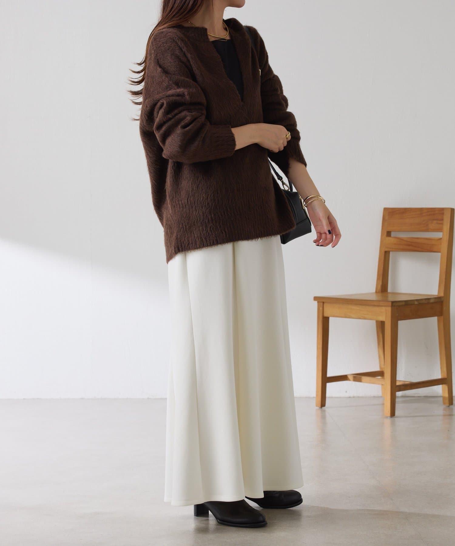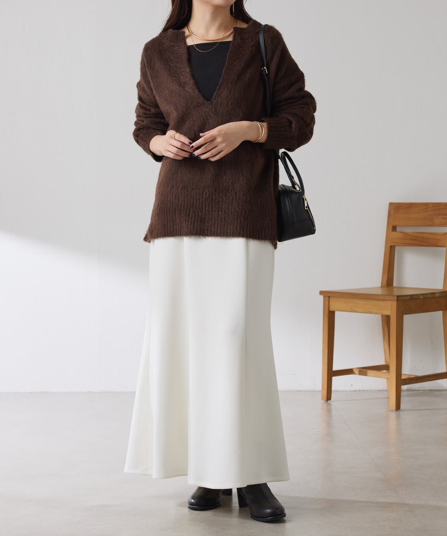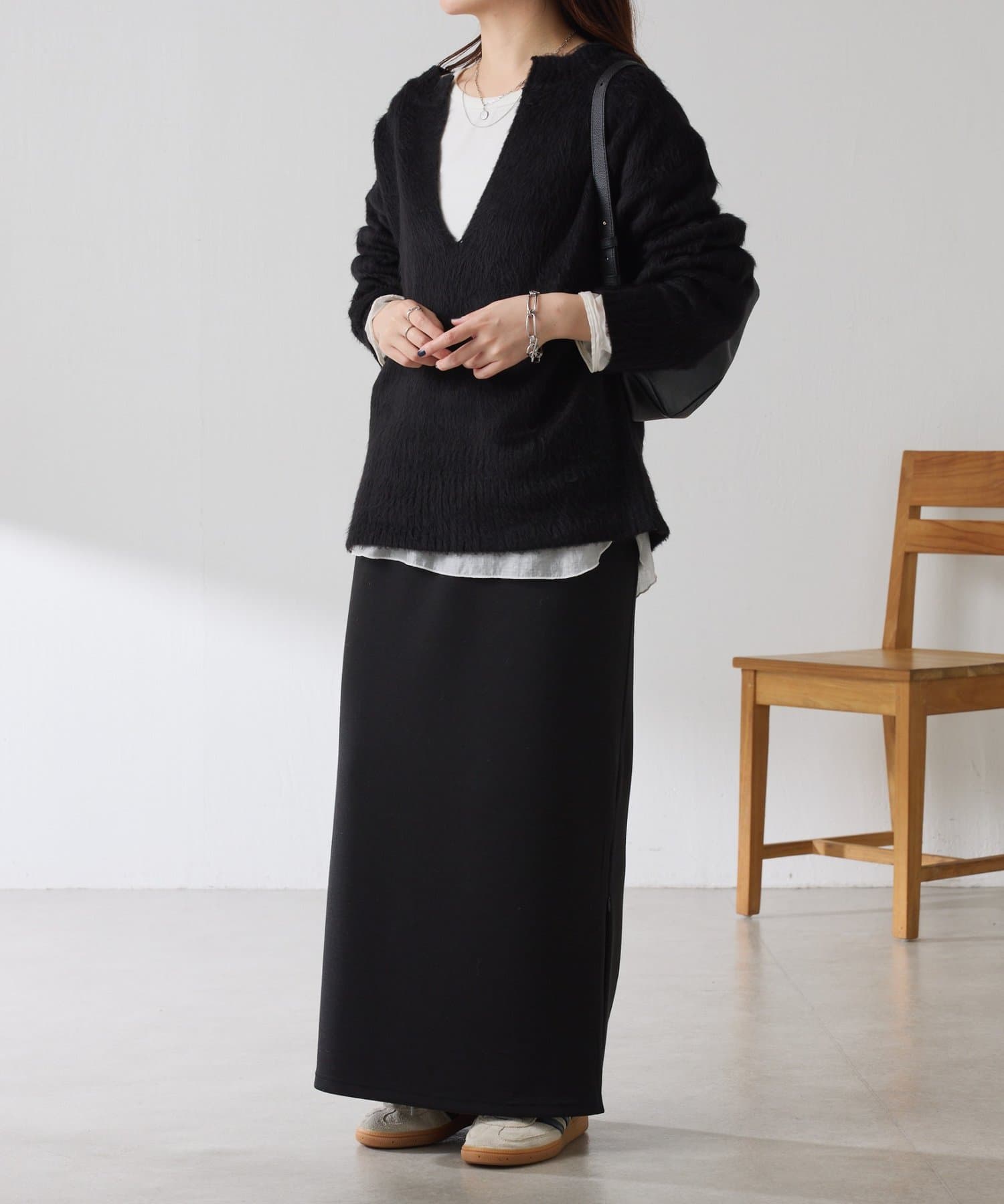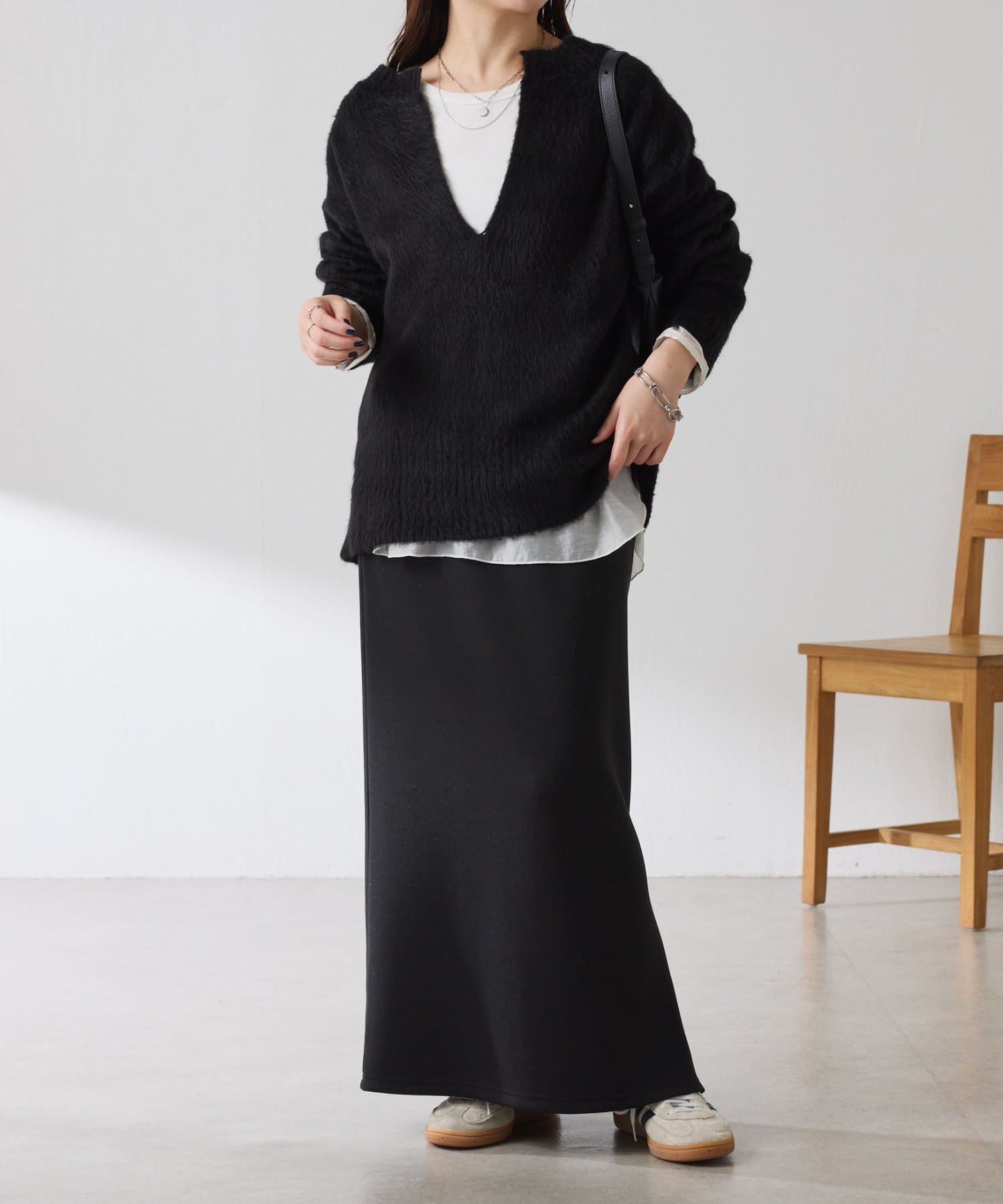 ・とにかく軽いエアリーな糸を使用した深Vニット。着ぶくれ感もなく、ストレスフリーな着心地です。