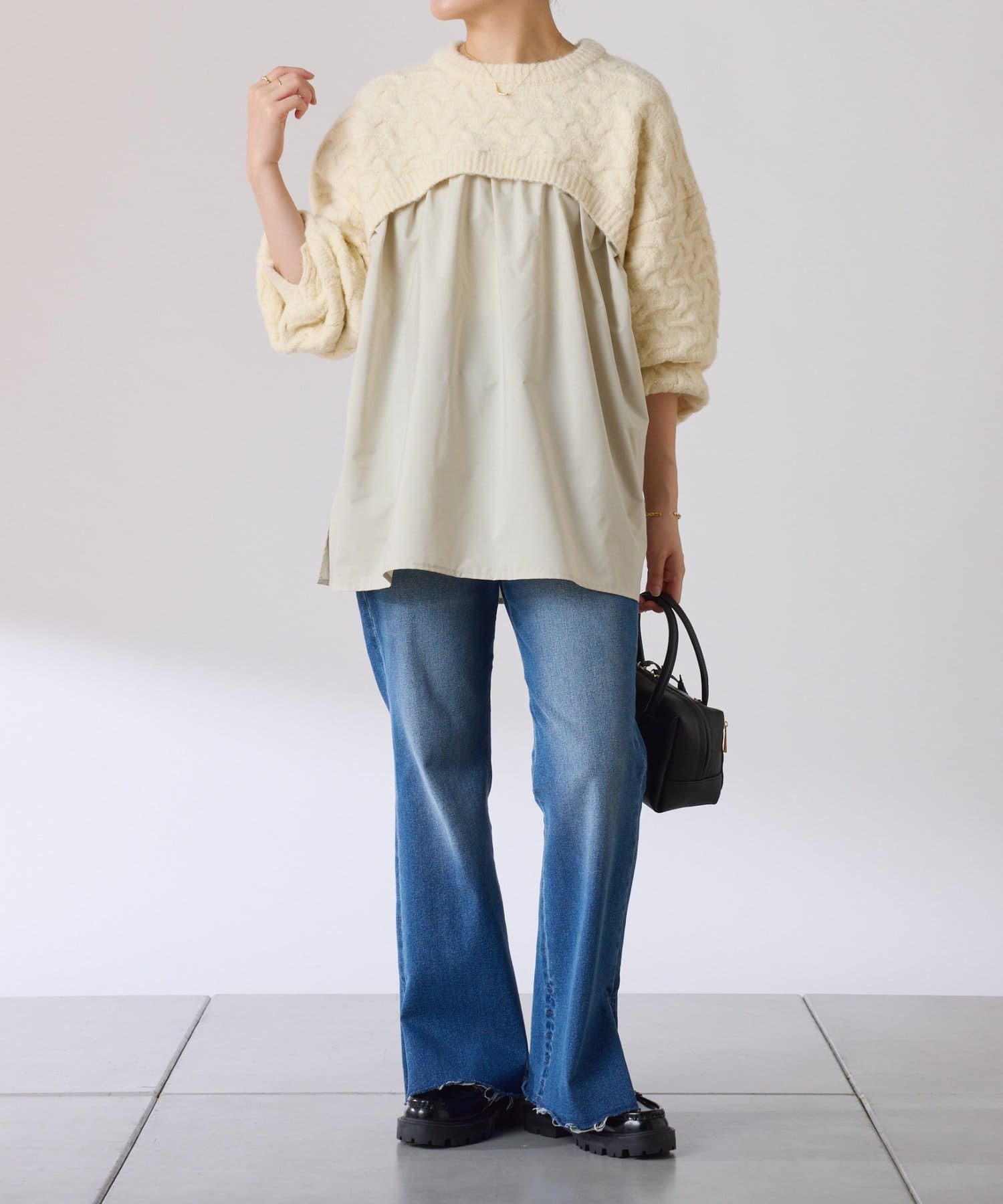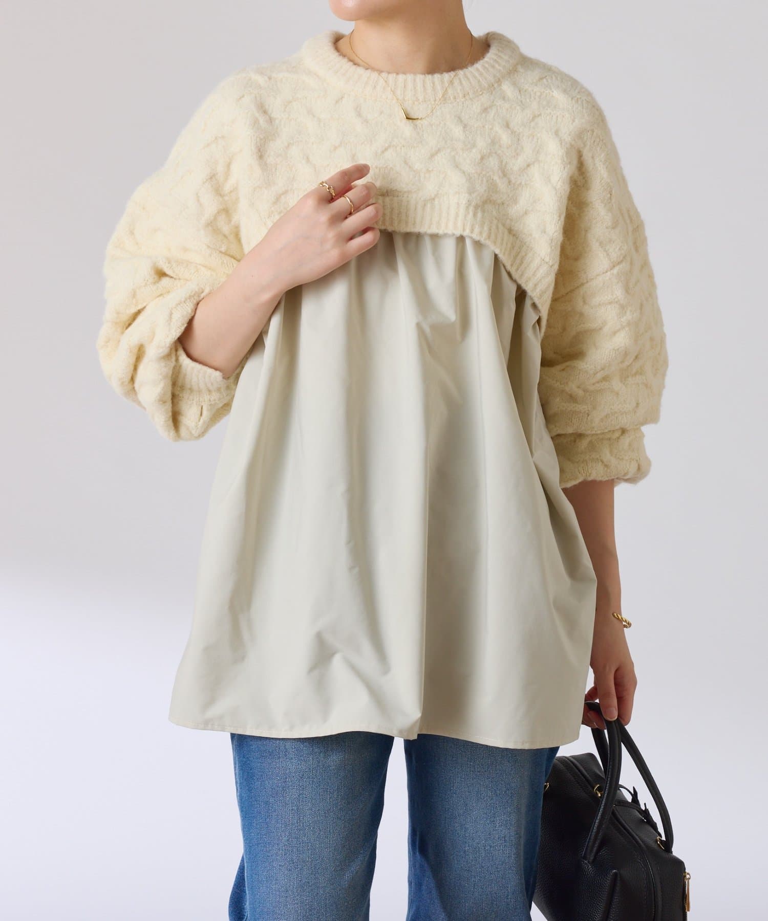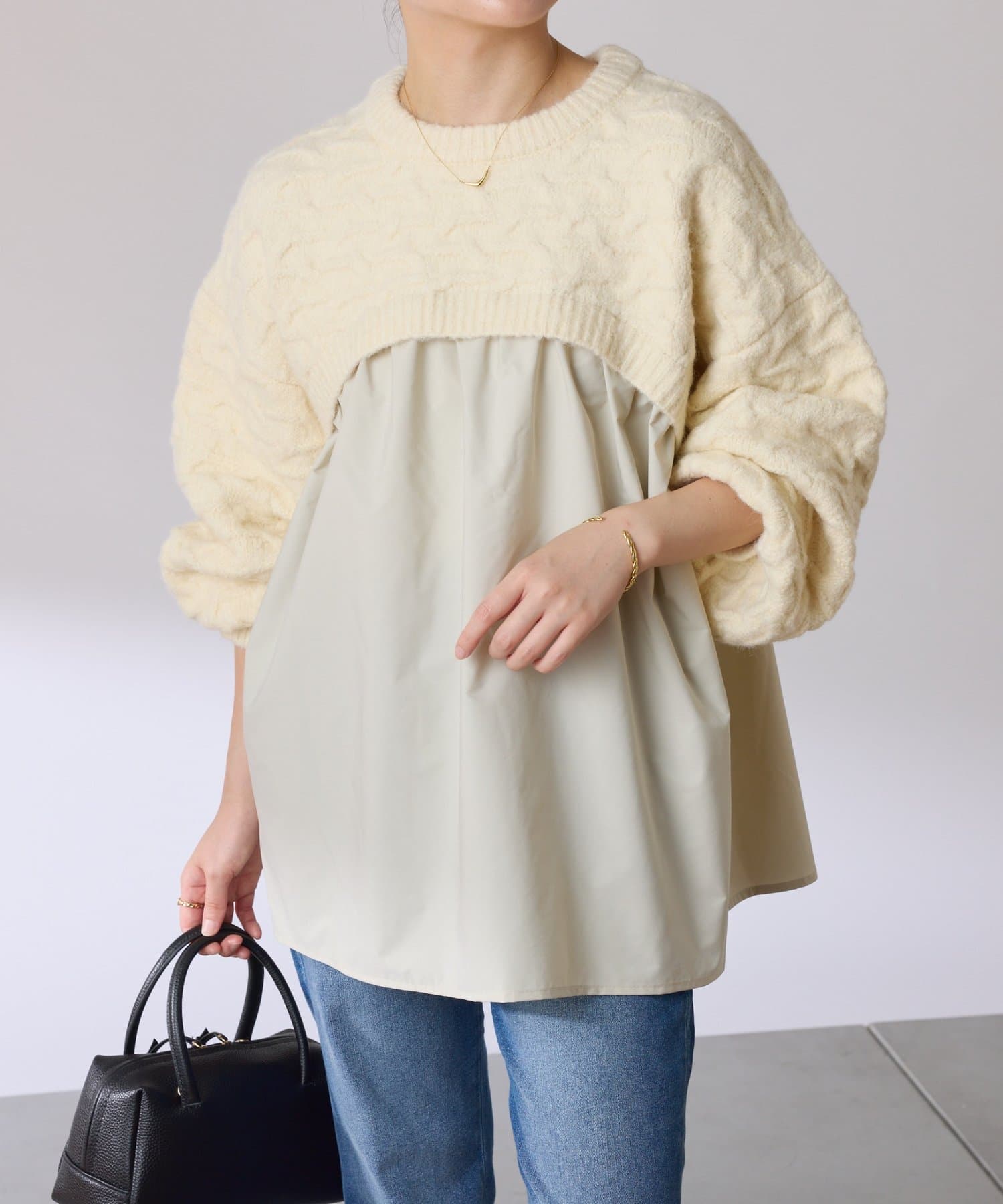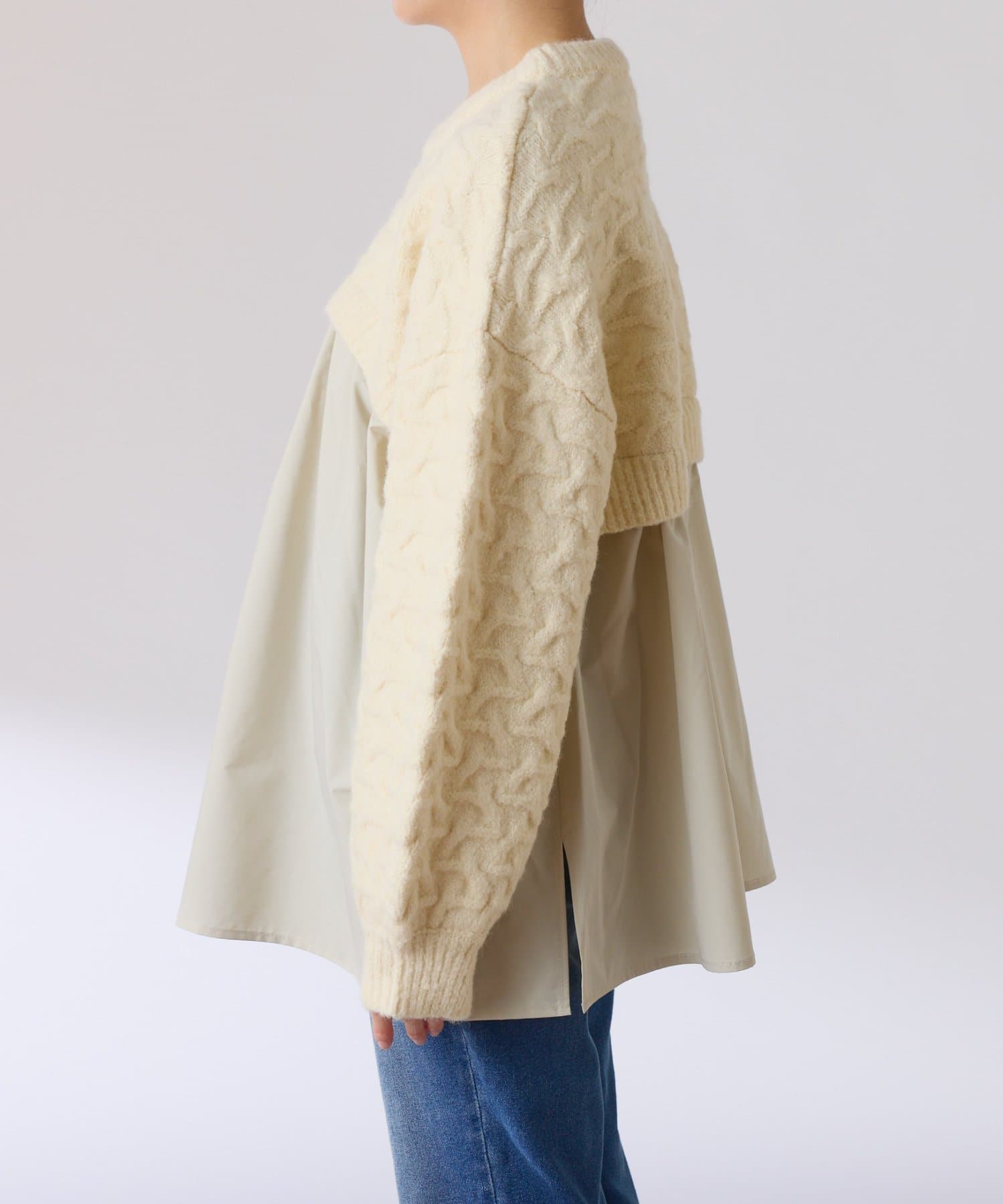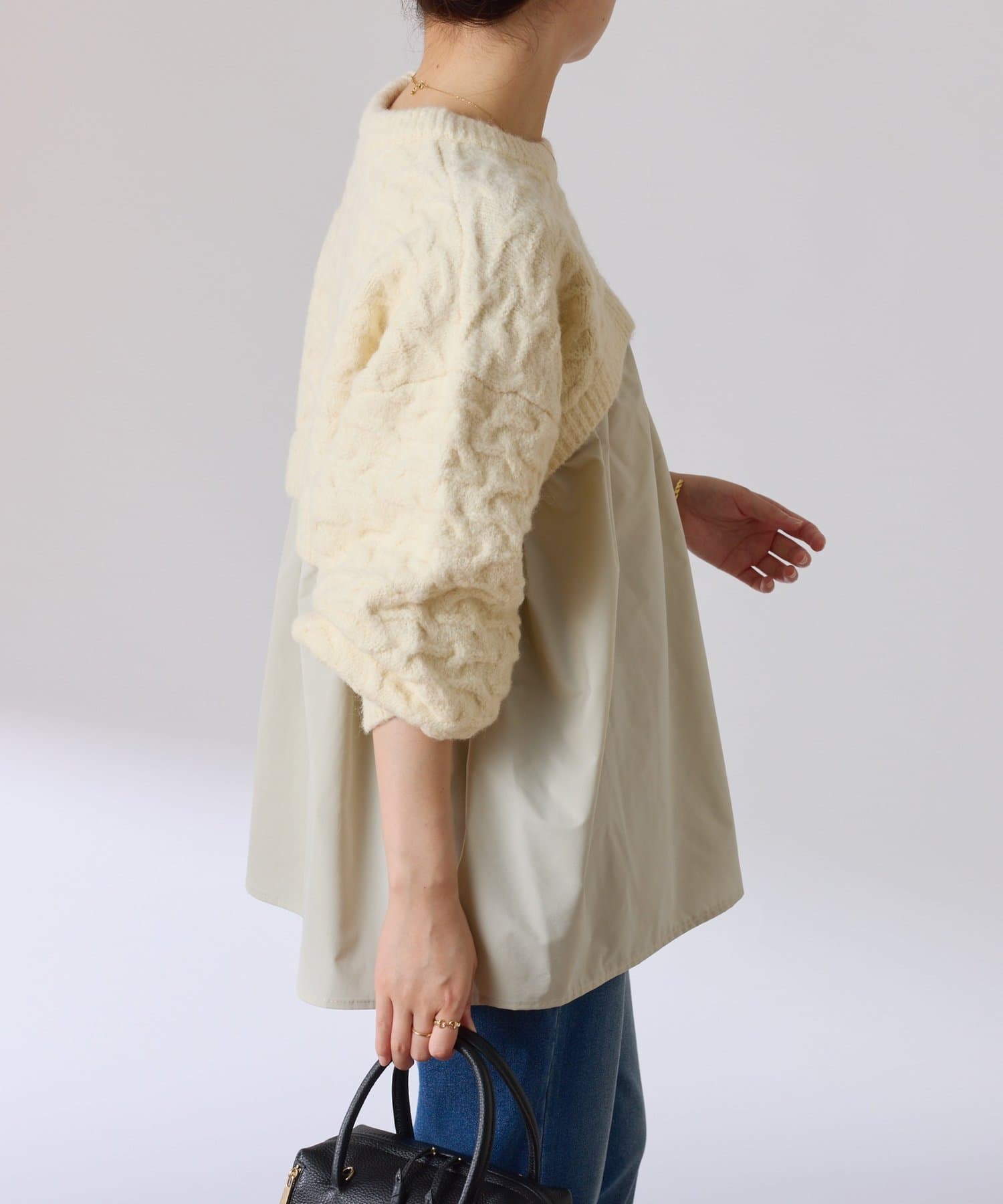 ・しっかりめに柄編みされた、もちっと感のあるオーバーサイズニットと布帛のブラウスをドッキング。
