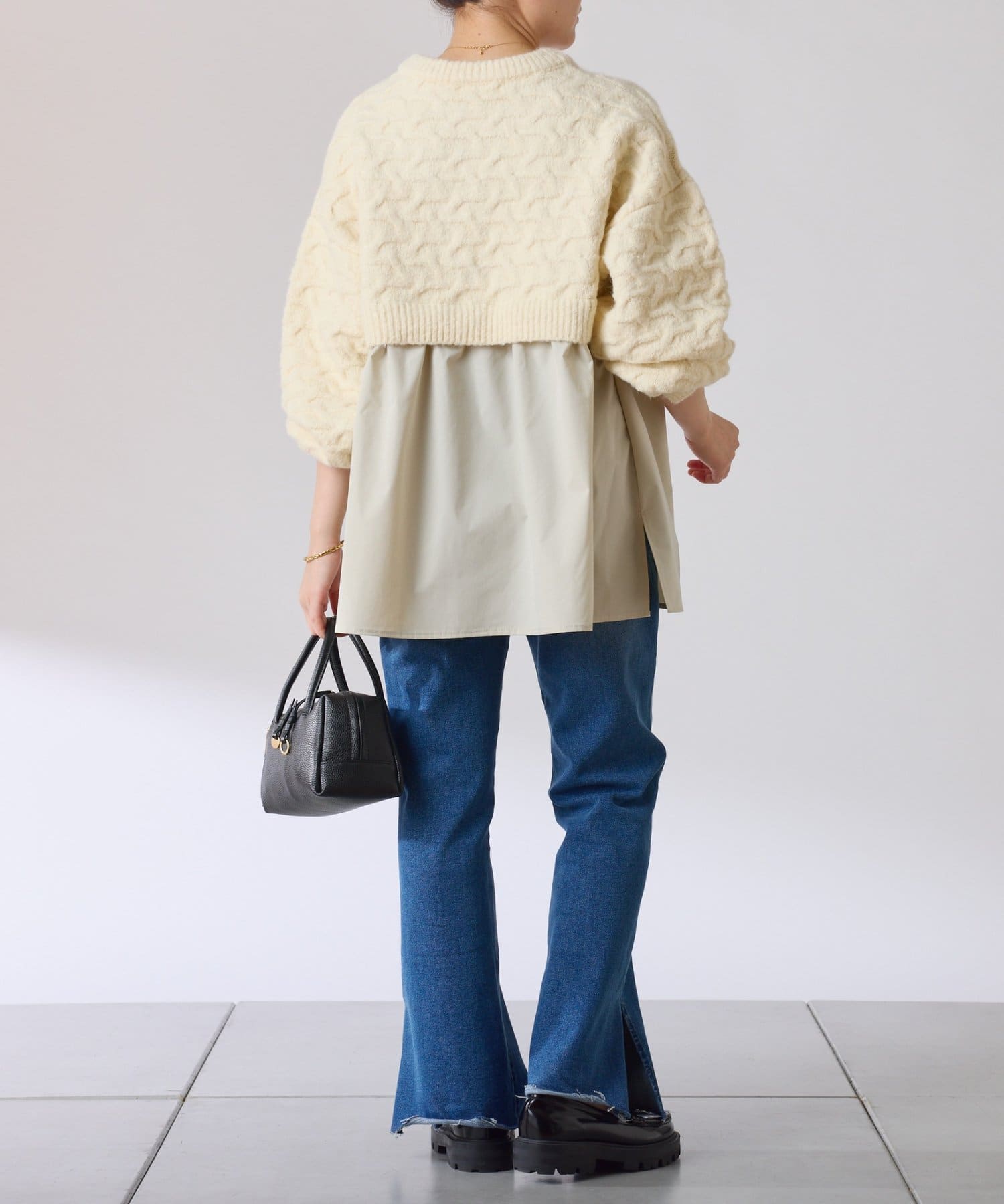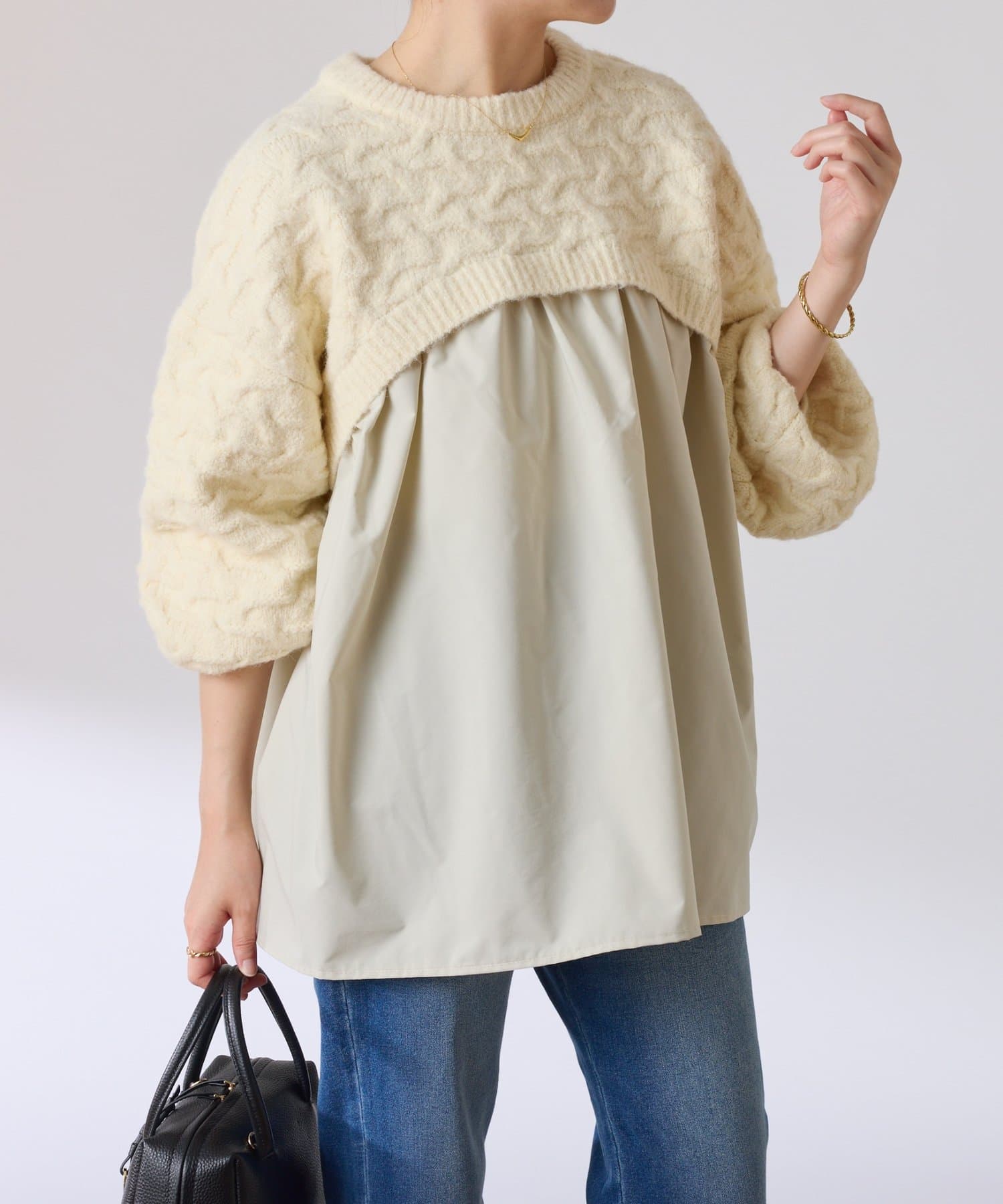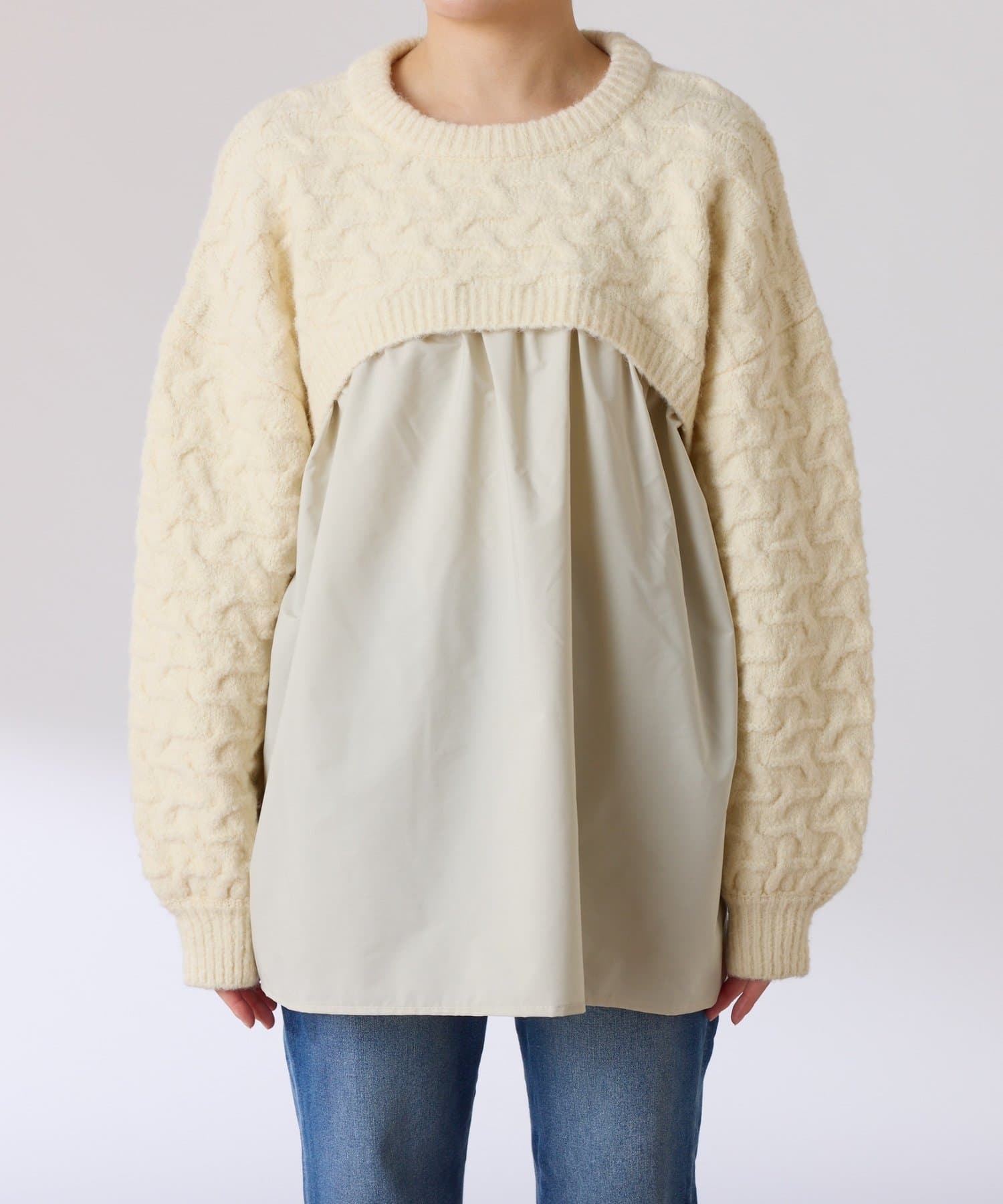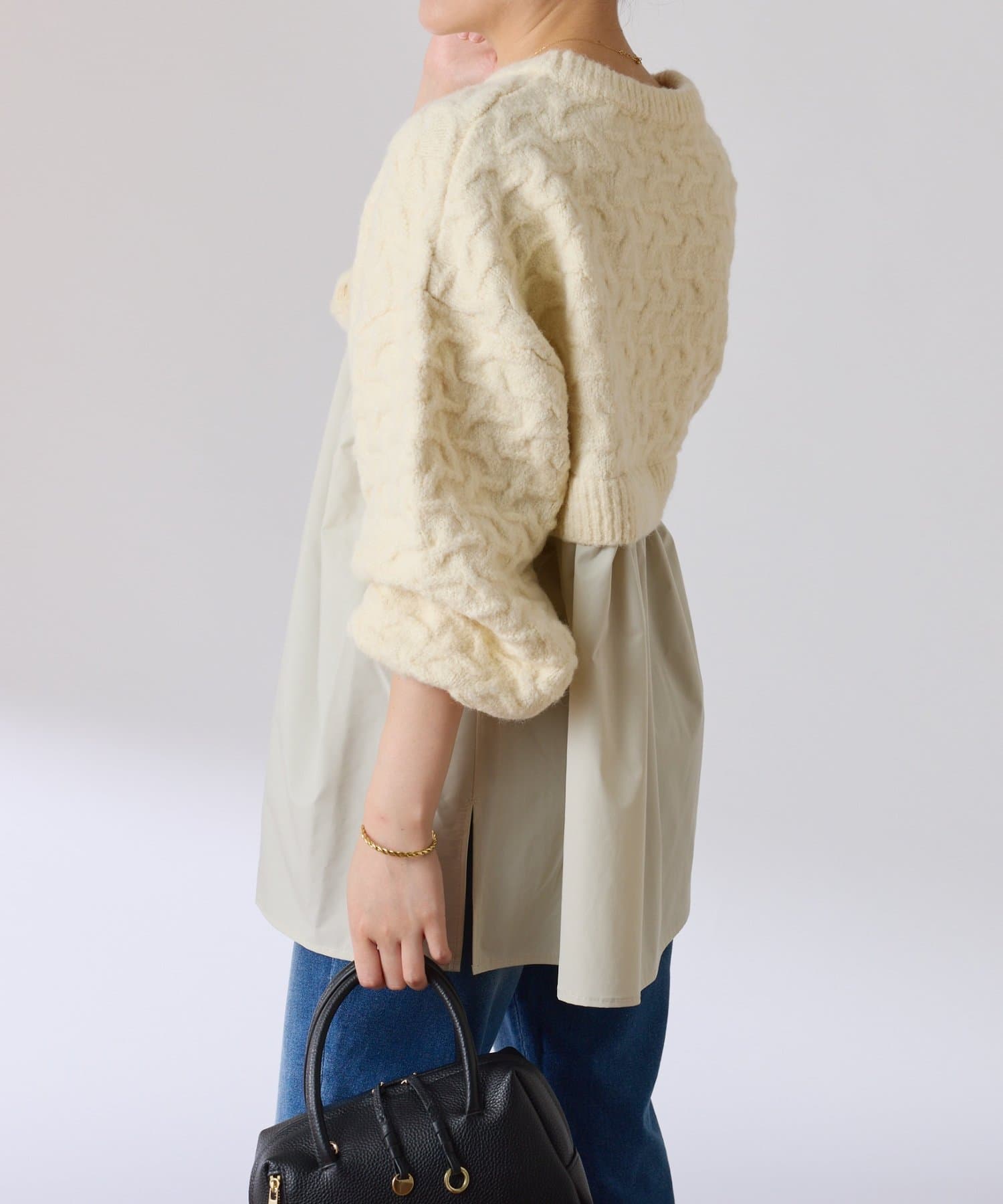 ・しっかりめに柄編みされた、もちっと感のあるオーバーサイズニットと布帛のブラウスをドッキング。
