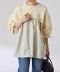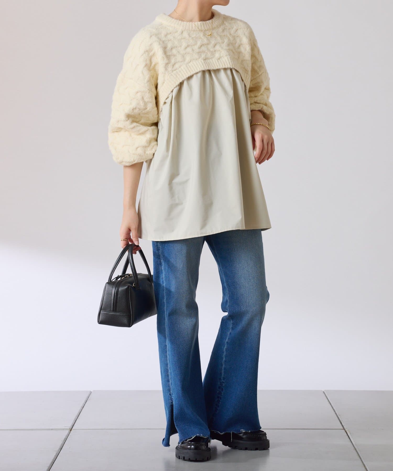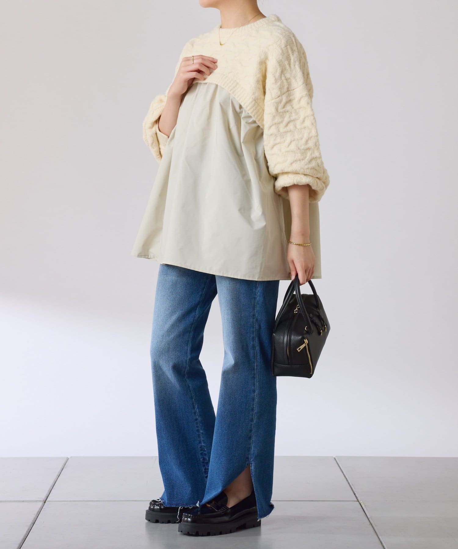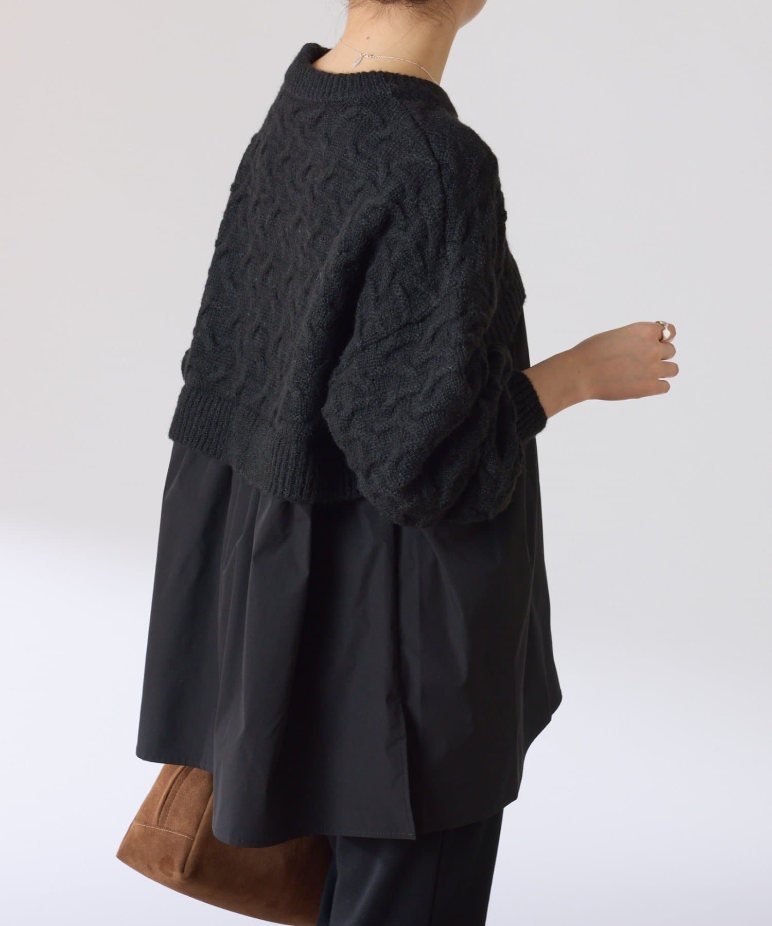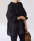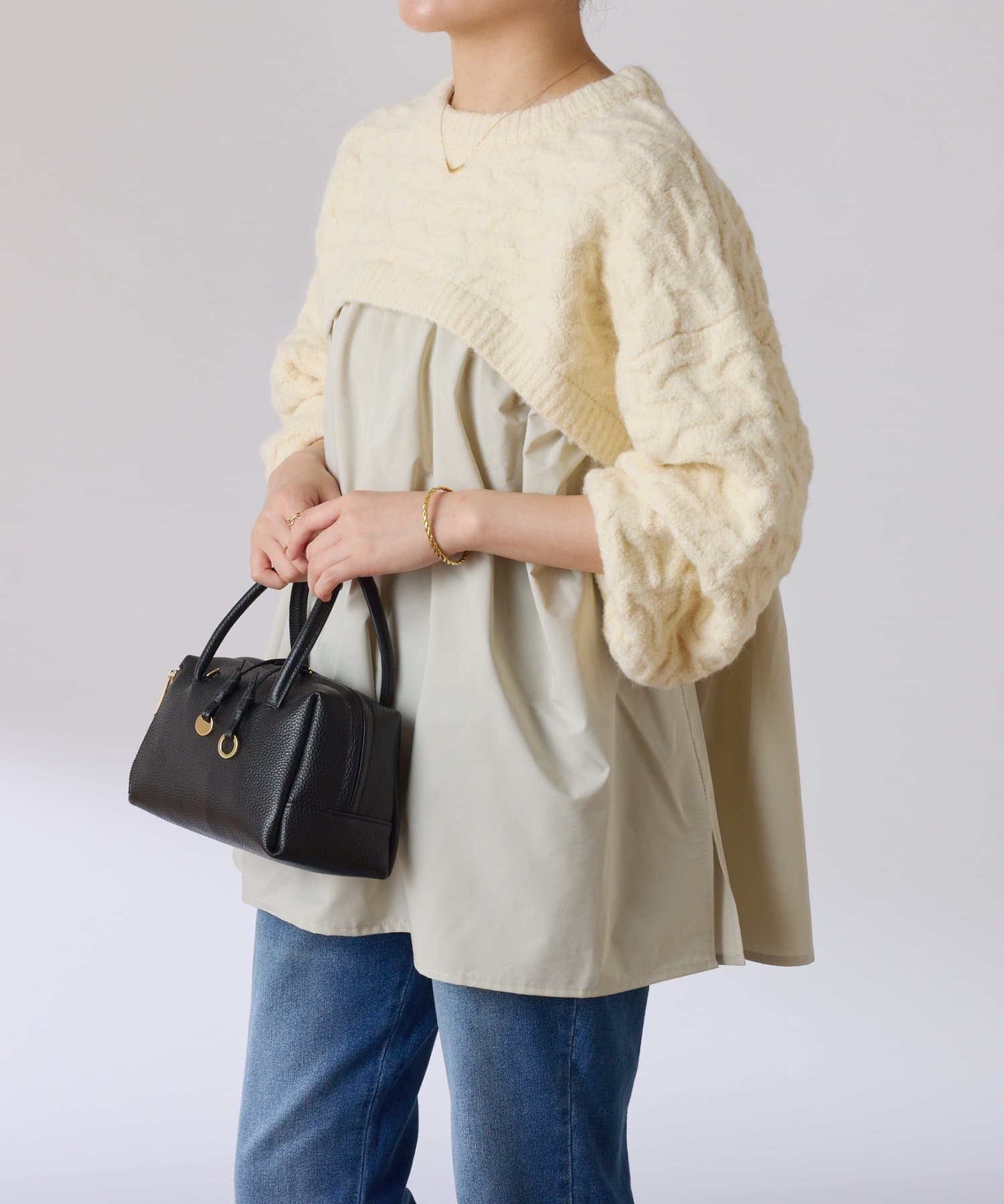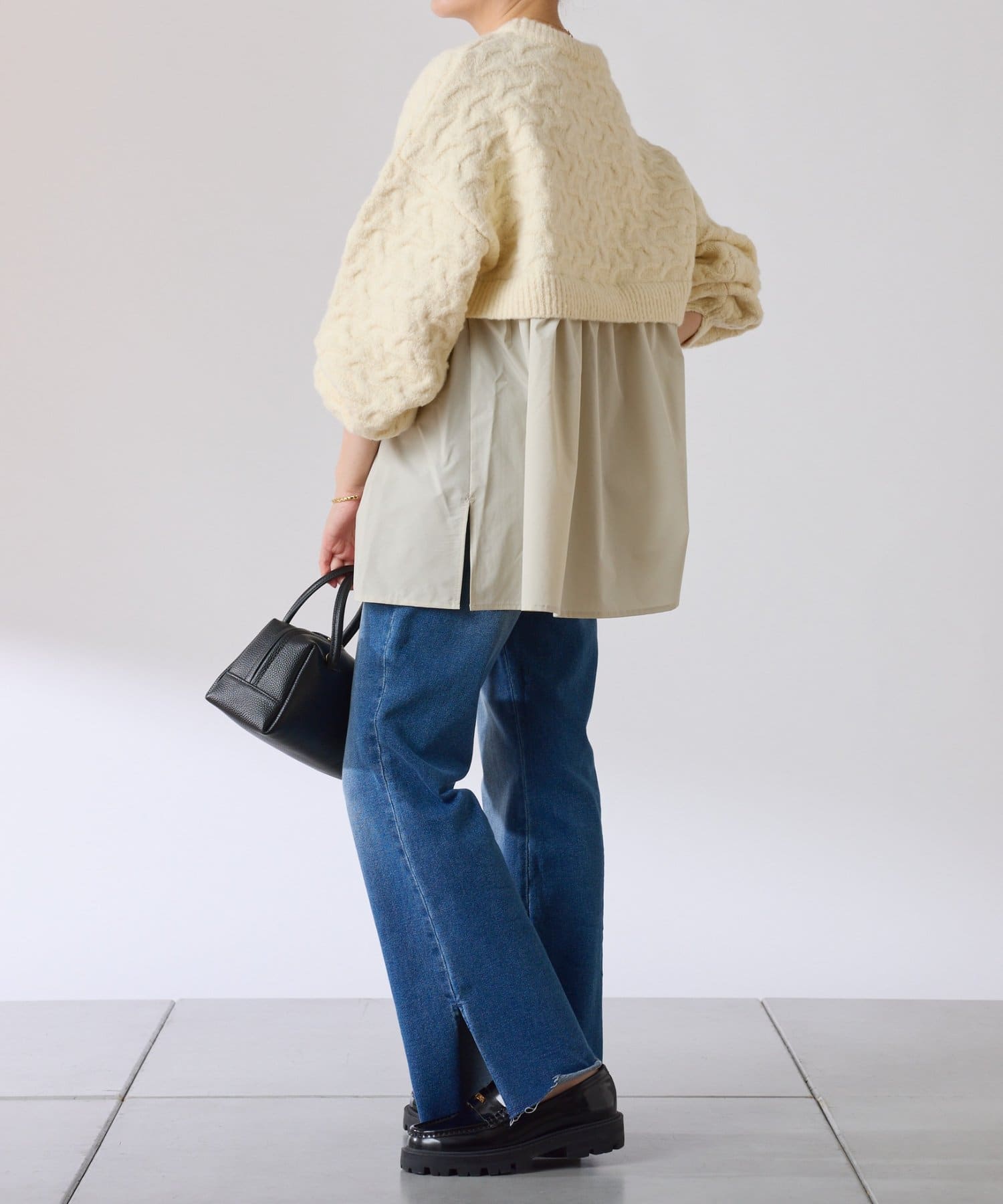 ・しっかりめに柄編みされた、もちっと感のあるオーバーサイズニットと布帛のブラウスをドッキング。