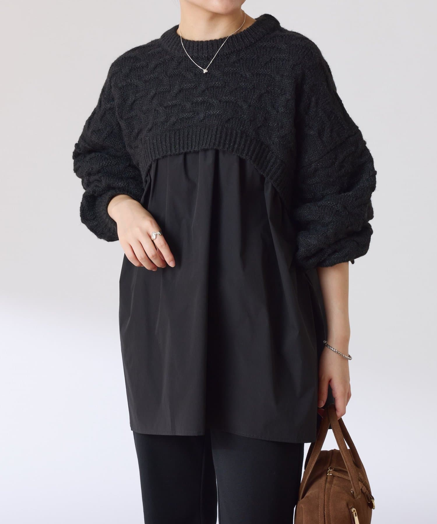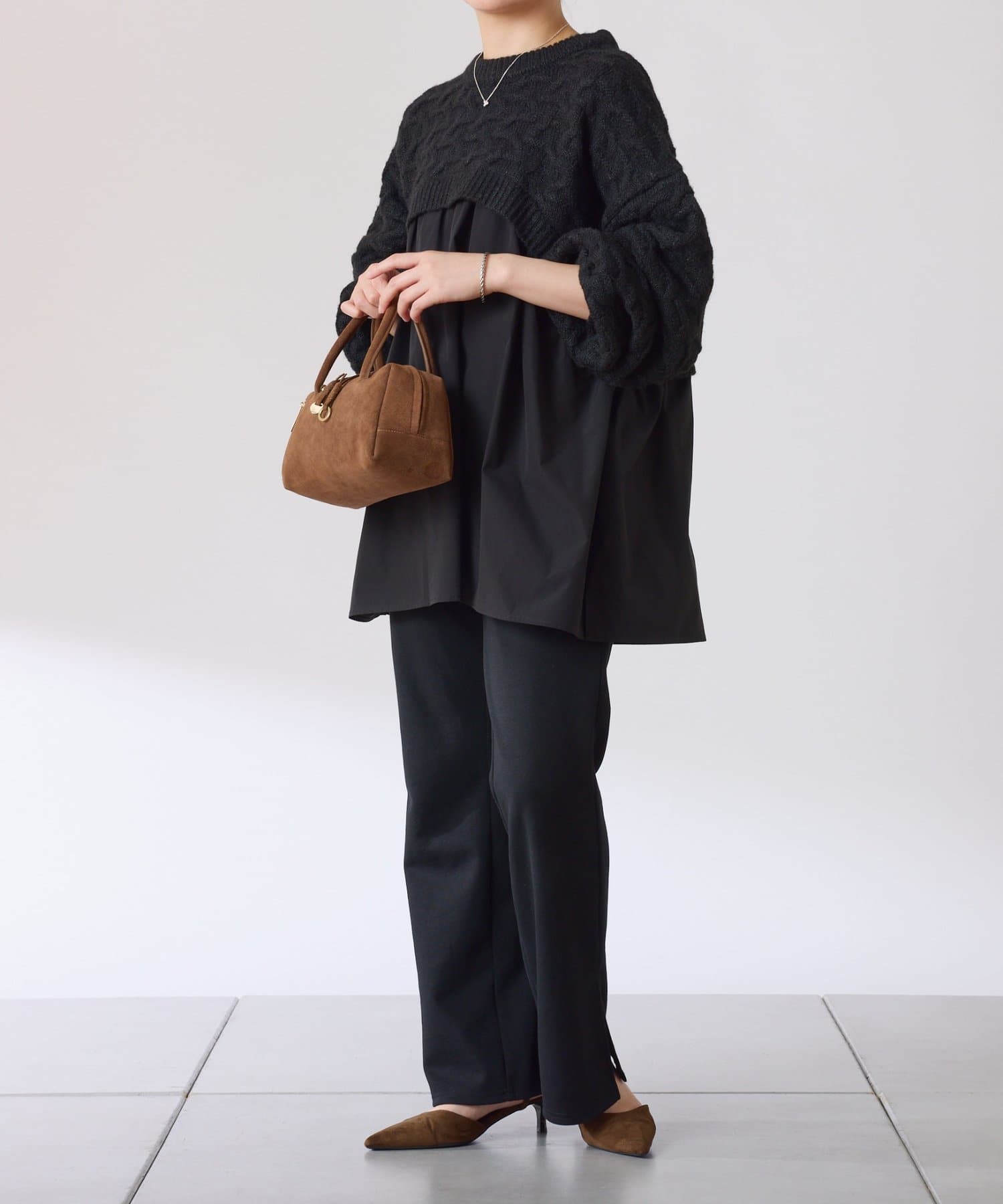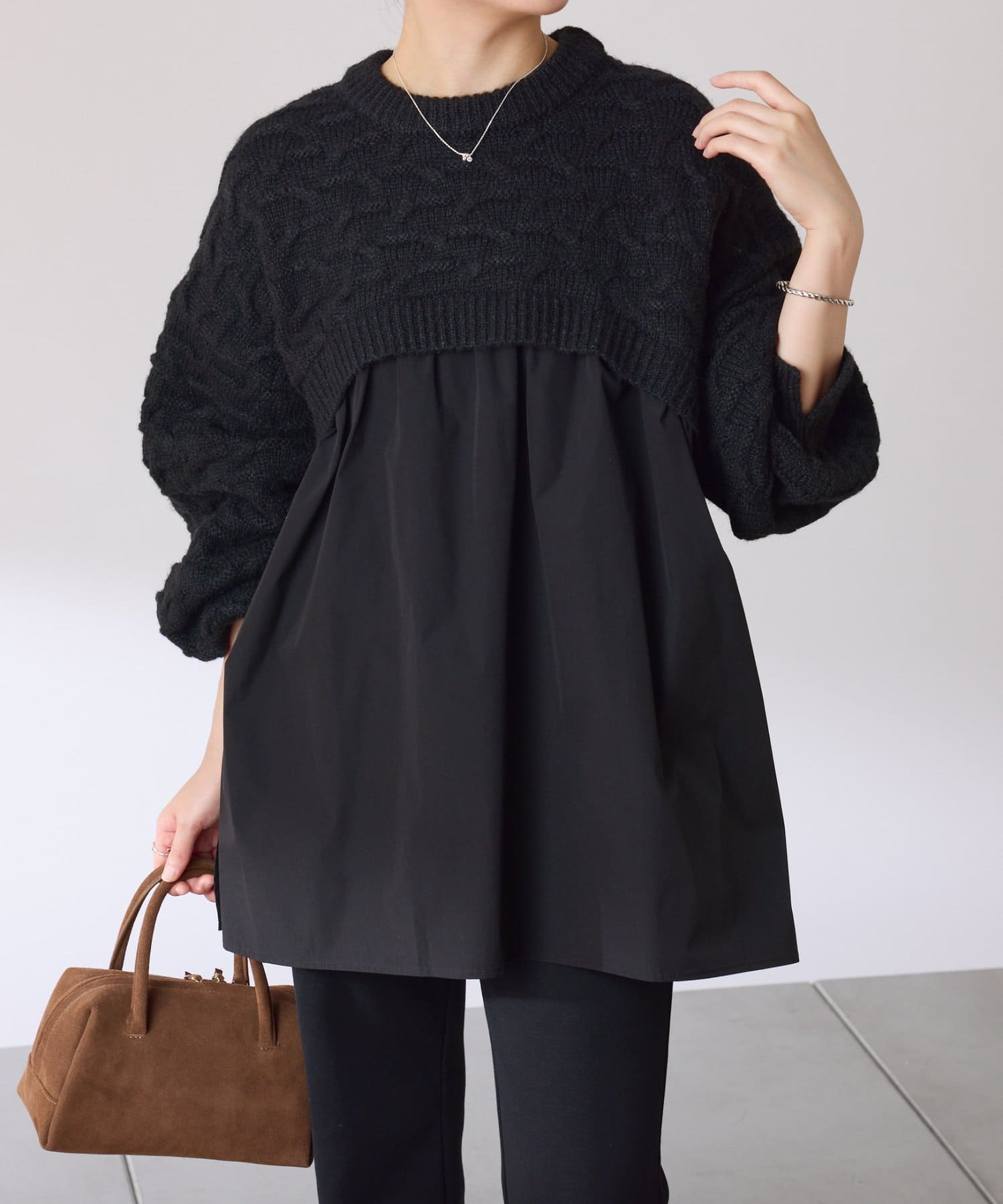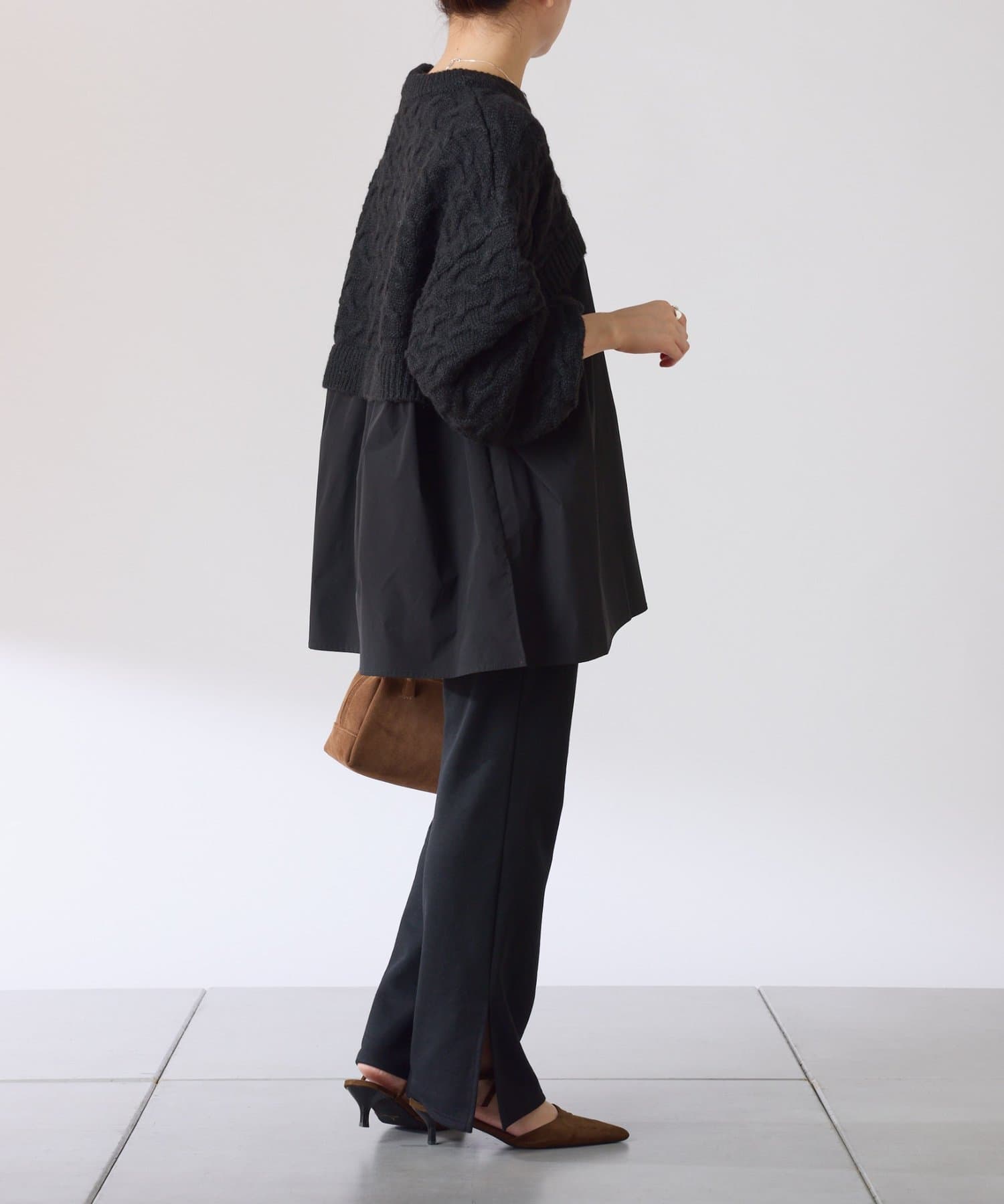 ・布帛のつるっとした素材が入ることで秋冬のコーデに軽やかさをプラスしてくれます◎