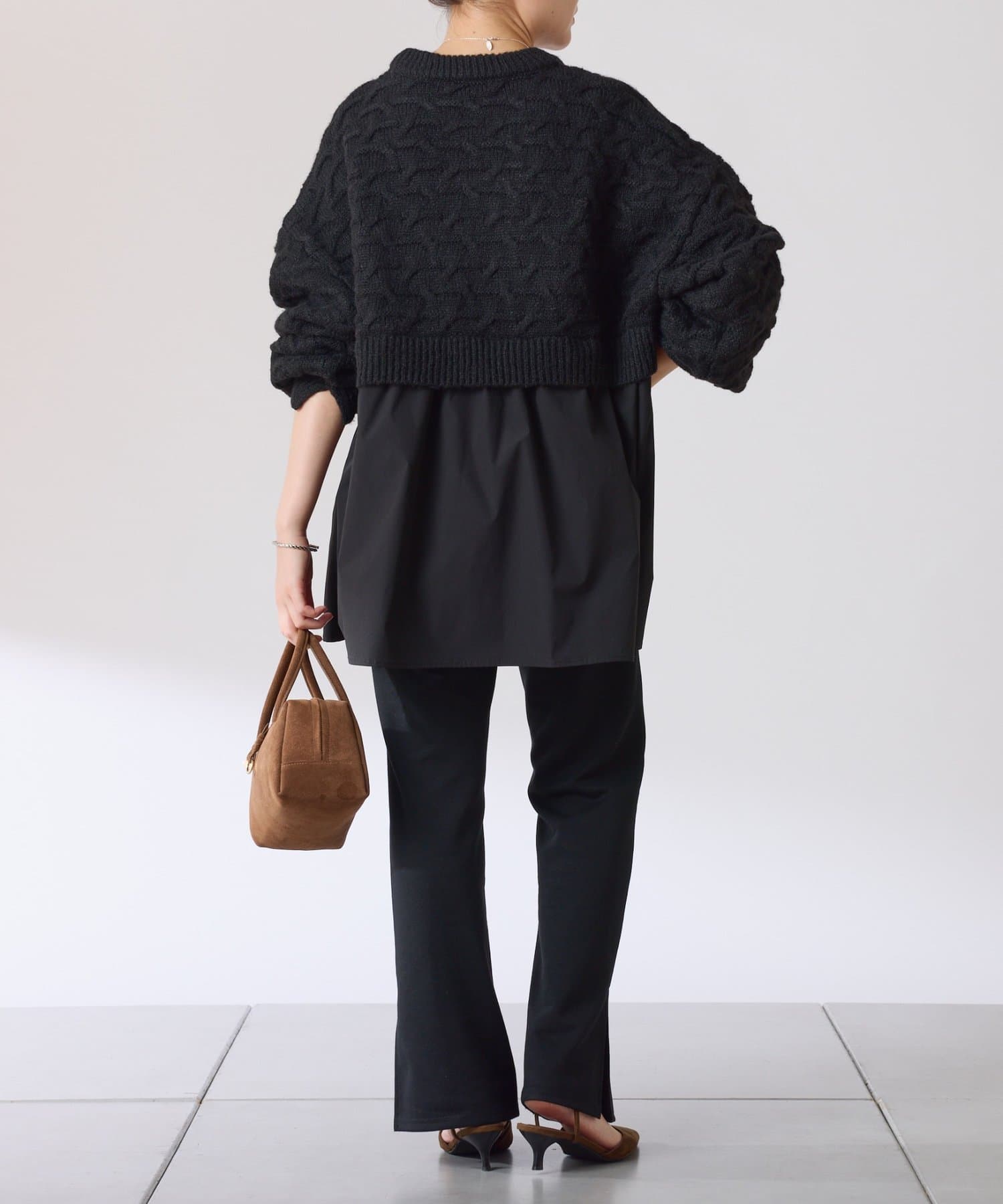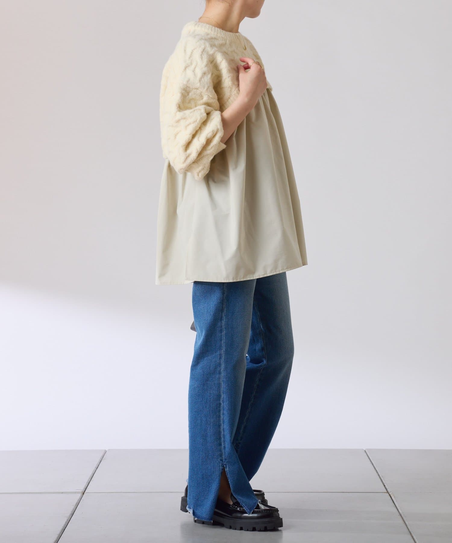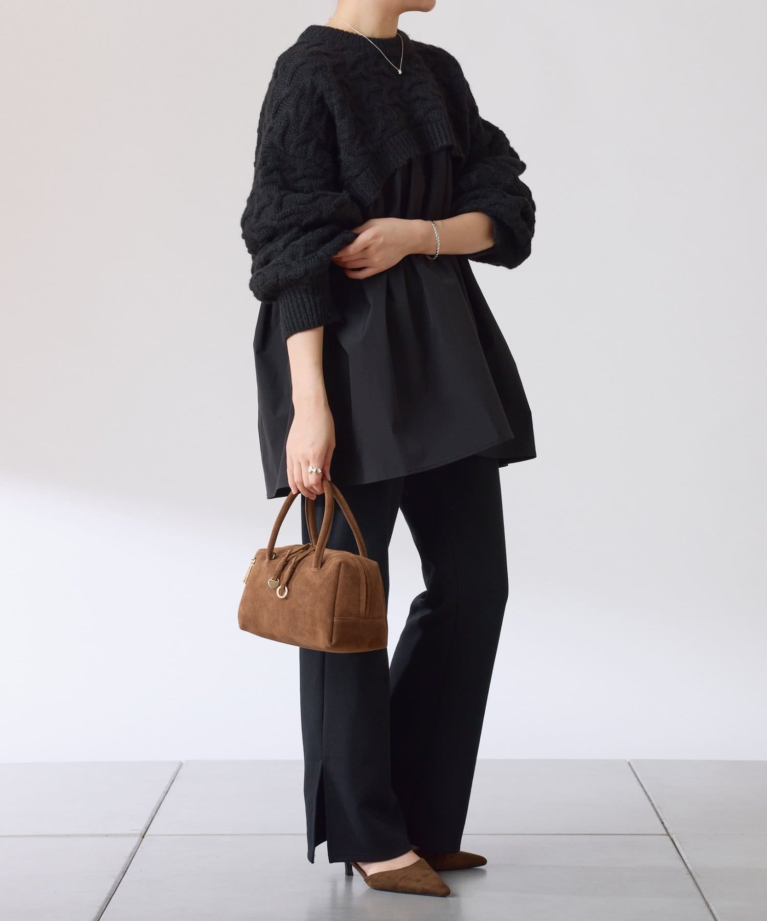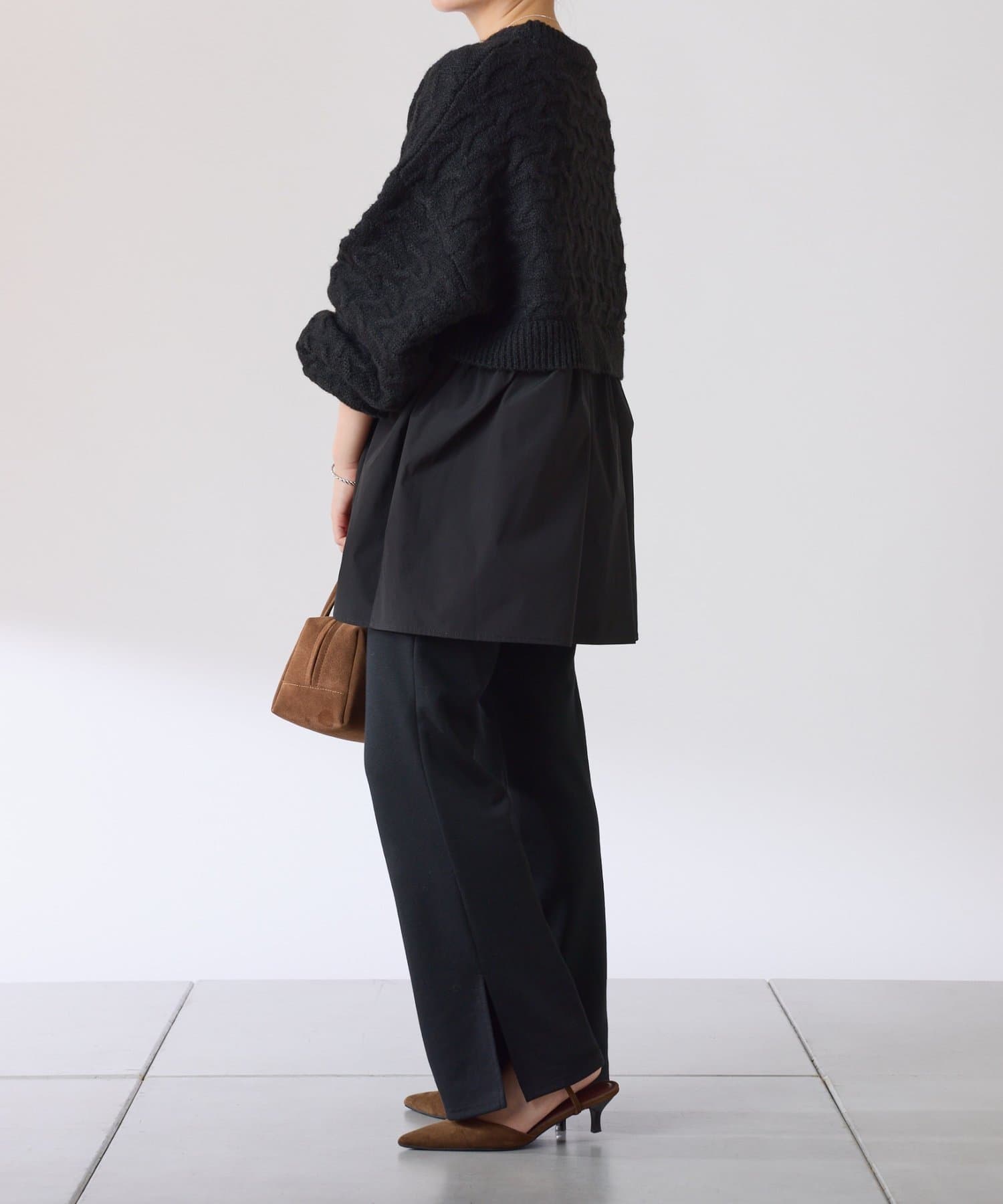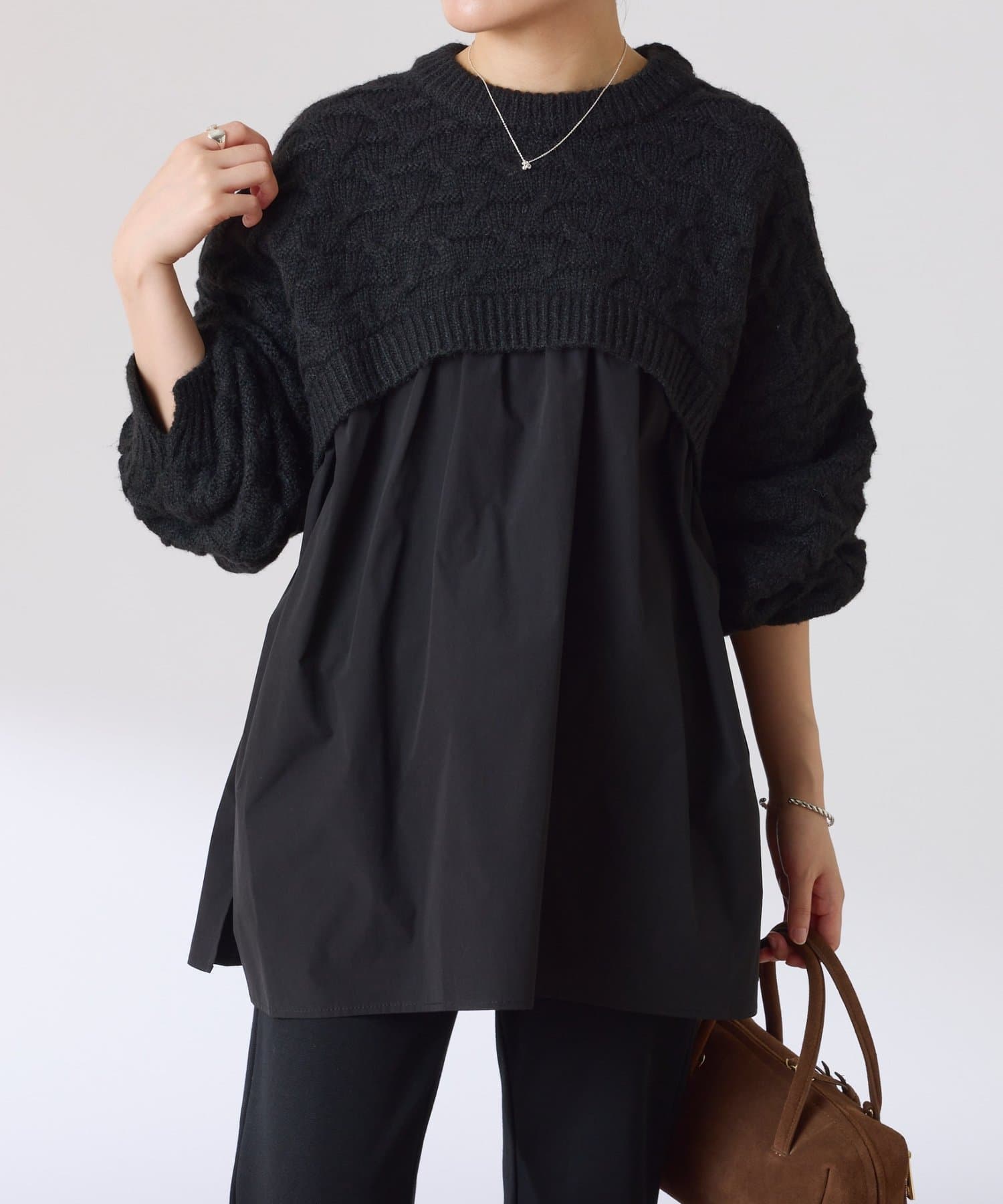 ・布帛のつるっとした素材が入ることで秋冬のコーデに軽やかさをプラスしてくれます◎