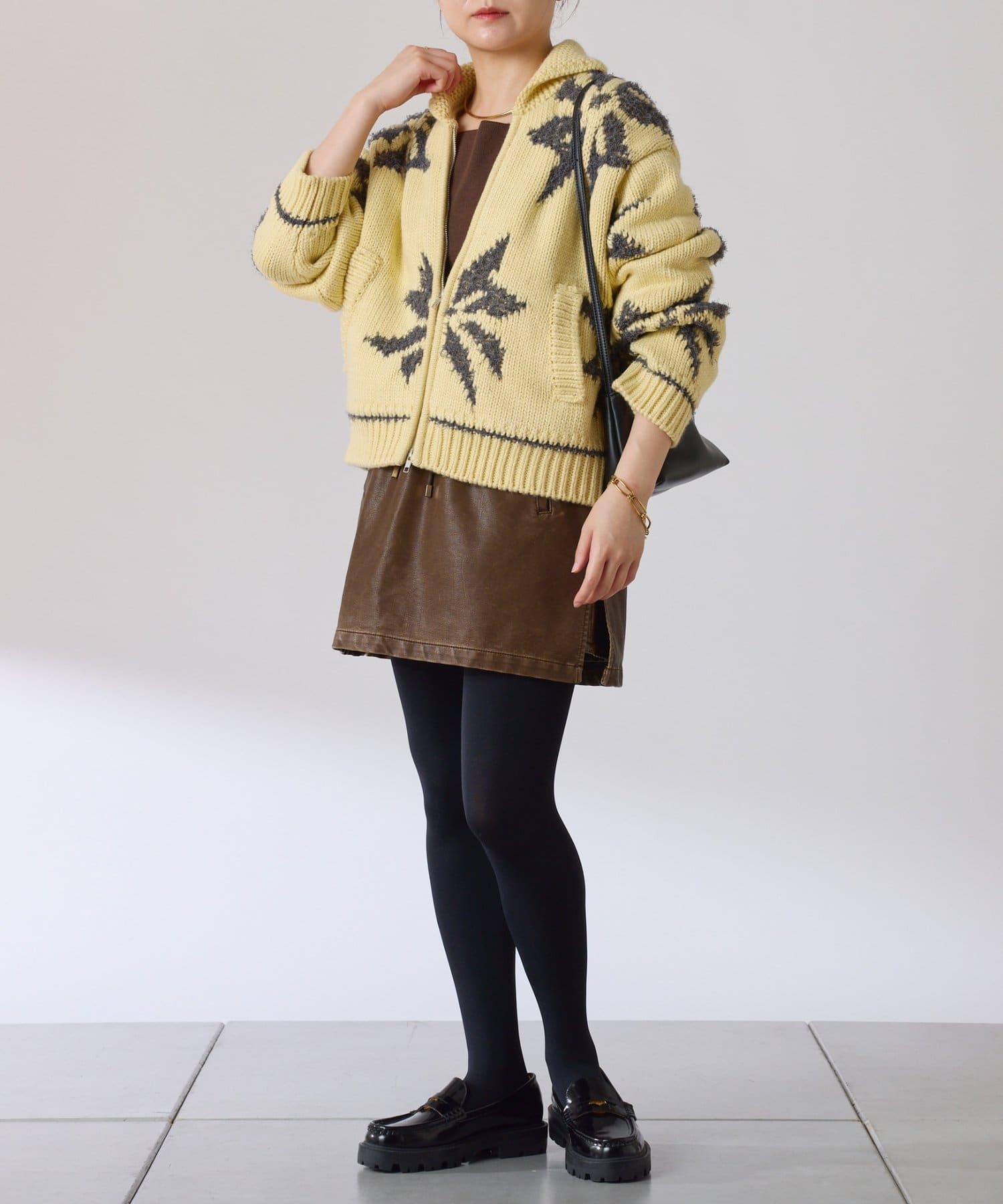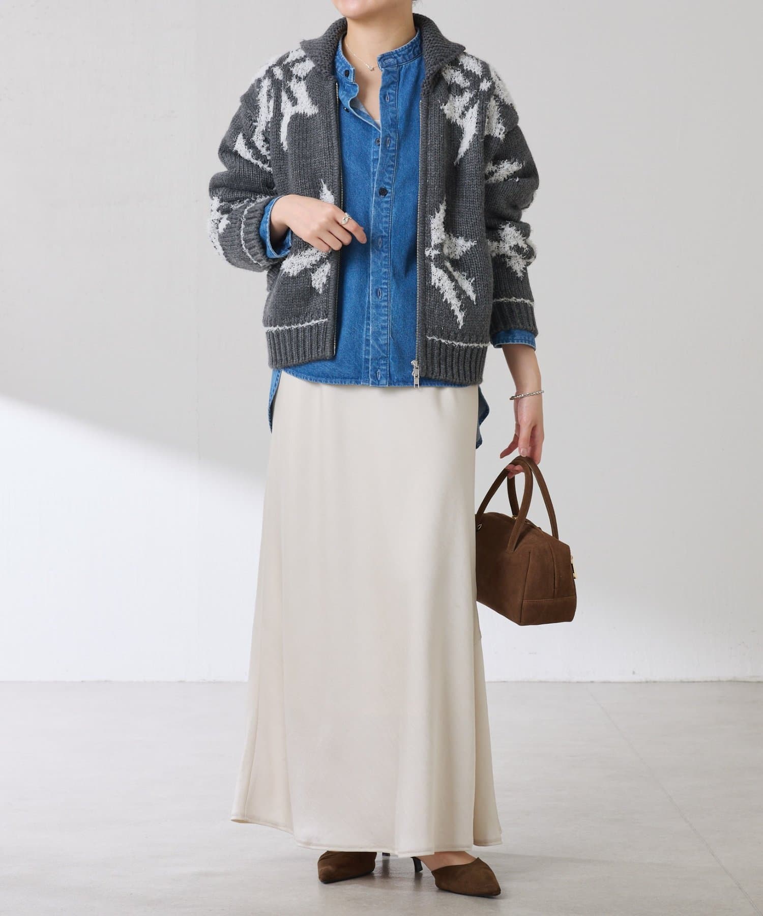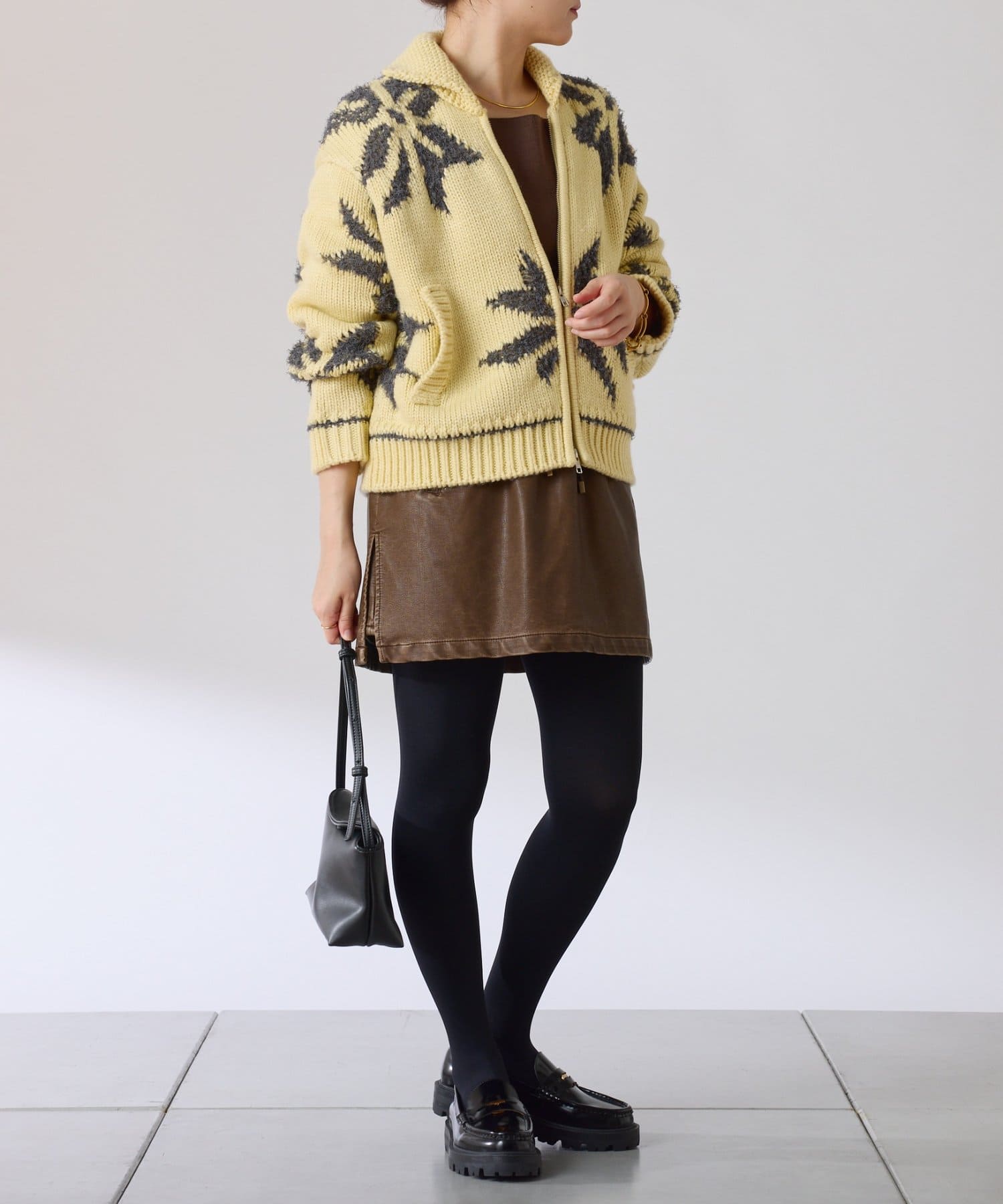 ・コンパクトなシルエットにすることでカウチンカーディガンもカジュアルすぎない印象に。