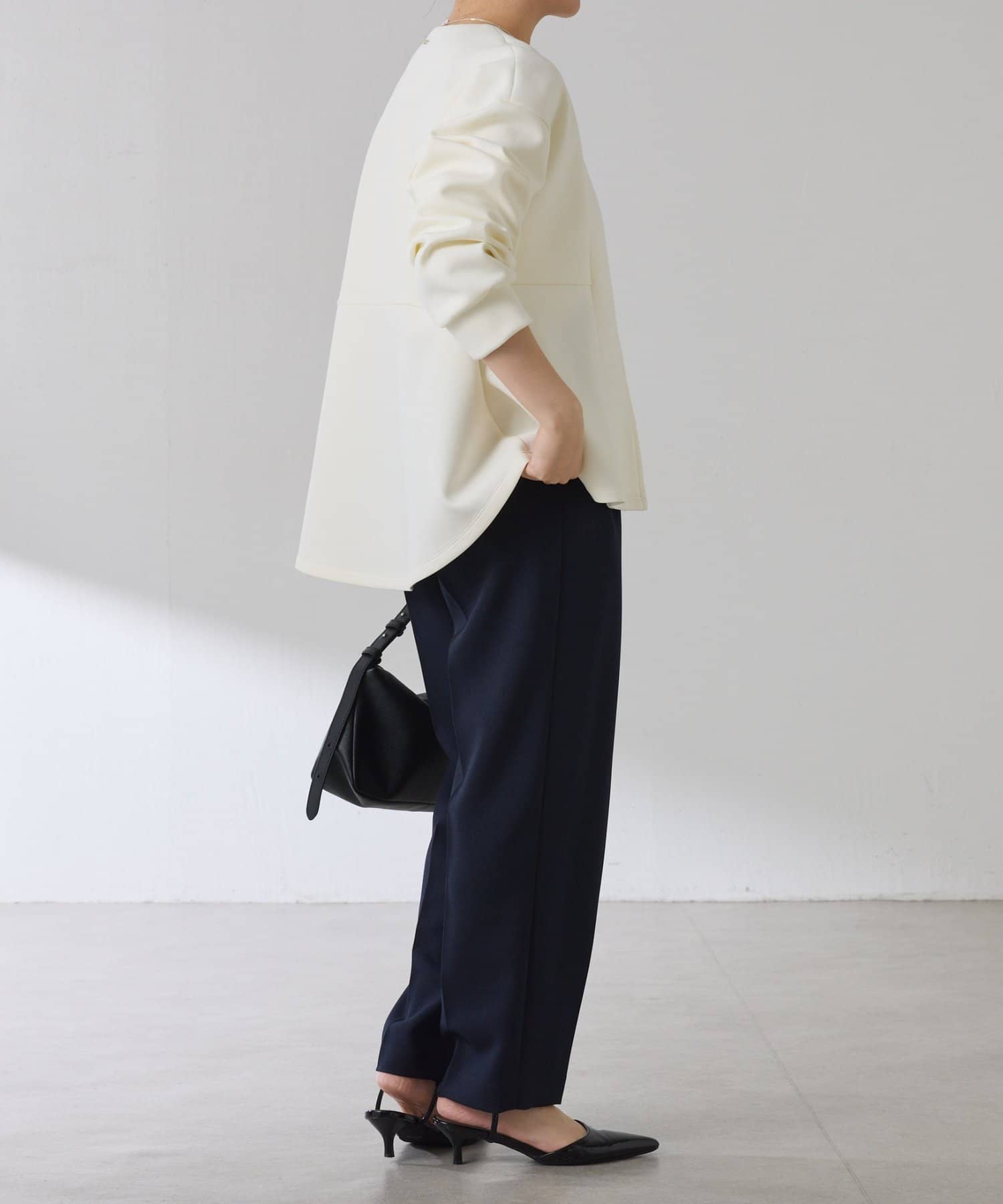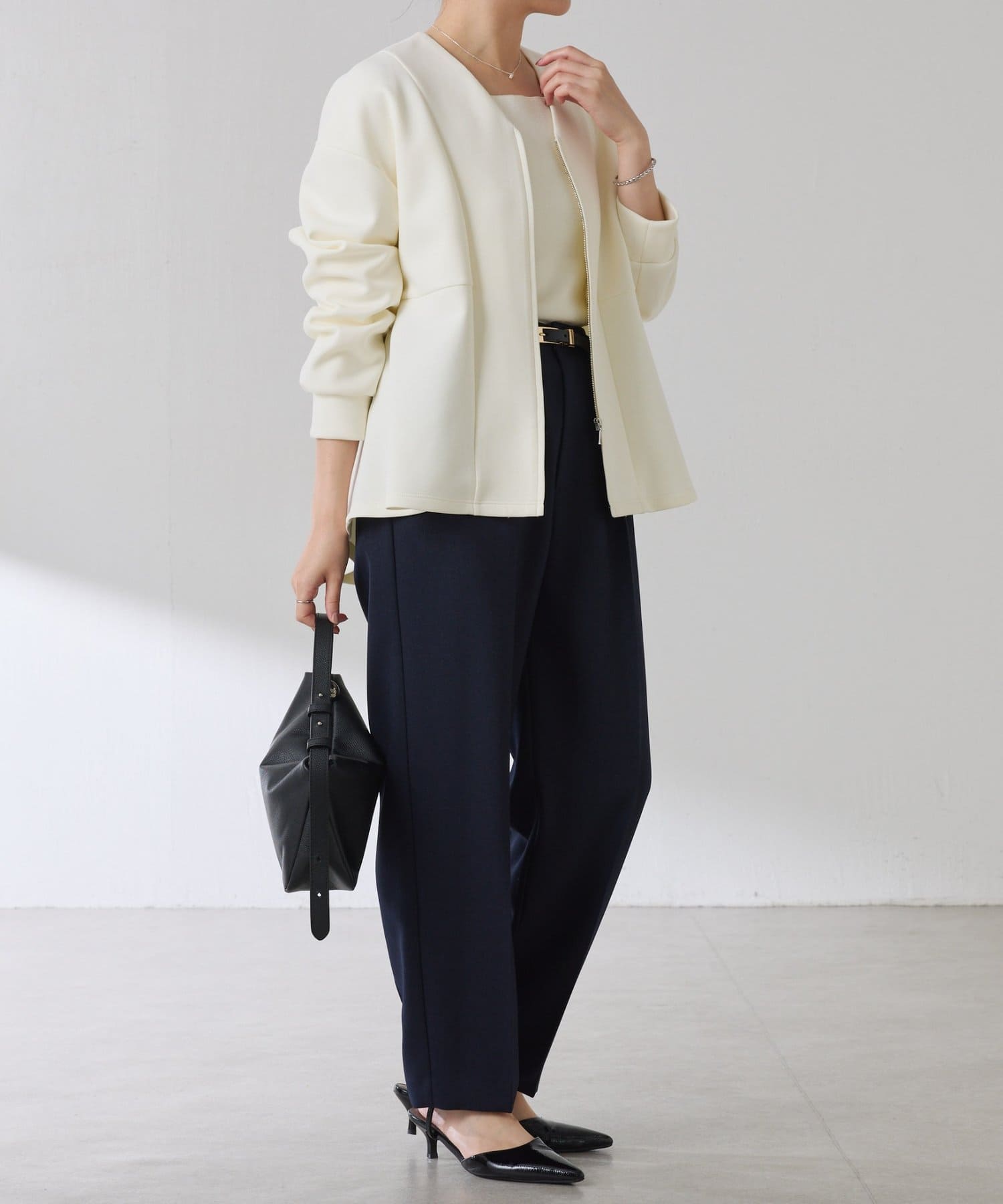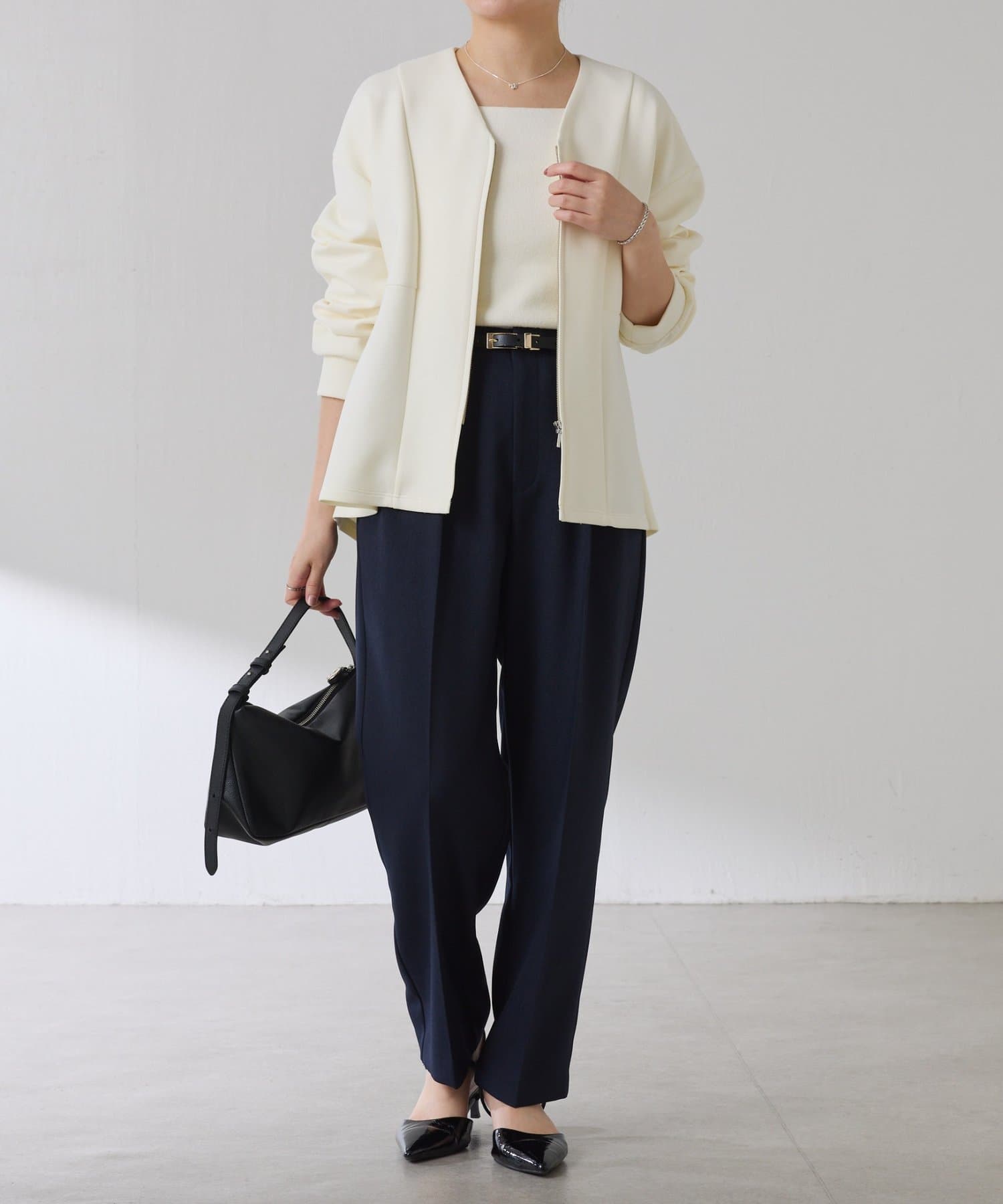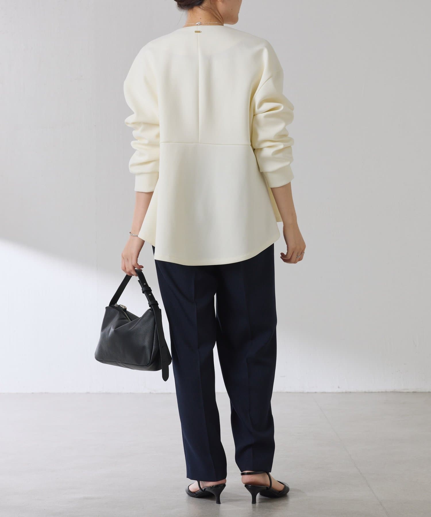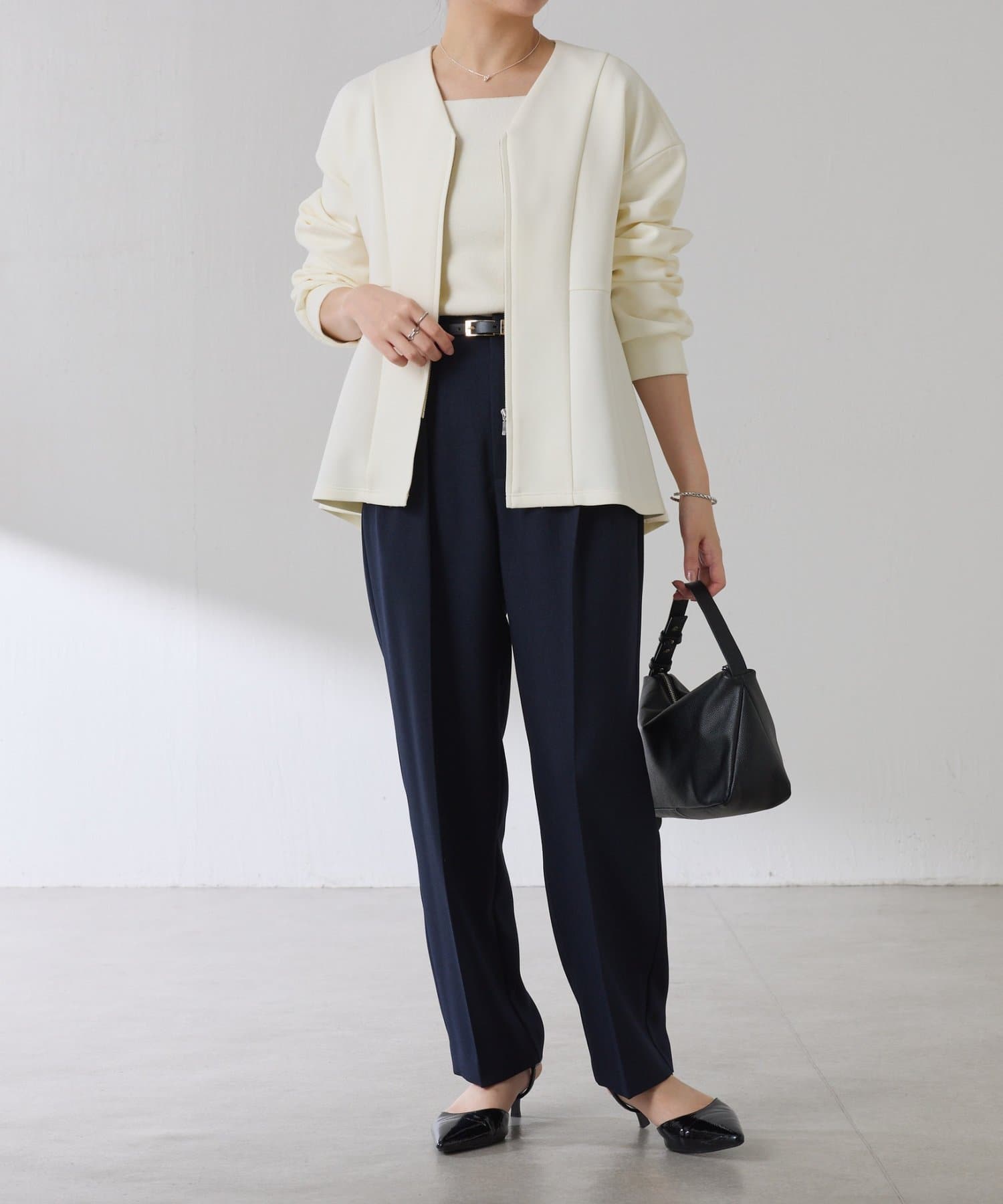 トップスは華やかなペプラムシルエットなので、テーパードパンツやIラインスカートなどすっきりしたボトムスと相性が良いです。