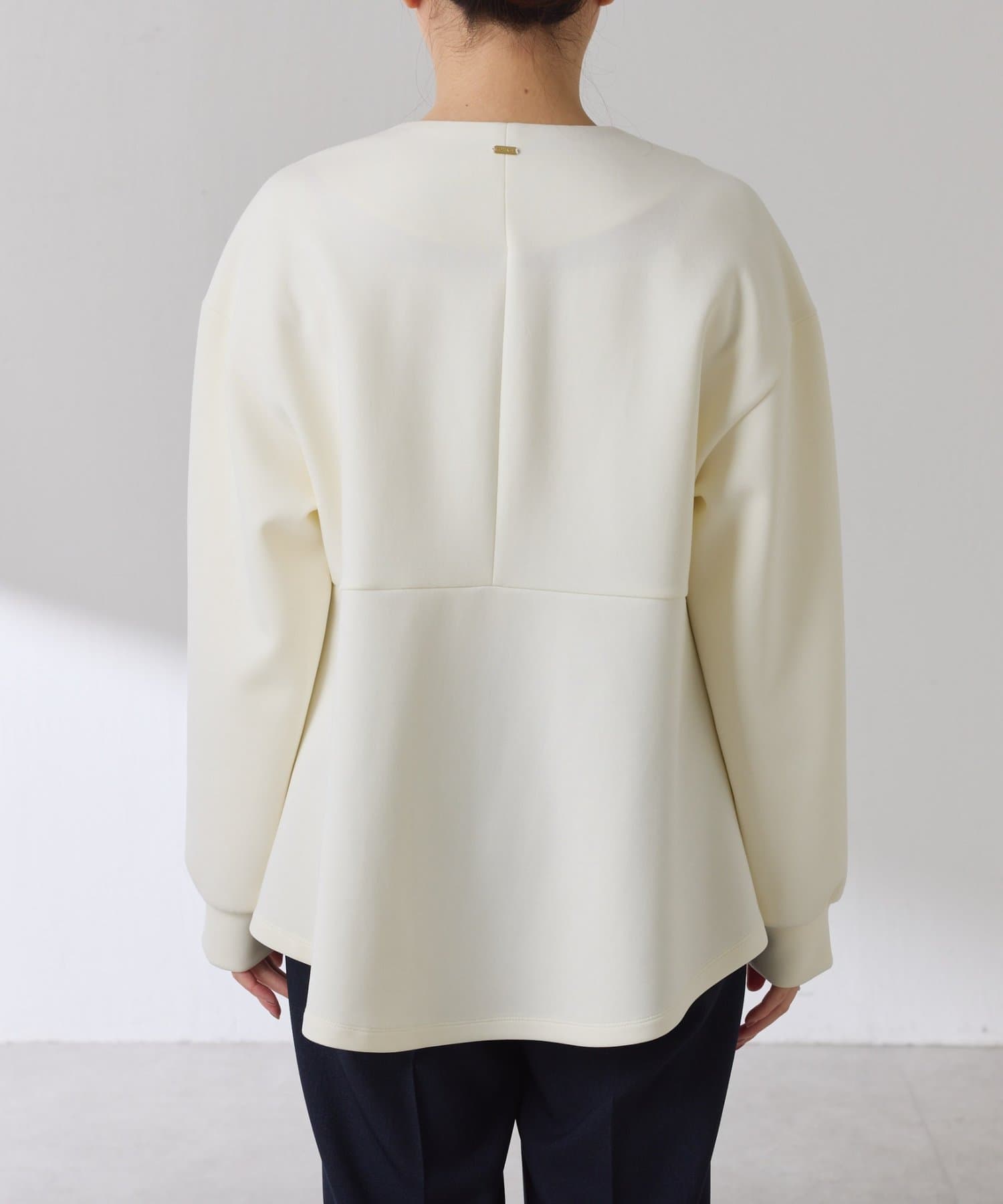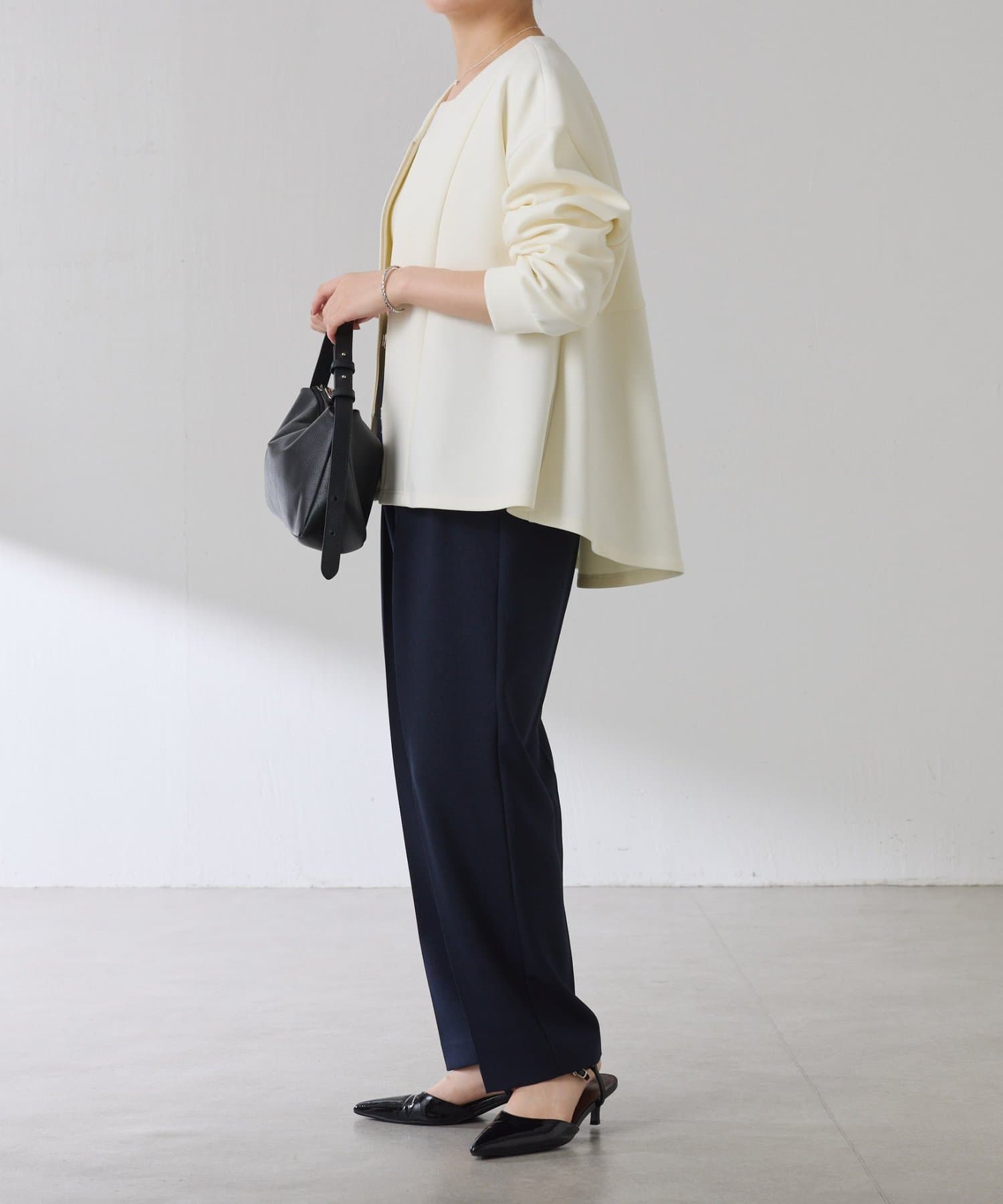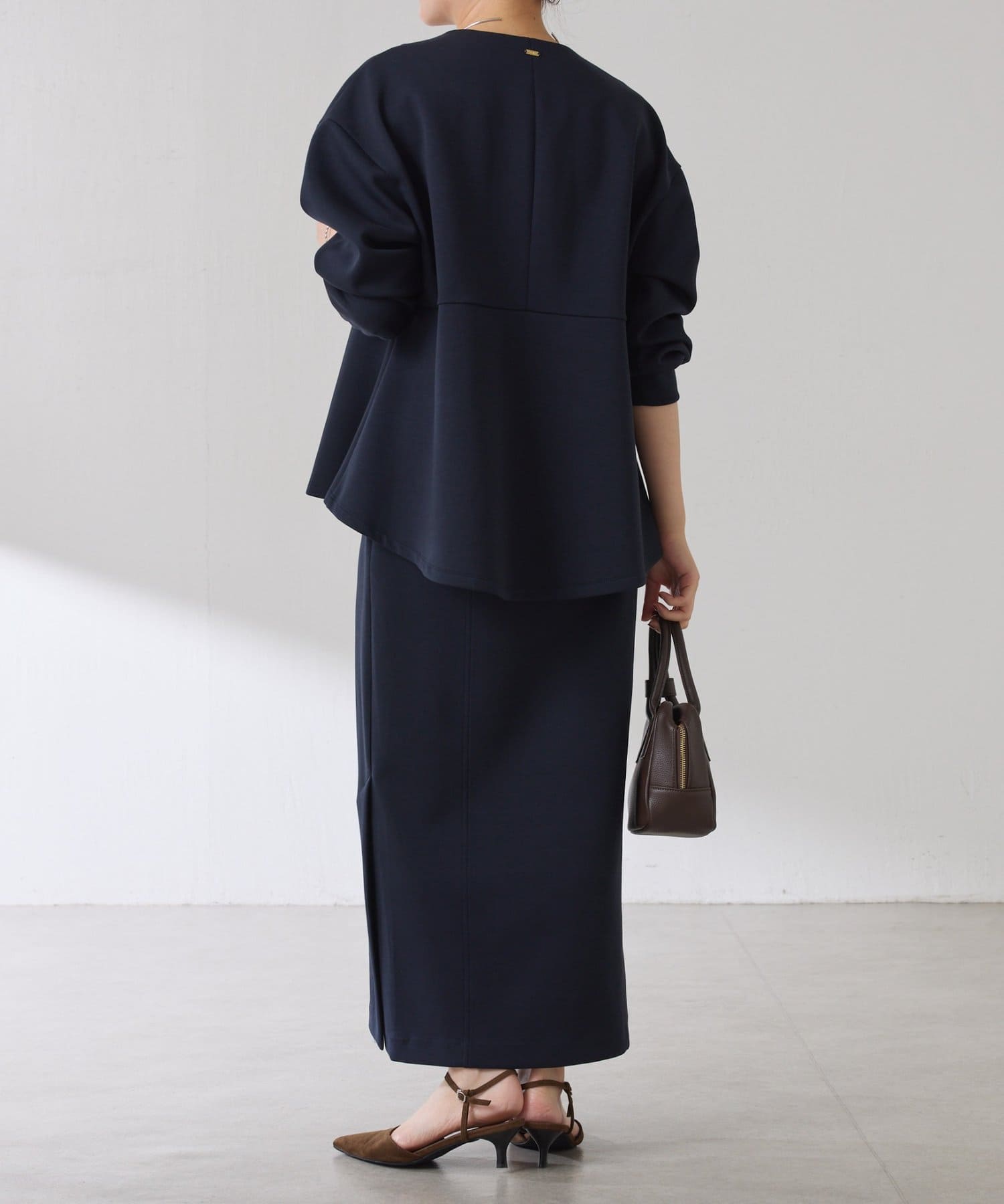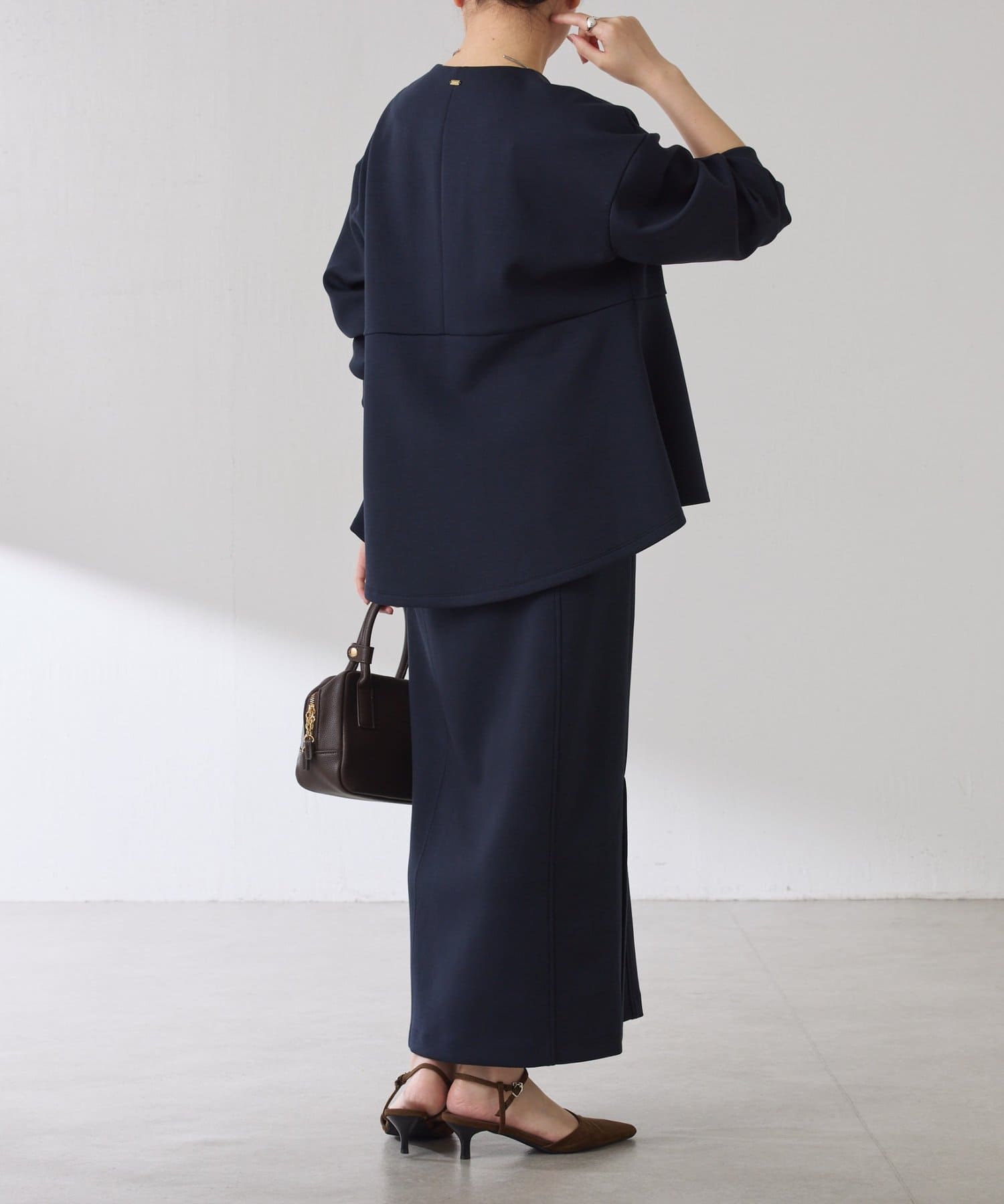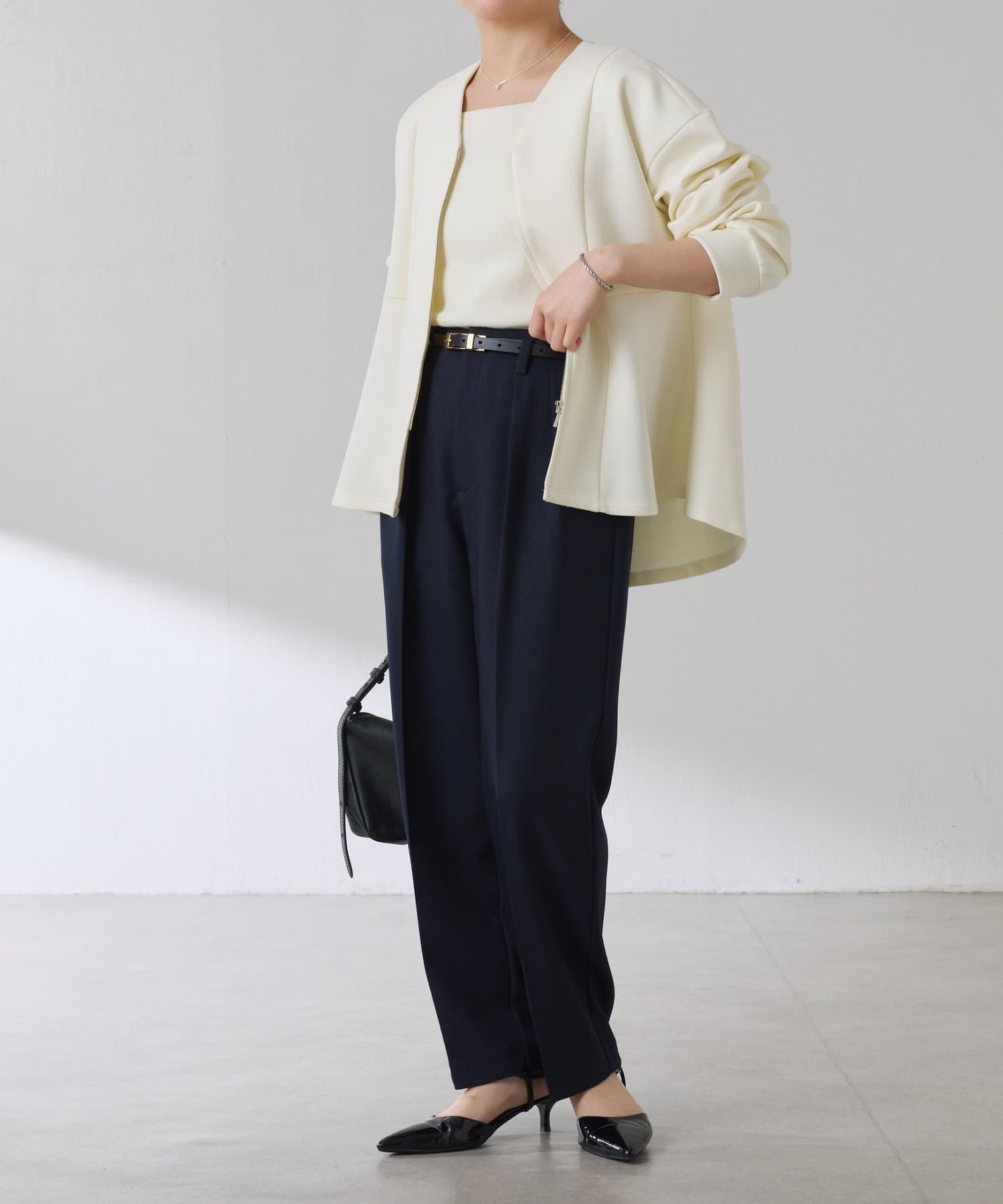 トップスは華やかなペプラムシルエットなので、テーパードパンツやIラインスカートなどすっきりしたボトムスと相性が良いです。