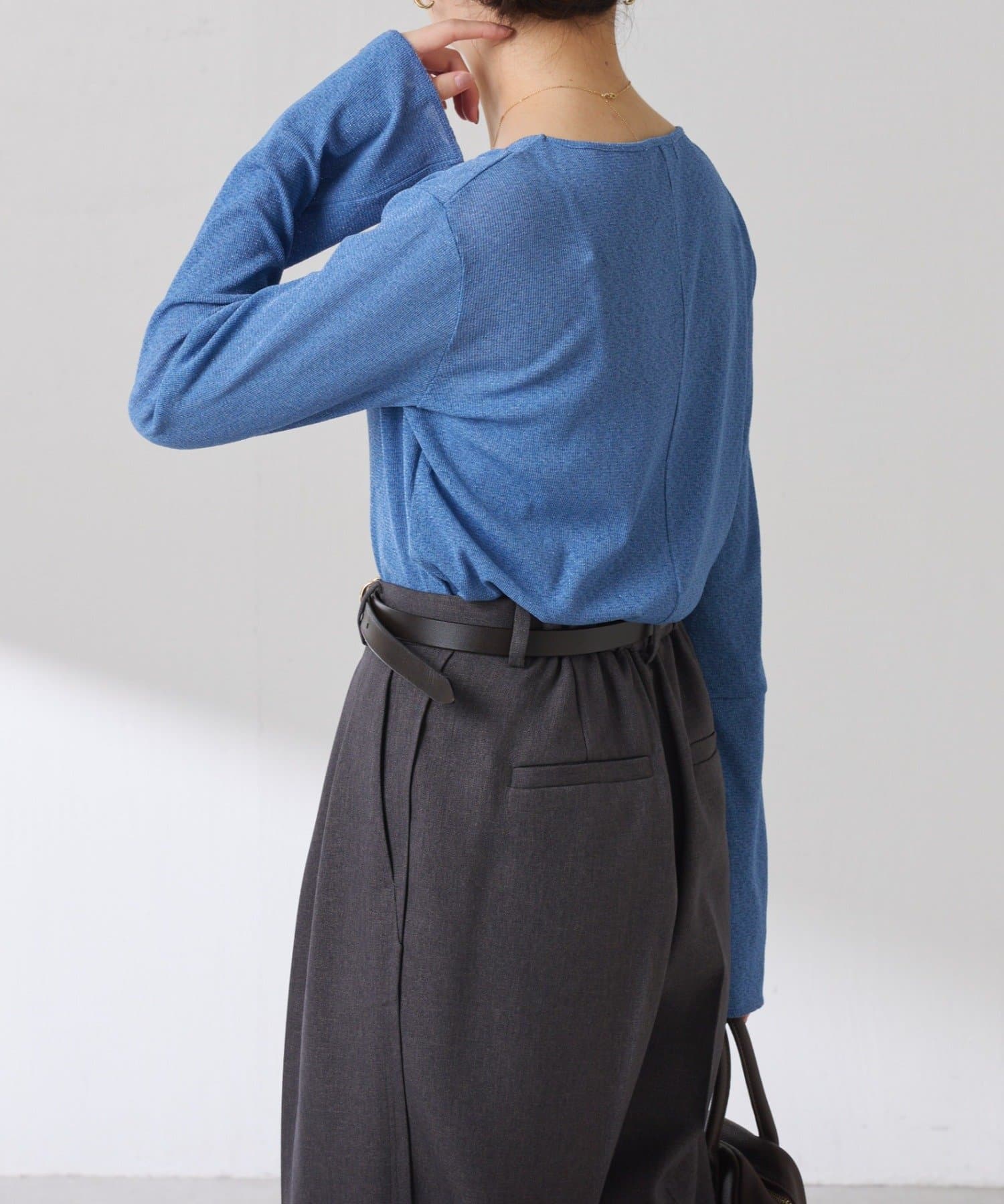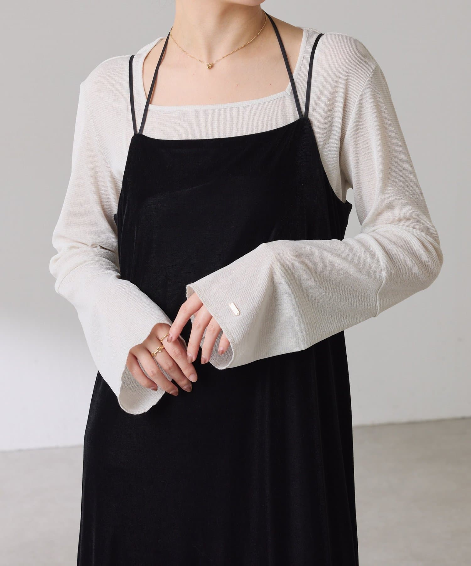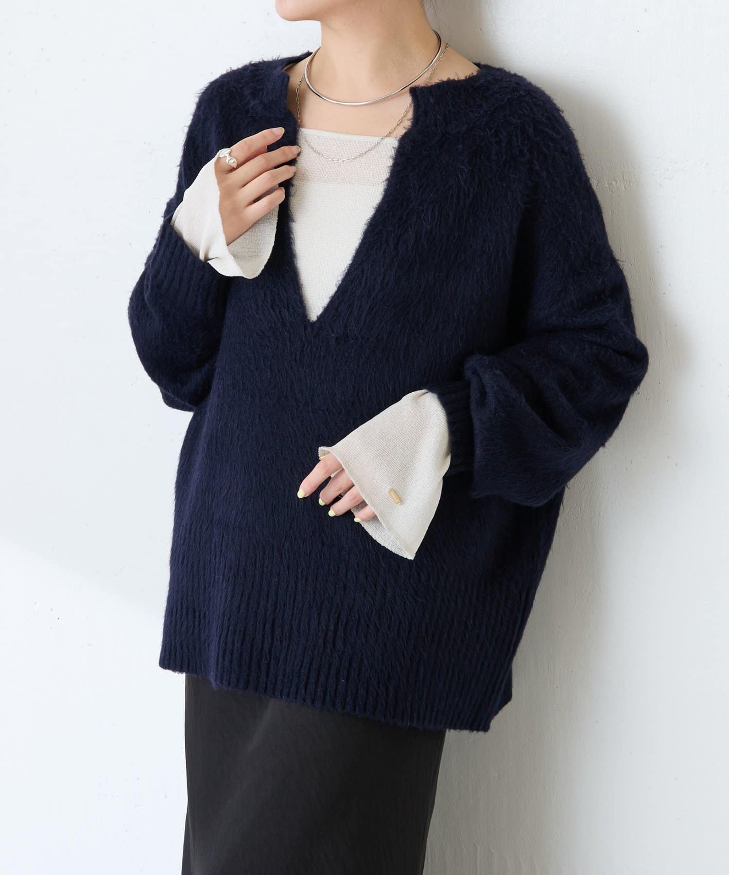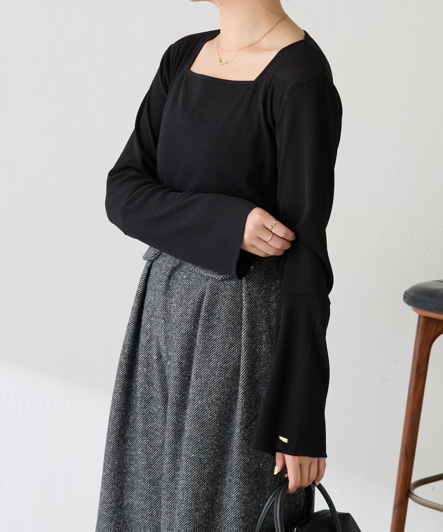 • ニットと重ねたときに袖口から覗くように、袖は長めのベルスリーブにしています。