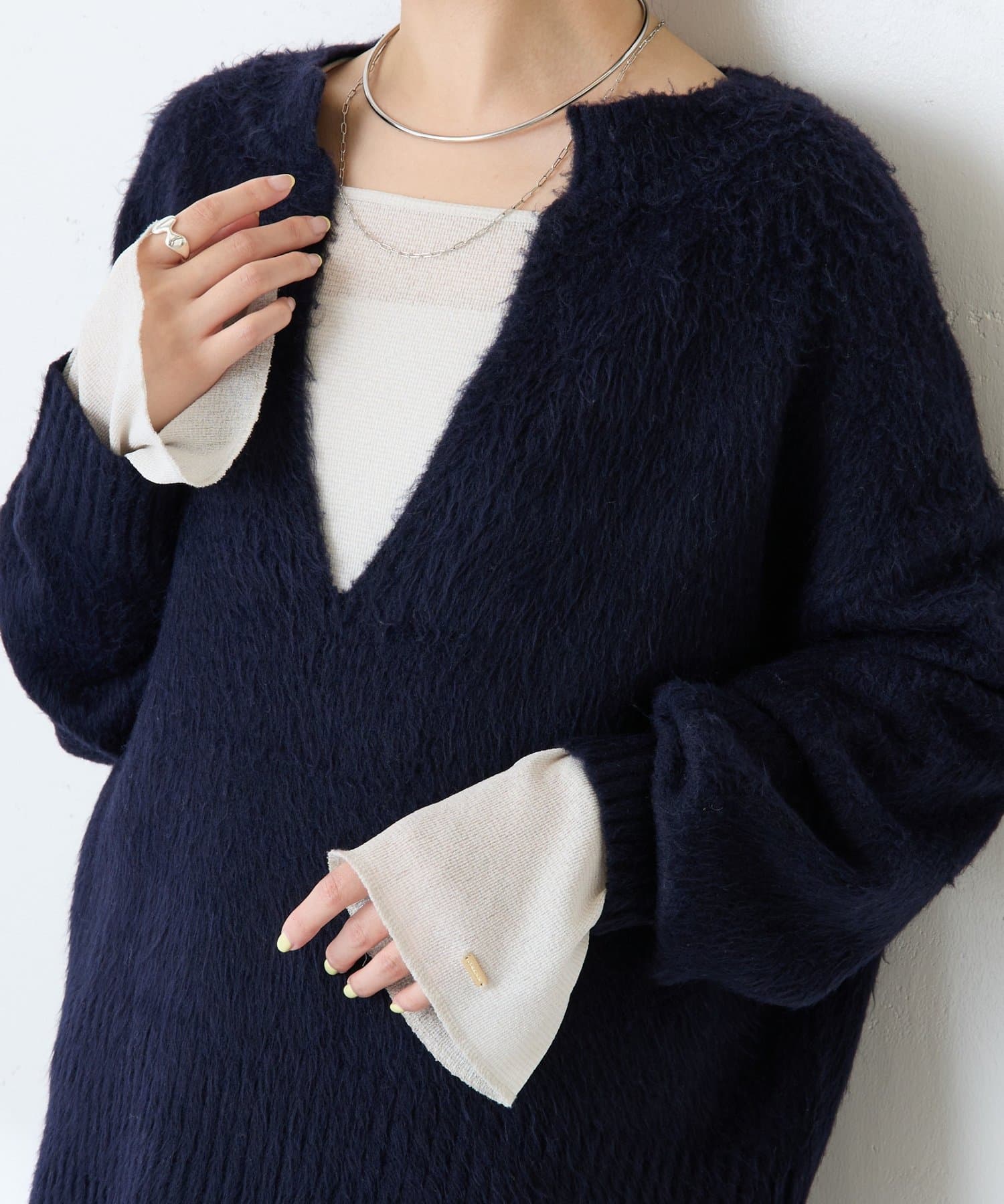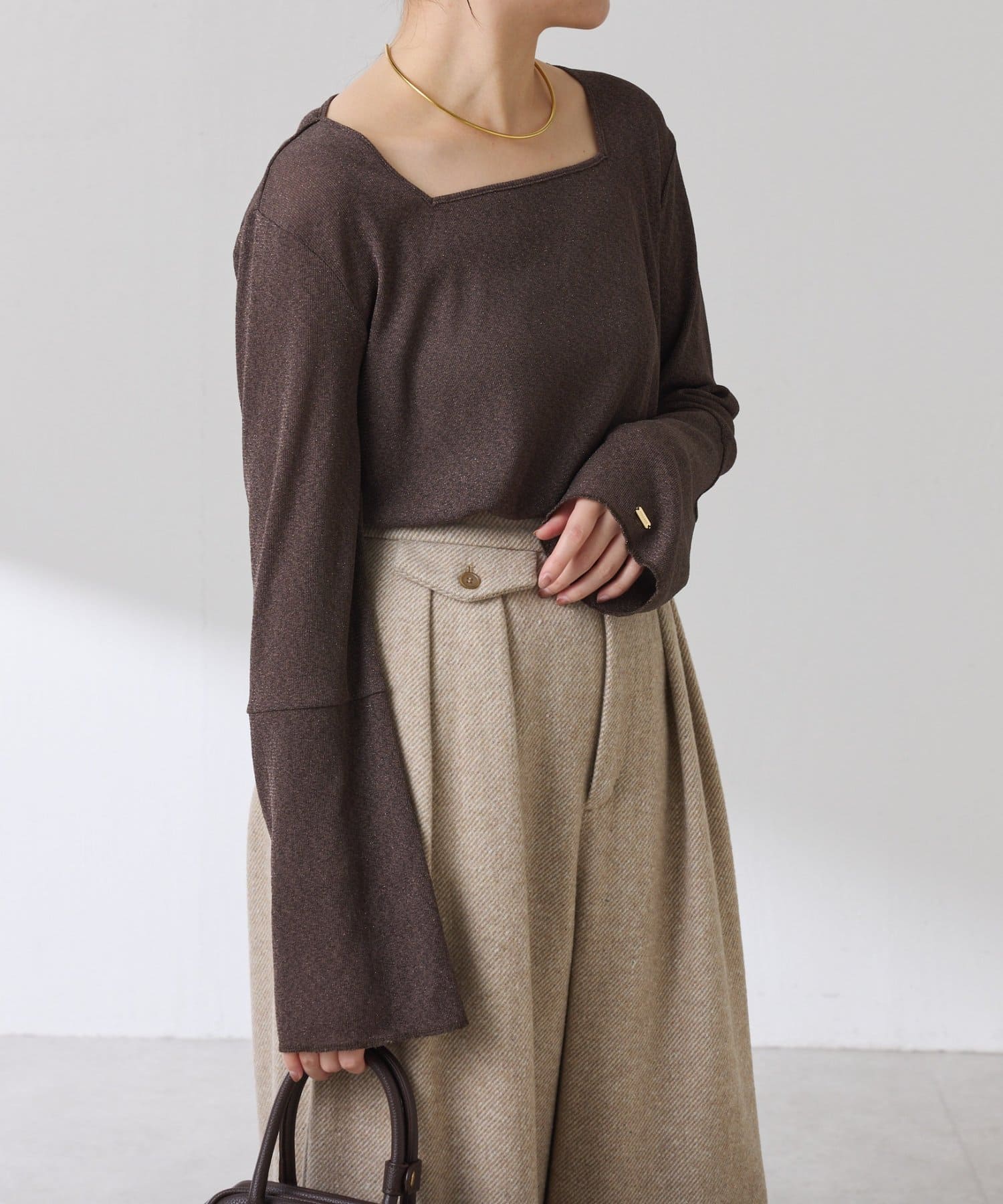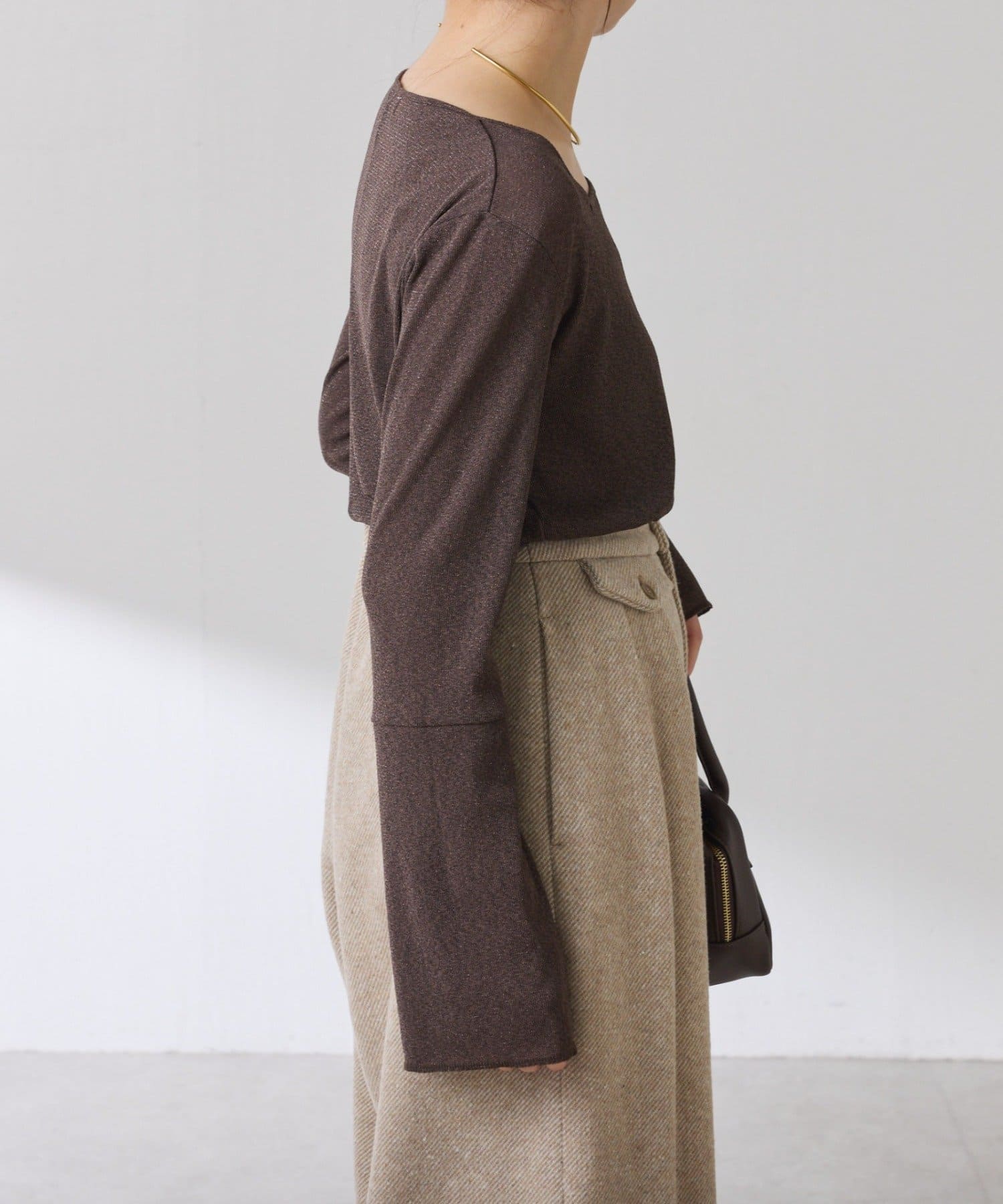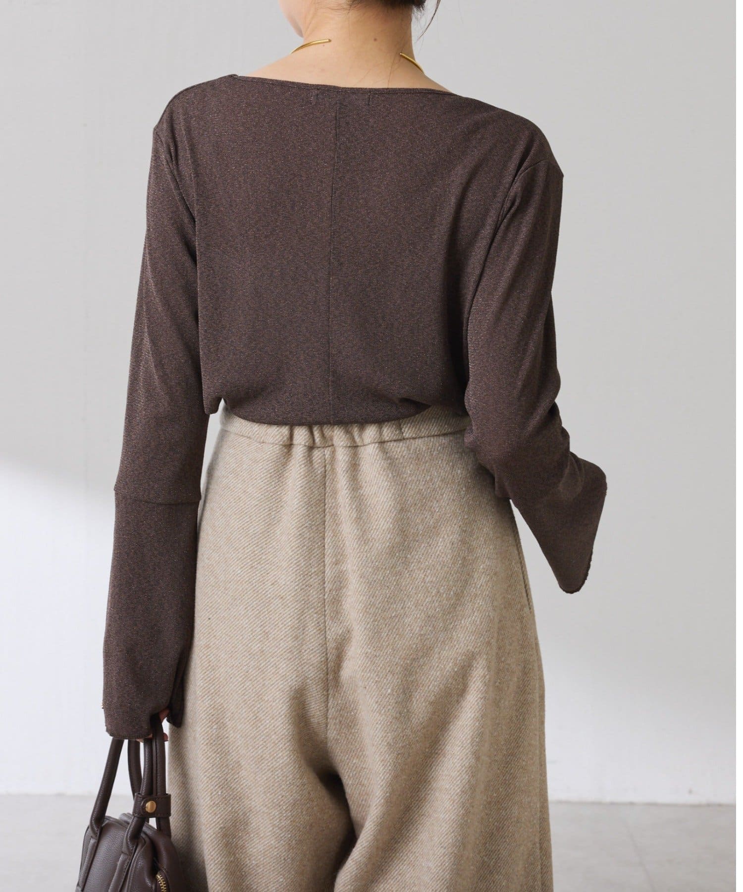 • ニットと重ねたときに袖口から覗くように、袖は長めのベルスリーブにしています。