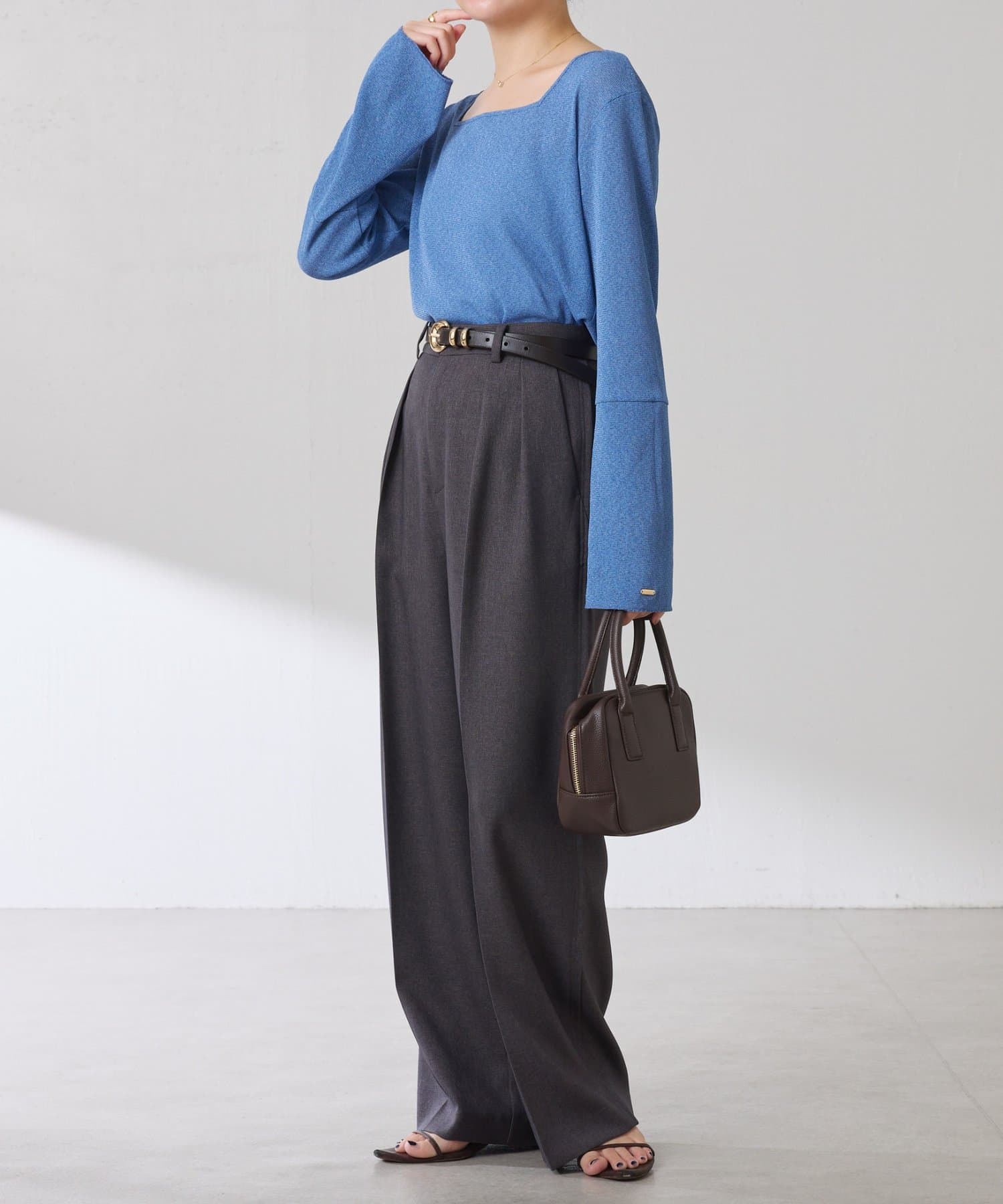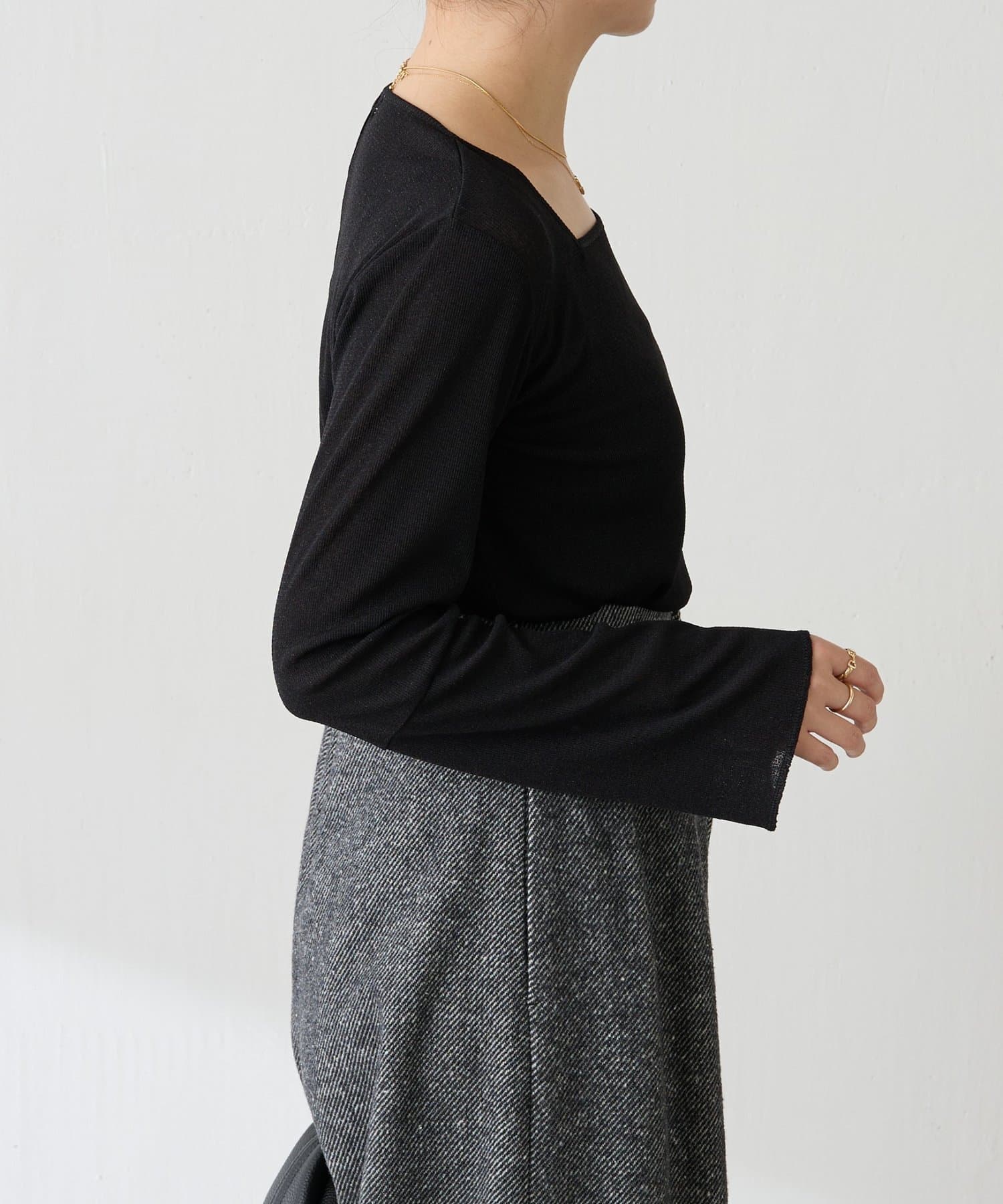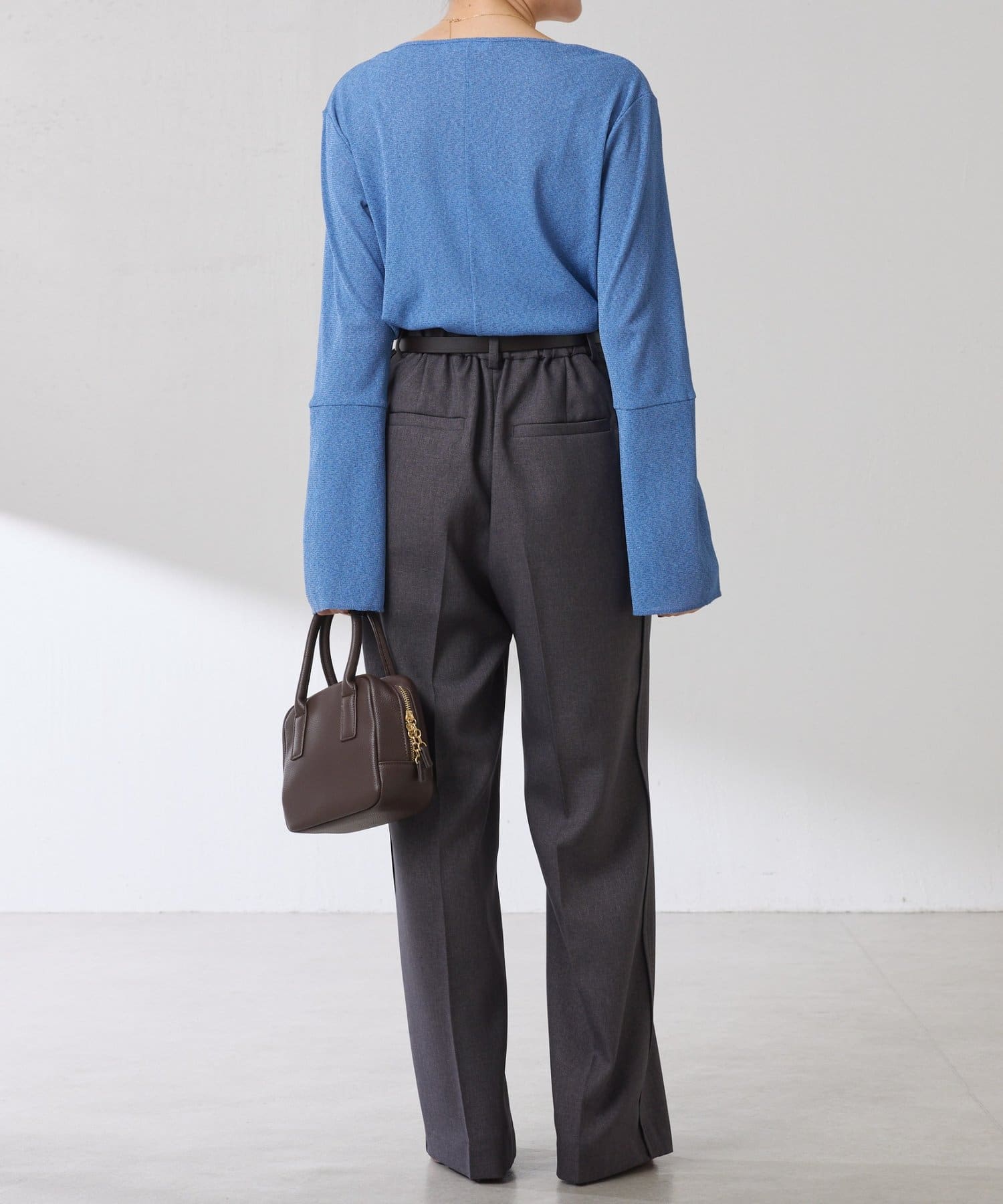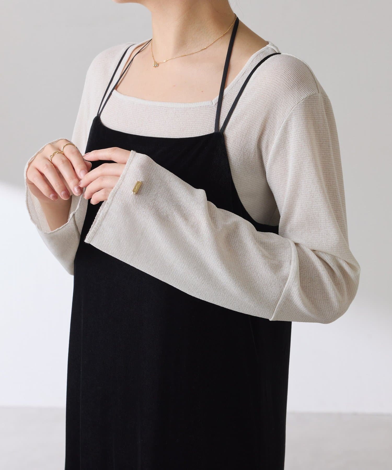 • ニットと重ねたときに袖口から覗くように、袖は長めのベルスリーブにしています。