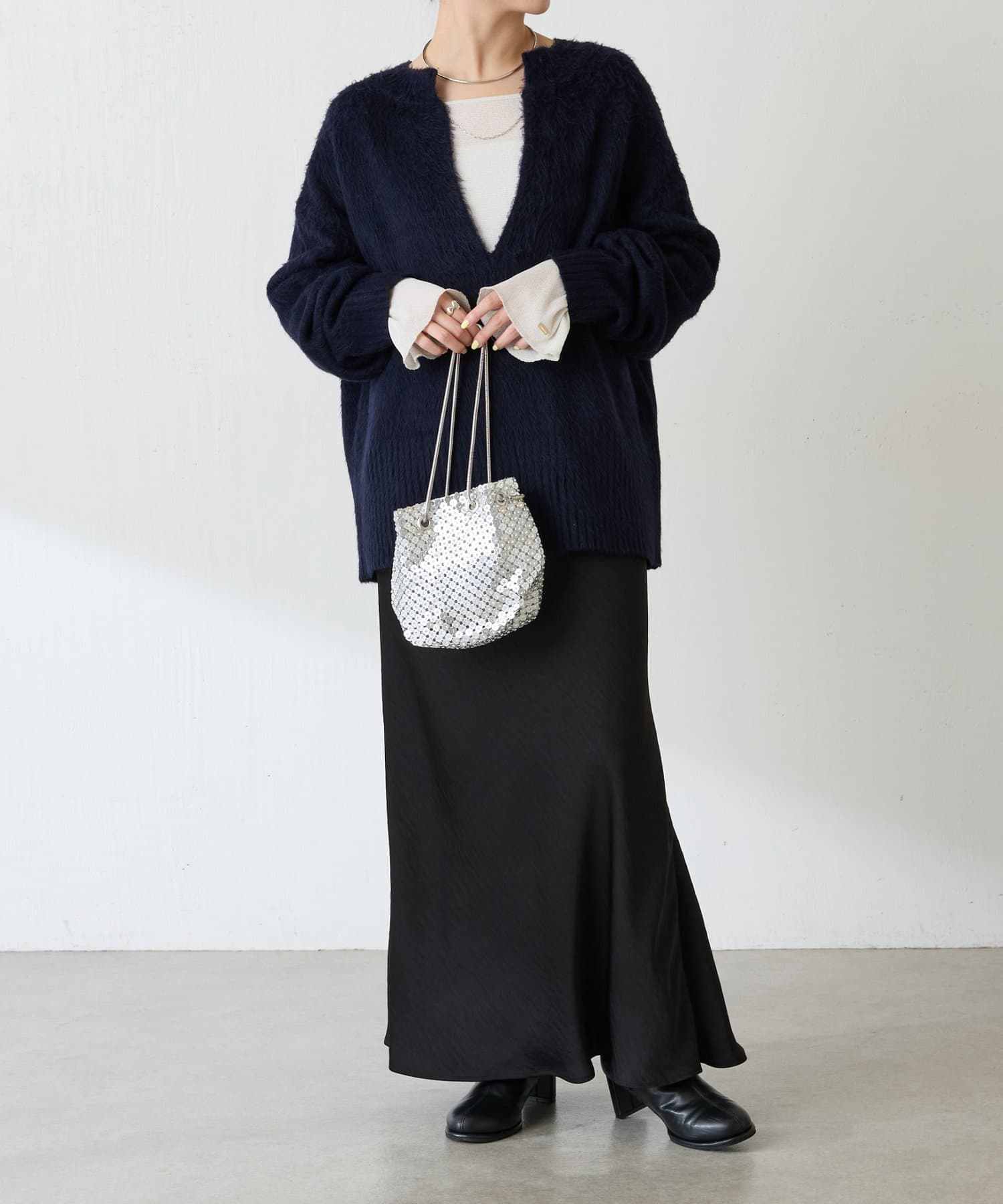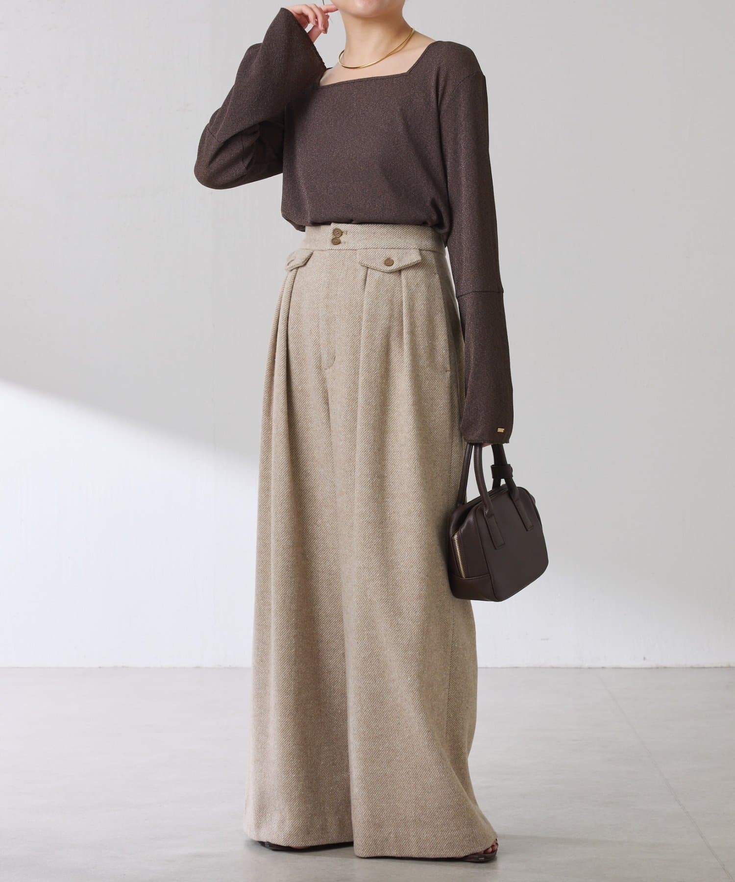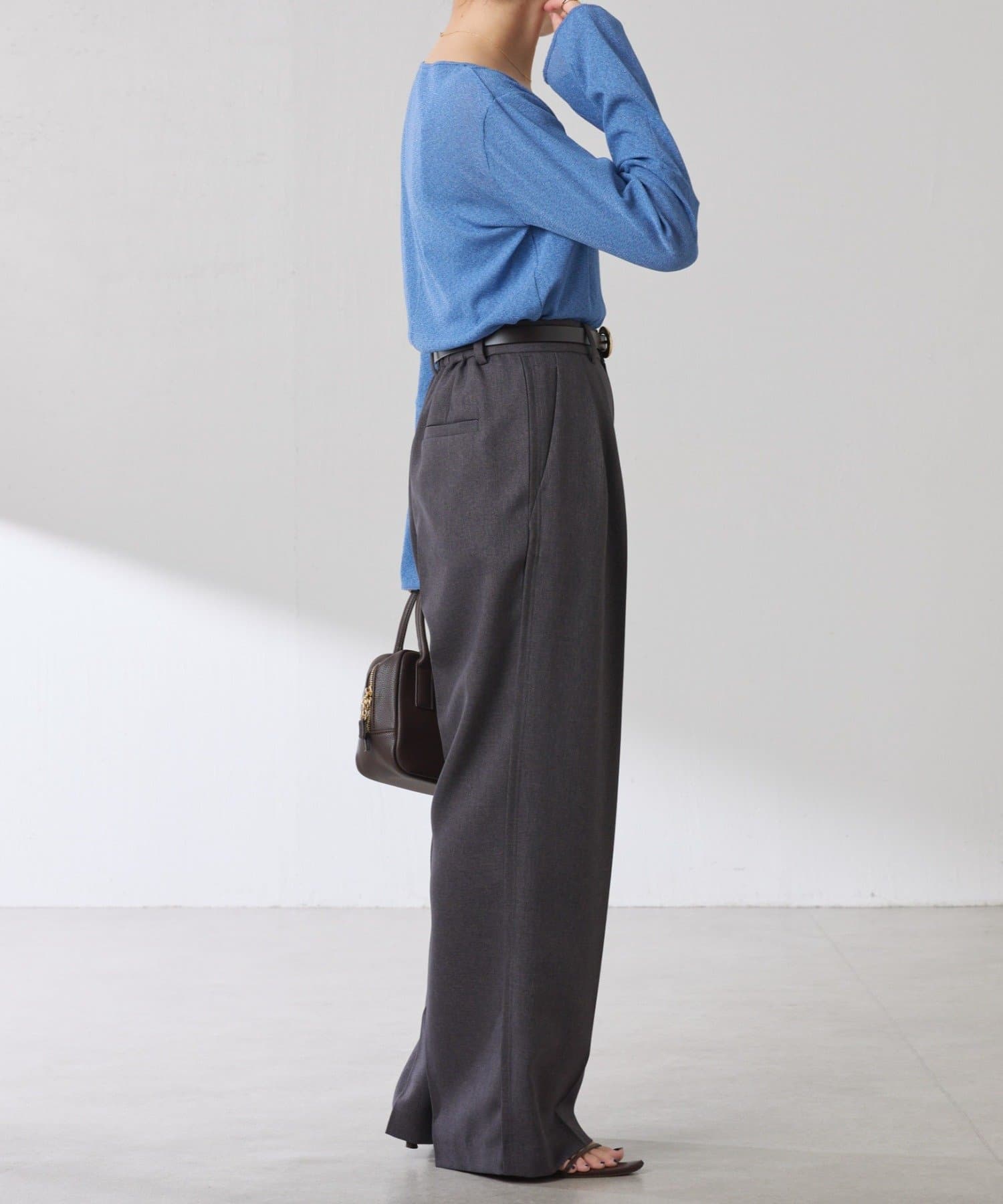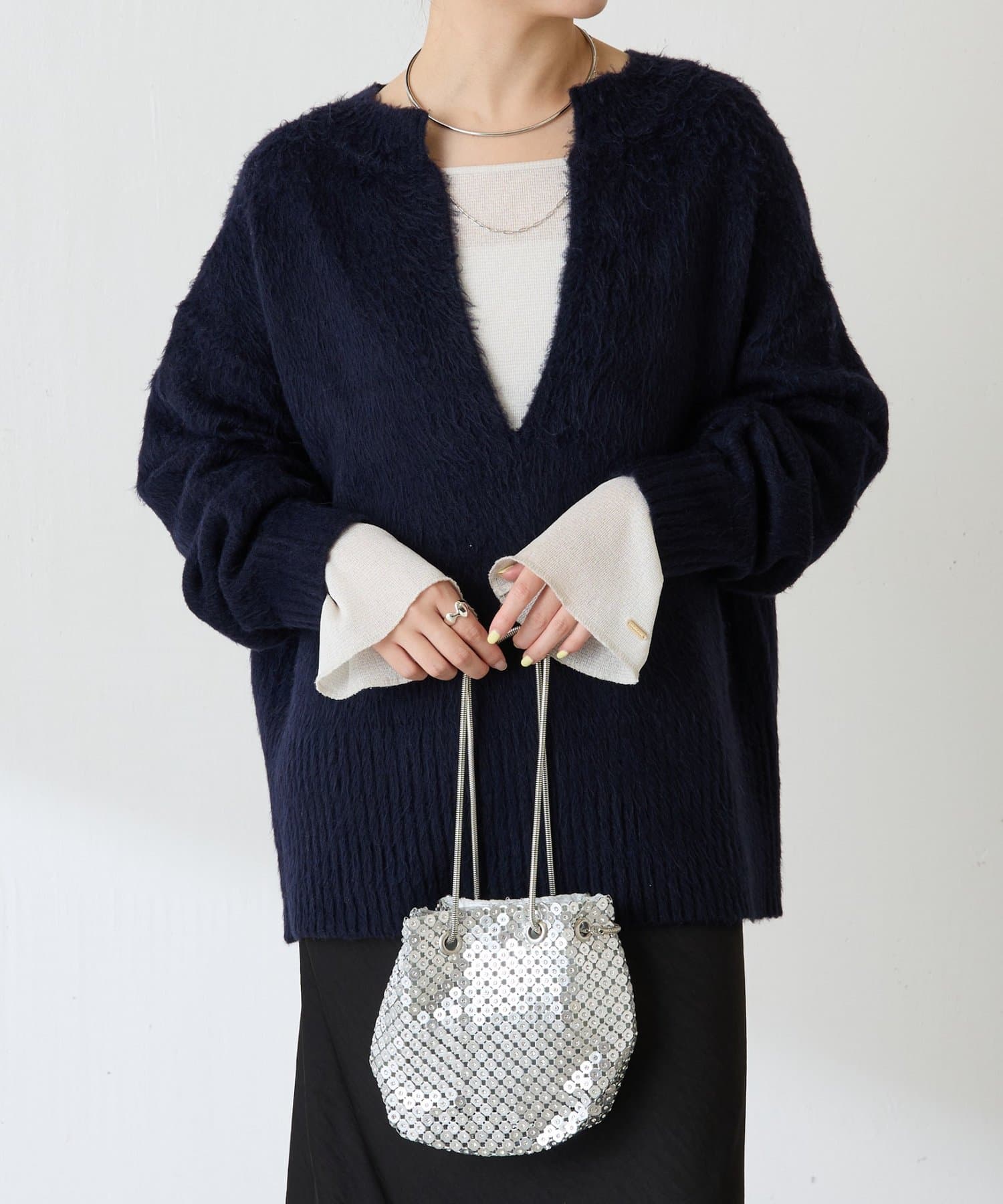 • ニットと重ねたときに袖口から覗くように、袖は長めのベルスリーブにしています。