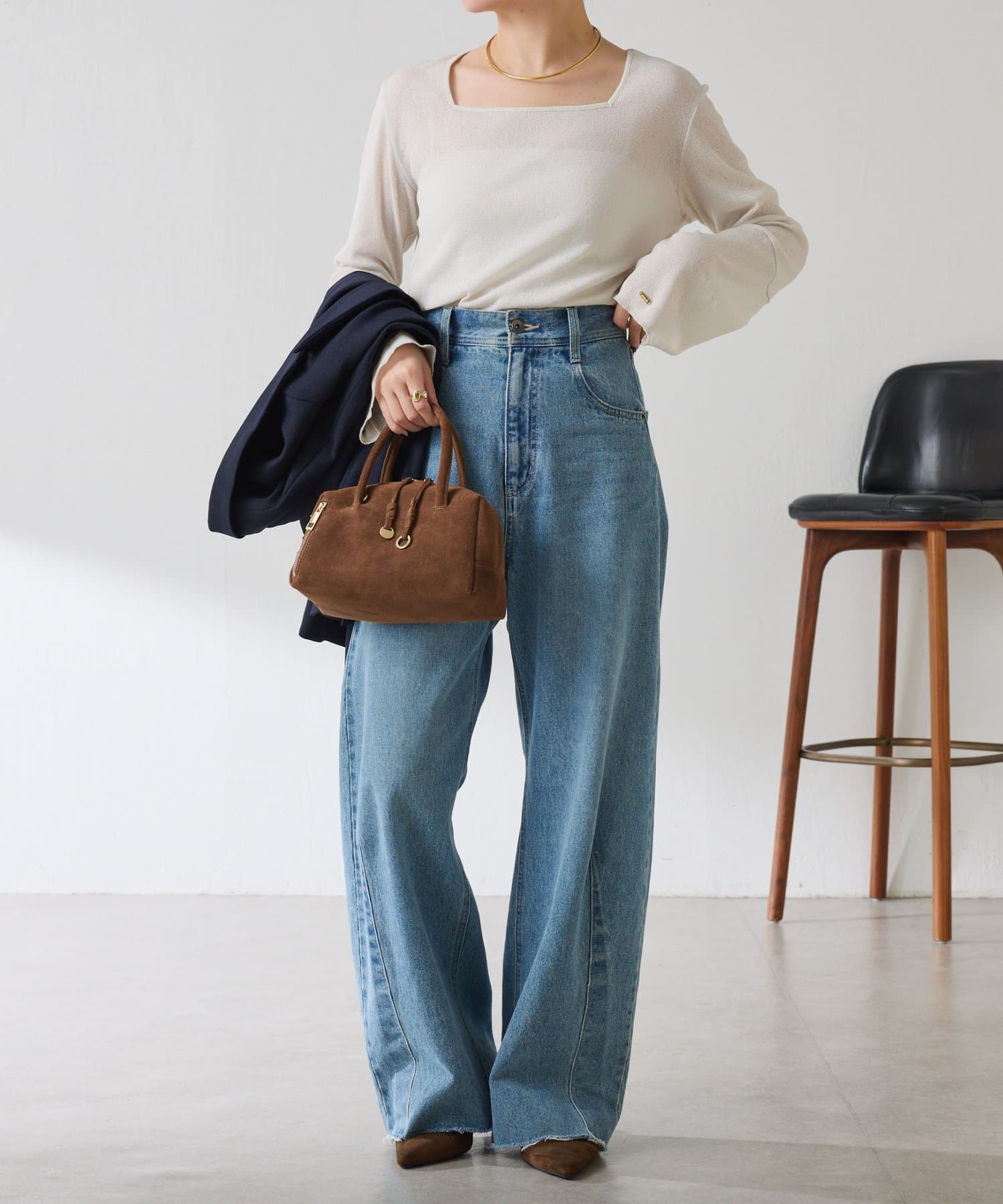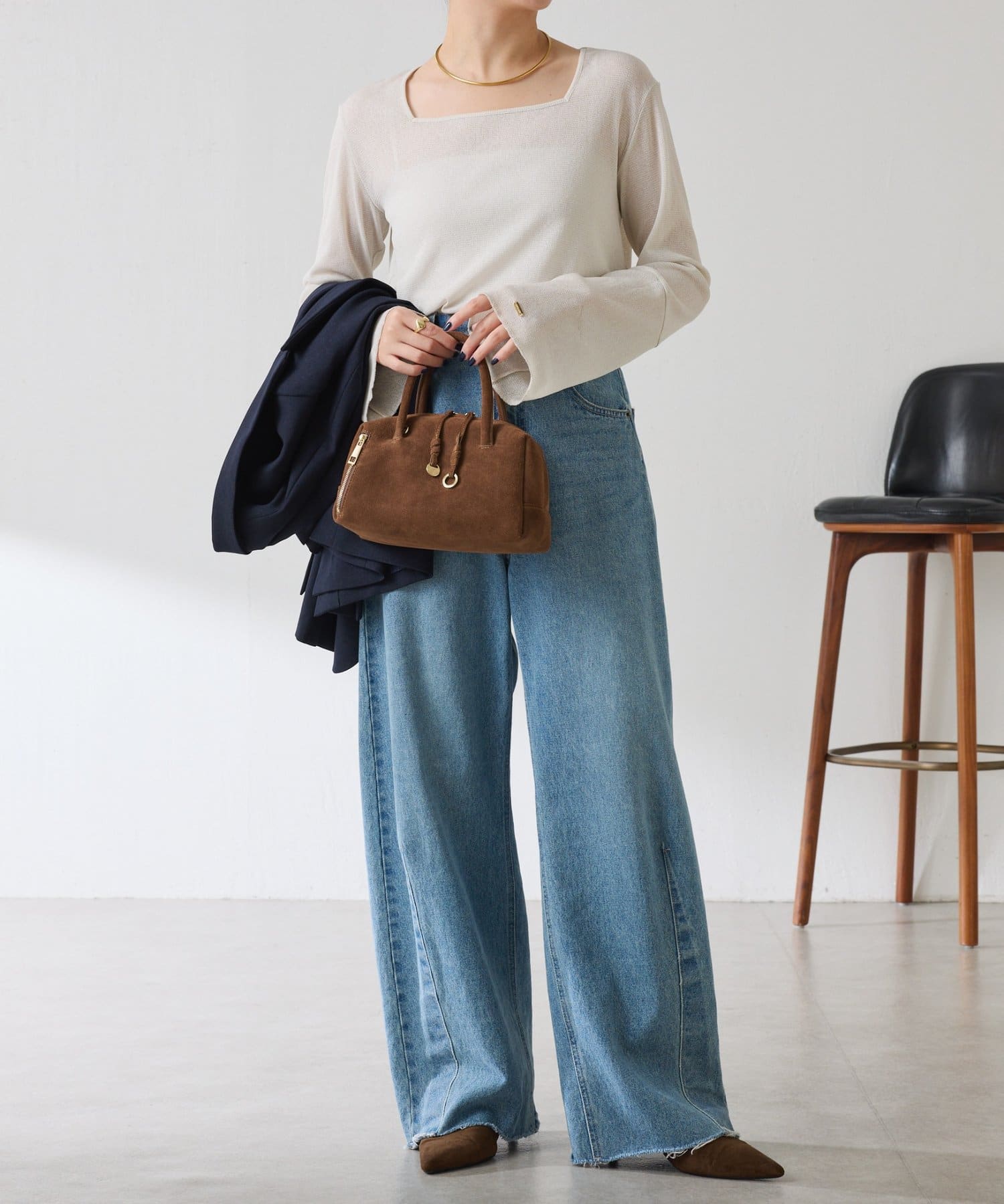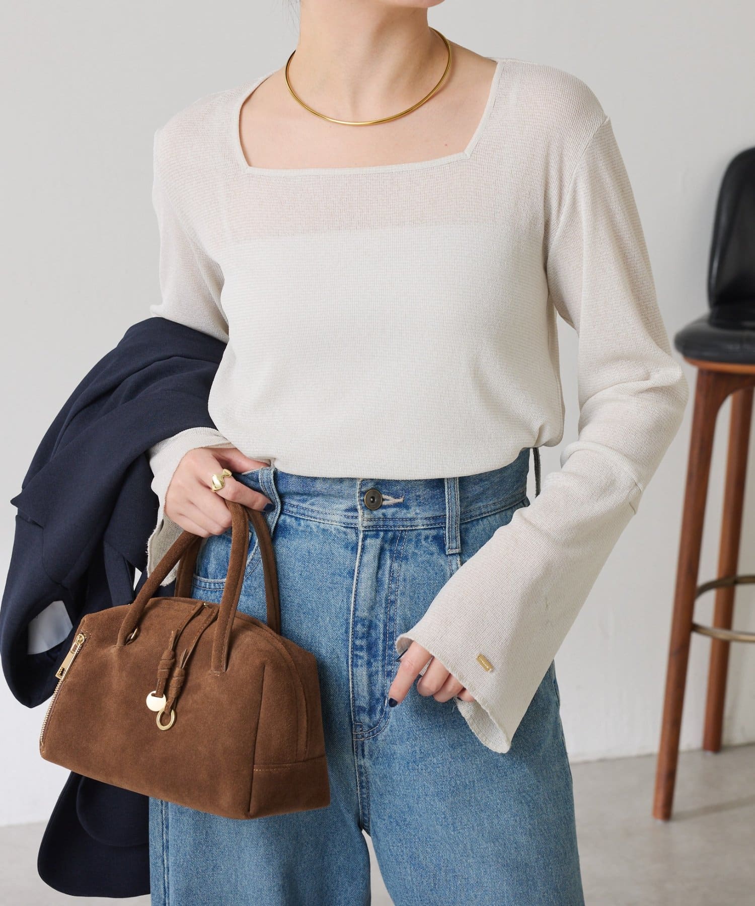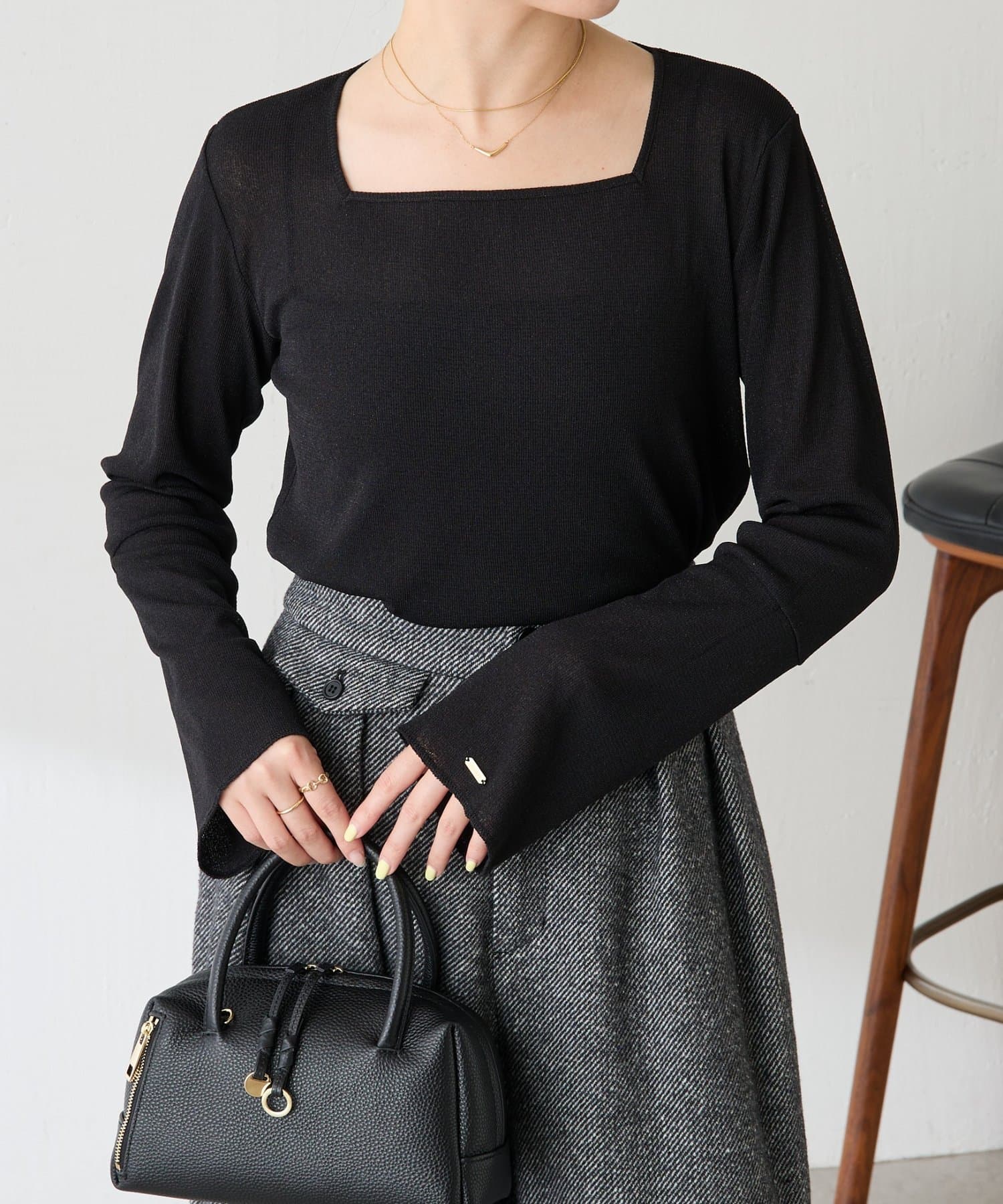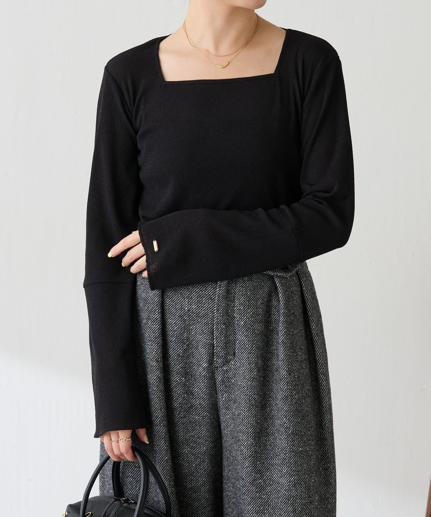 すっきりしたスクエアネックなのでVネックニットやジャケットと合わせても抜け感が出ます◎