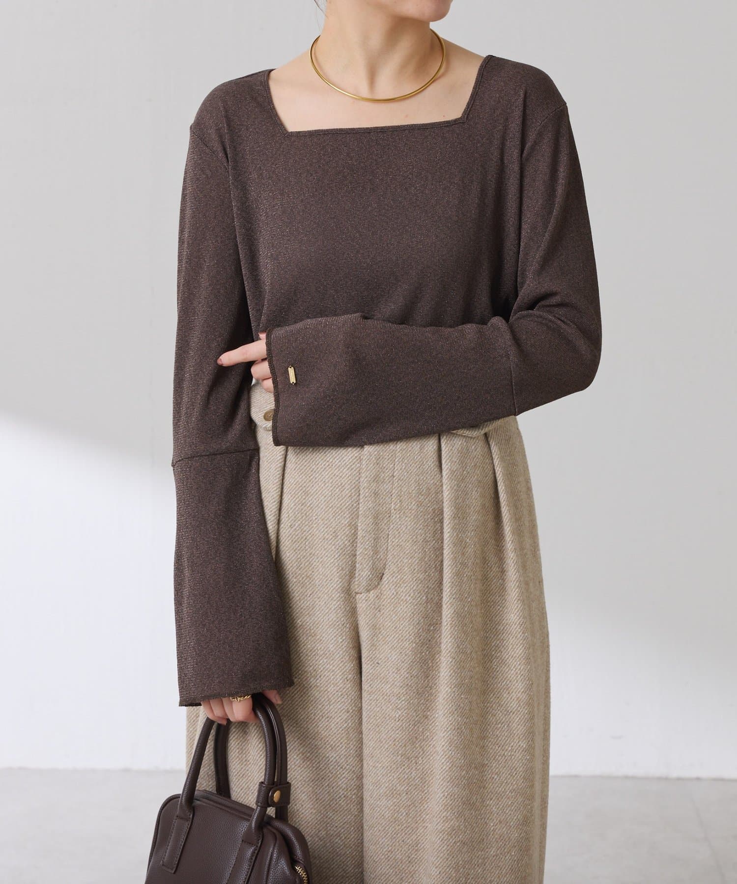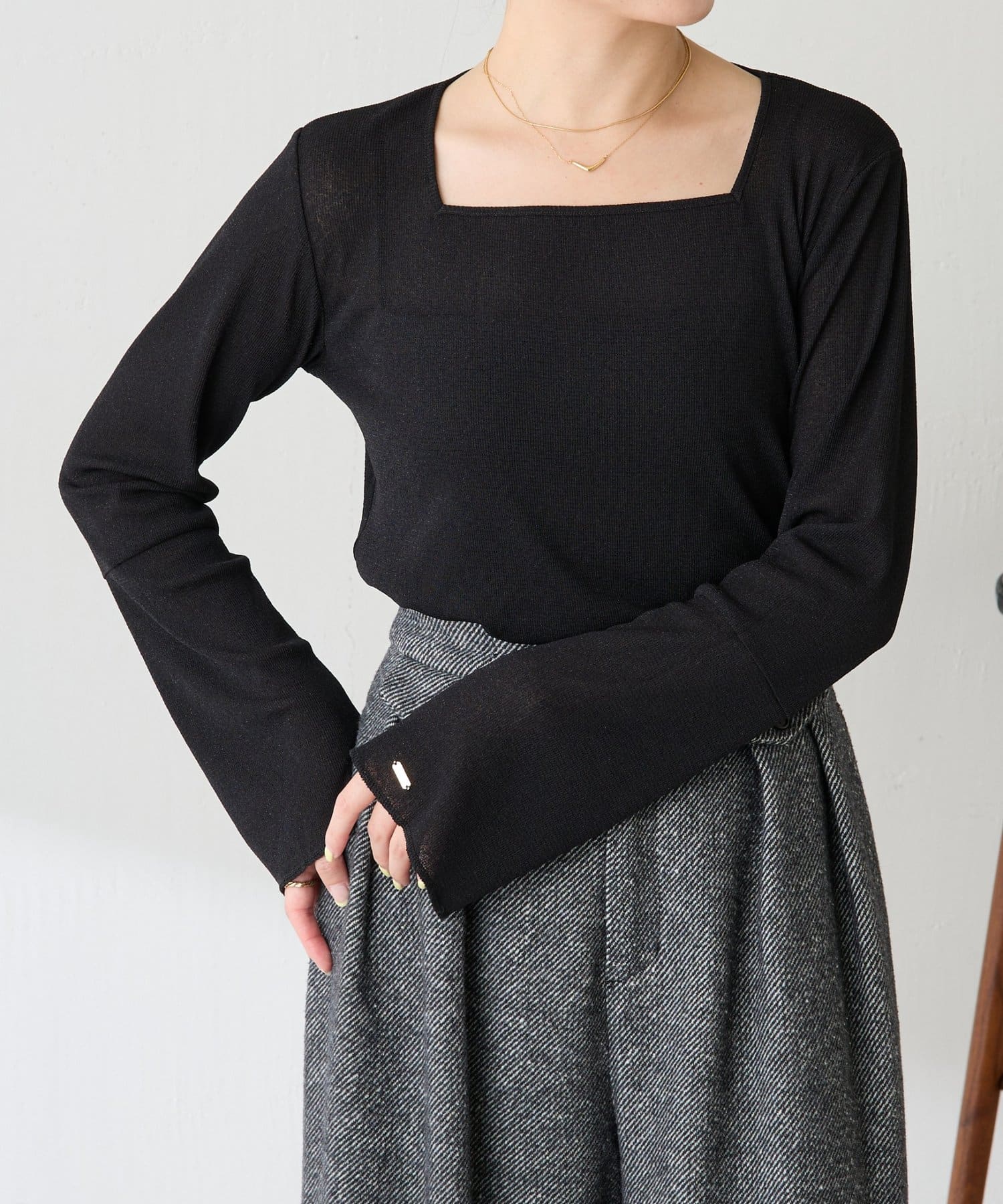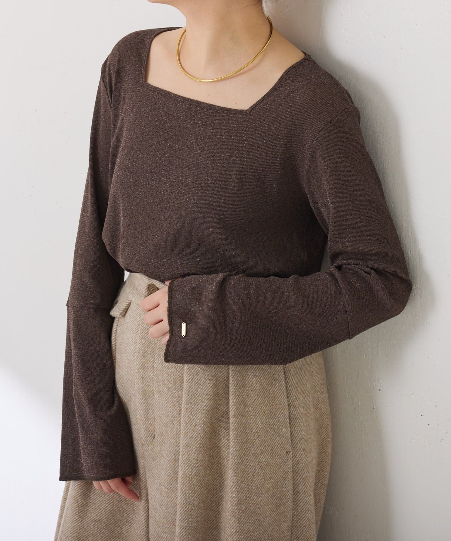 ・首元が開いたニットと合わせても抜け感が出せるスクエアネックのラメカットソー。