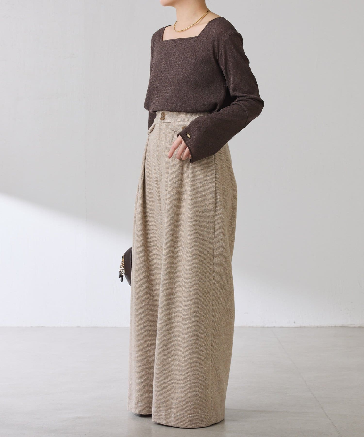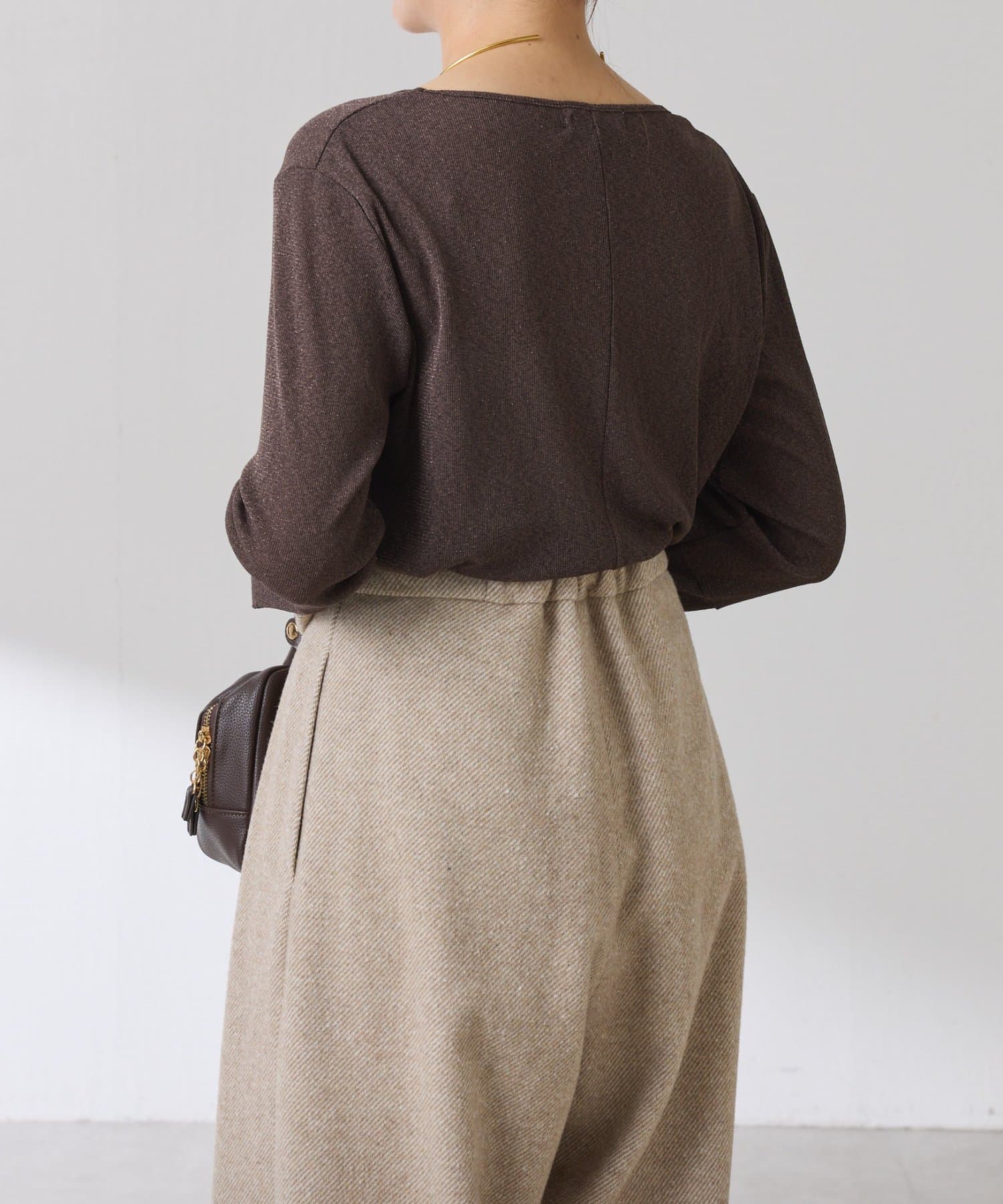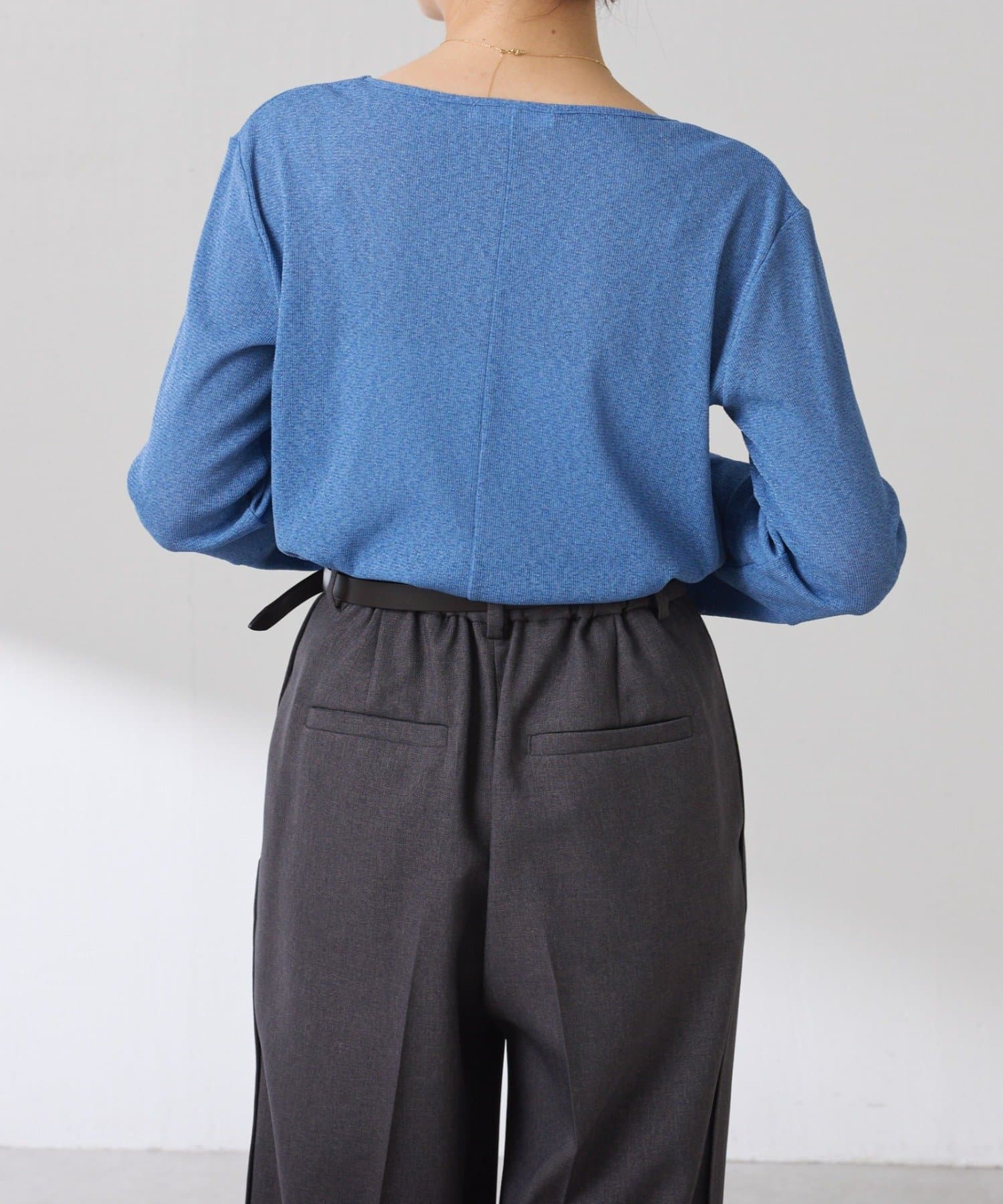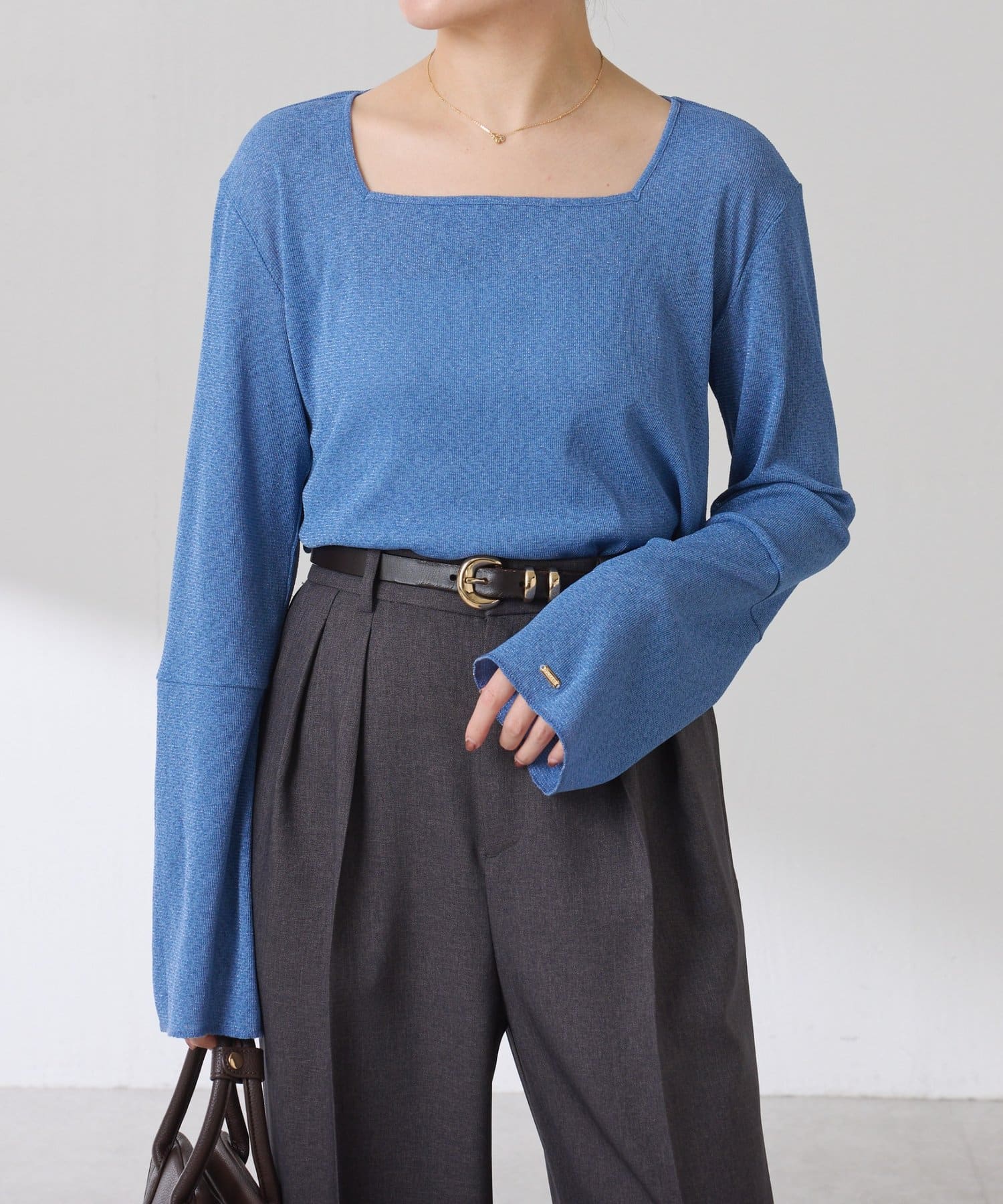 ・首元が開いたニットと合わせても抜け感が出せるスクエアネックのラメカットソー。