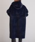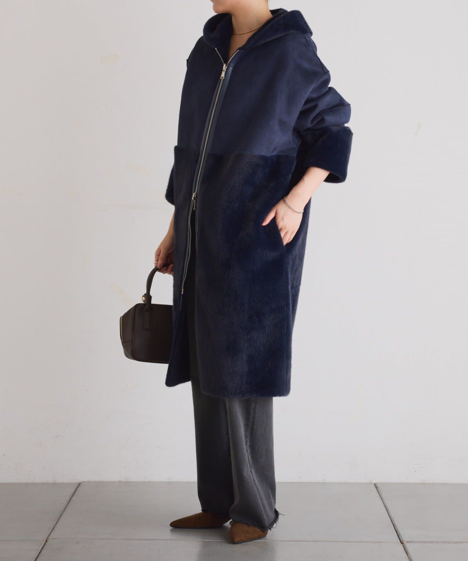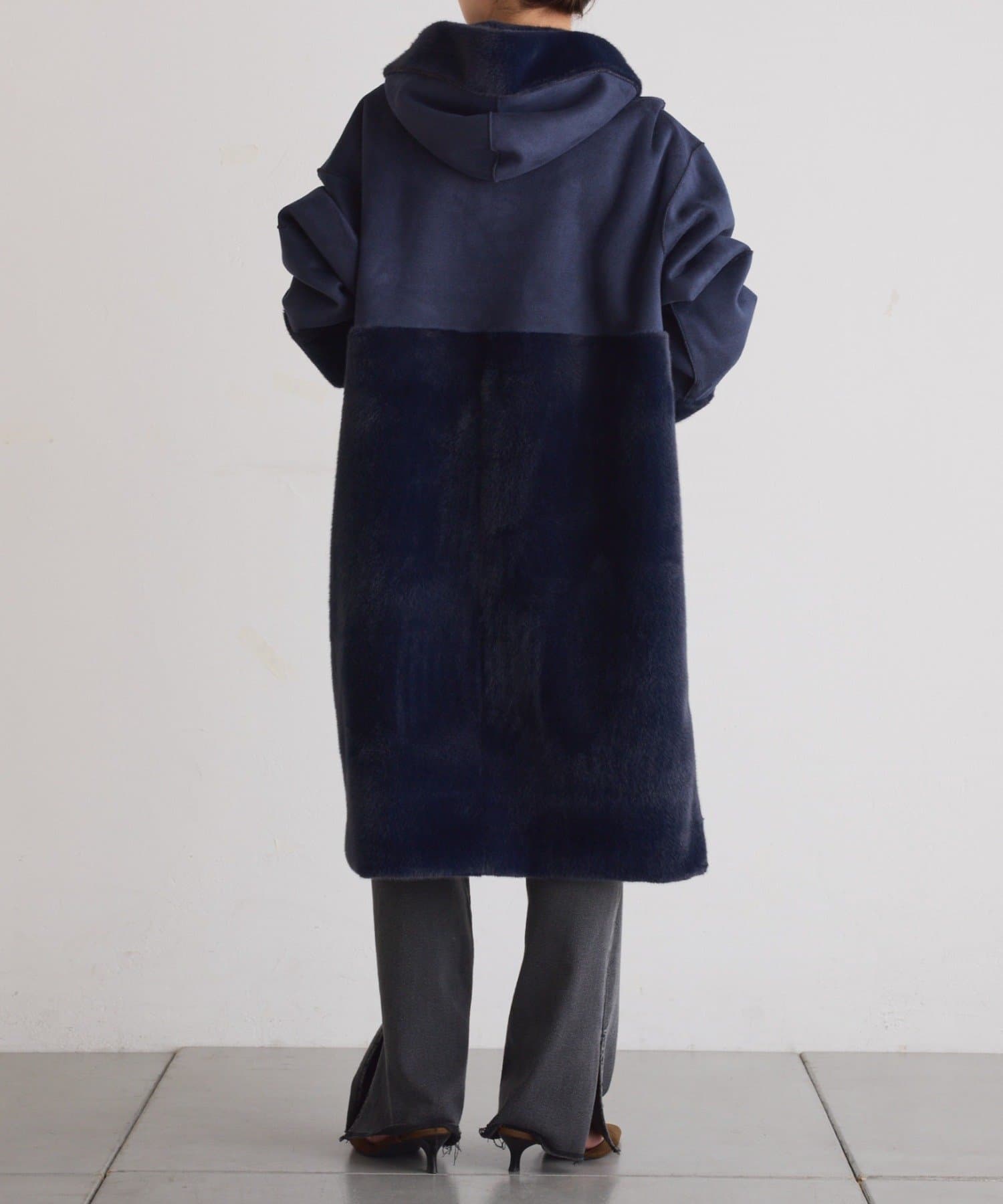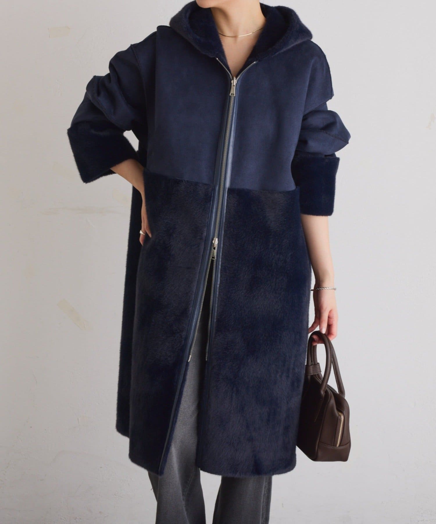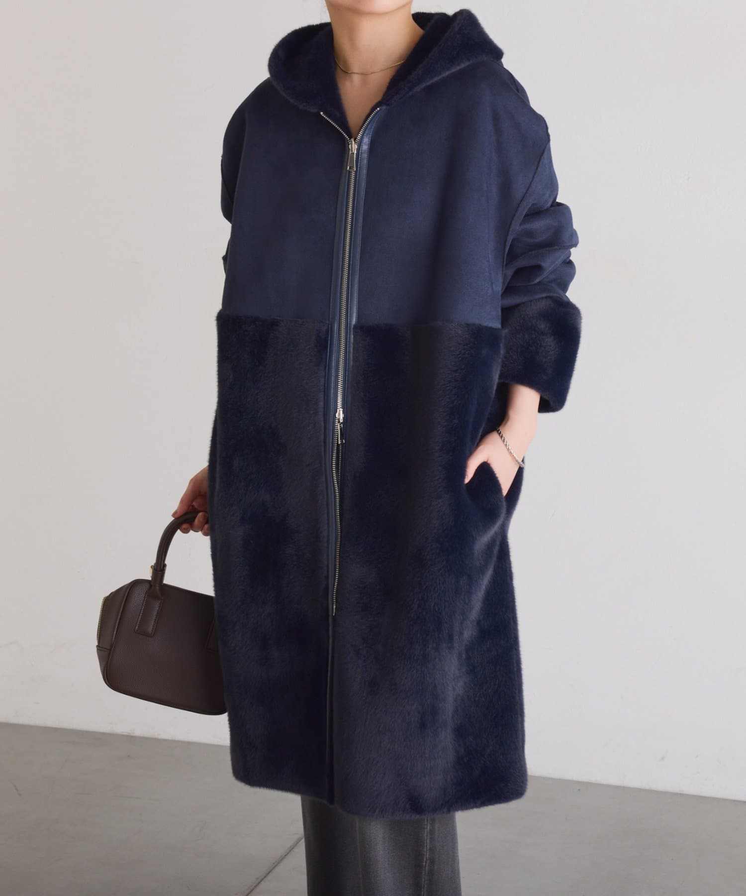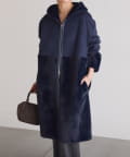 ・フェイクスエードとフェイクファーのコンビと、全面フェイクファーのリバーシブルで着られるロングコート。