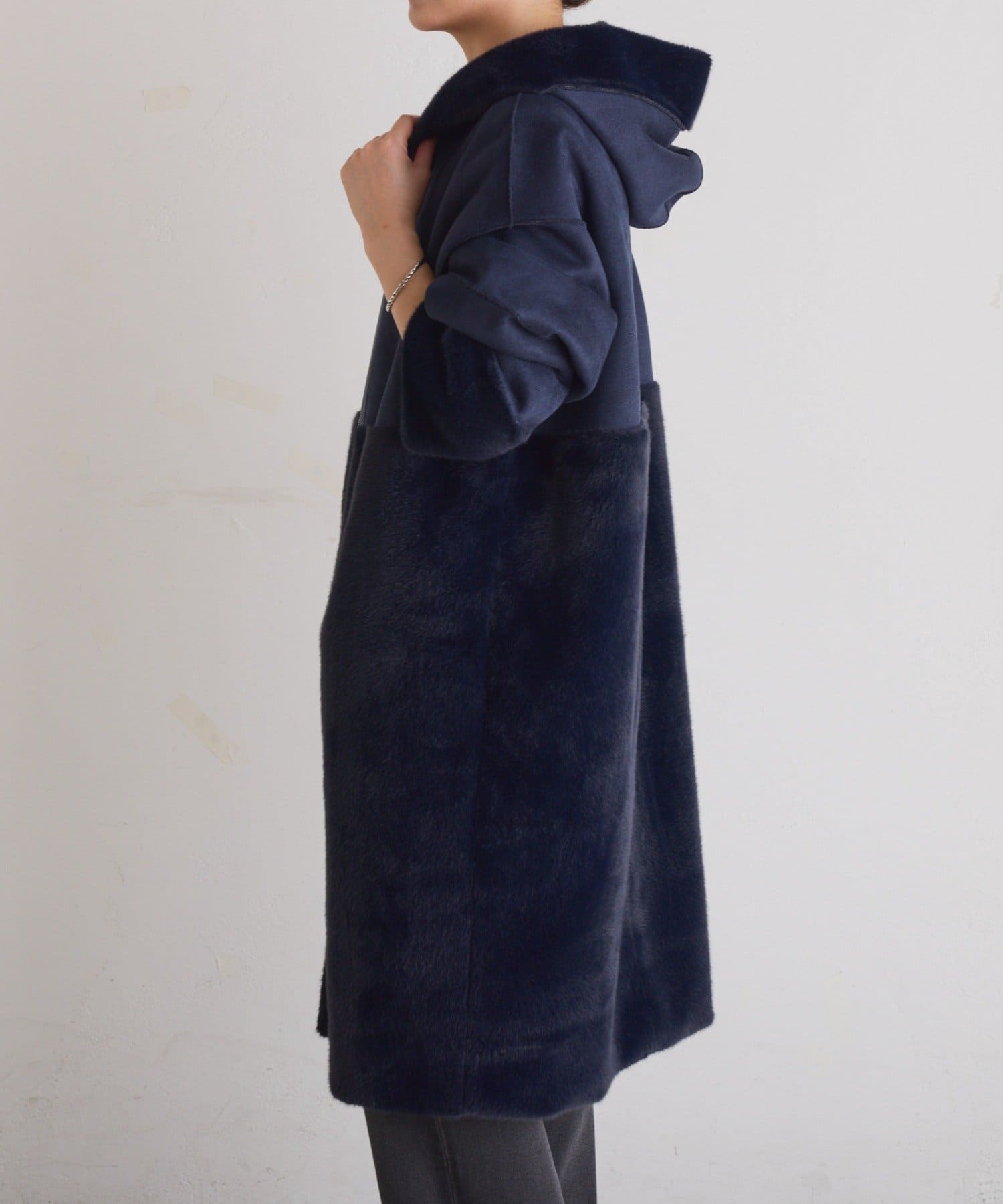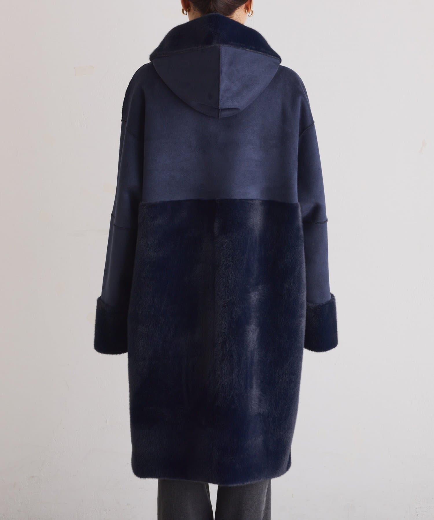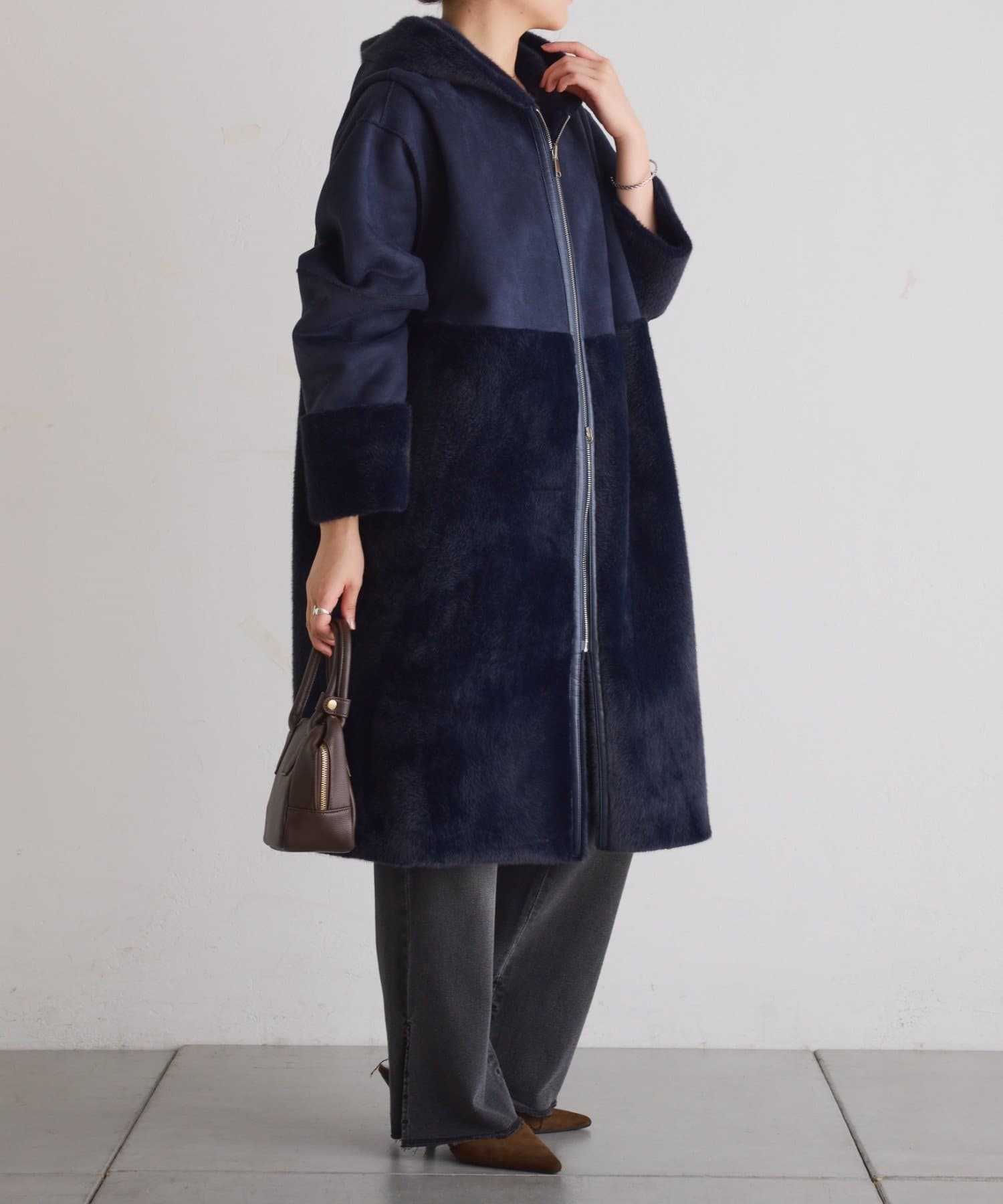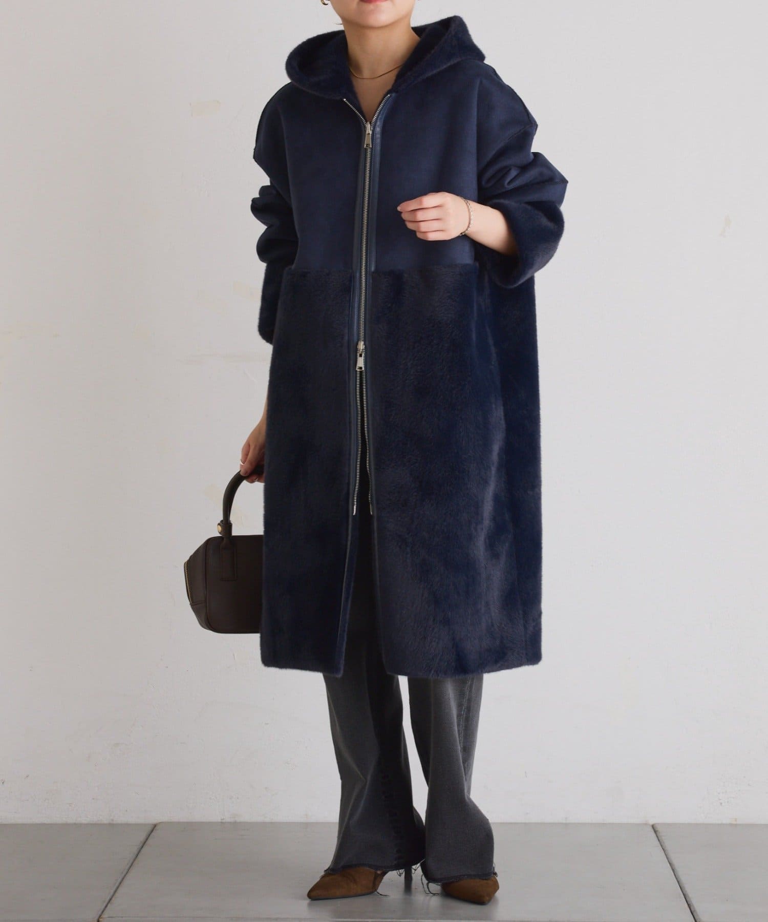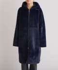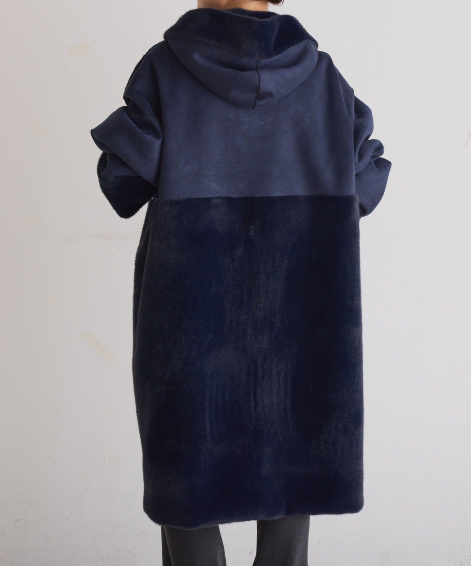 ・フェイクスエードとフェイクファーのコンビと、全面フェイクファーのリバーシブルで着られるロングコート。