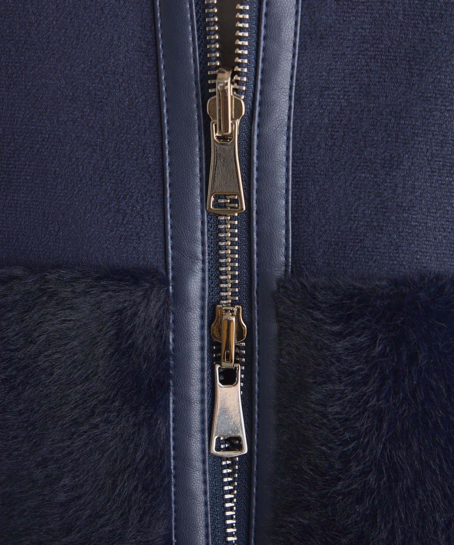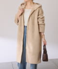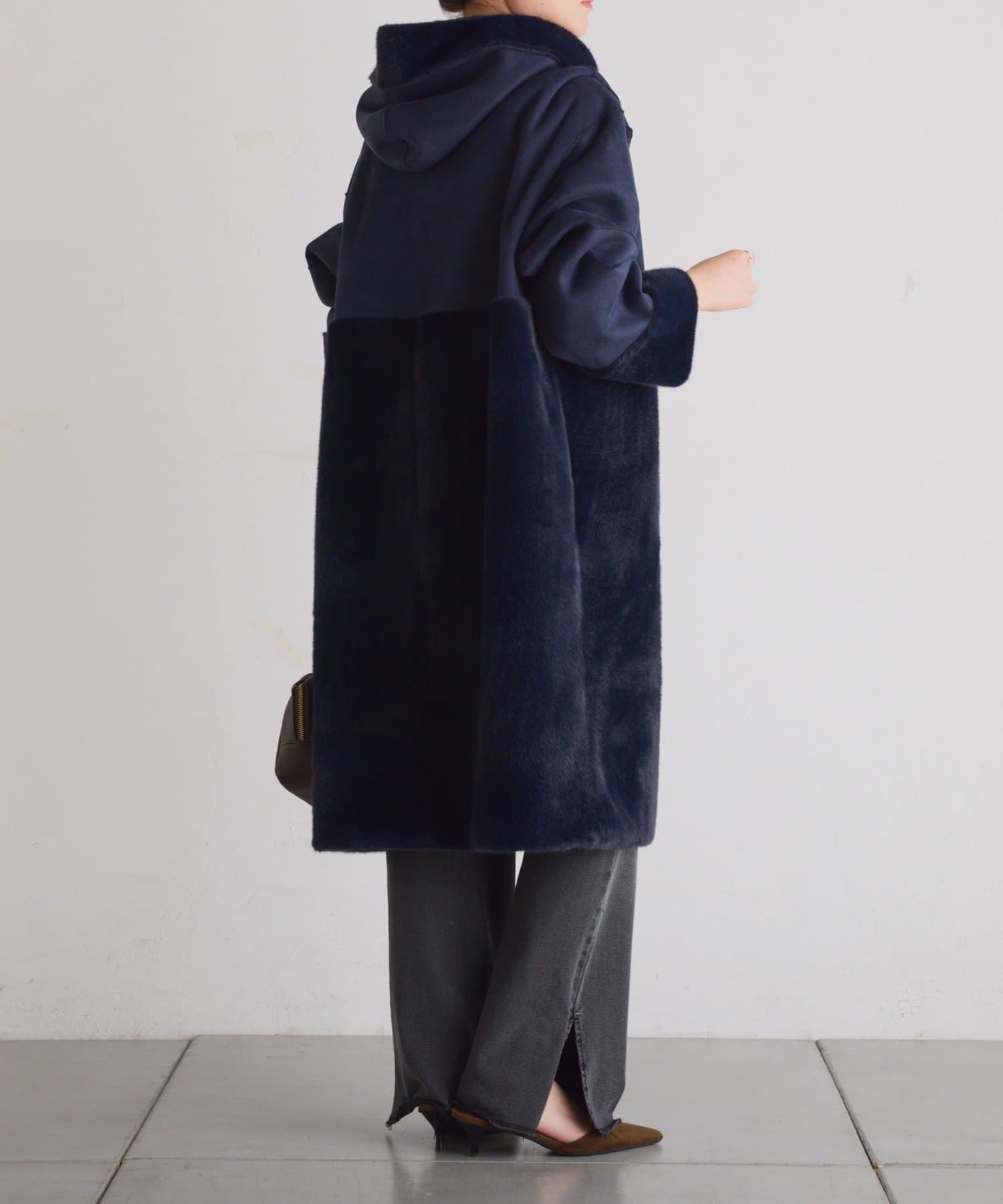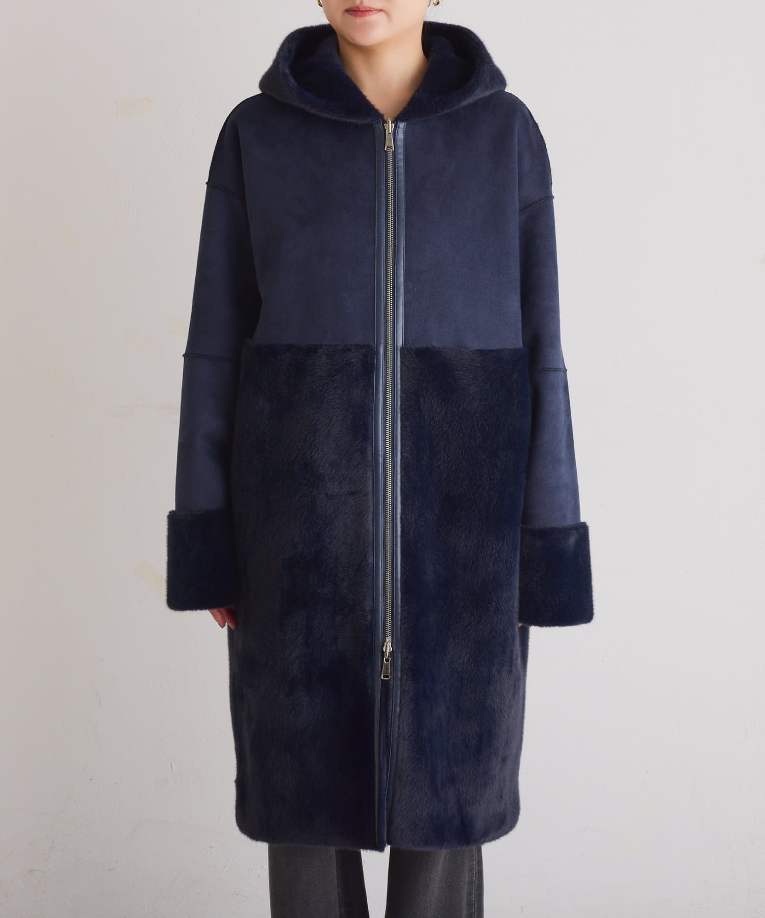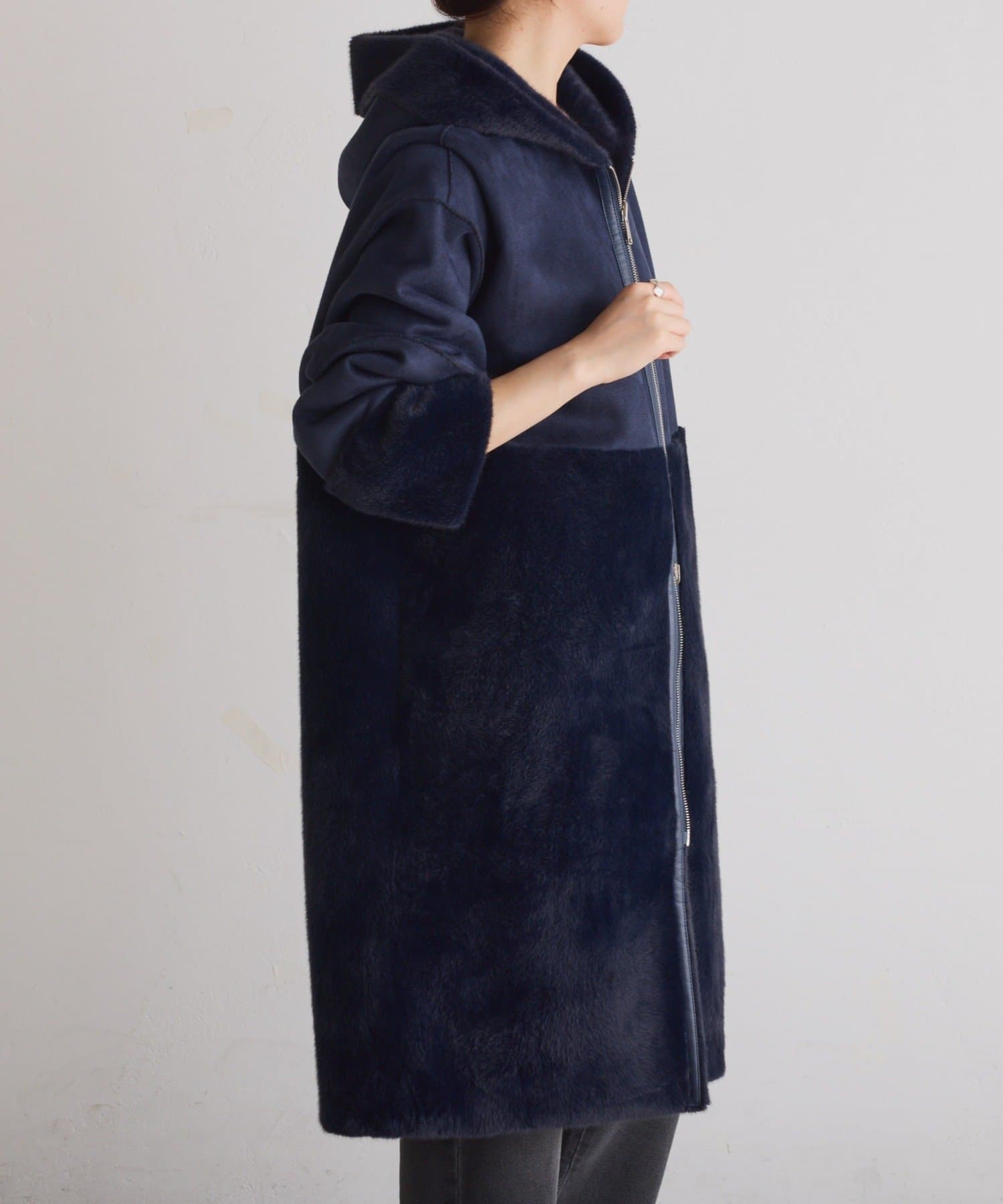 ・フェイクスエードとフェイクファーのコンビと、全面フェイクファーのリバーシブルで着られるロングコート。