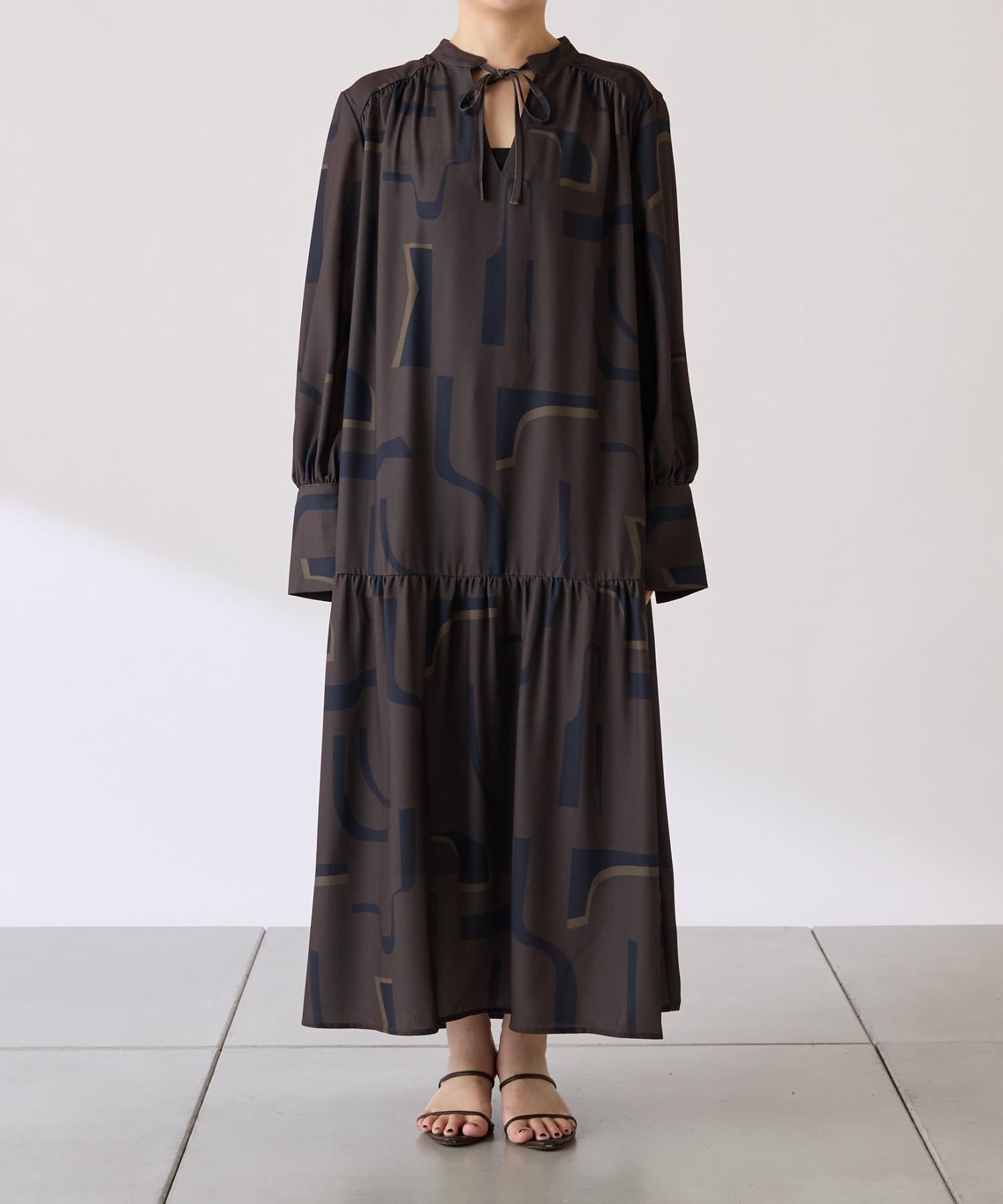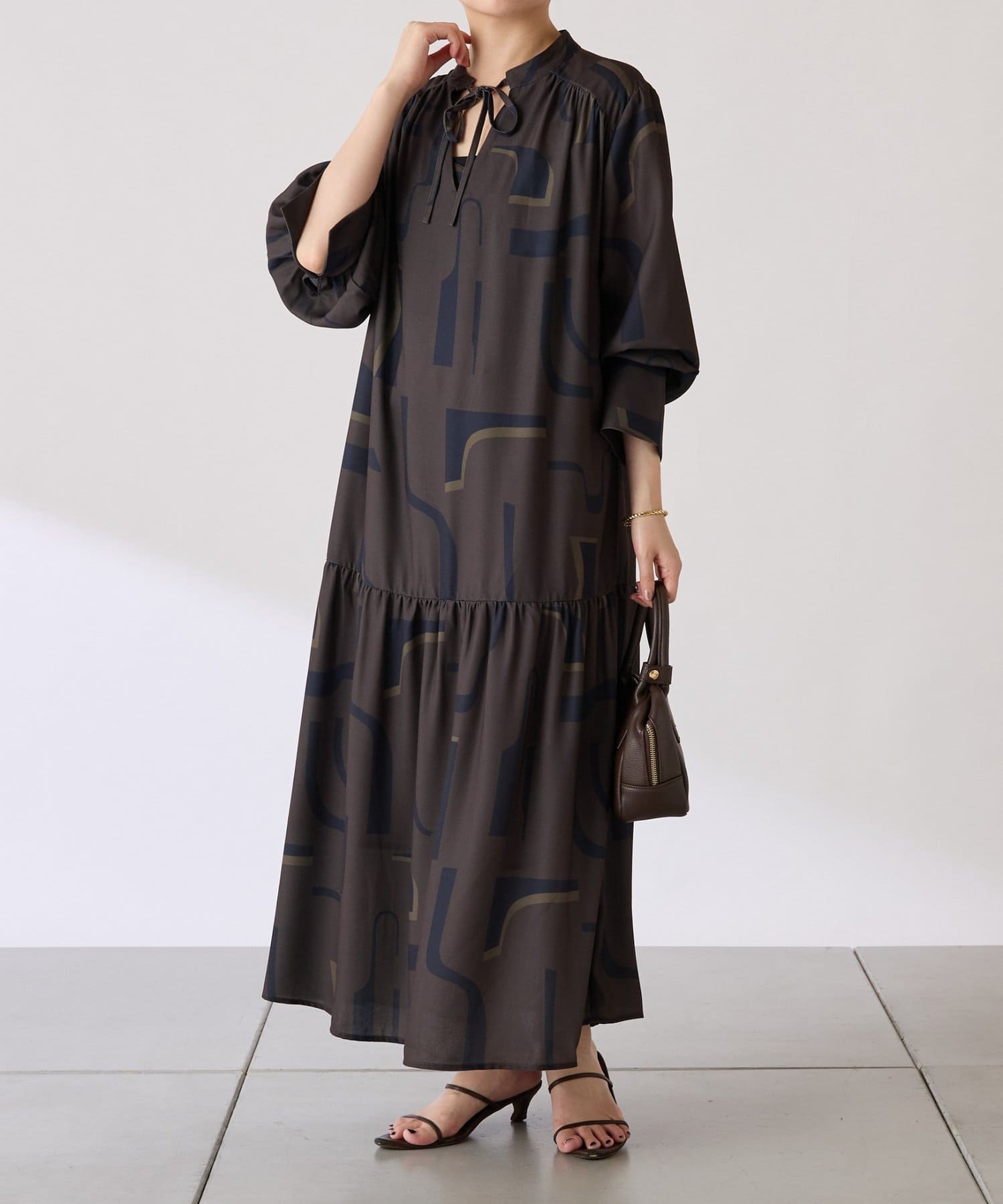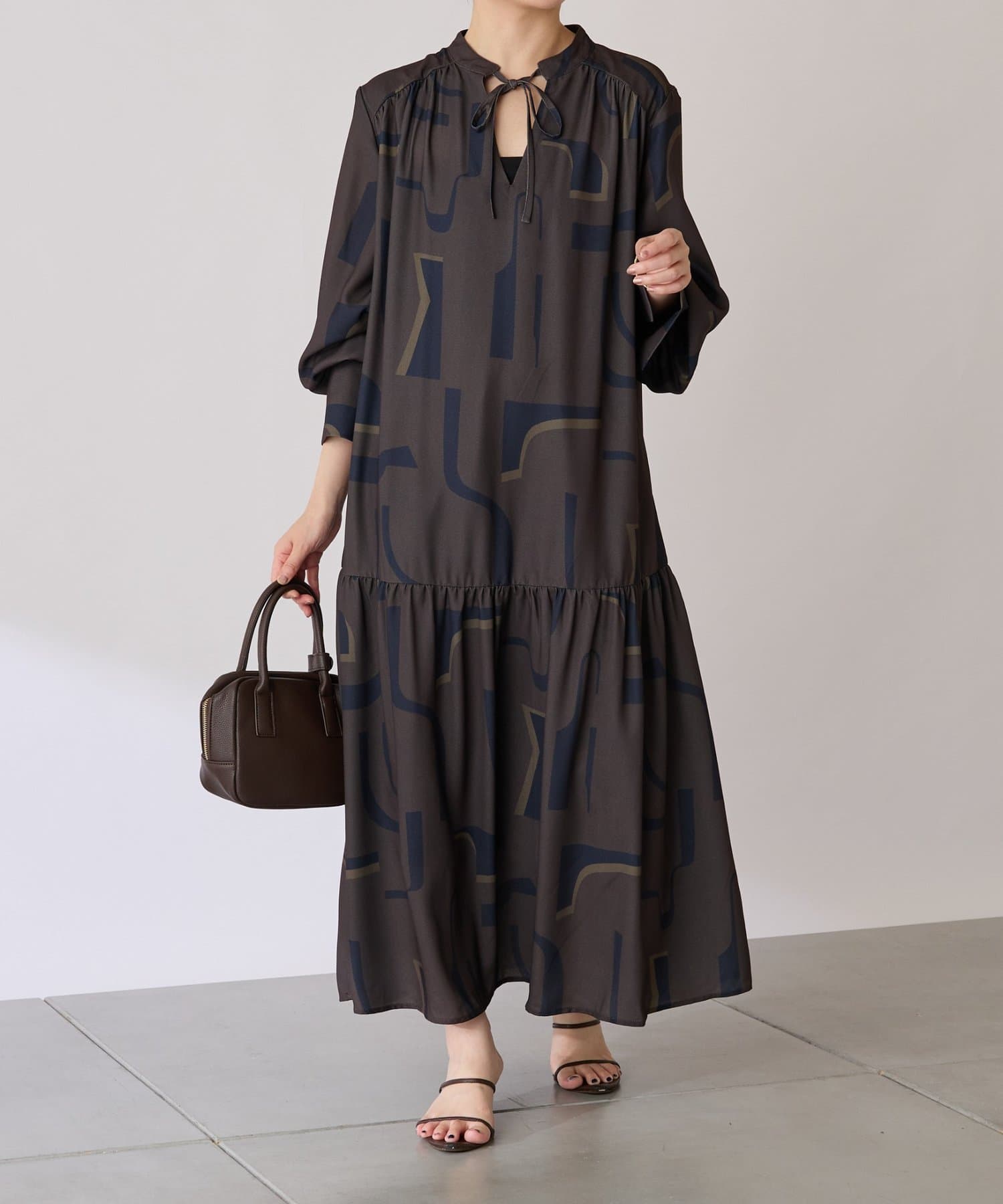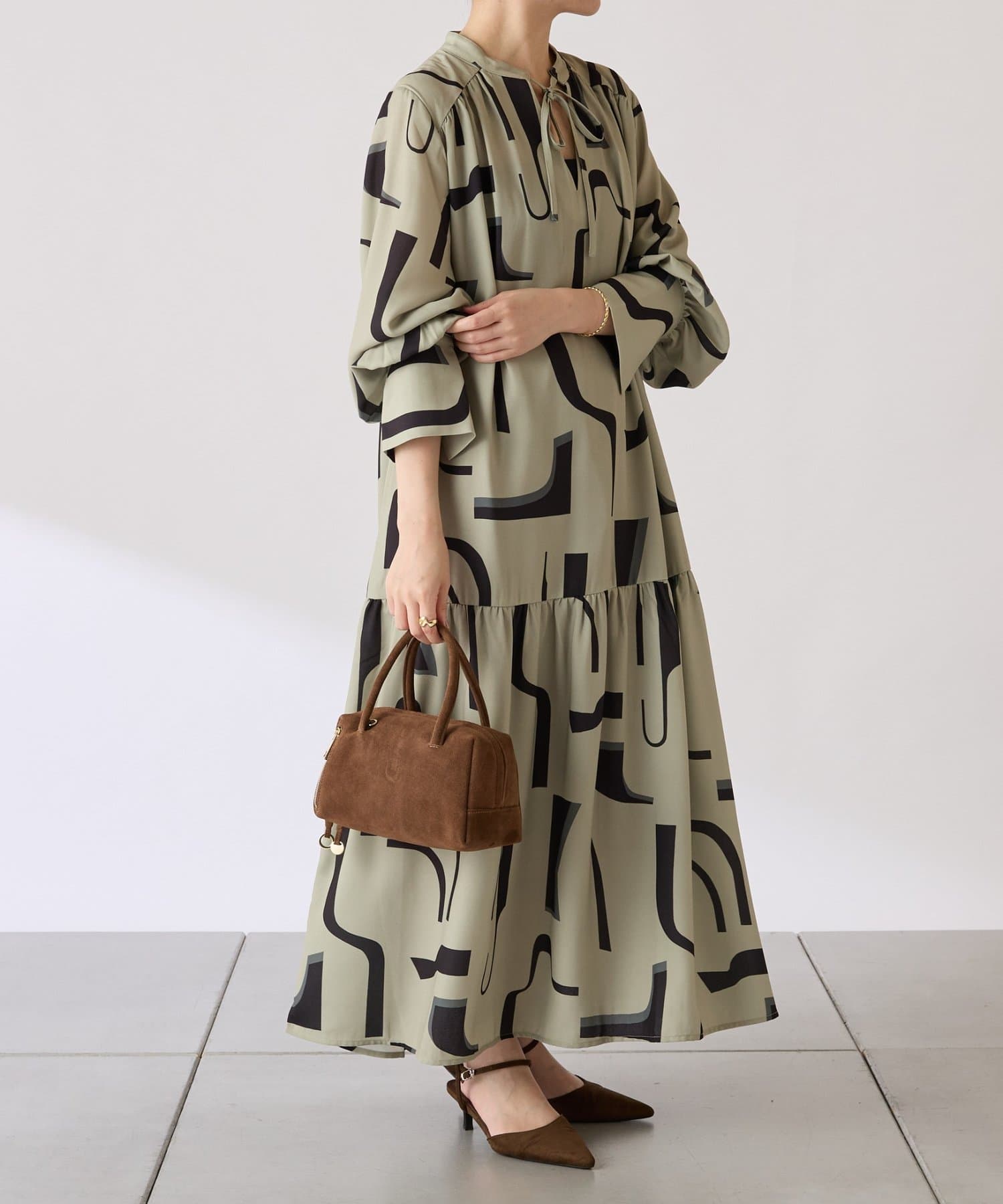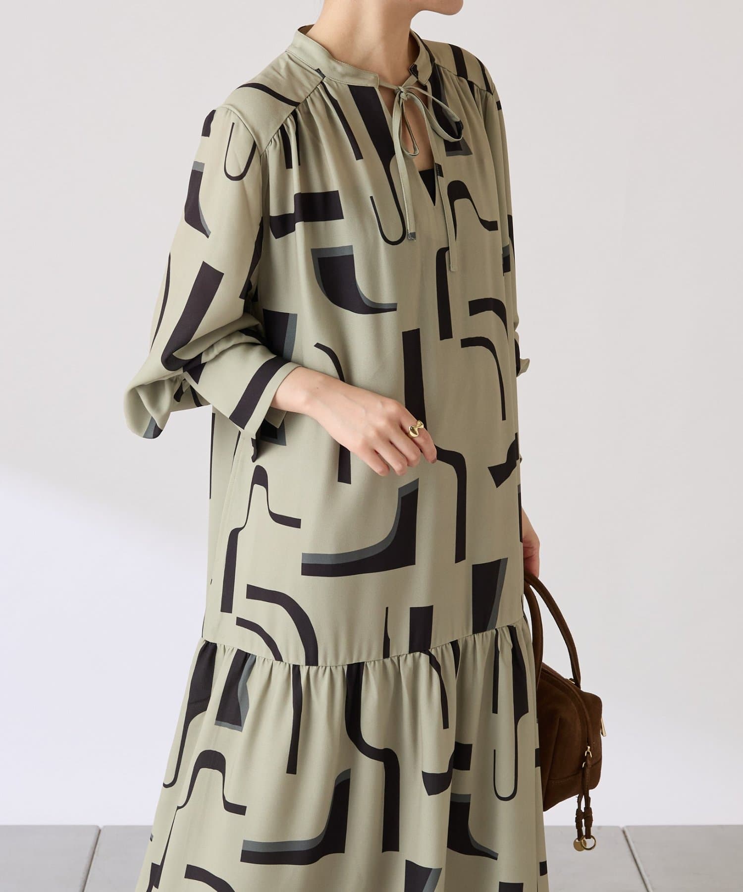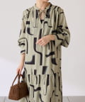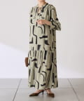 ・目を惹く幾何学柄がキャッチーなロング丈のワンピース。