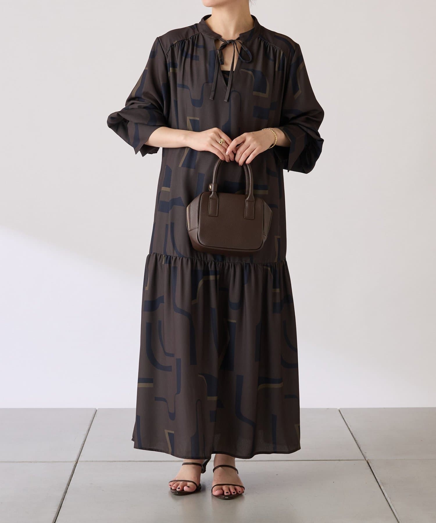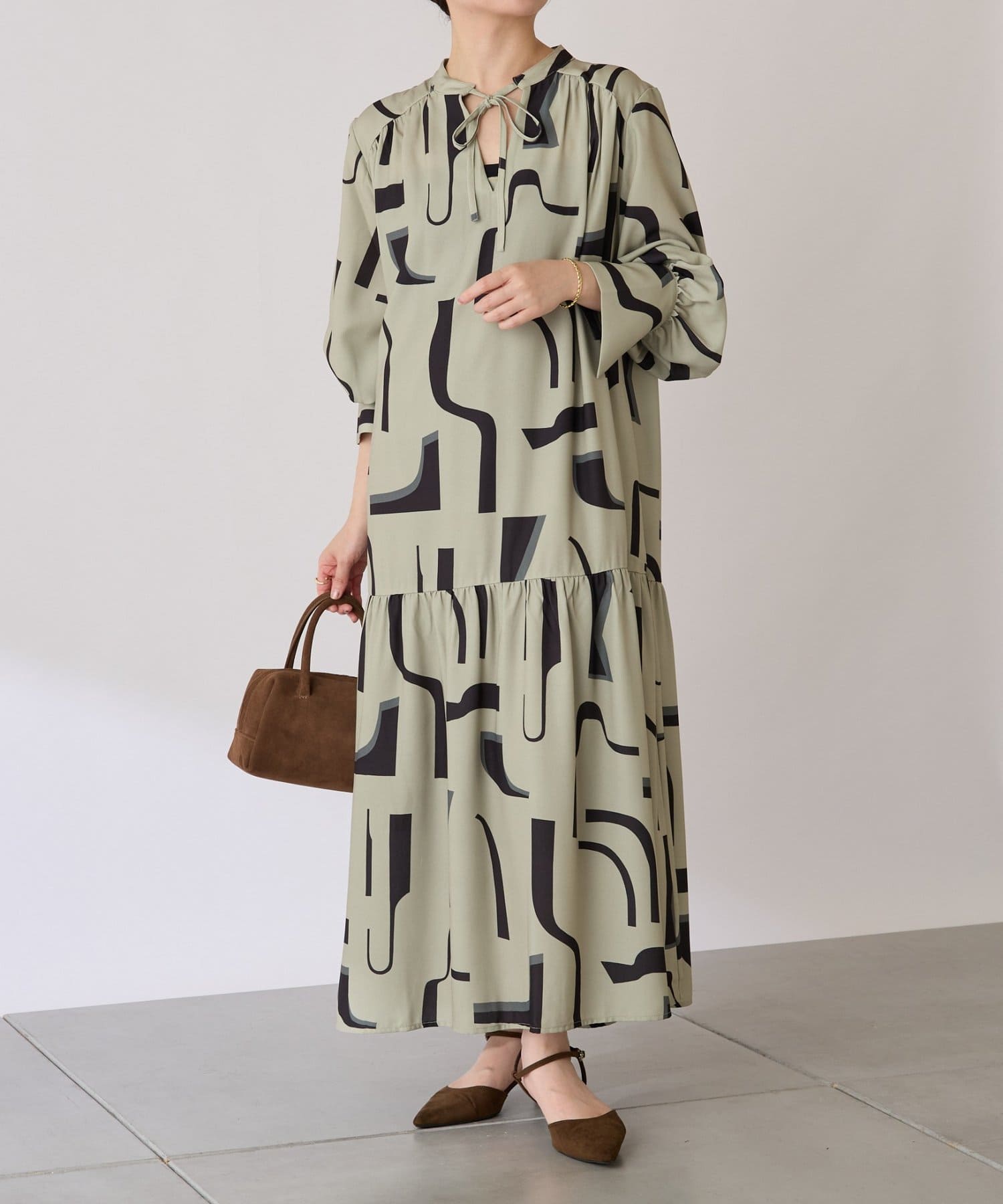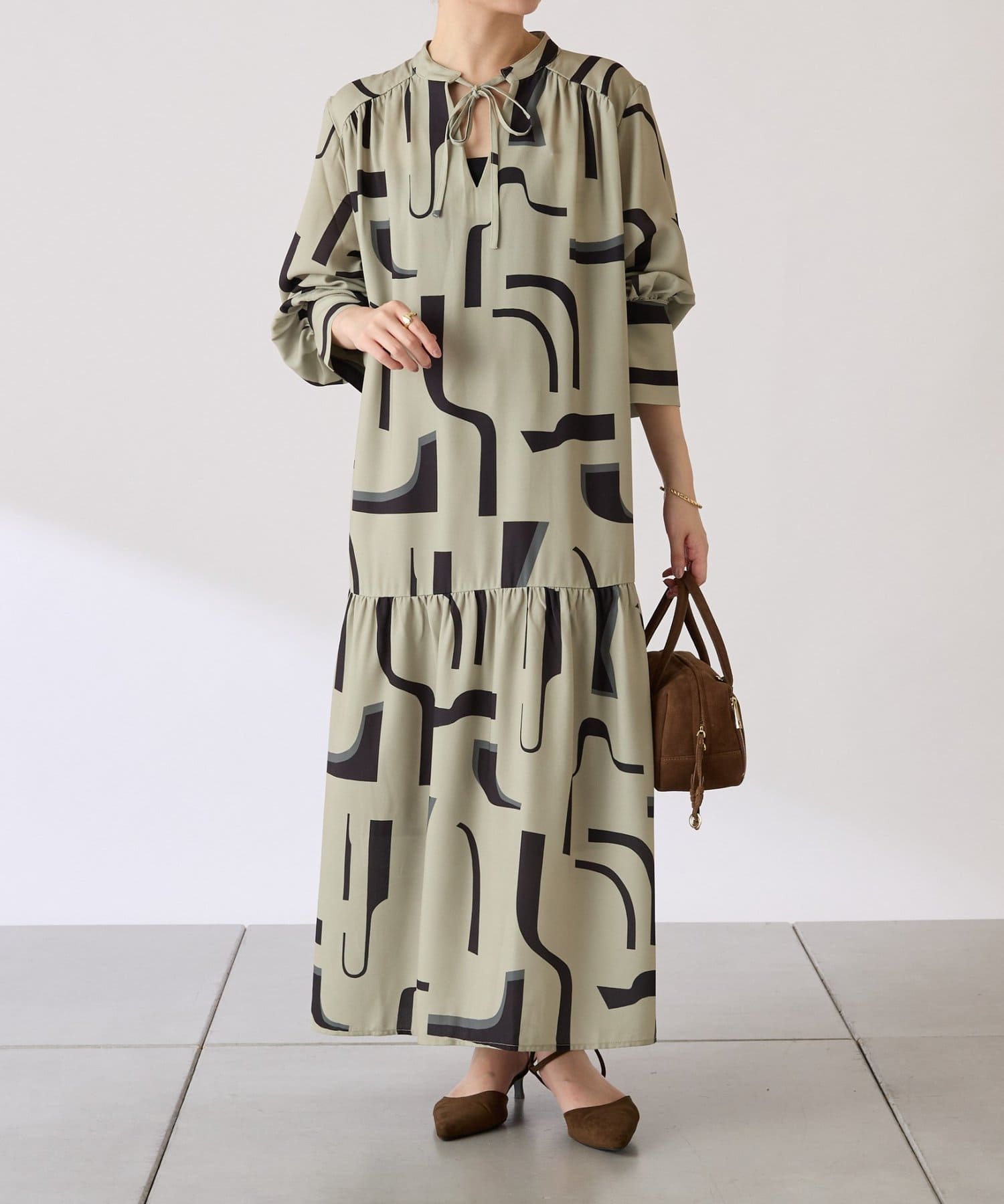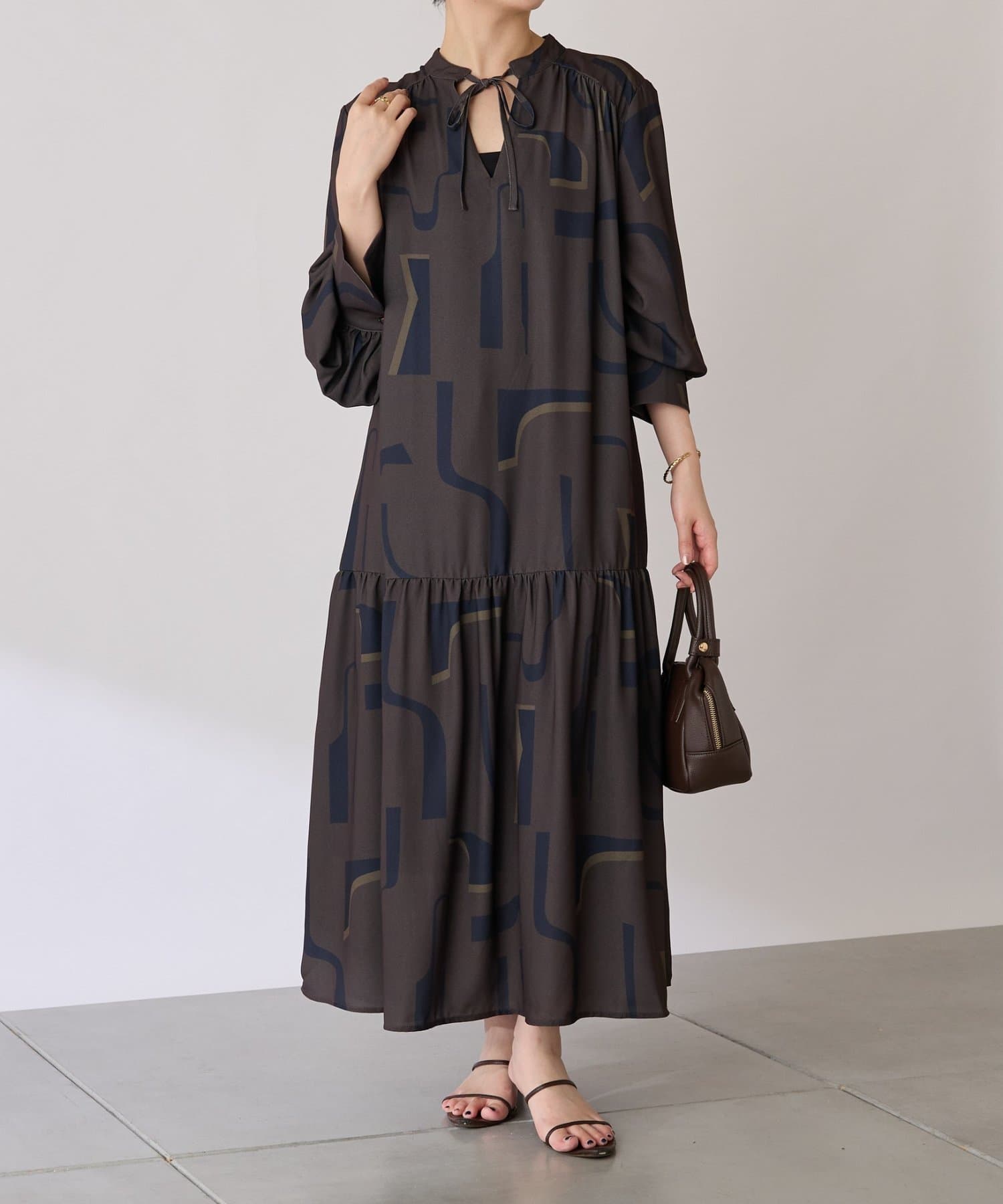 ・目を惹く幾何学柄がキャッチーなロング丈のワンピース。