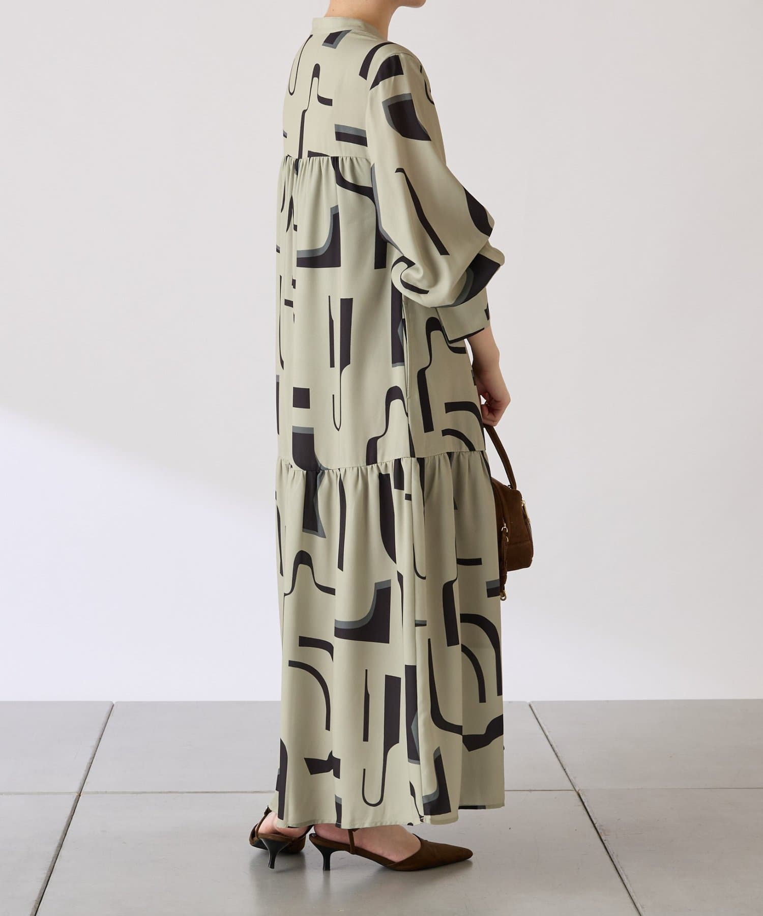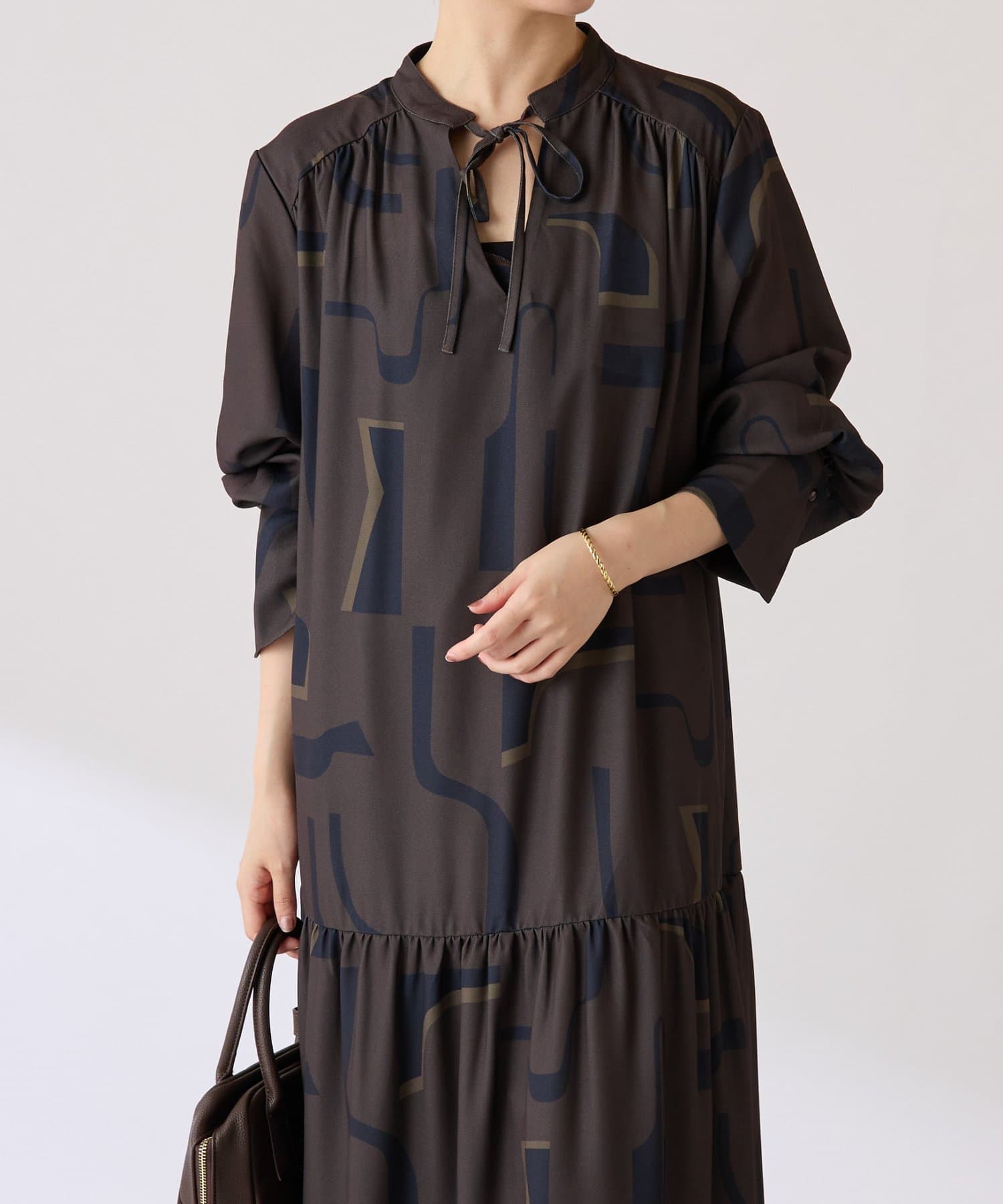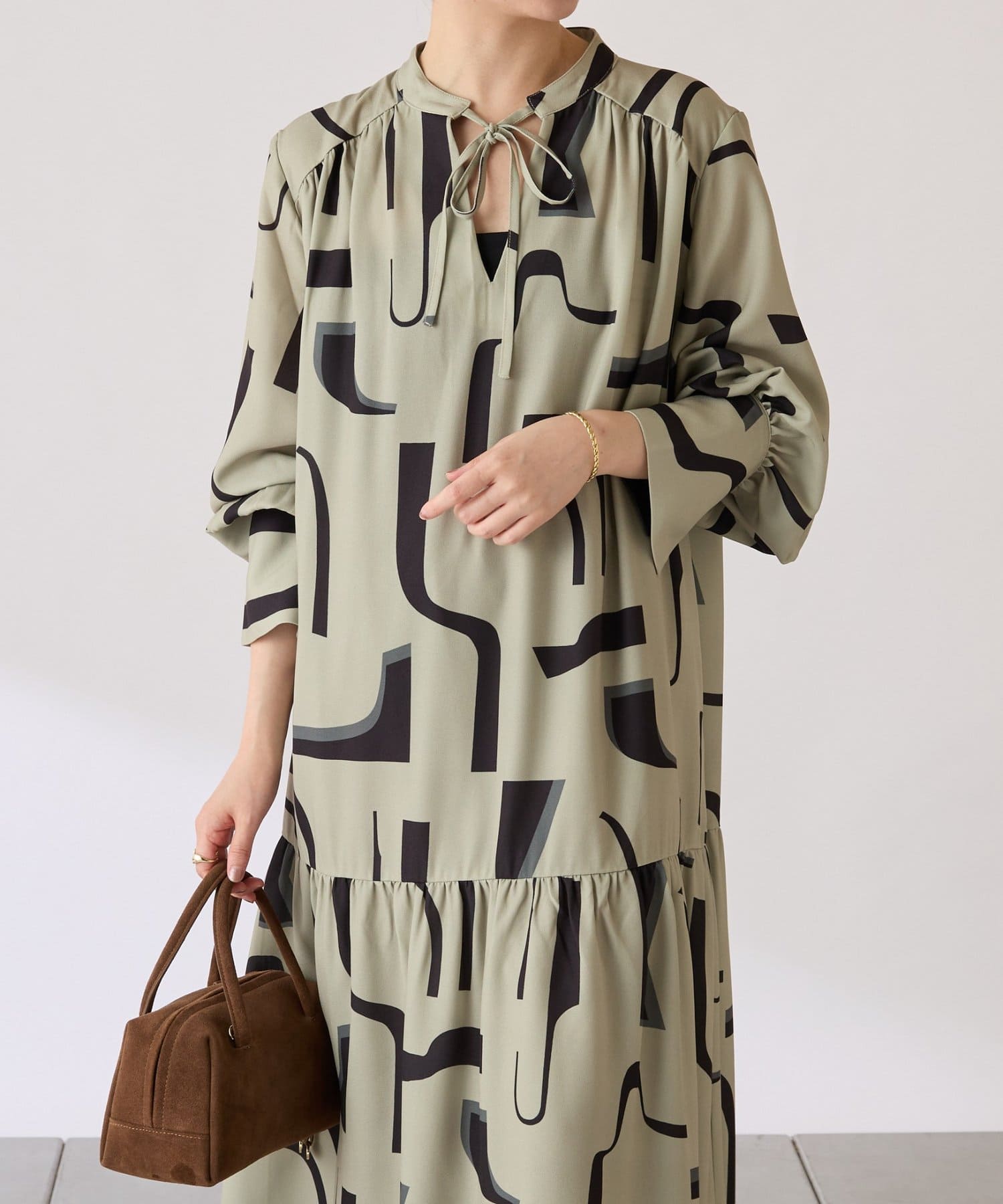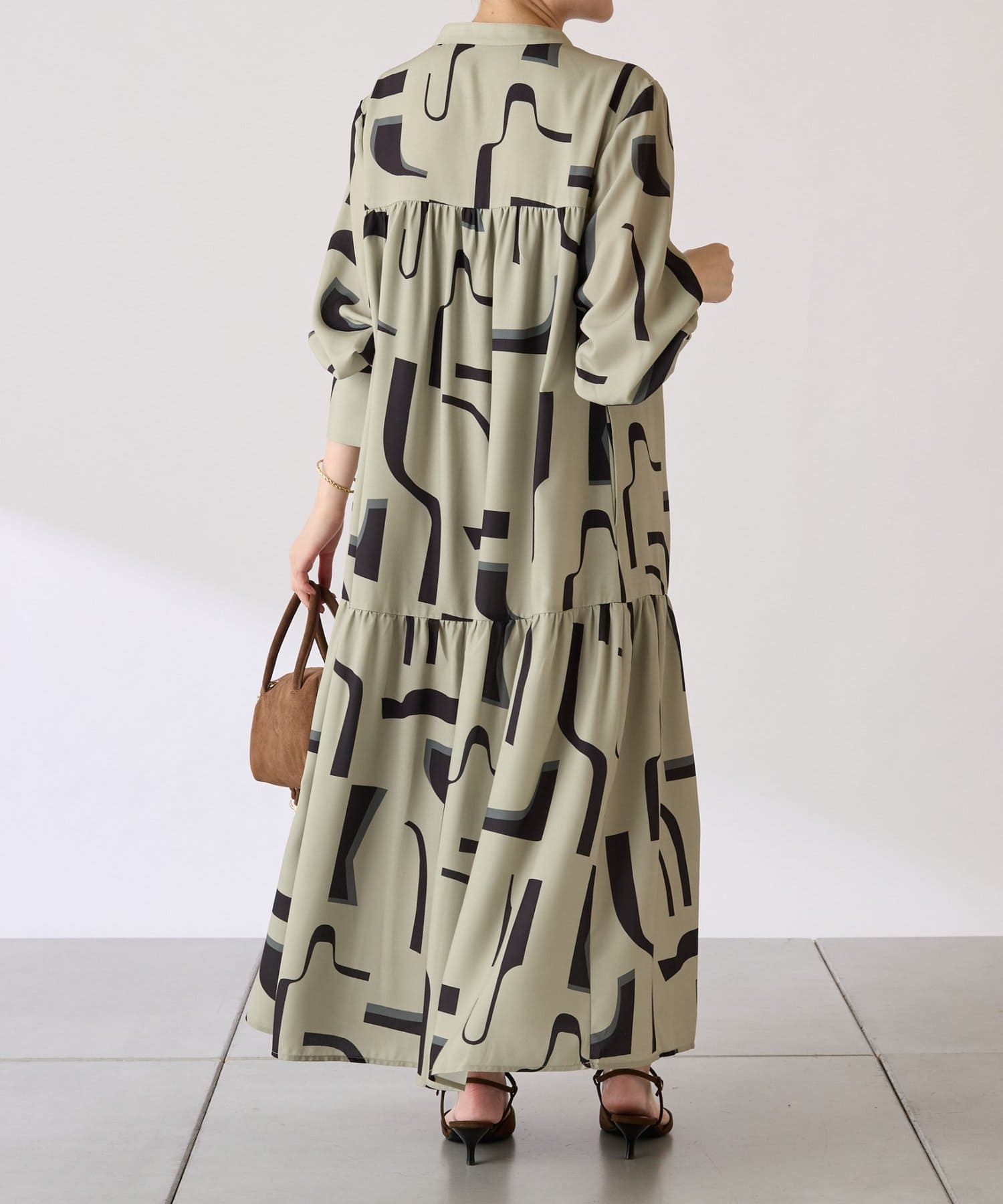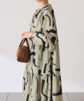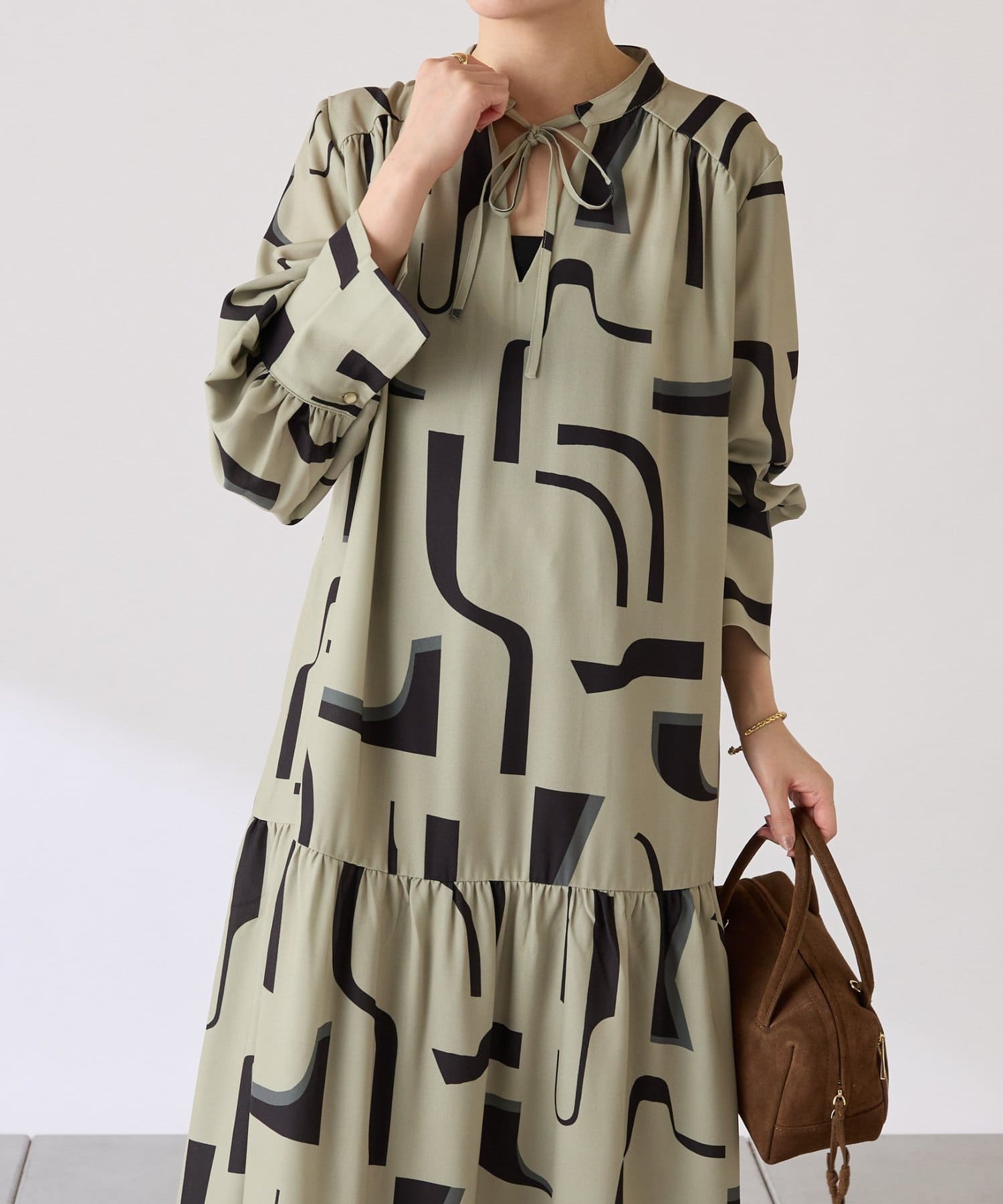 ・目を惹く幾何学柄がキャッチーなロング丈のワンピース。