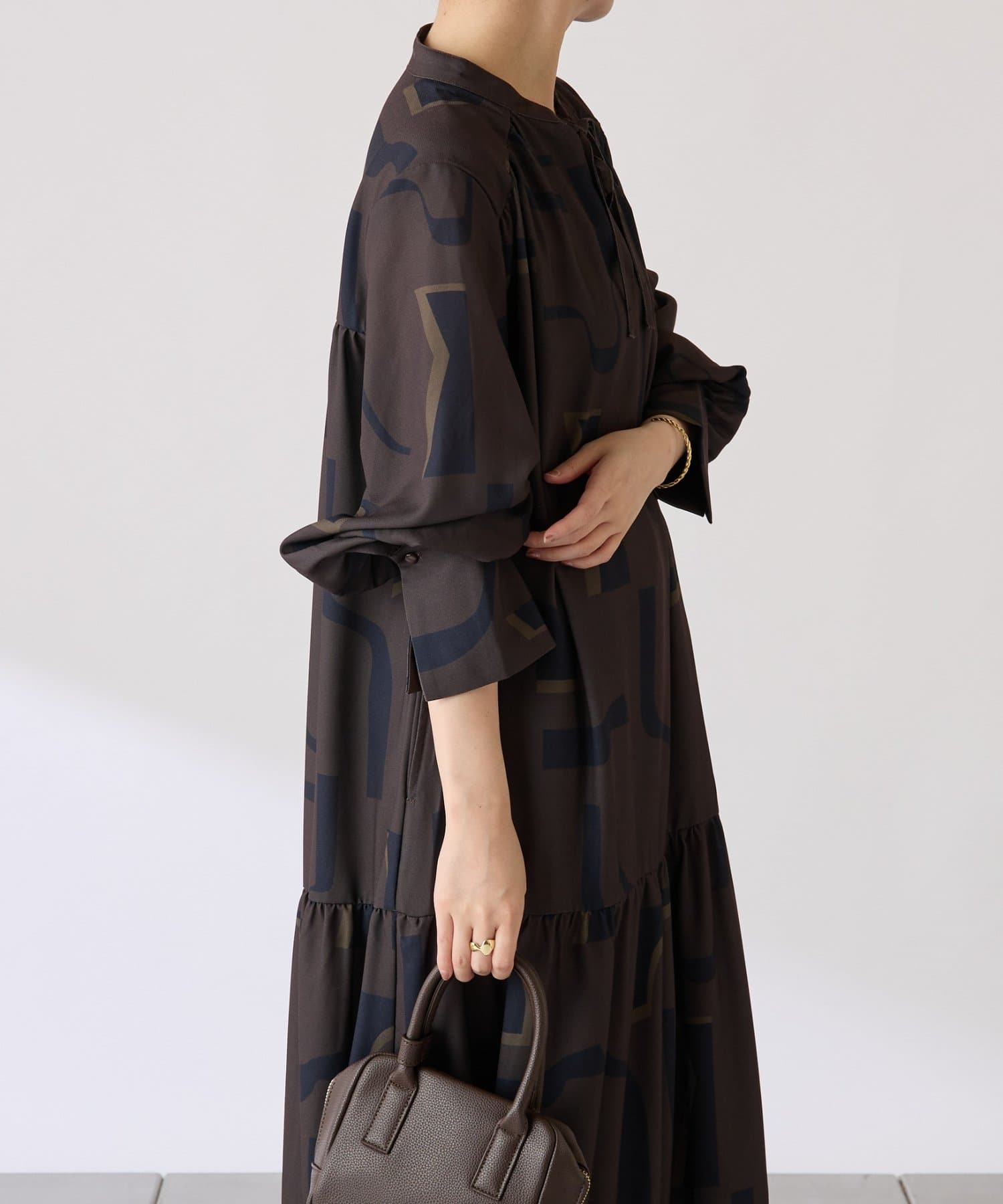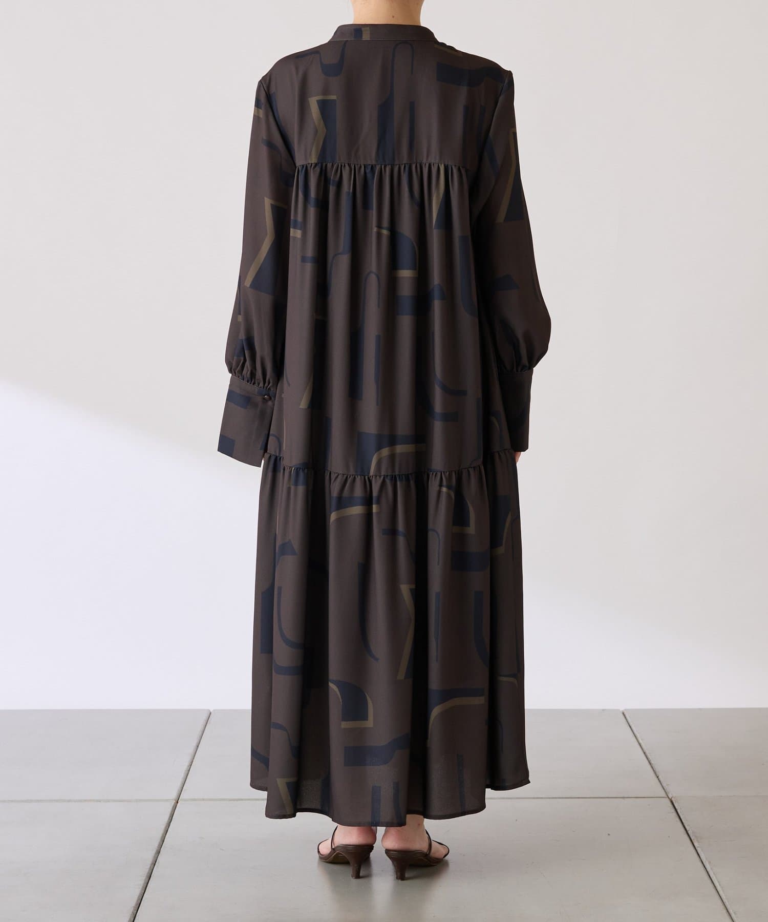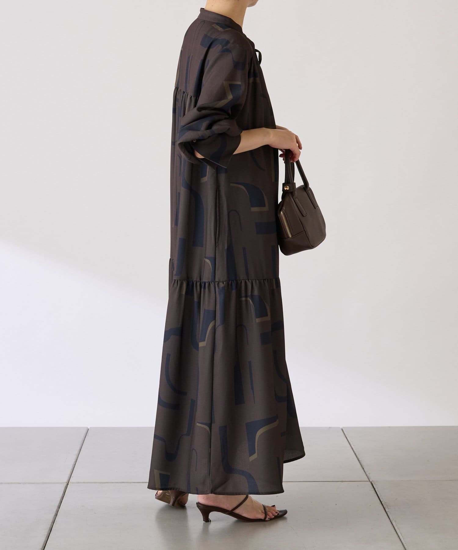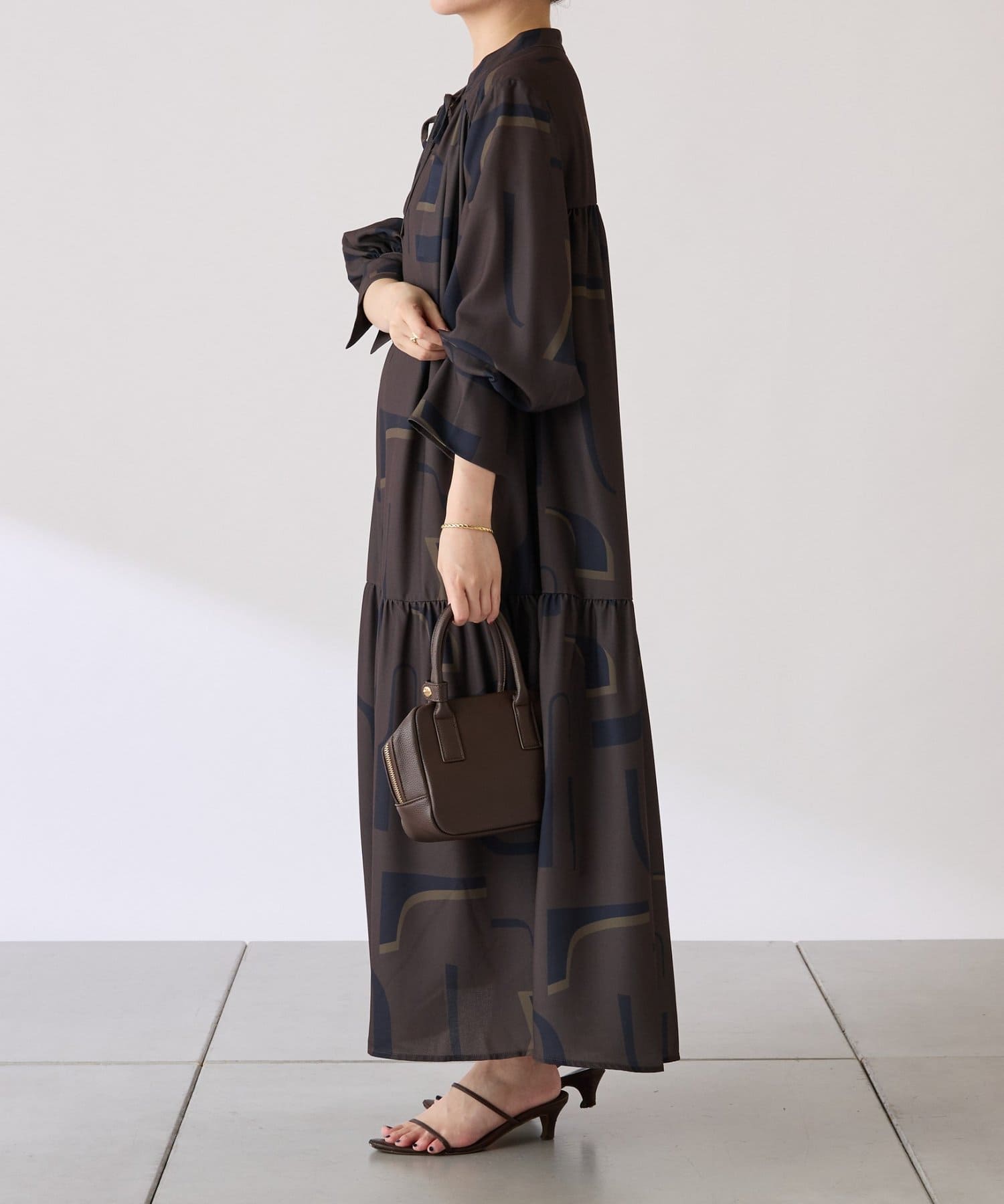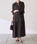 ・目を惹く幾何学柄がキャッチーなロング丈のワンピース。