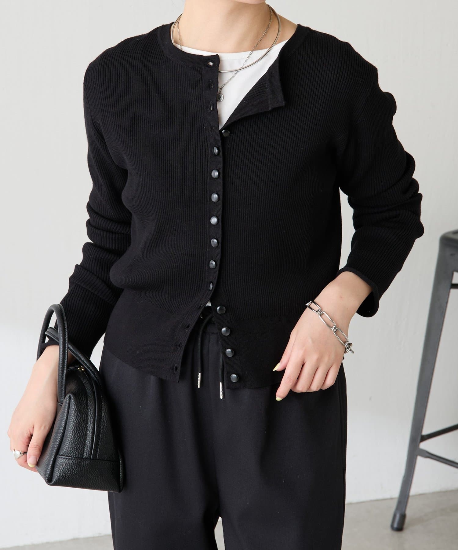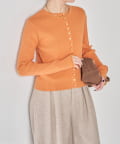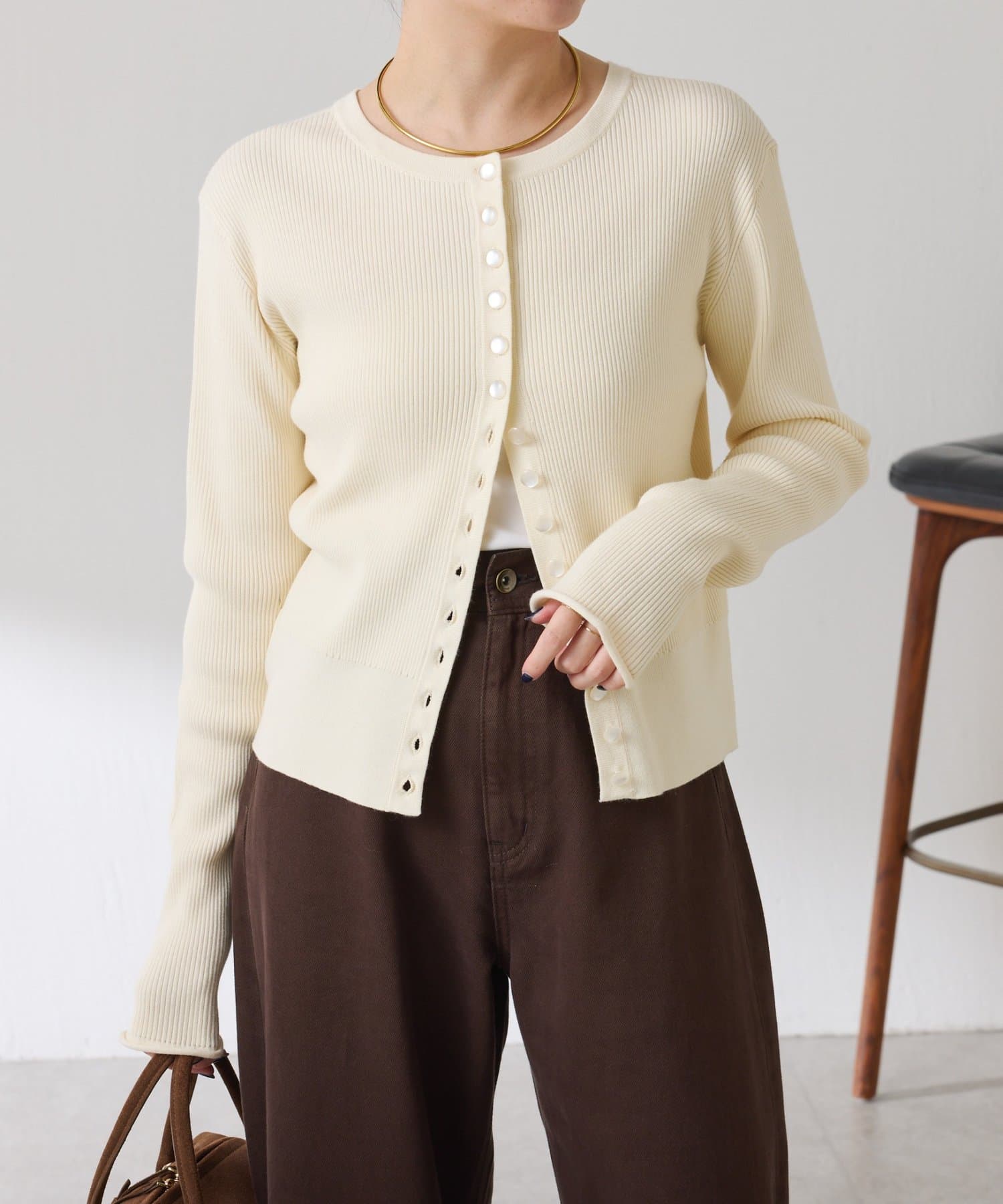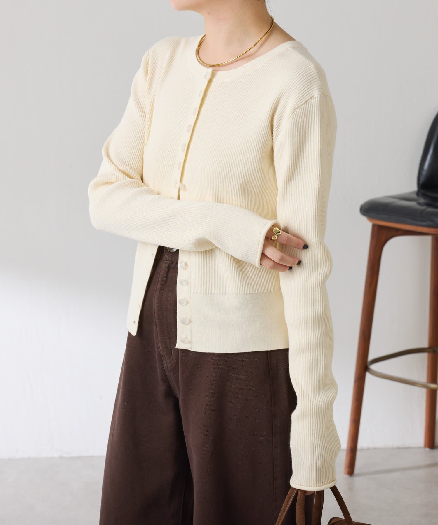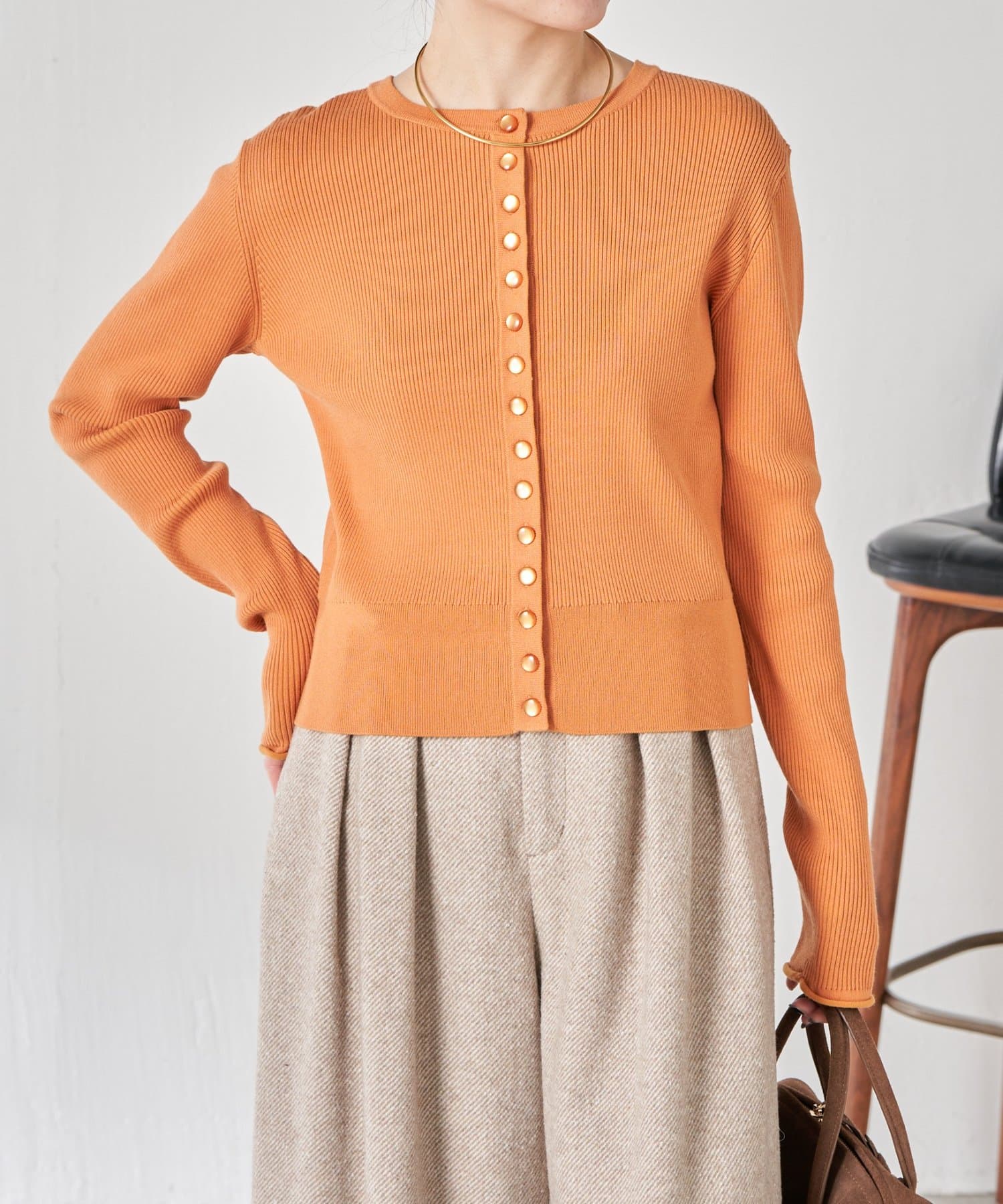 ・上品な光沢のボタンがポイントのカーディガン。