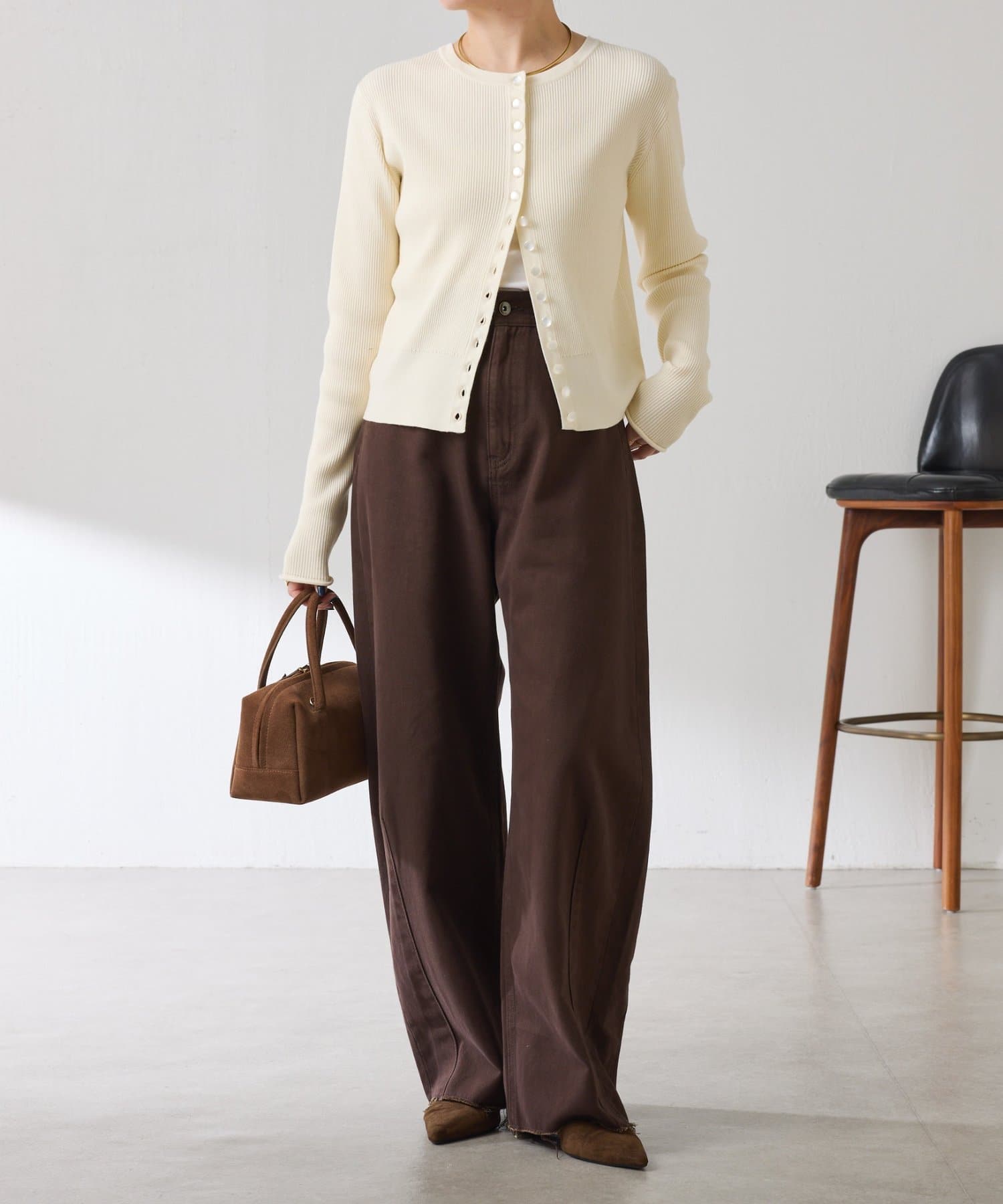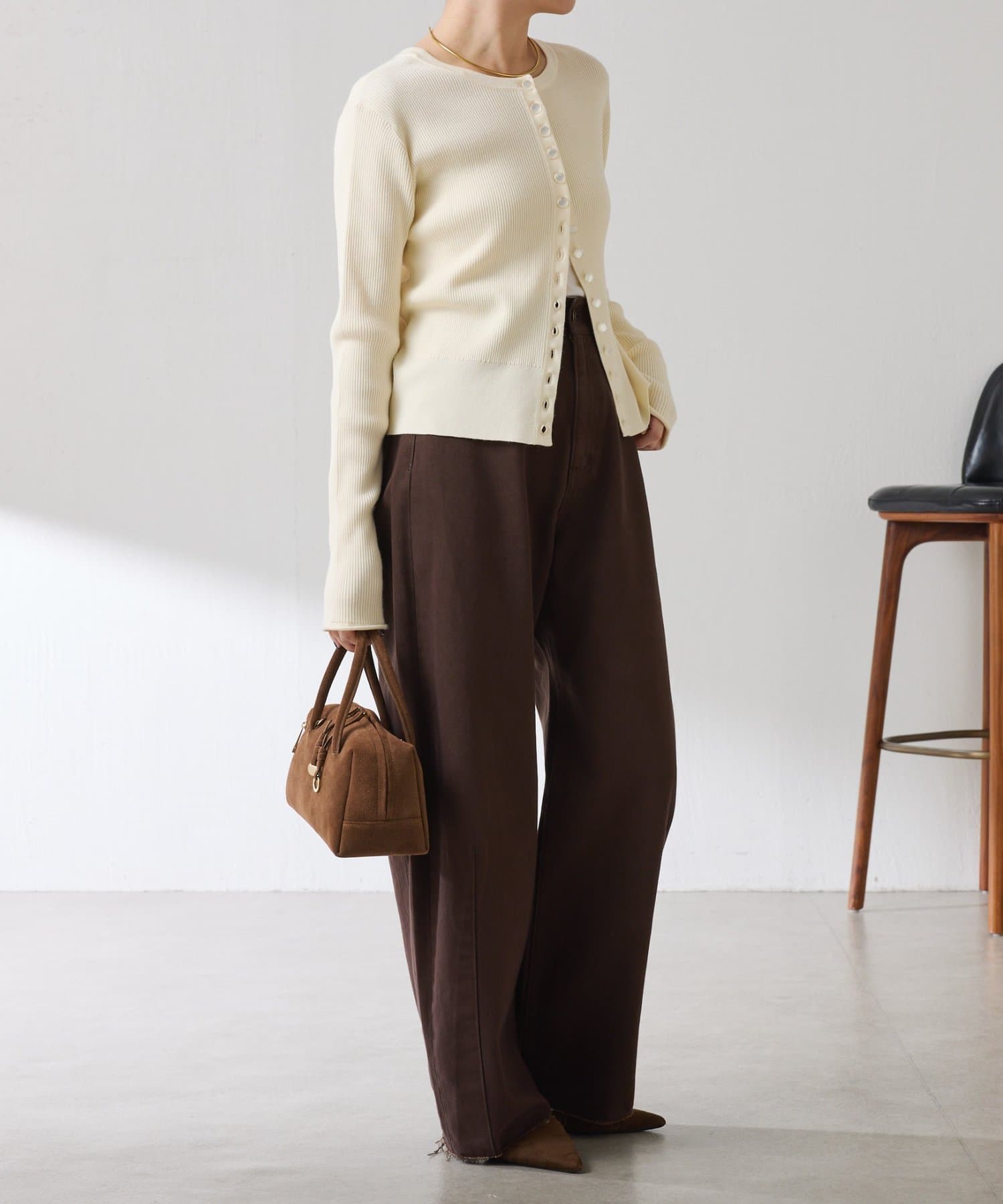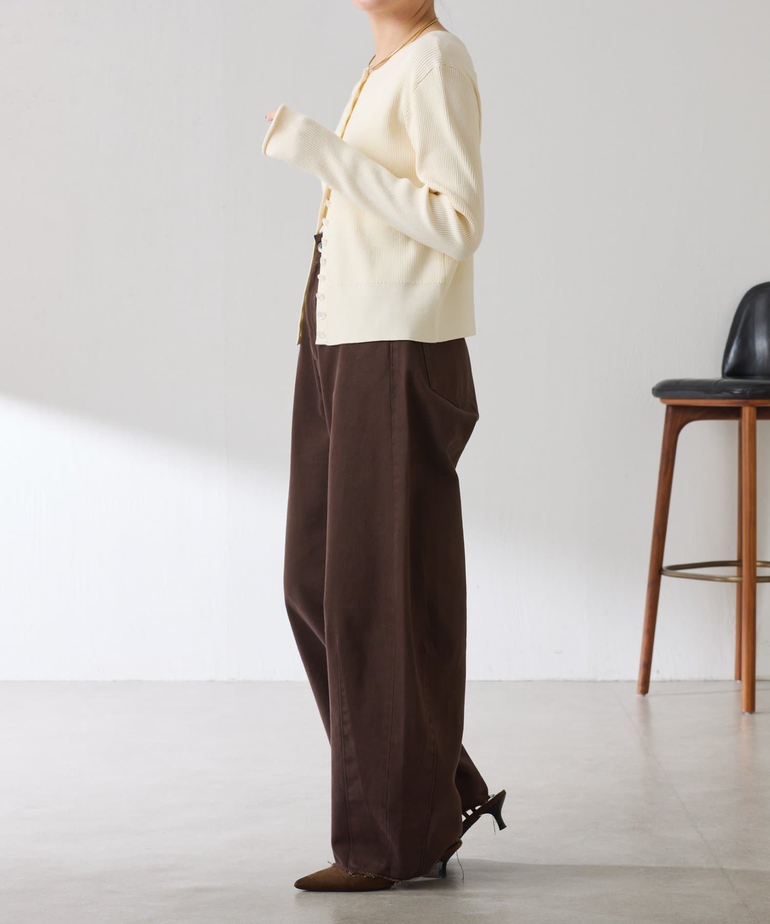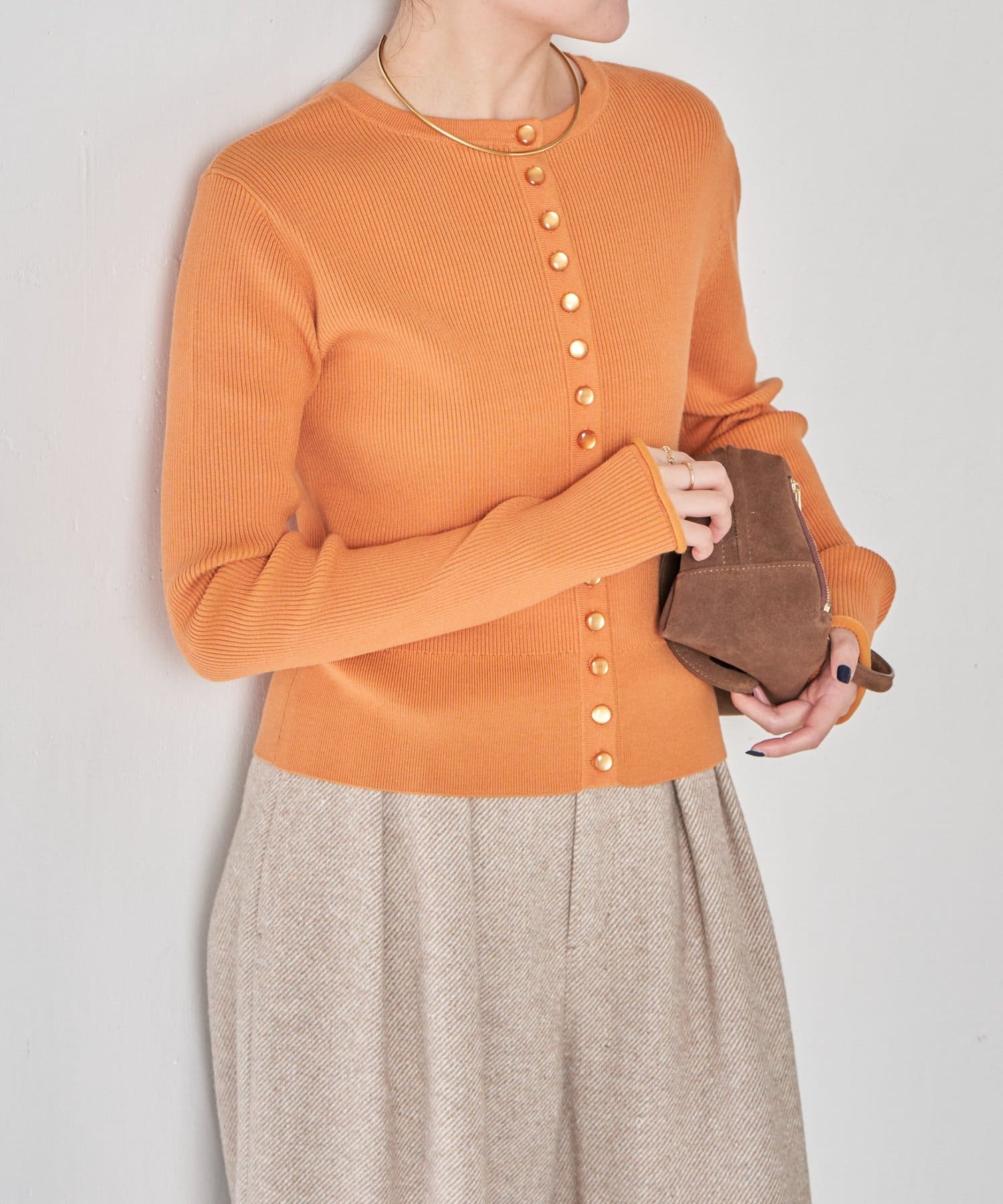 ・上品な光沢のボタンがポイントのカーディガン。