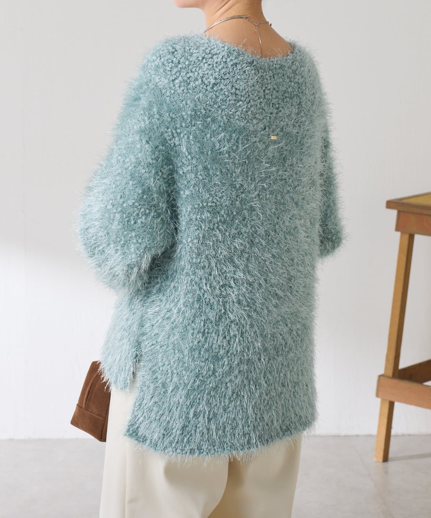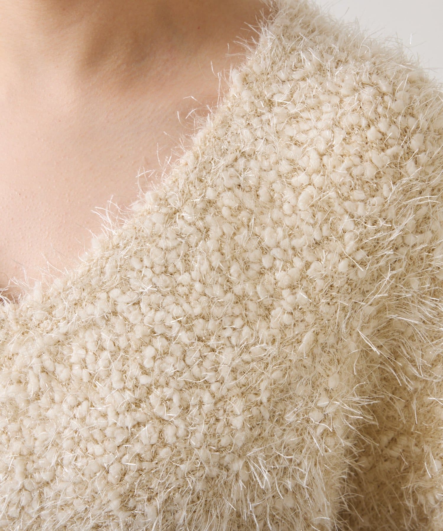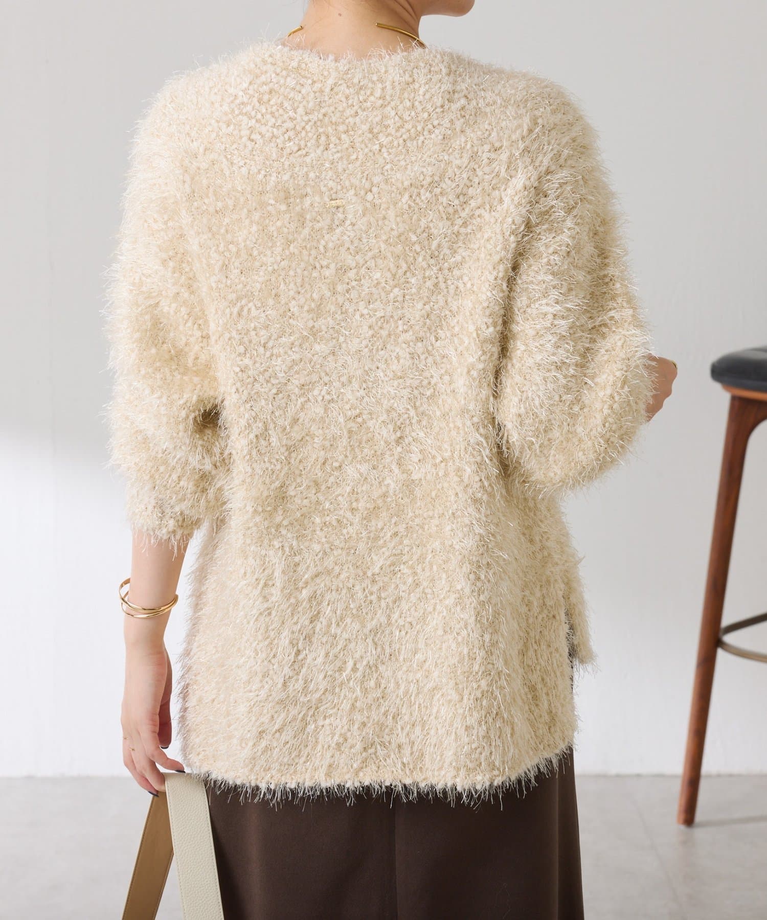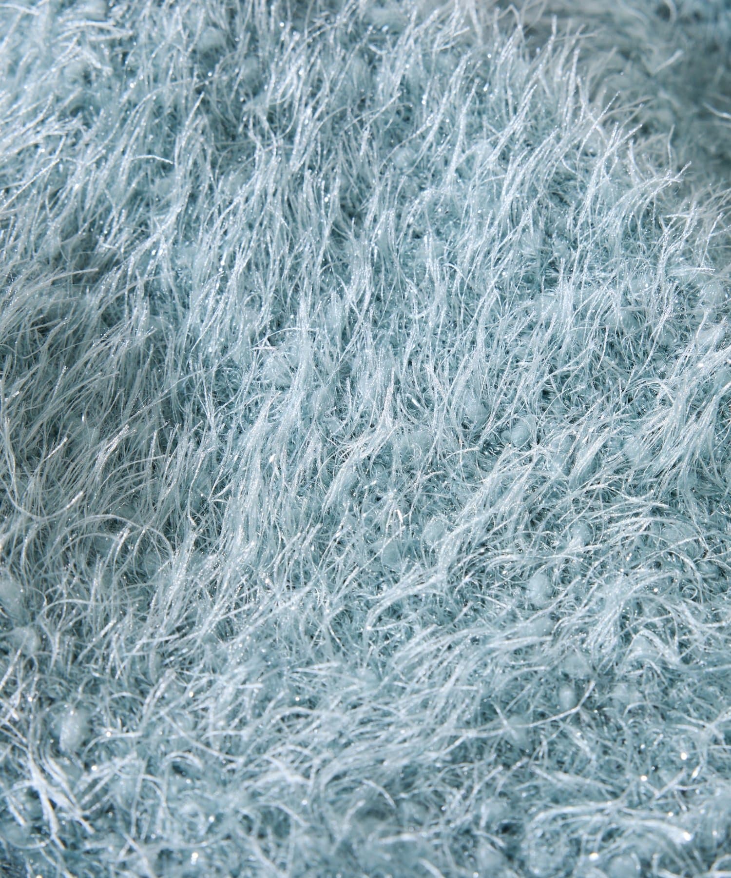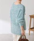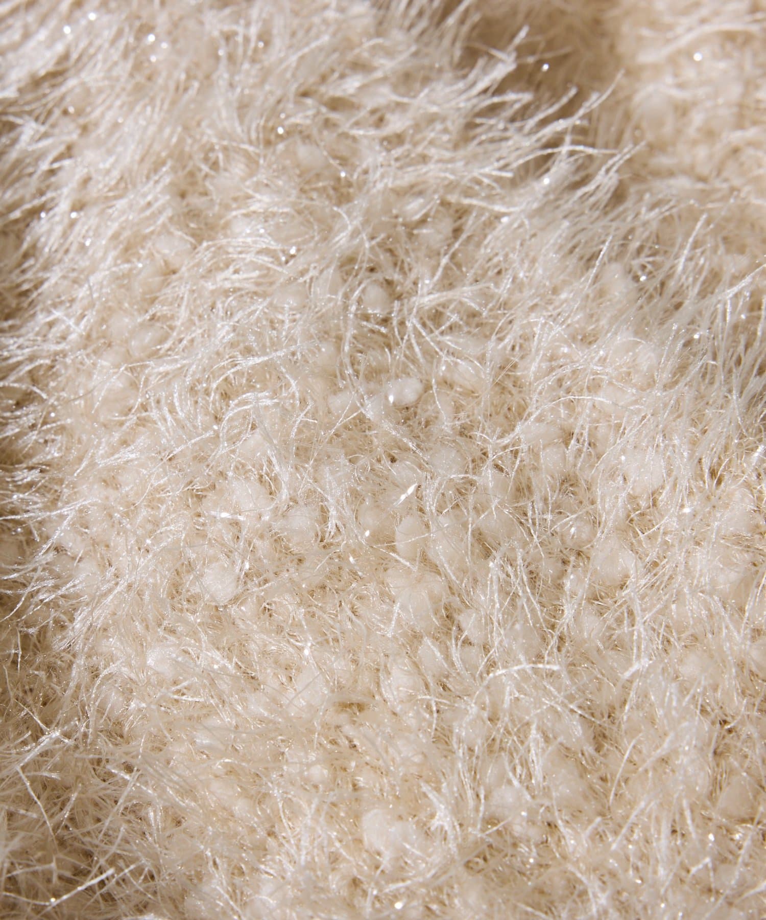 ・煌めきとふわふわ素材が華やかなニット。襟周りはポコポコした提灯モールで引き締めました。
