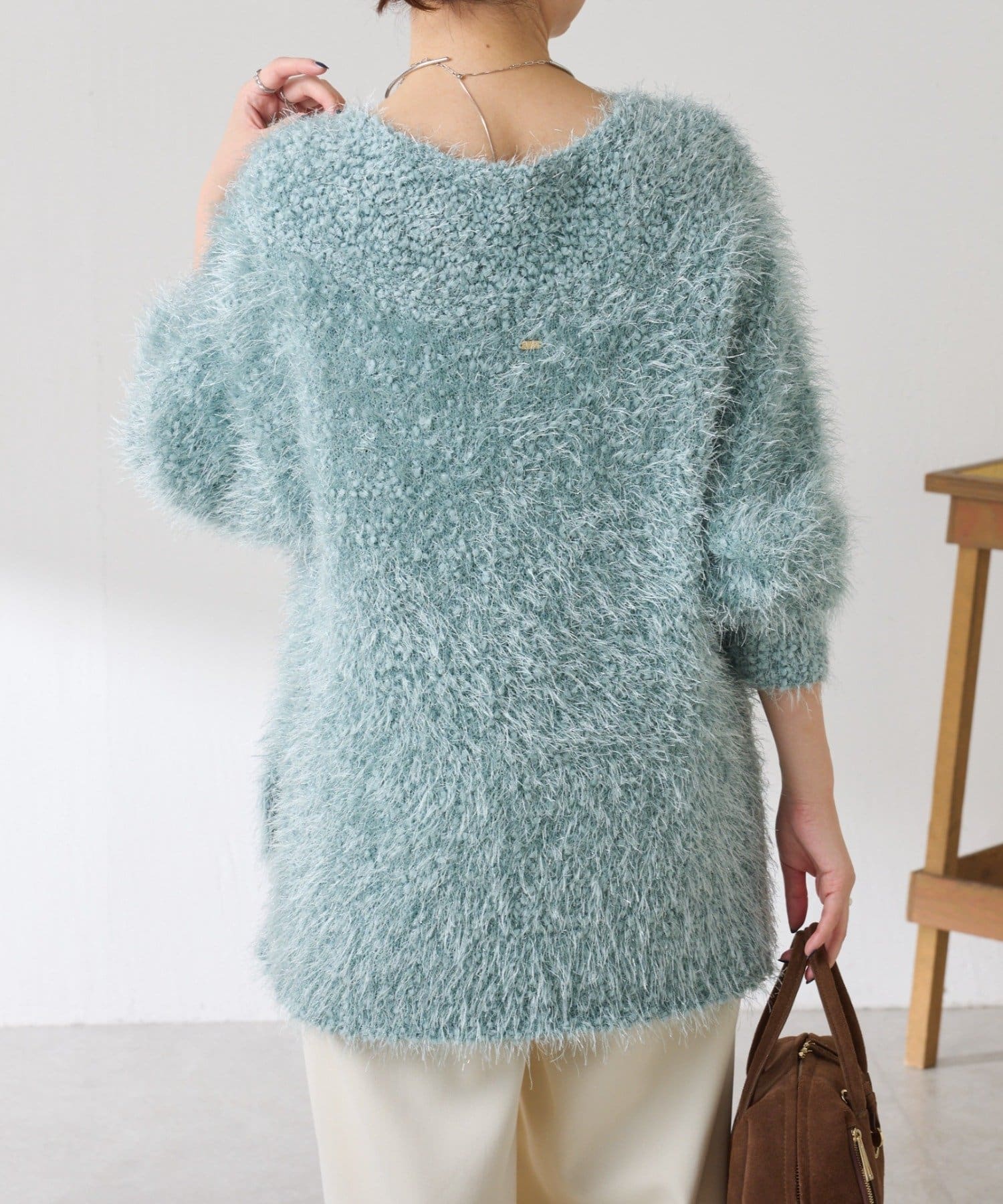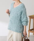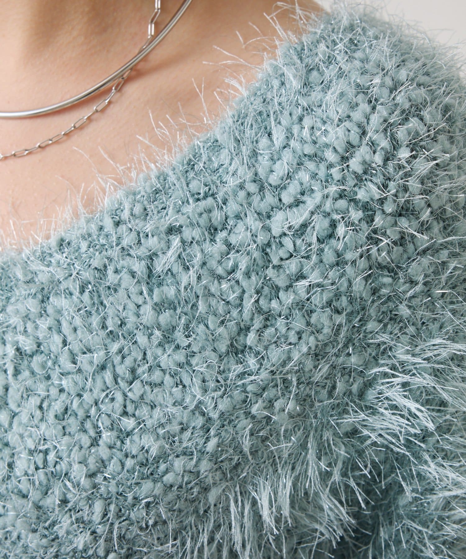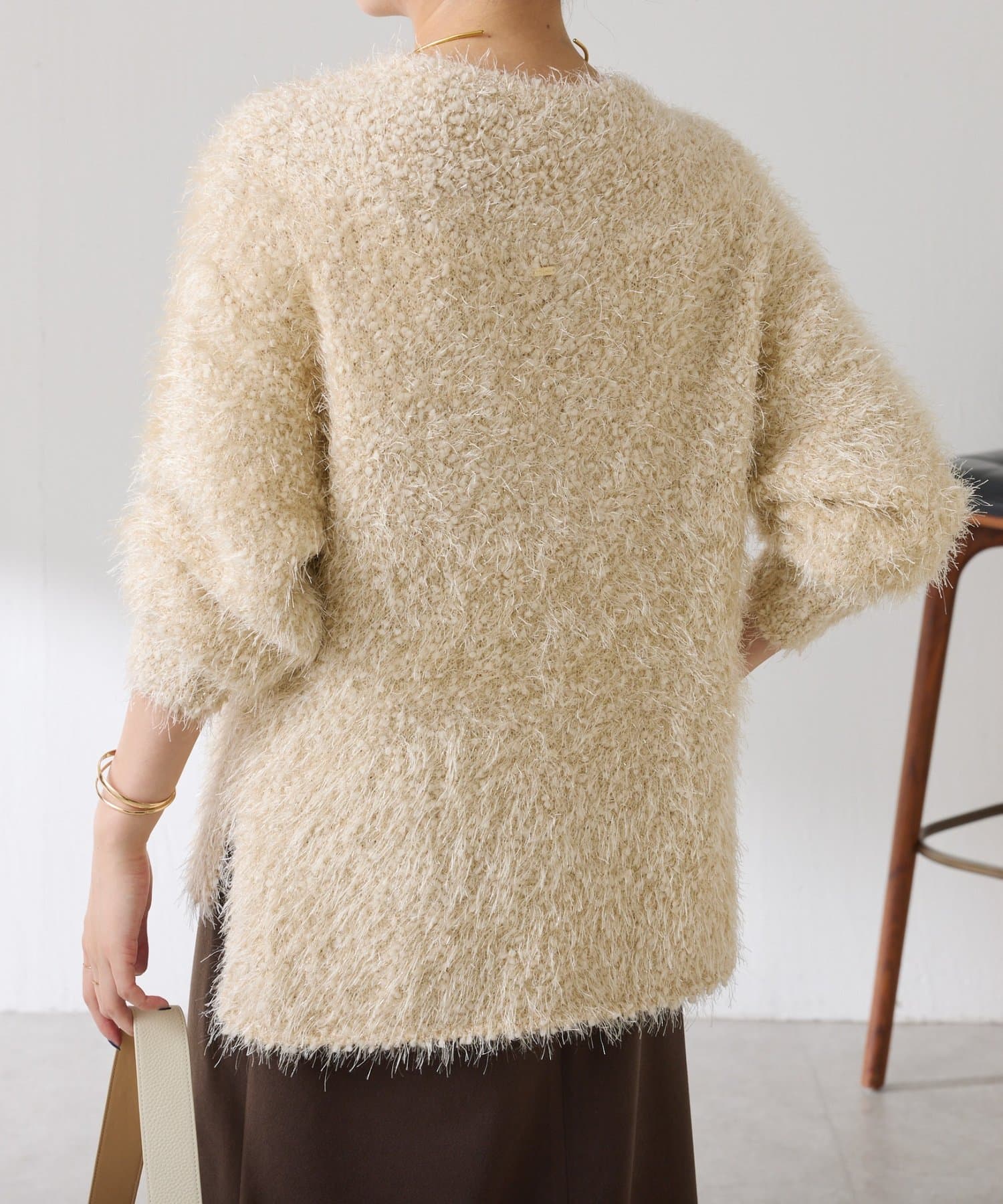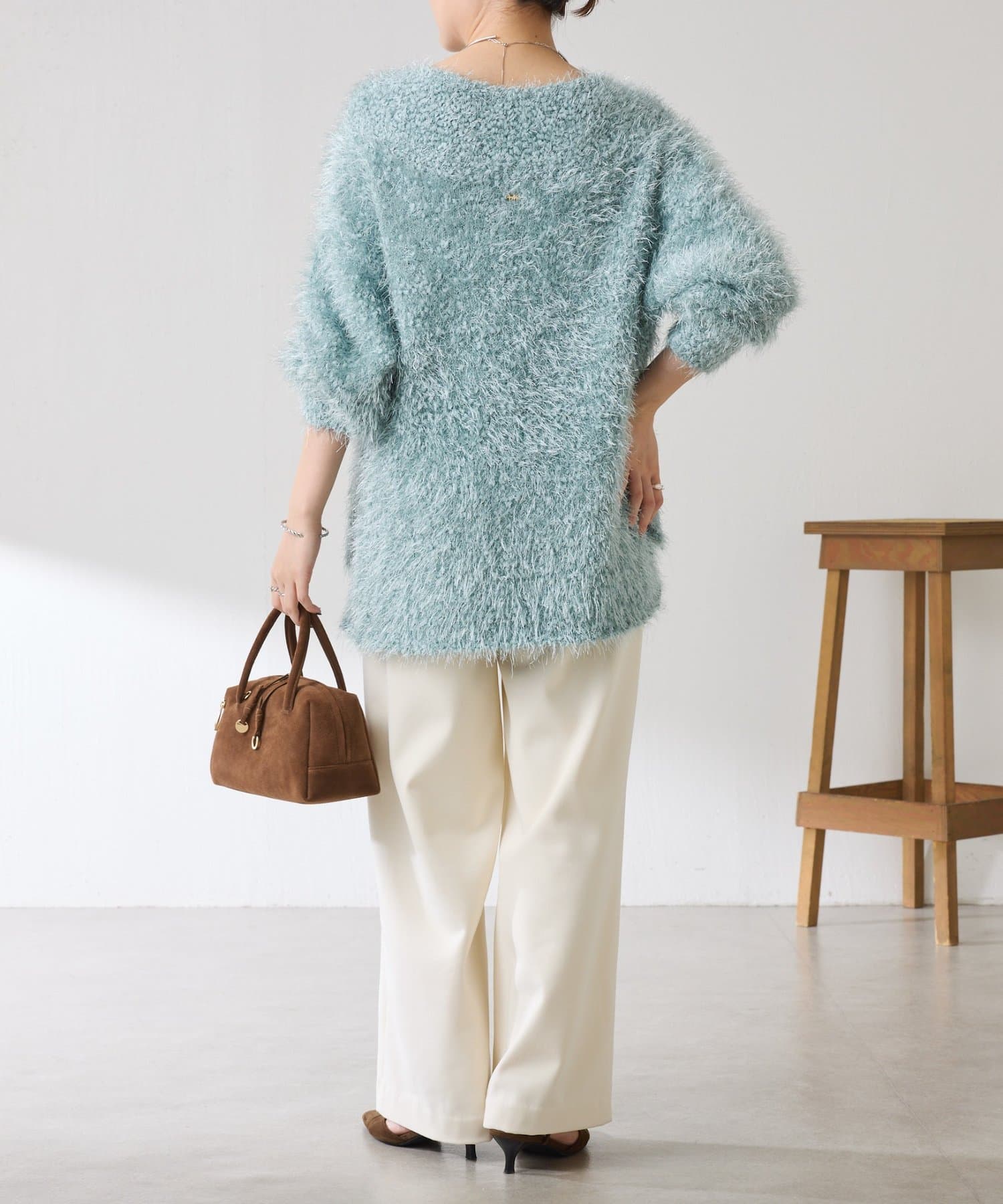 ・煌めきとふわふわ素材が華やかなニット。襟周りはポコポコした提灯モールで引き締めました。