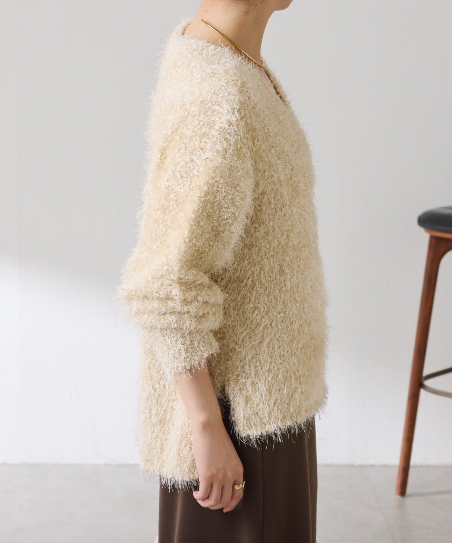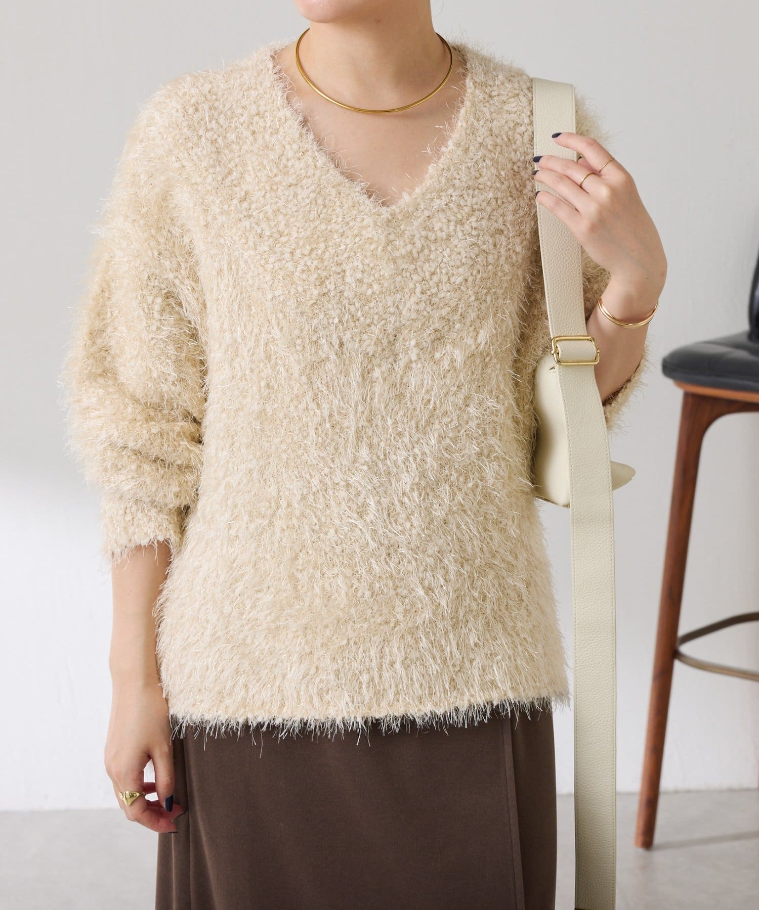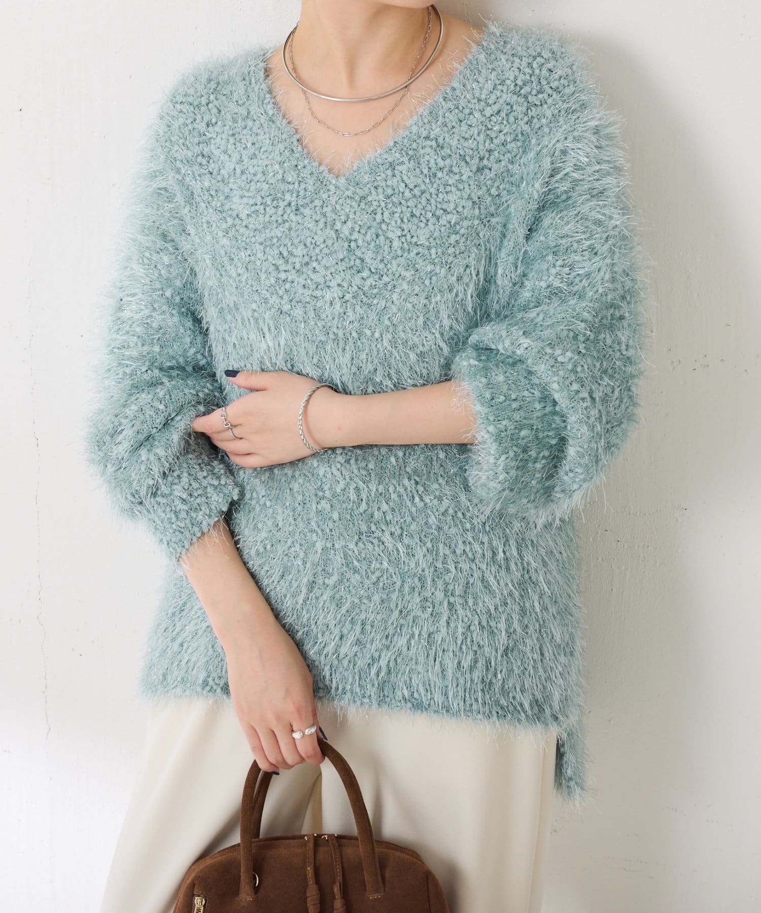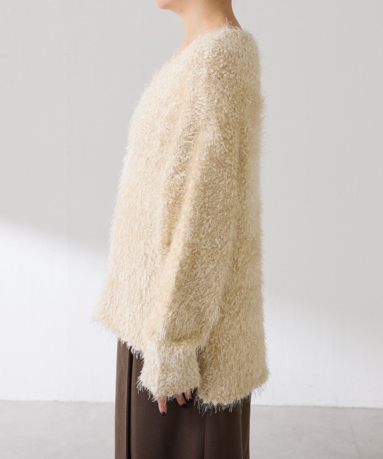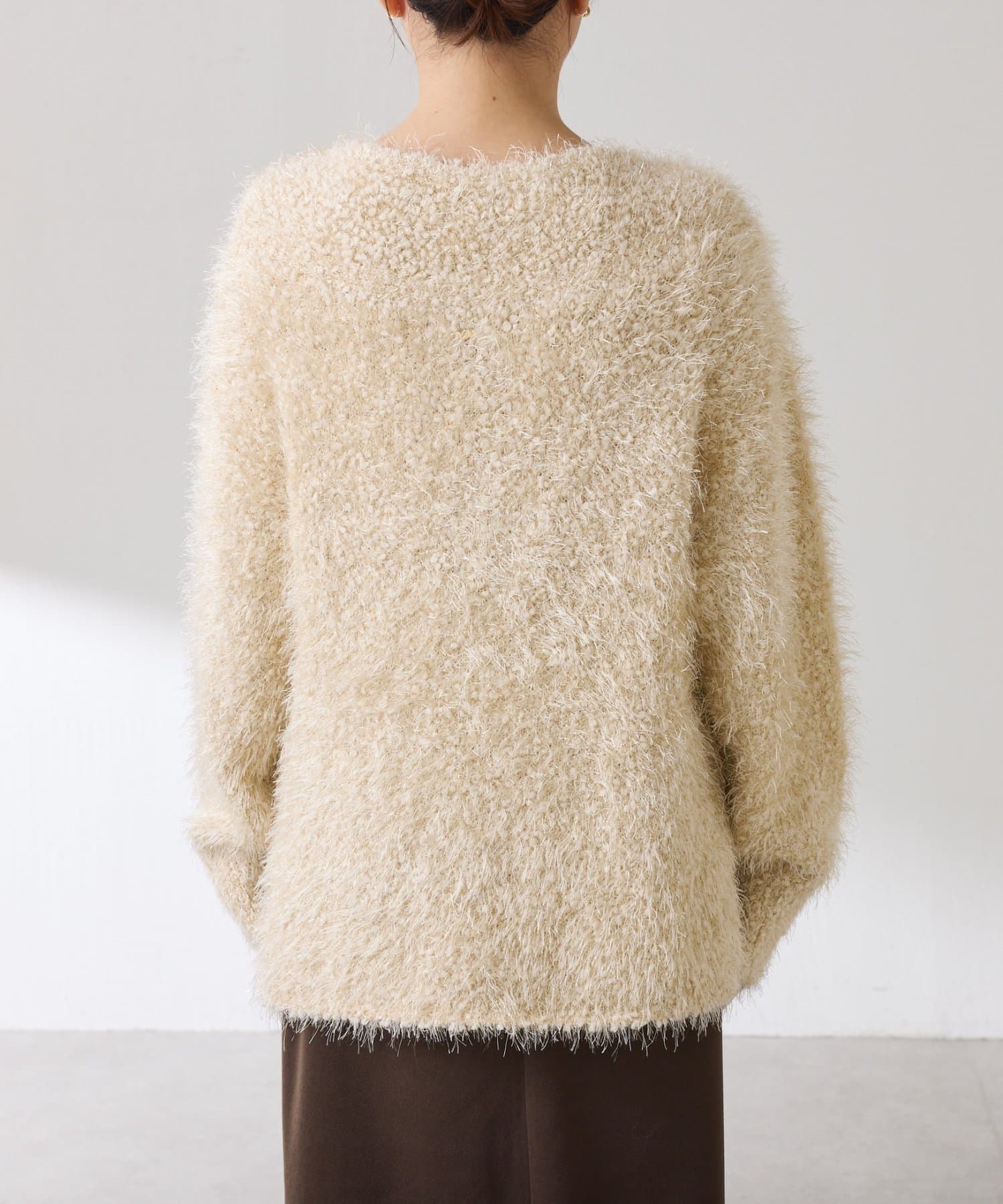・煌めきとふわふわ素材が華やかなニット。襟周りはポコポコした提灯モールで引き締めました。