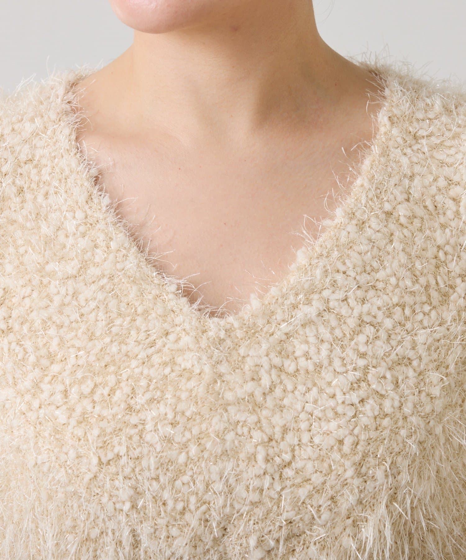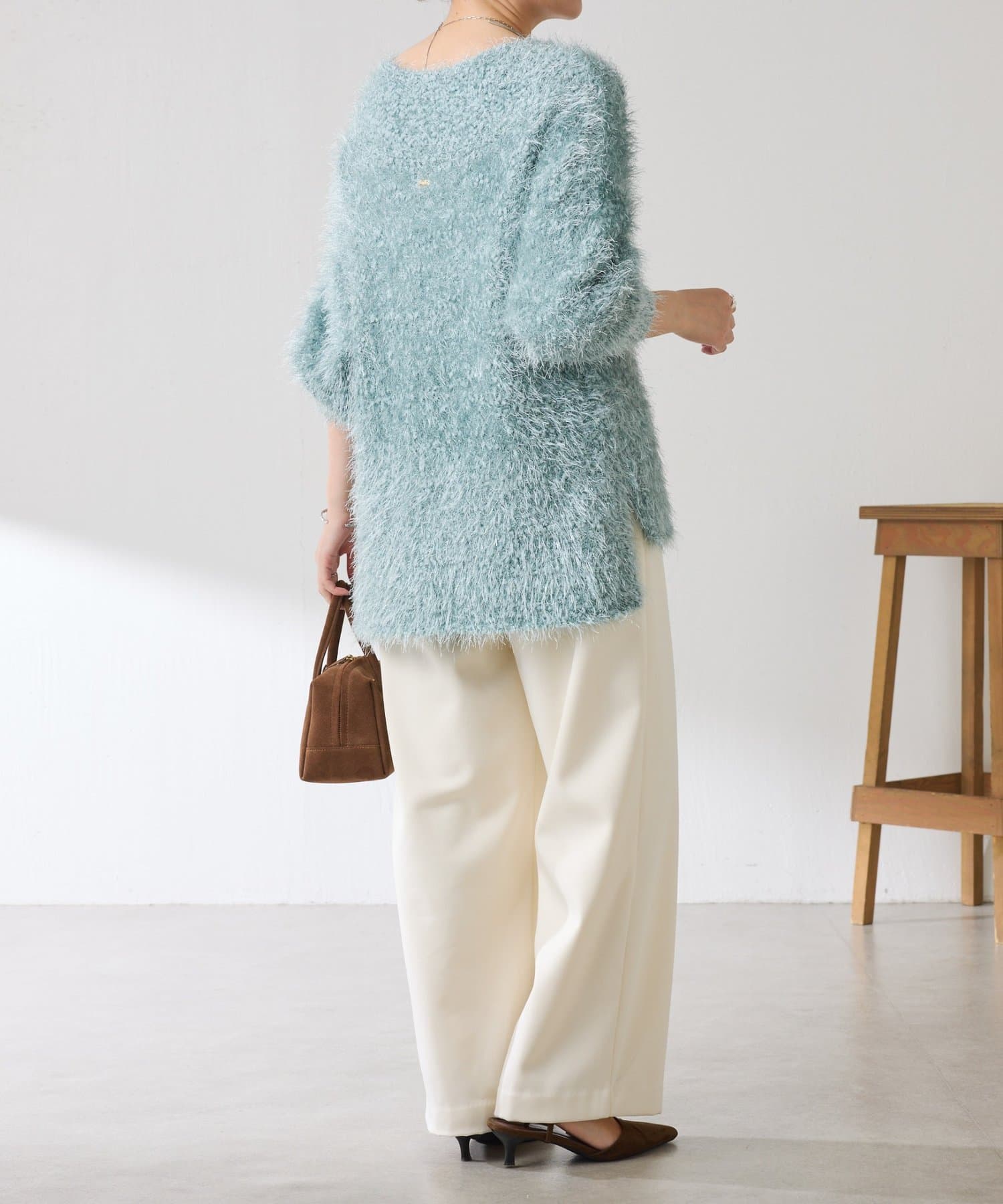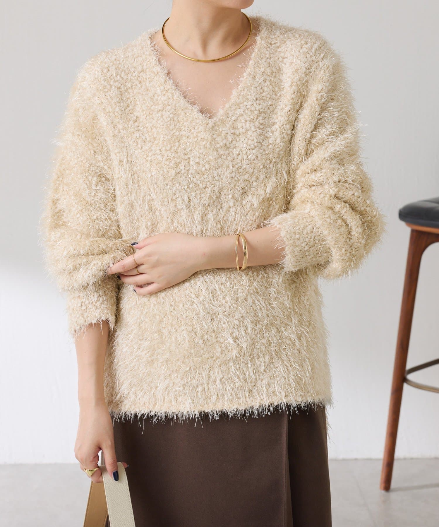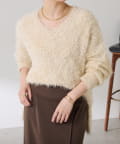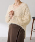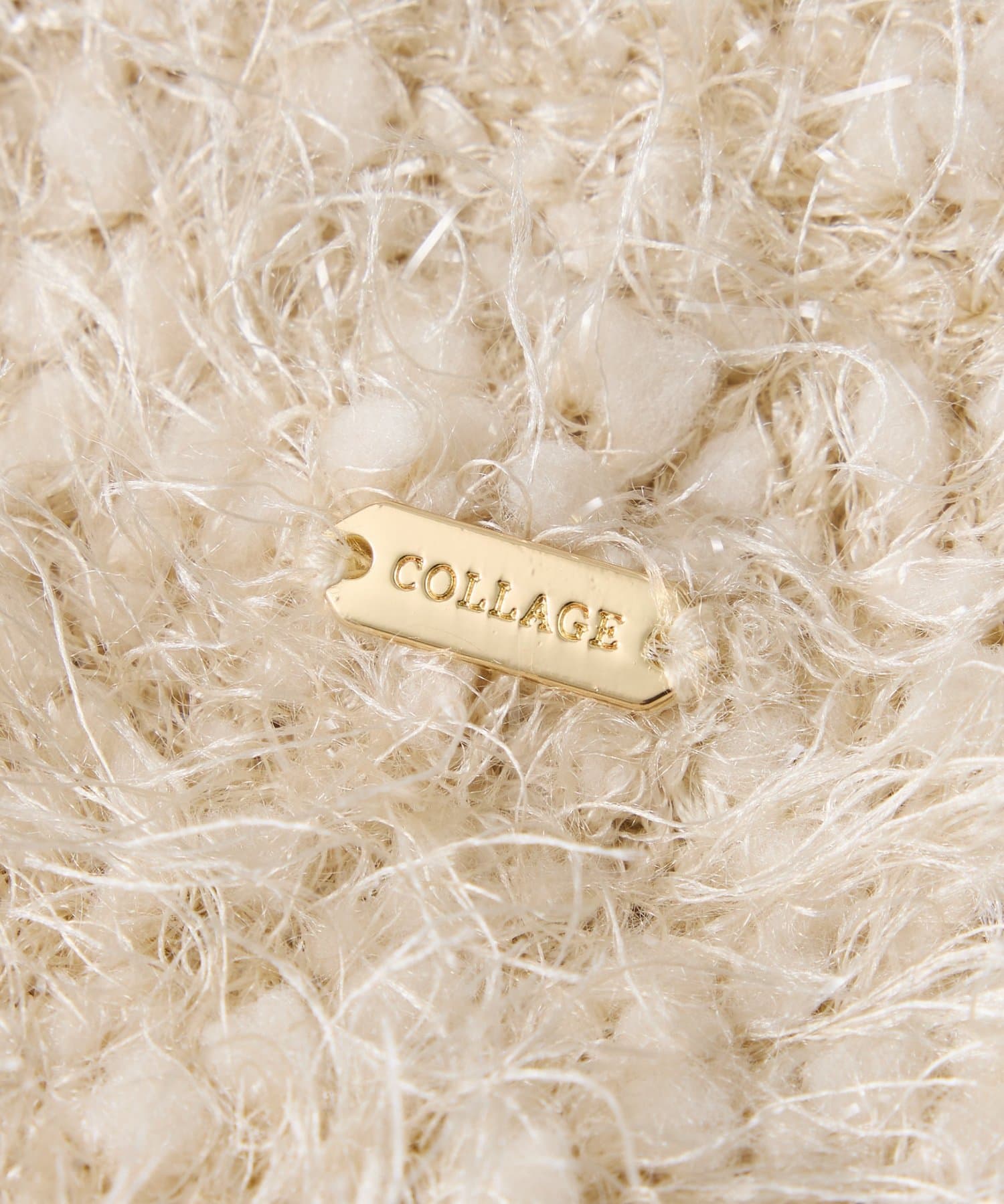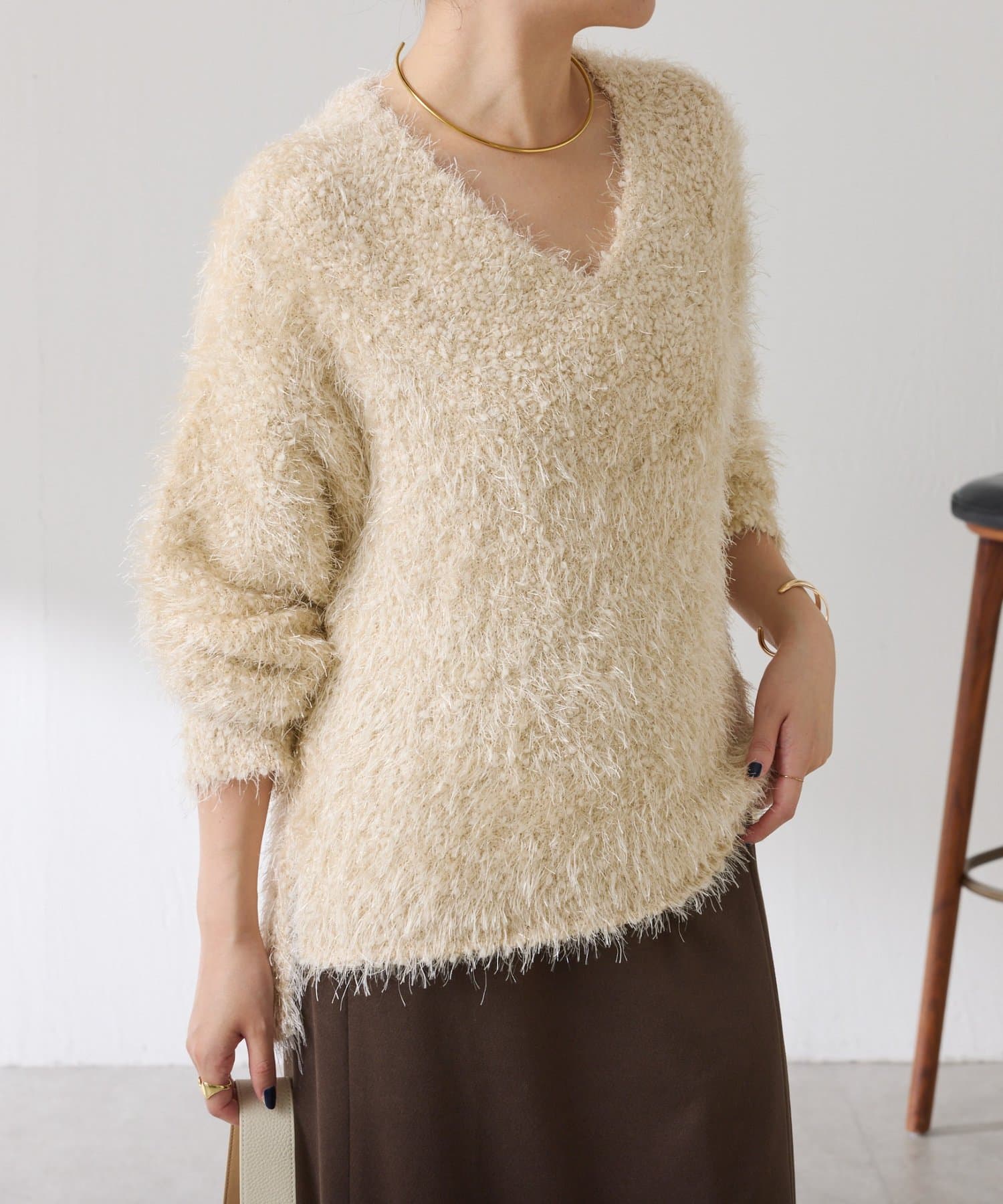 ・煌めきとふわふわ素材が華やかなニット。襟周りはポコポコした提灯モールで引き締めました。