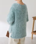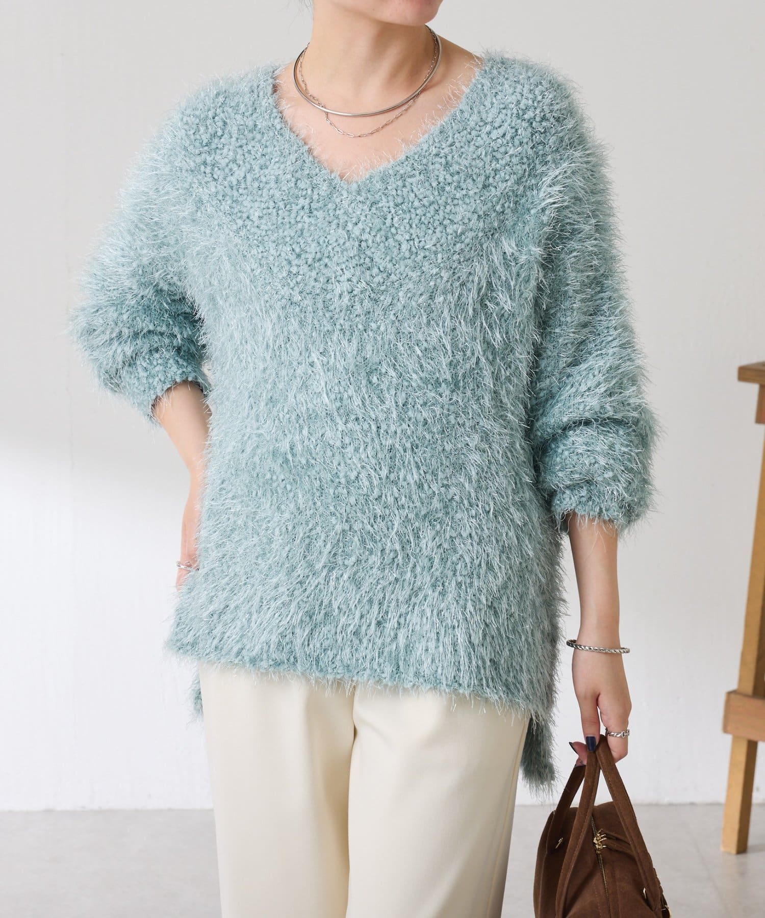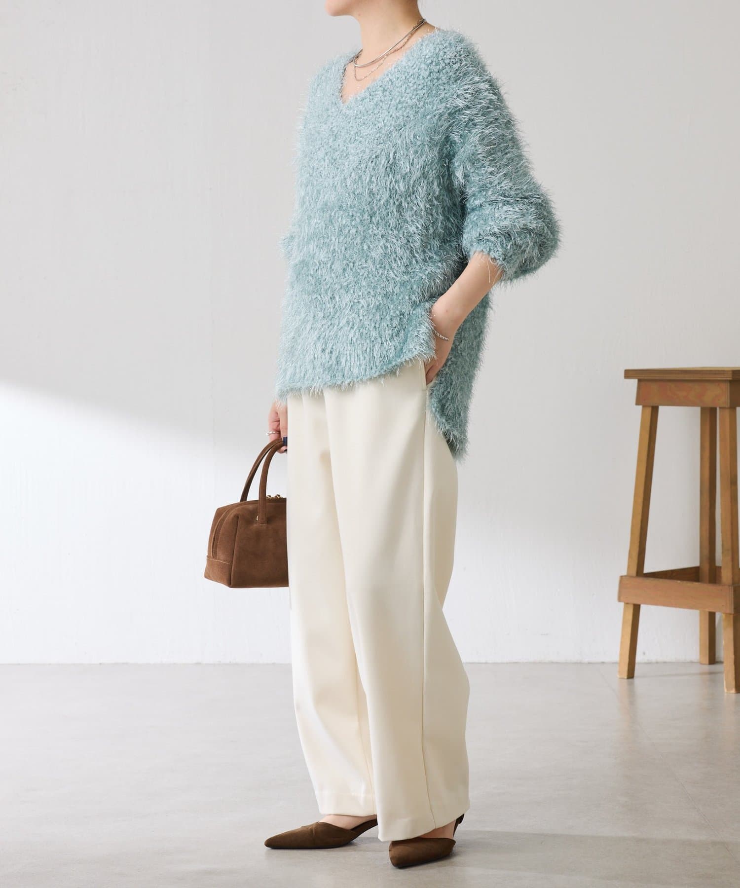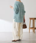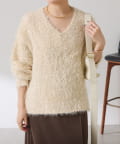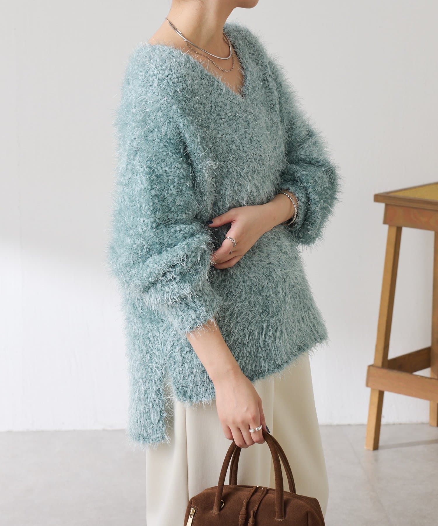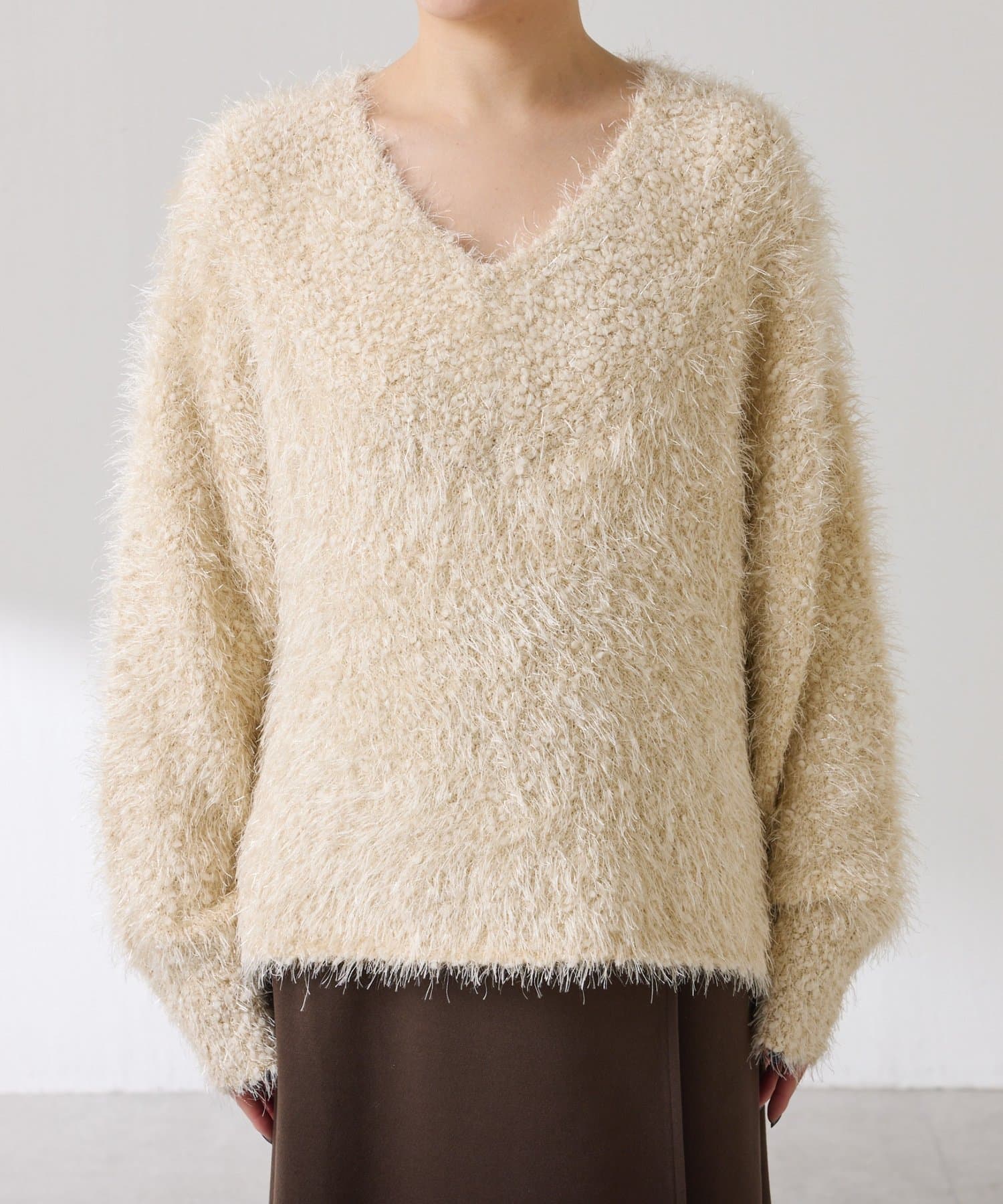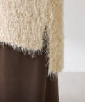 ・煌めきとふわふわ素材が華やかなニット。襟周りはポコポコした提灯モールで引き締めました。