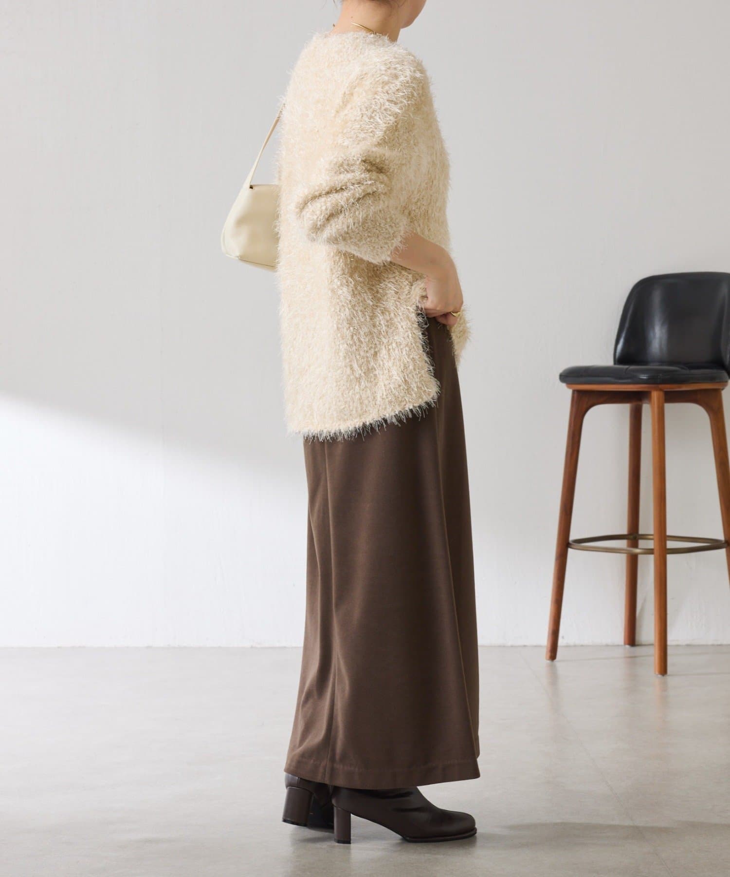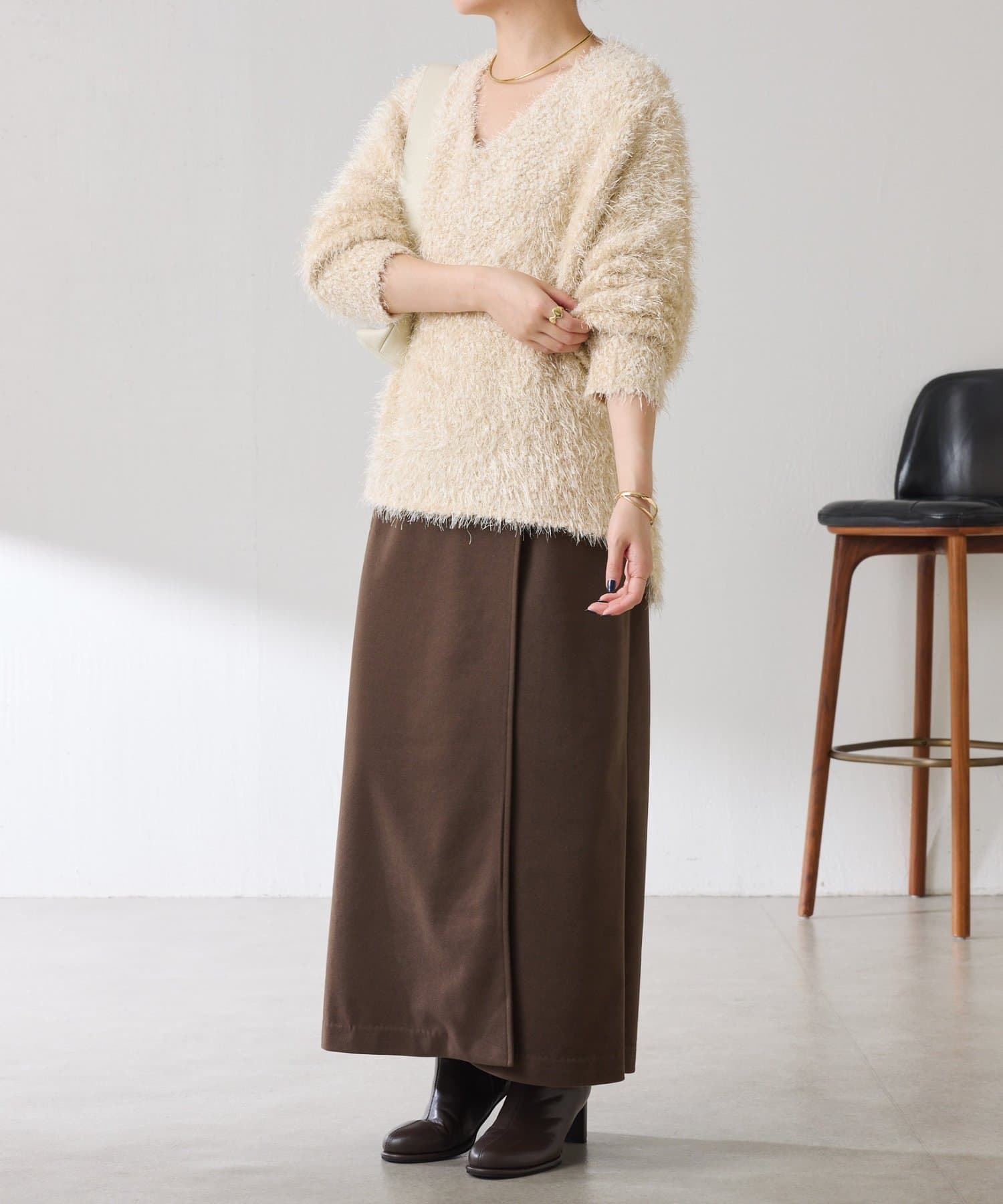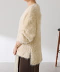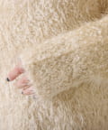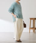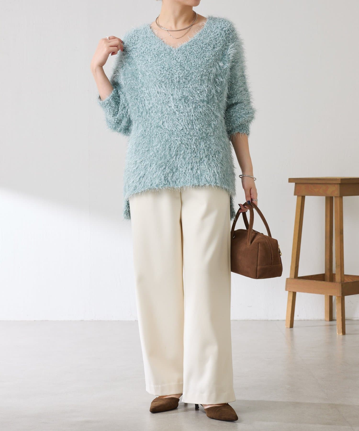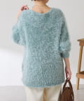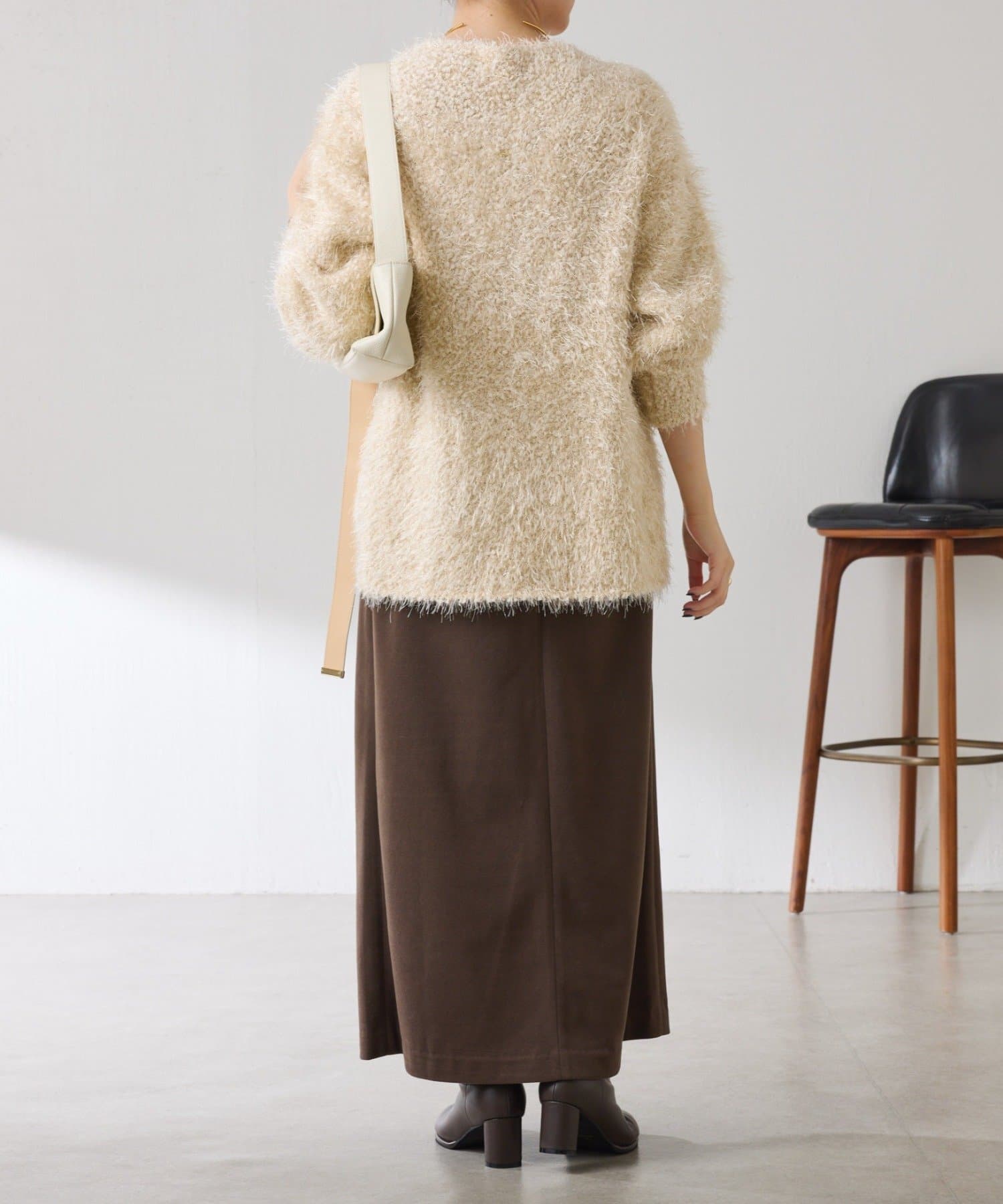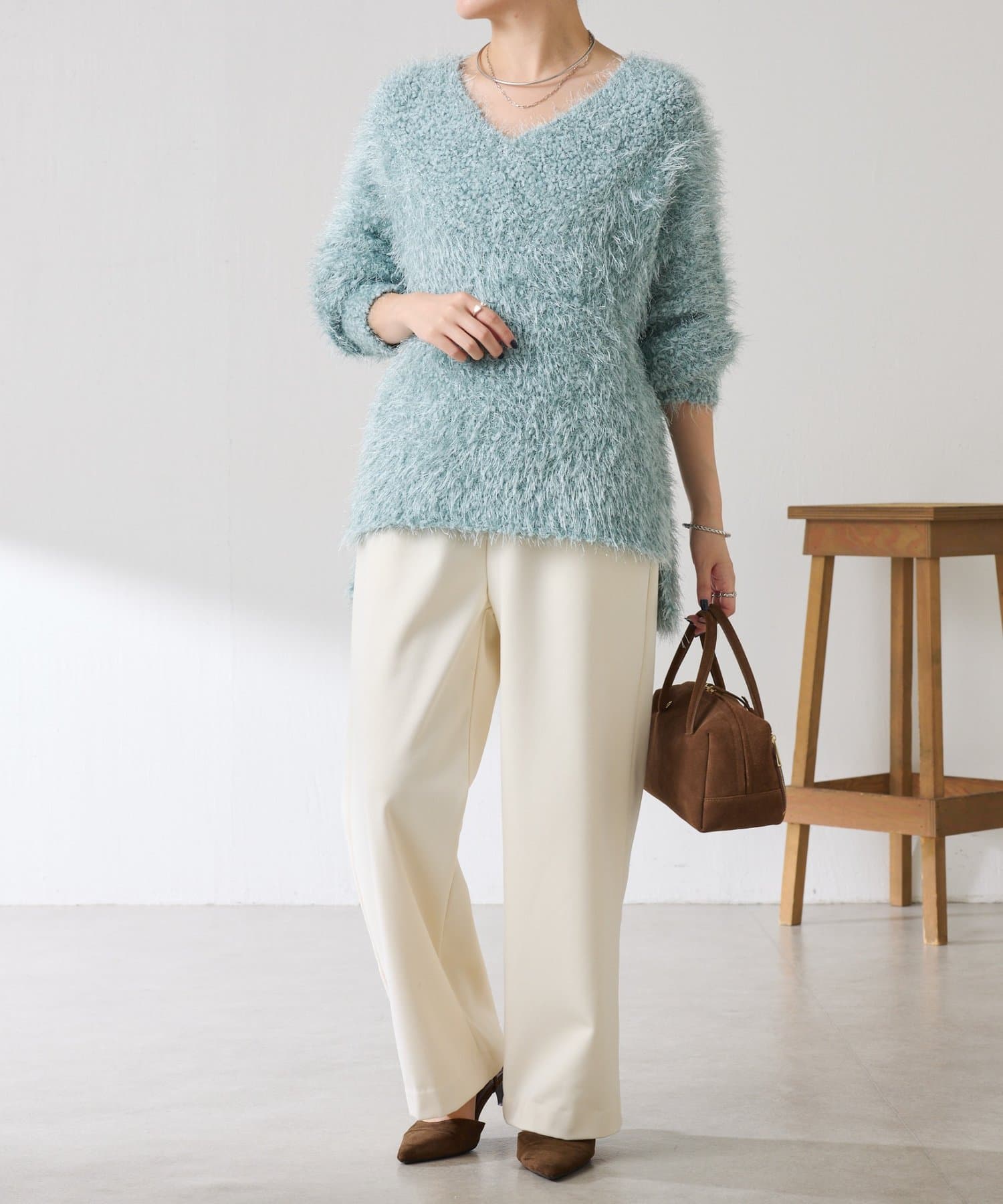 ・煌めきとふわふわ素材が華やかなニット。襟周りはポコポコした提灯モールで引き締めました。