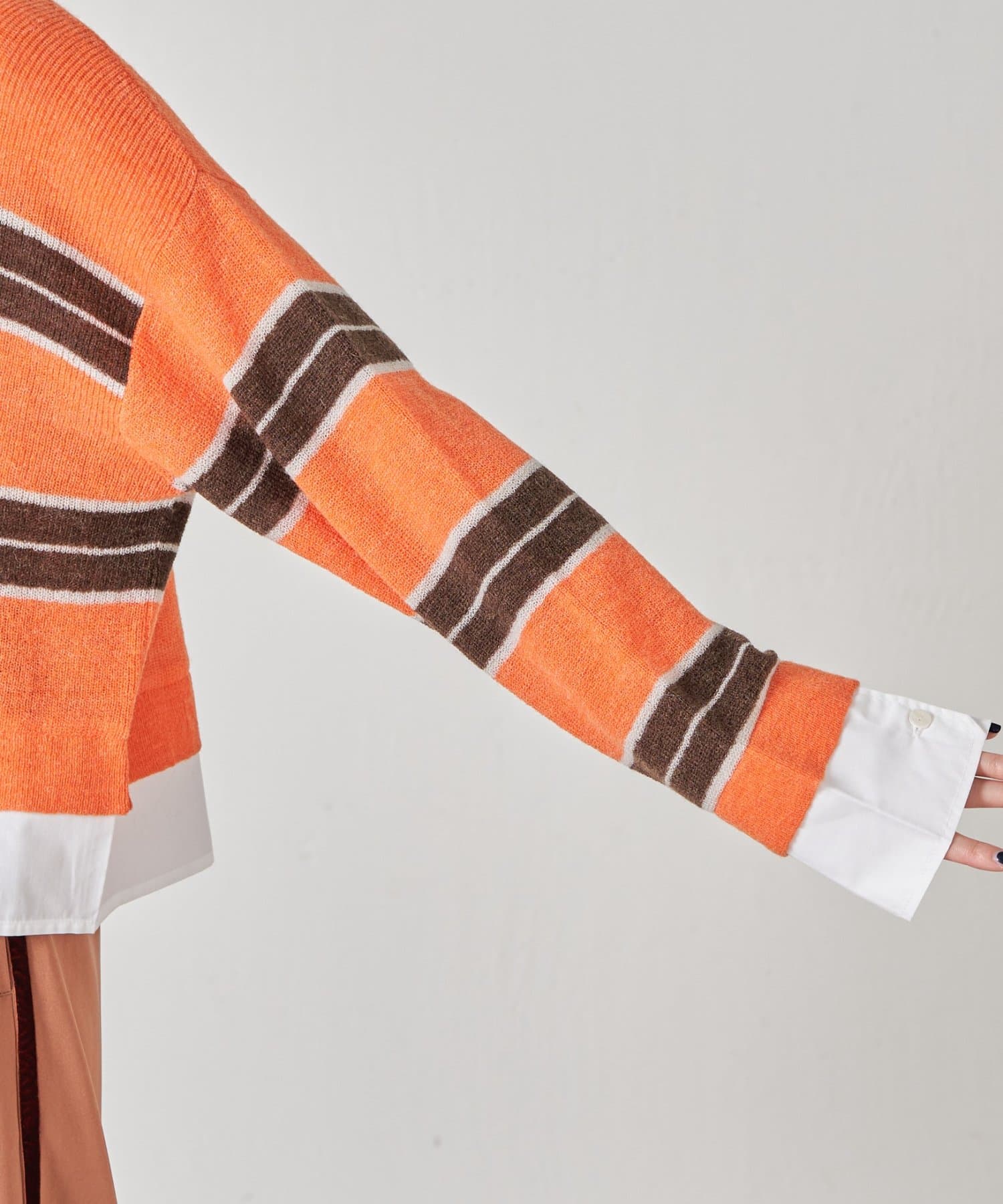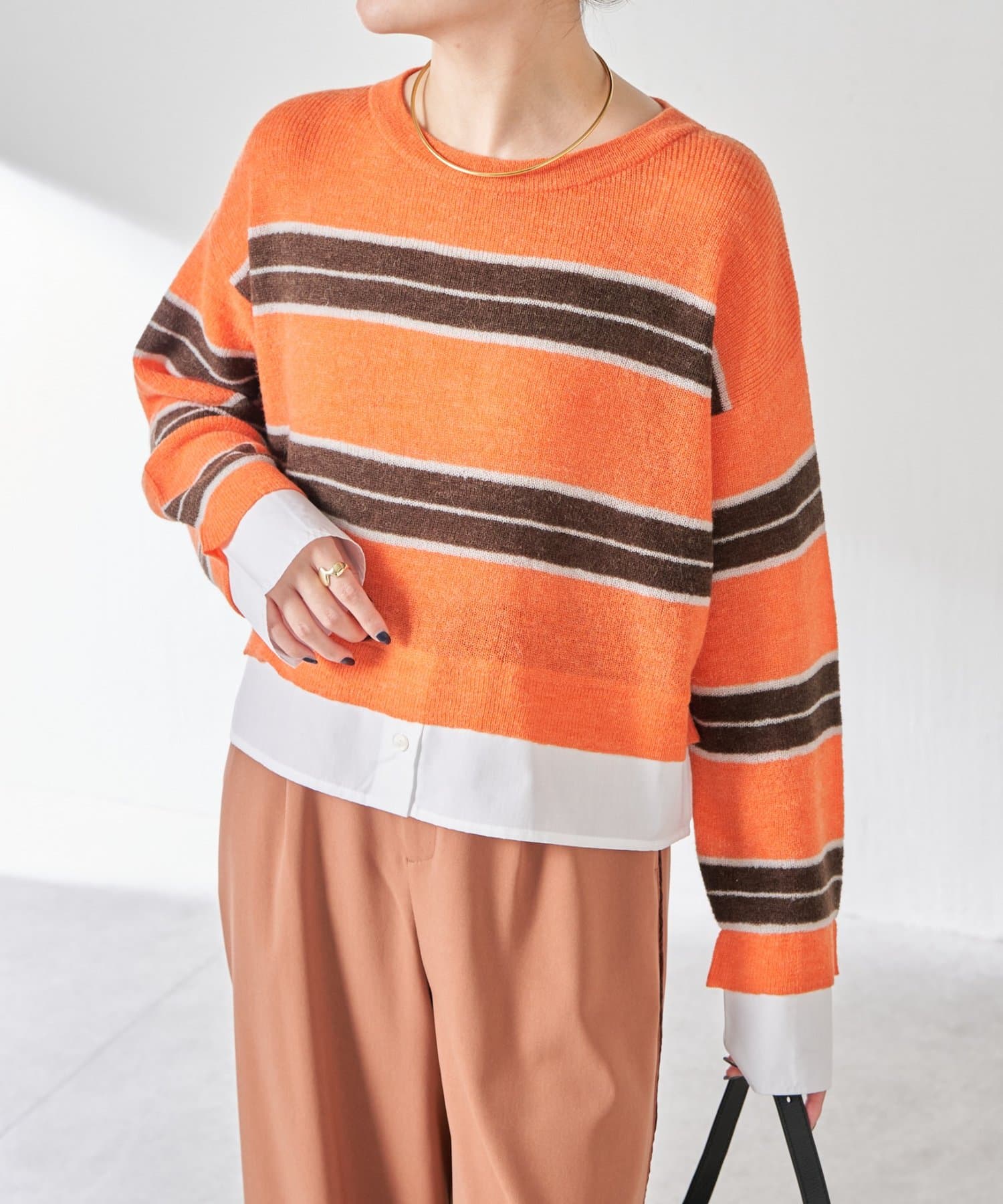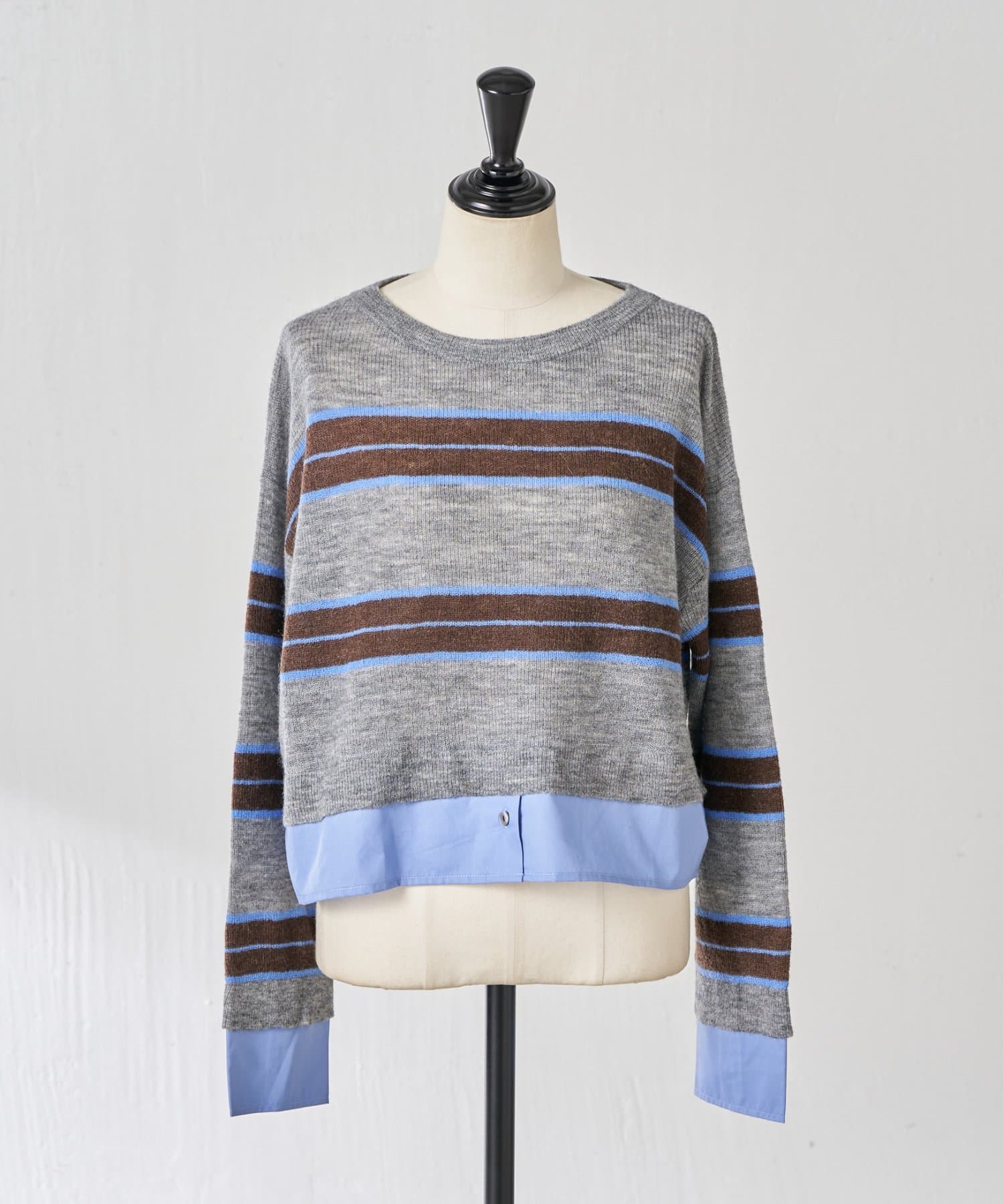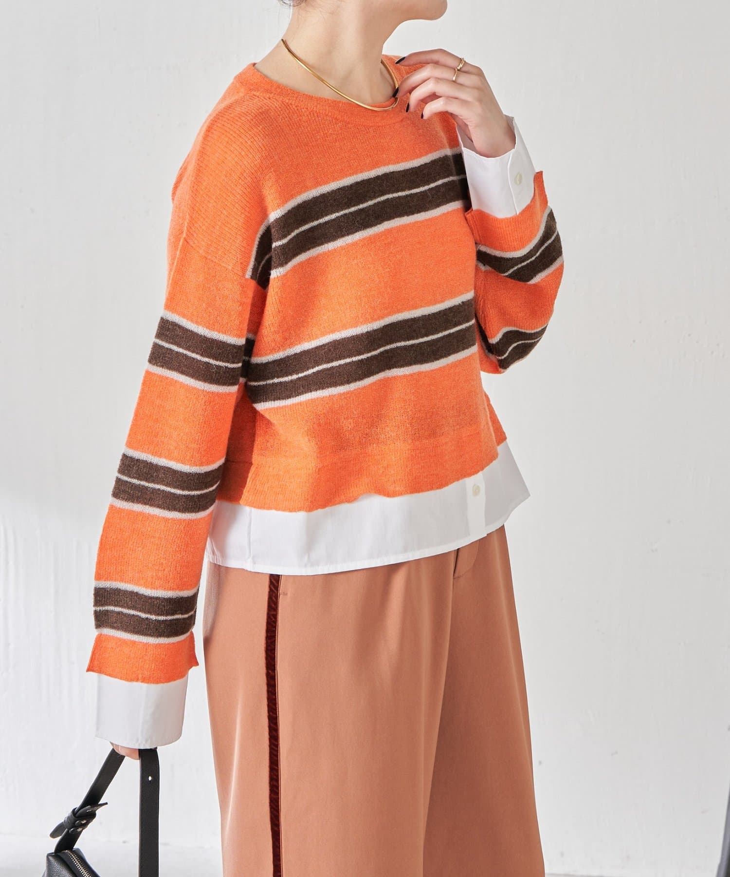 ・柔らかな薄手のボーダーニットに、袖口と裾にシャツをレイヤードしたようなドッキングアイテム。