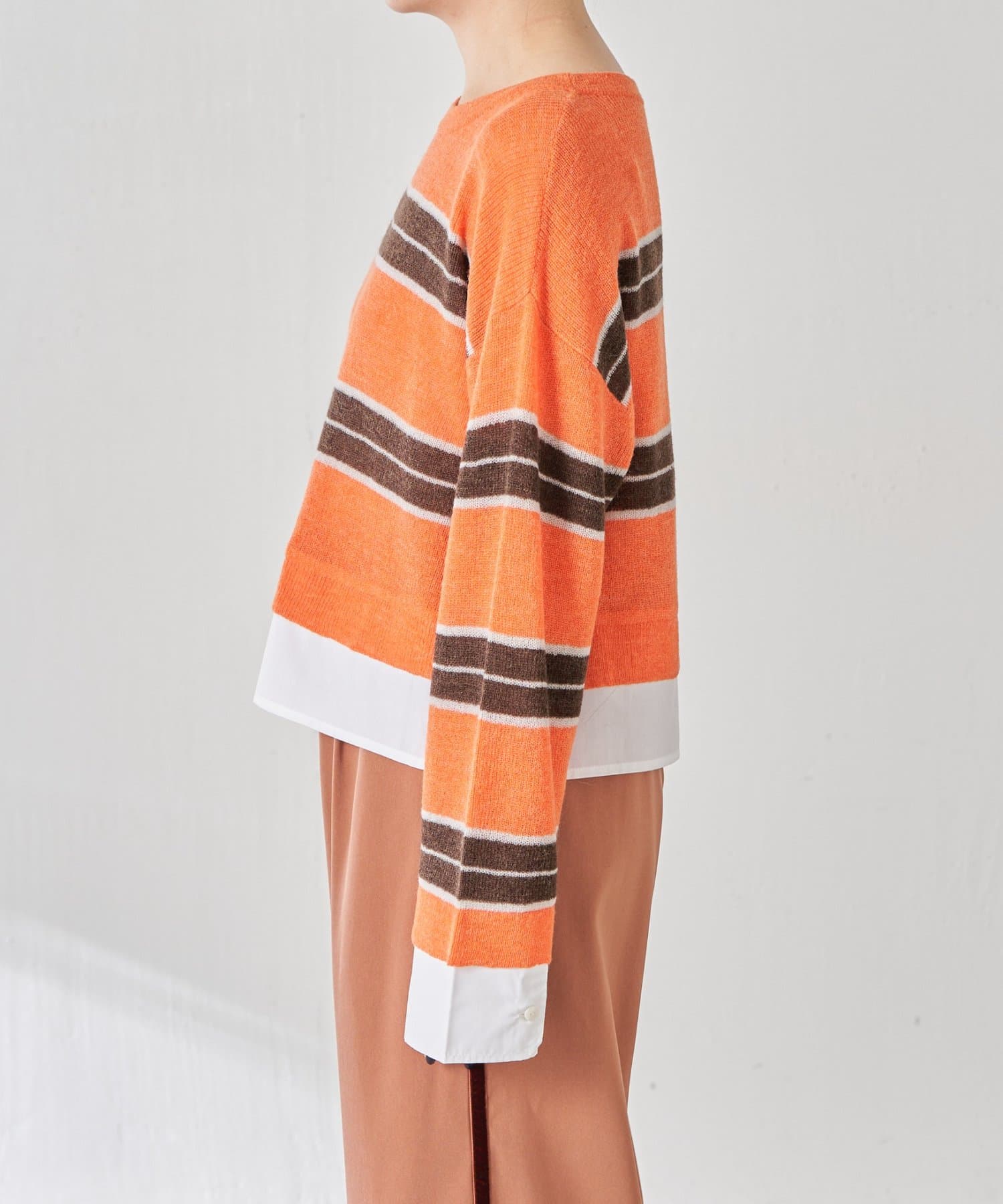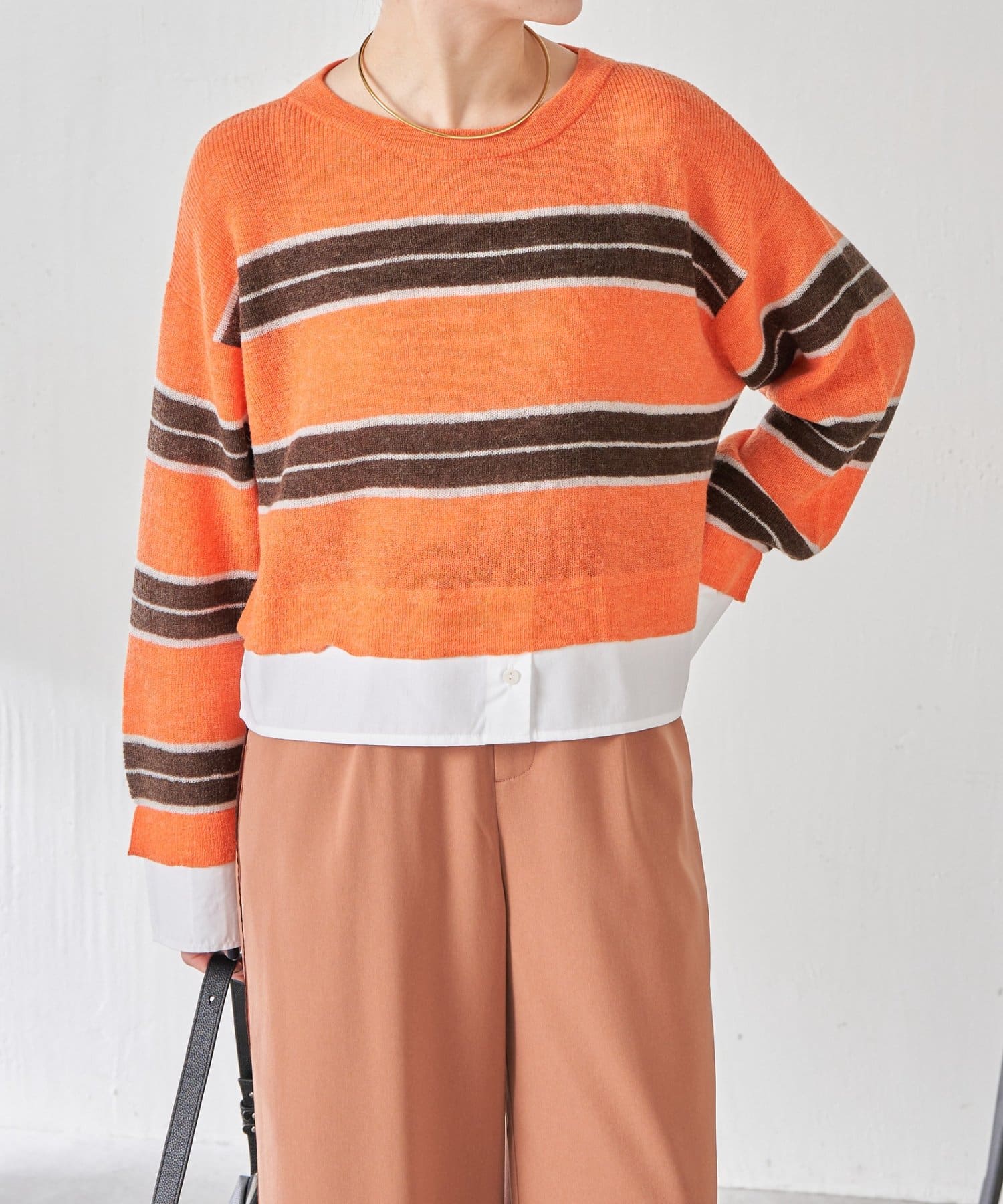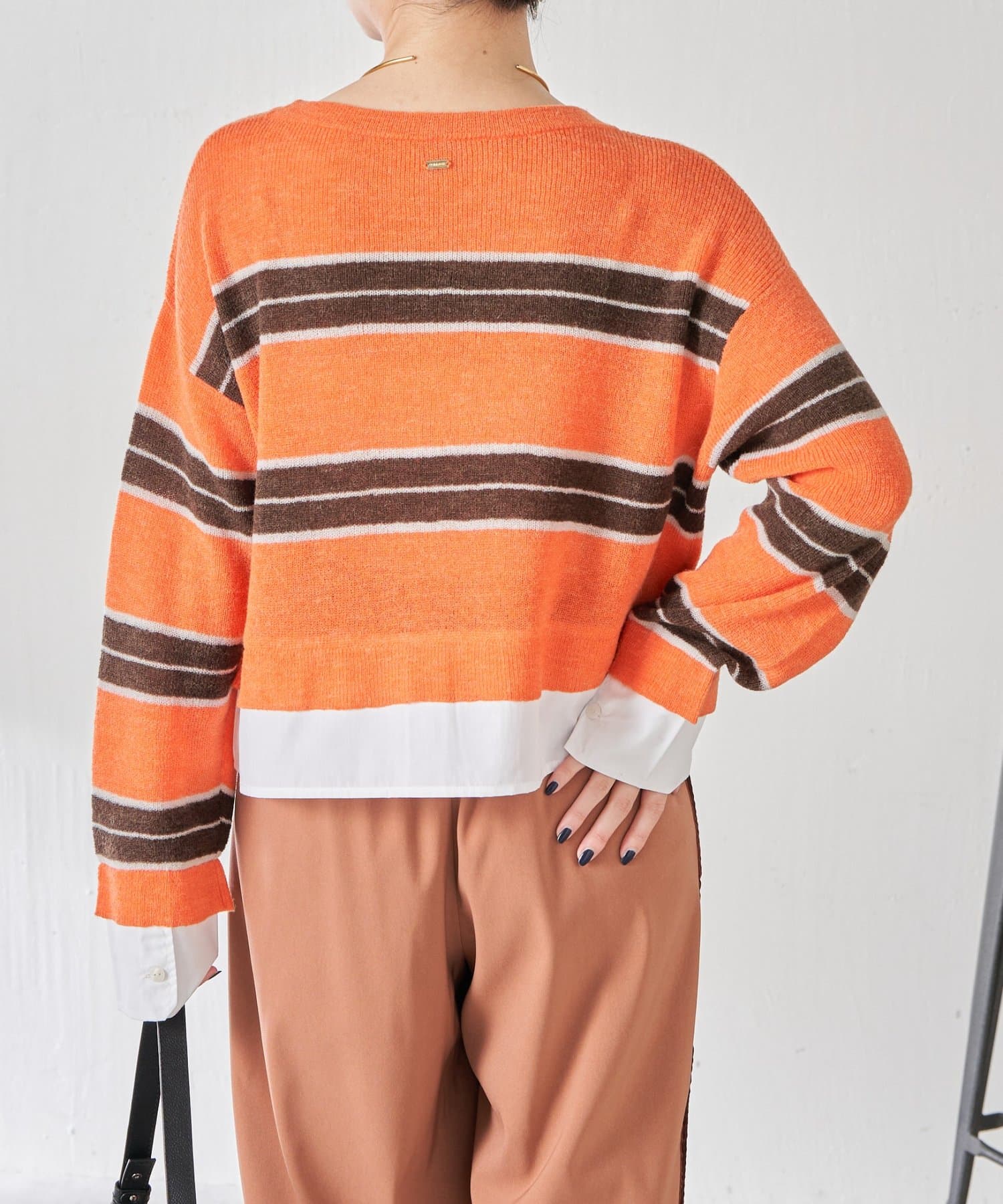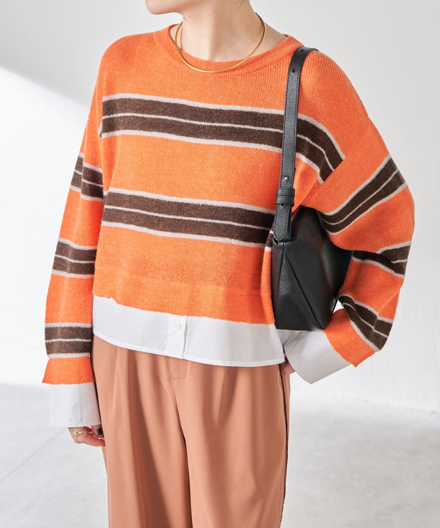 ・柔らかな薄手のボーダーニットに、袖口と裾にシャツをレイヤードしたようなドッキングアイテム。