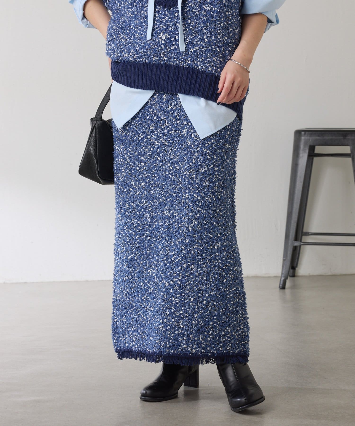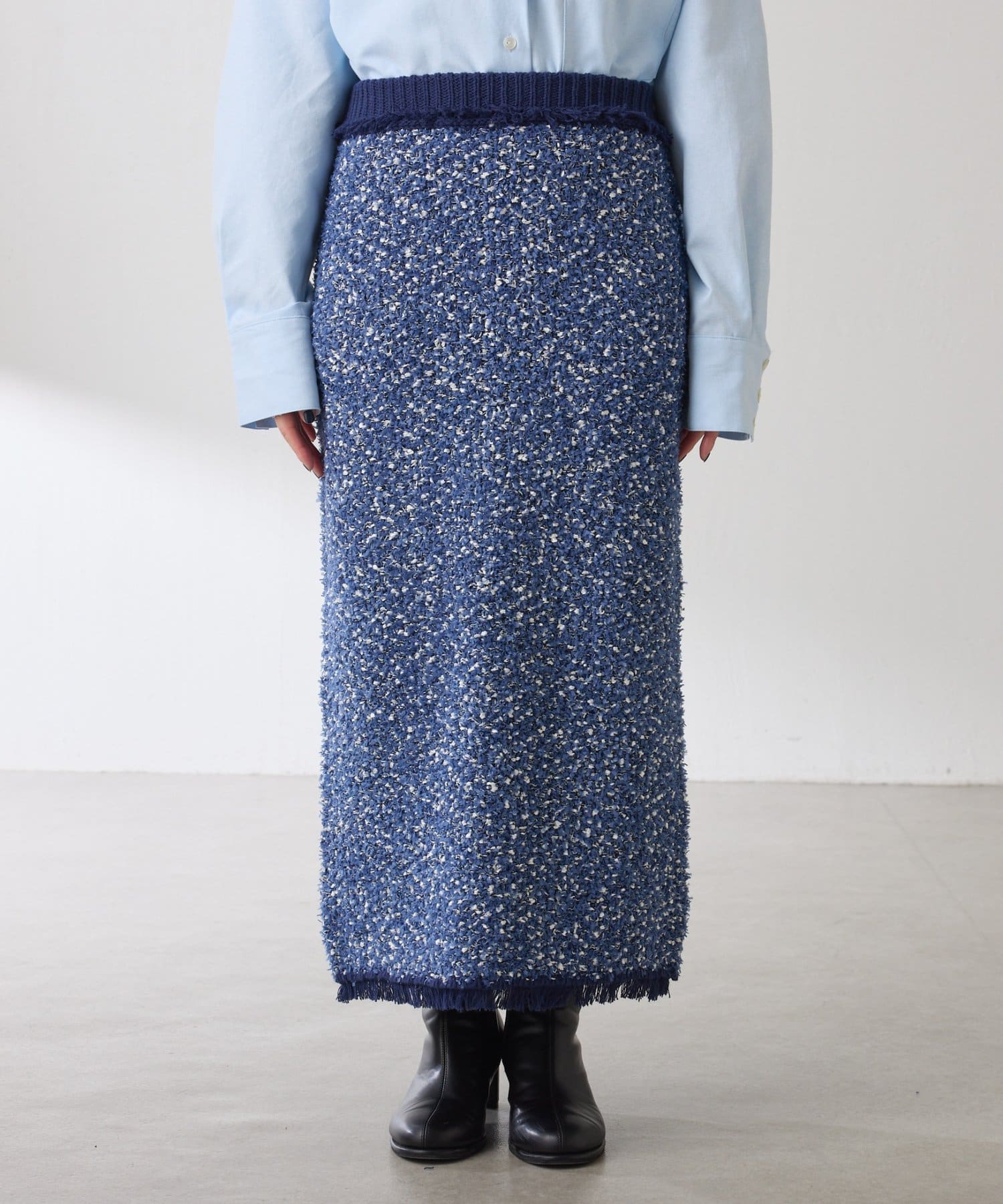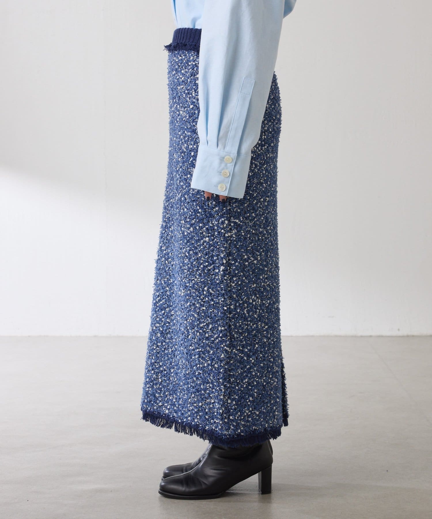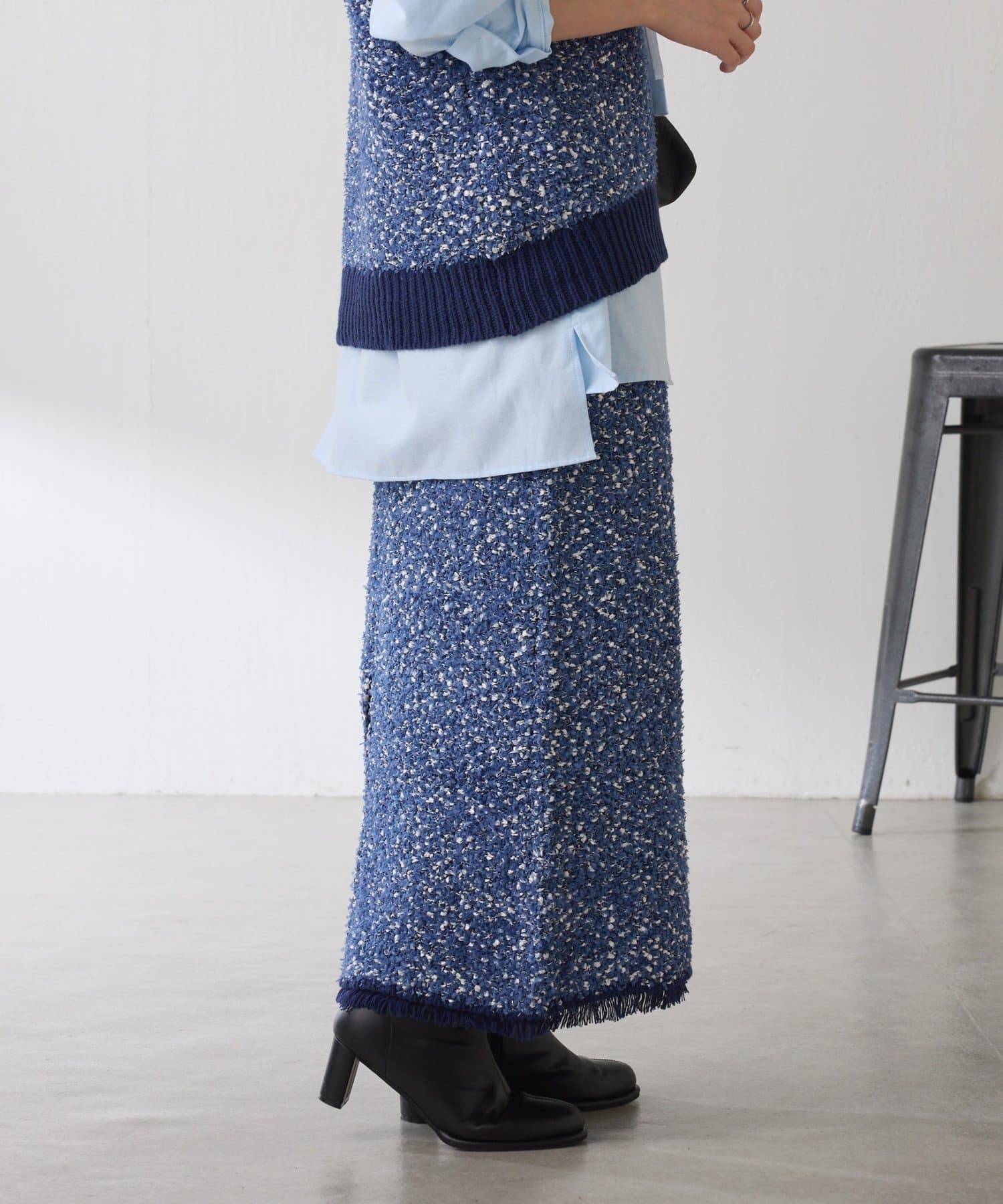 ・3種類の糸で凹凸感と色のミックス感を表現したツイード見えするニットスカート。