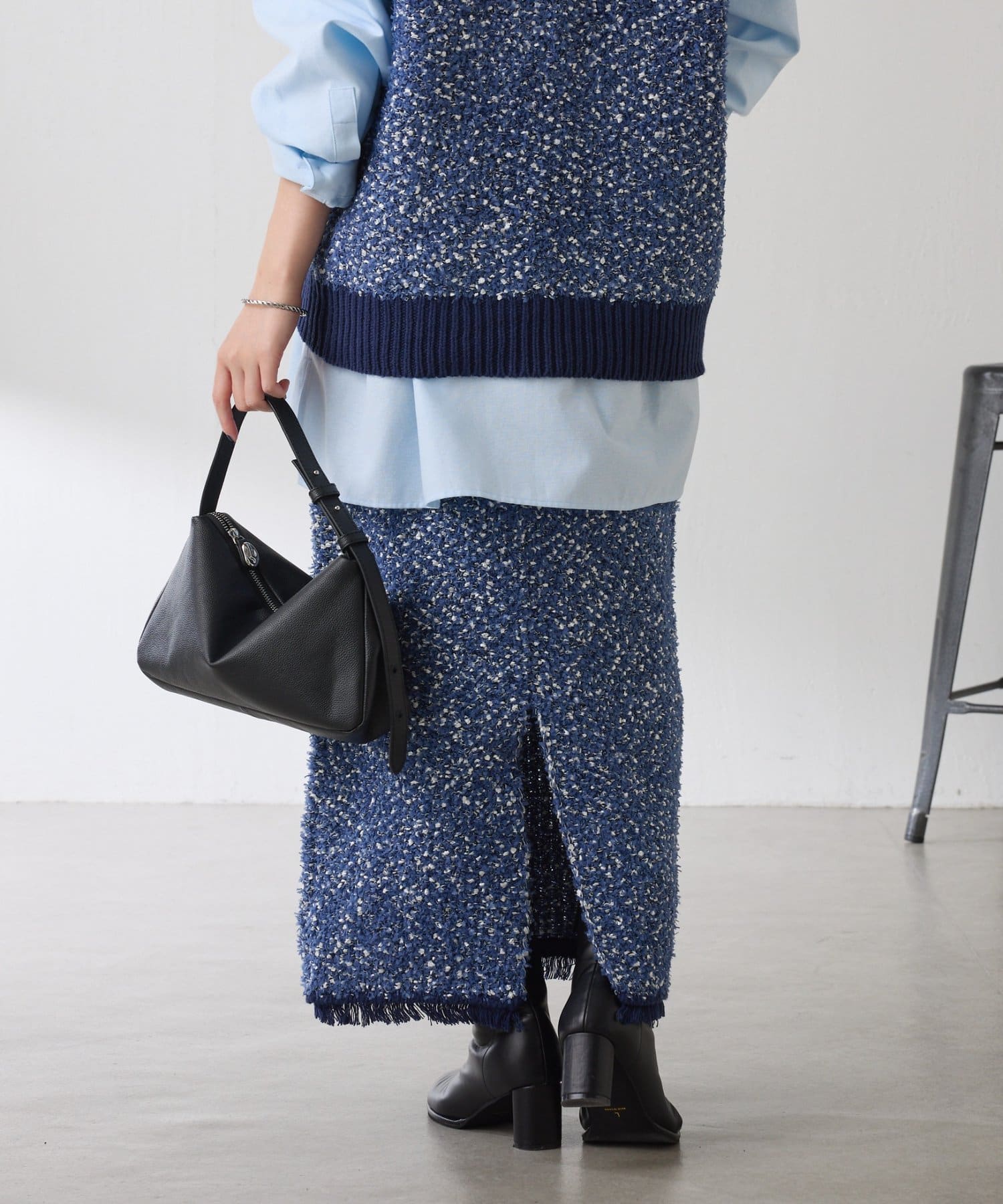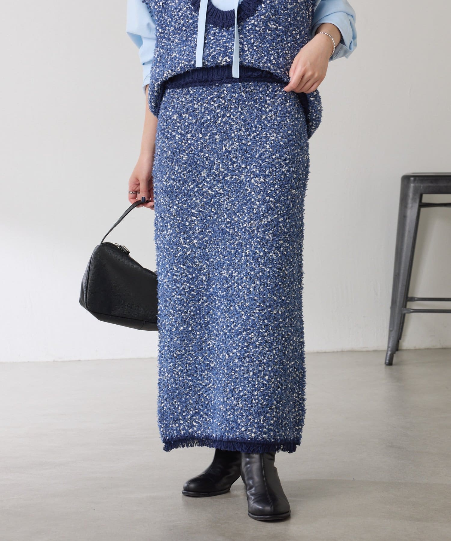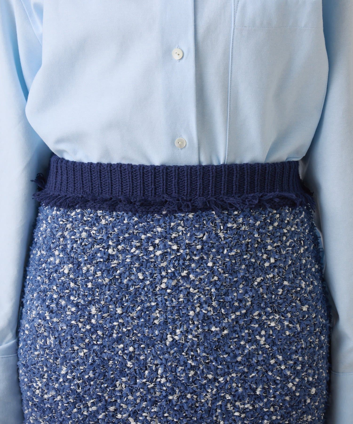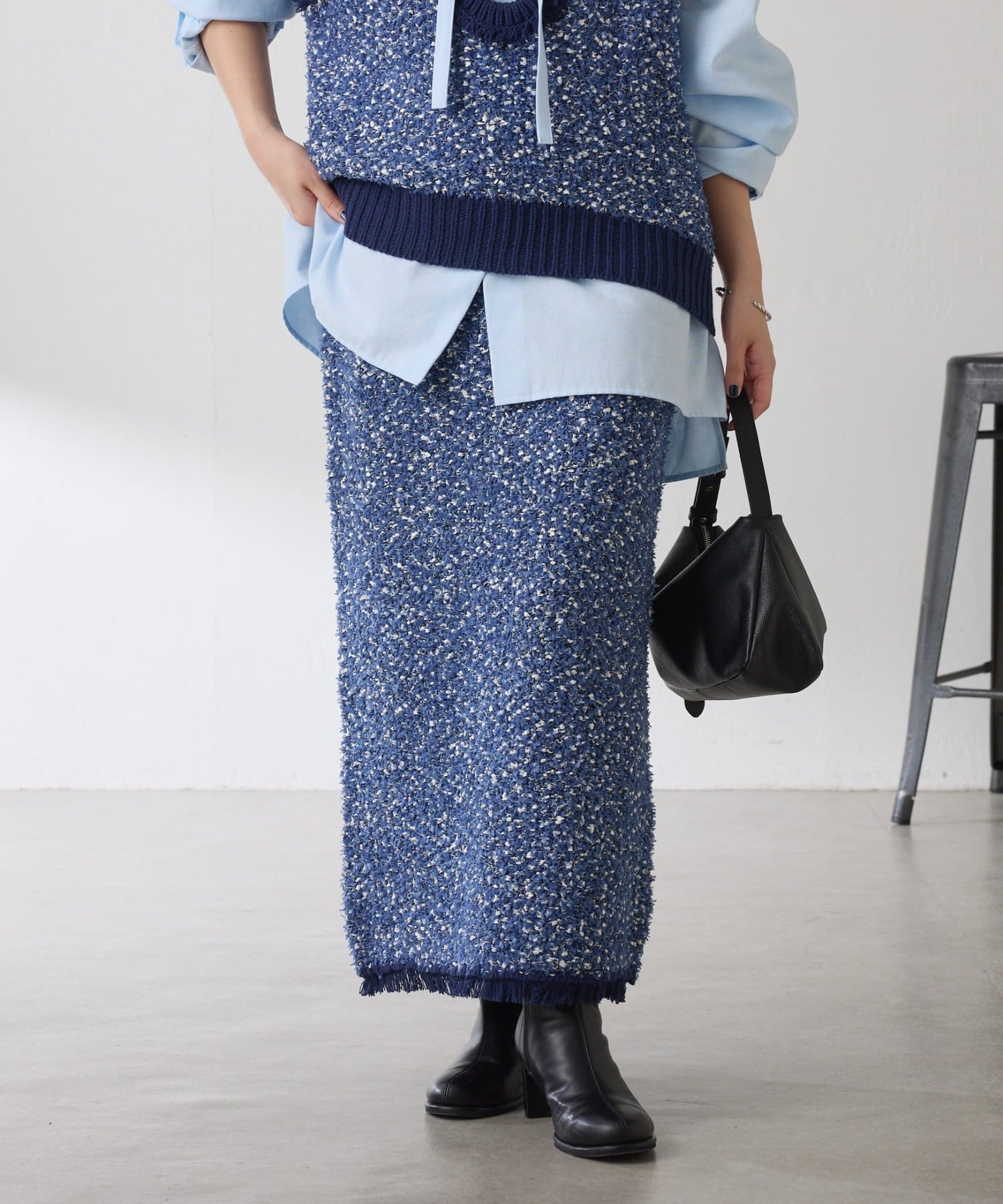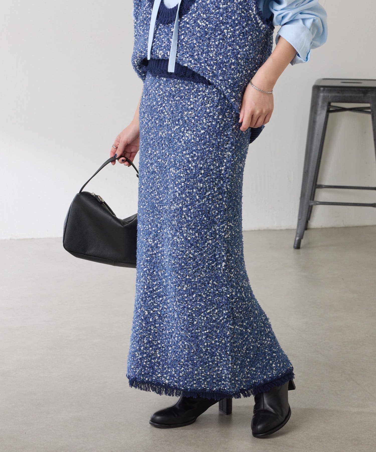 ・3種類の糸で凹凸感と色のミックス感を表現したツイード見えするニットスカート。