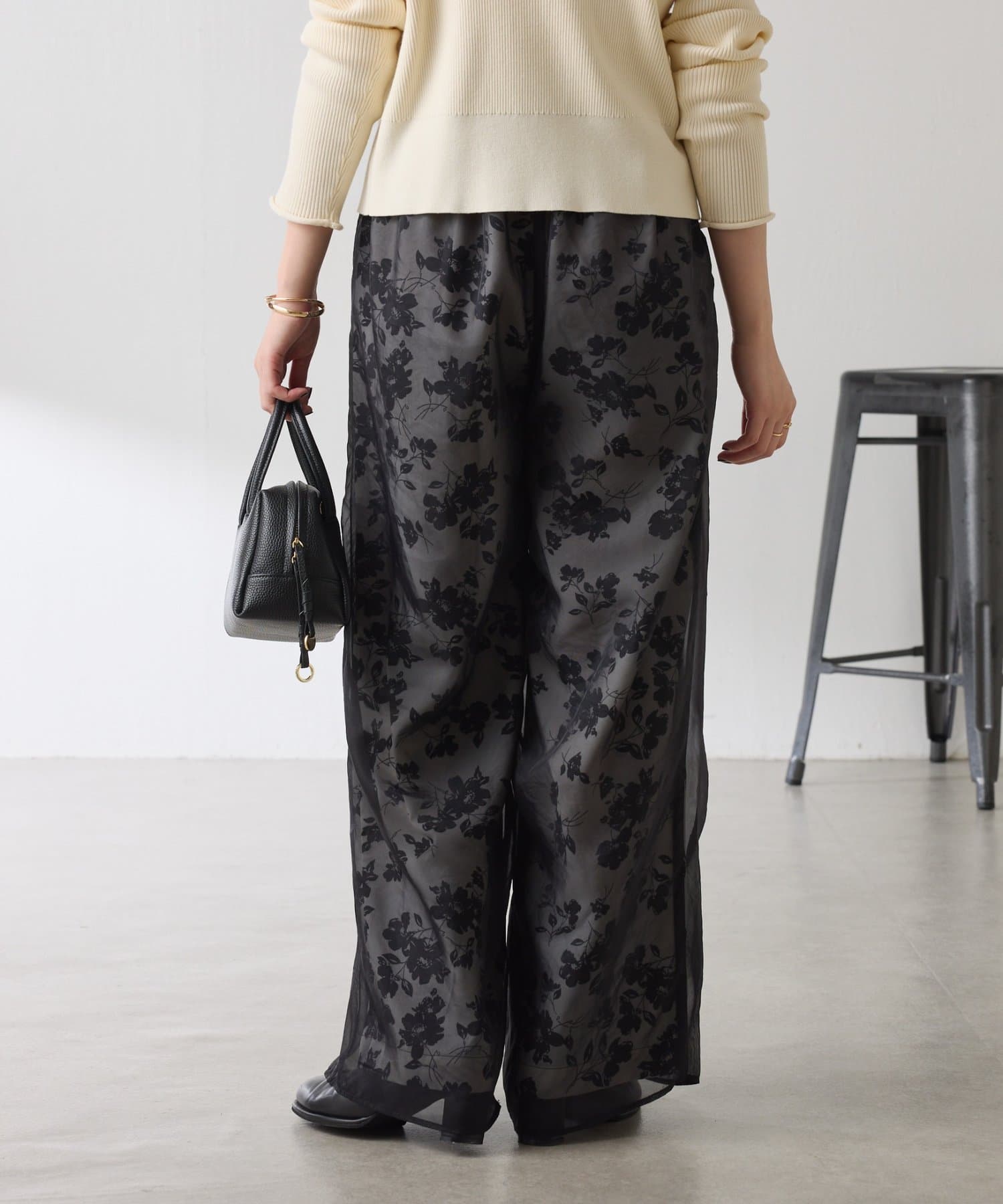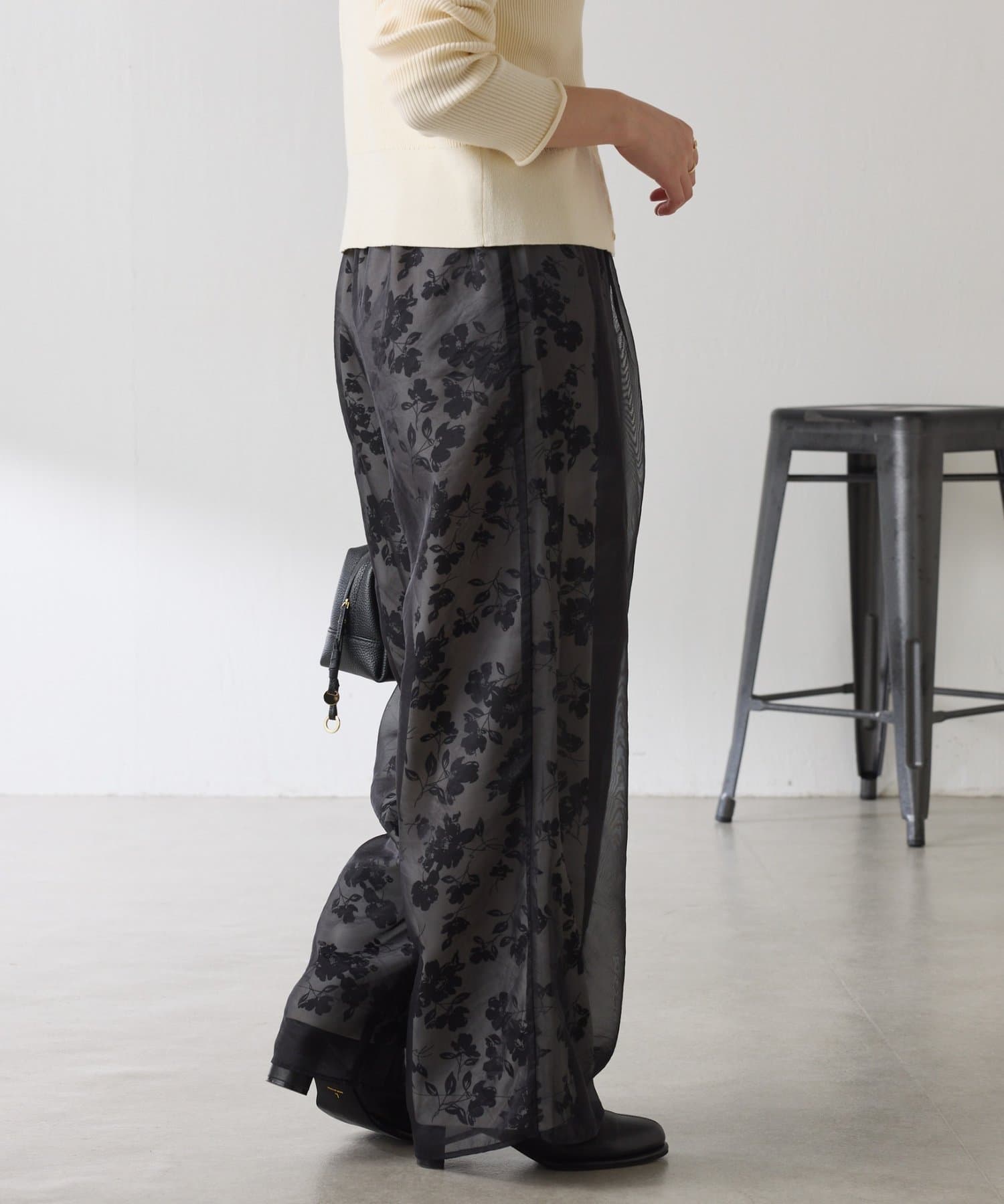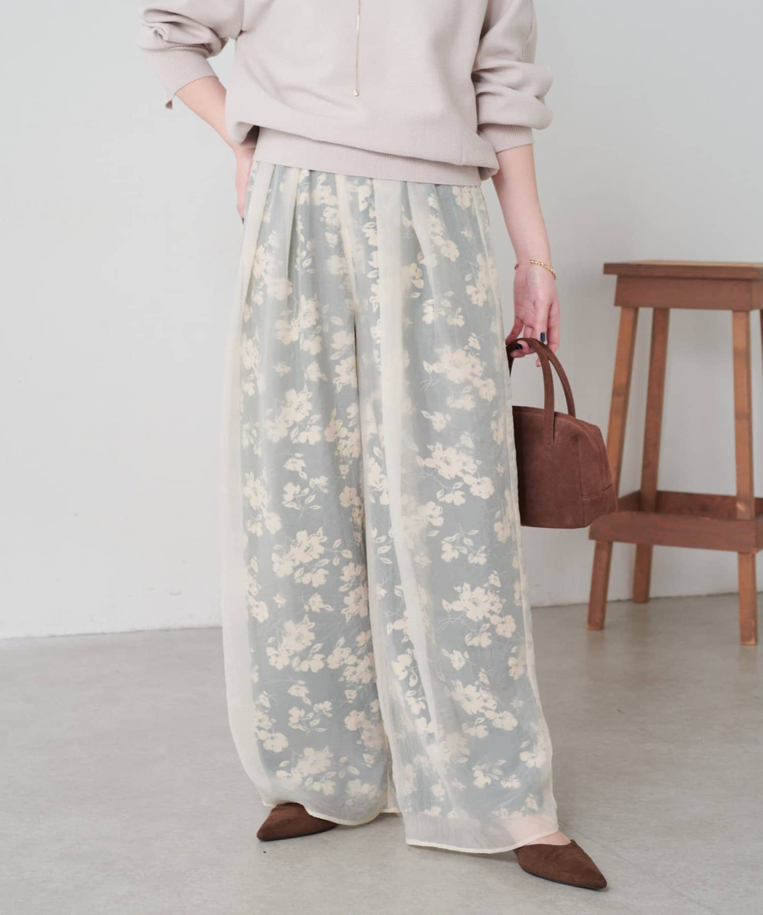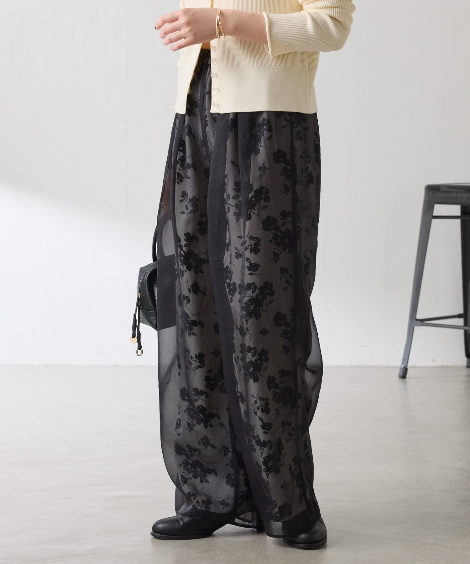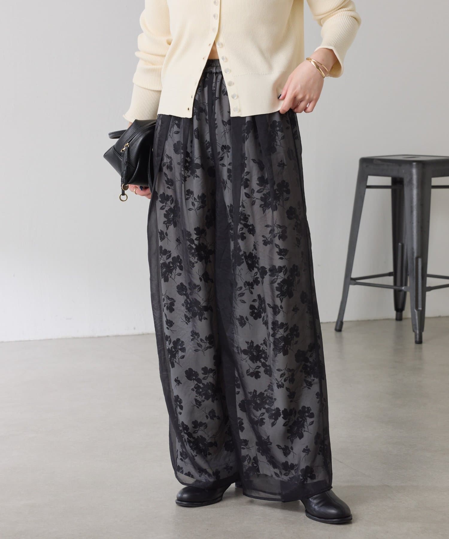 ・花柄の上にシアーをレイヤードした、冬でもシアーを楽しめるセミワイドパンツ。