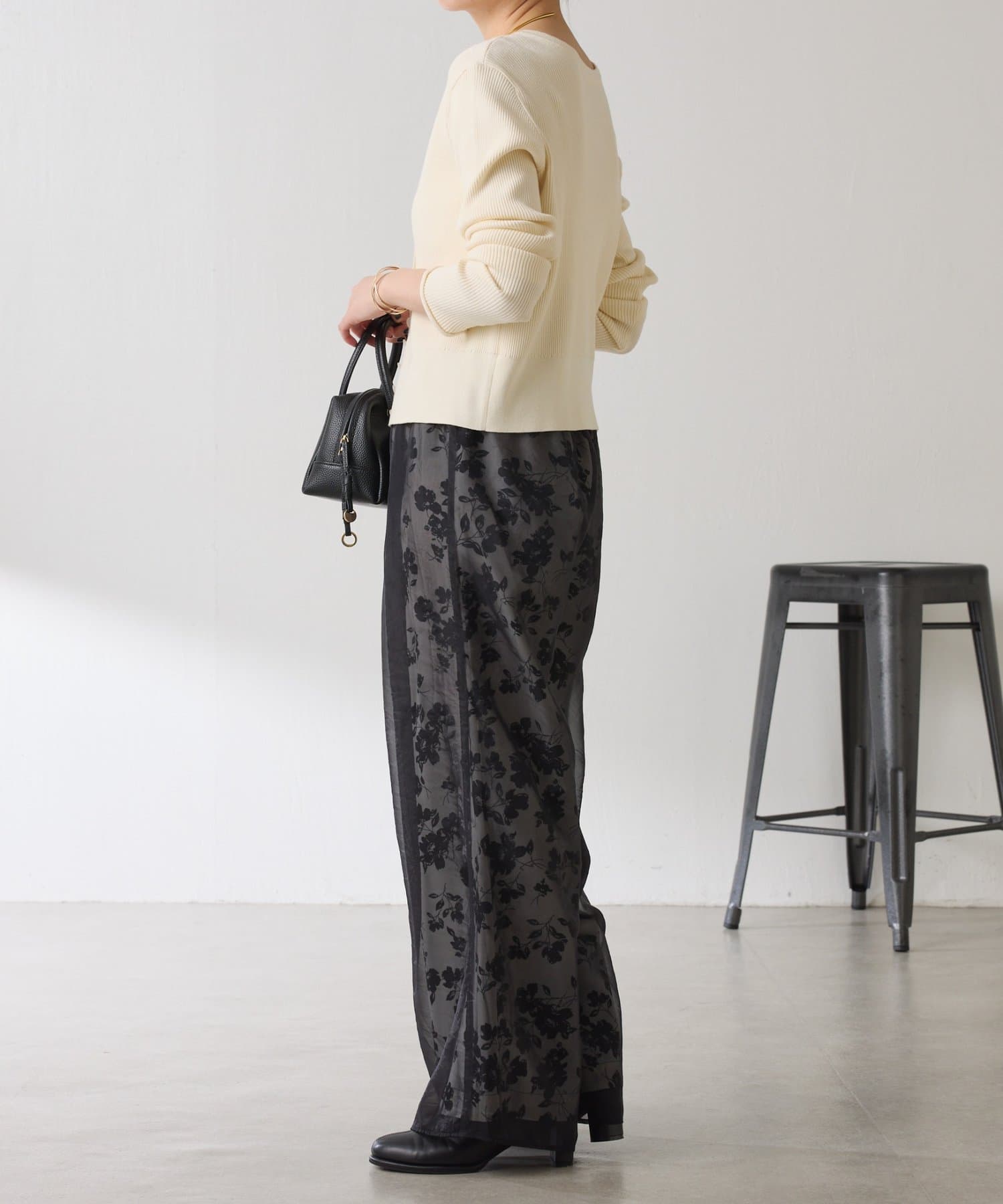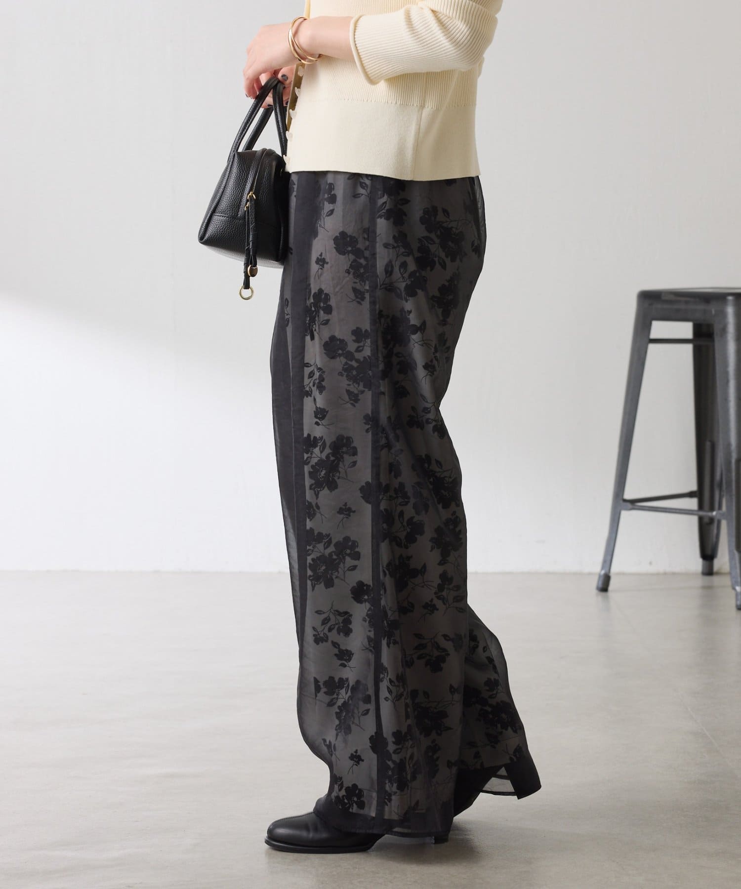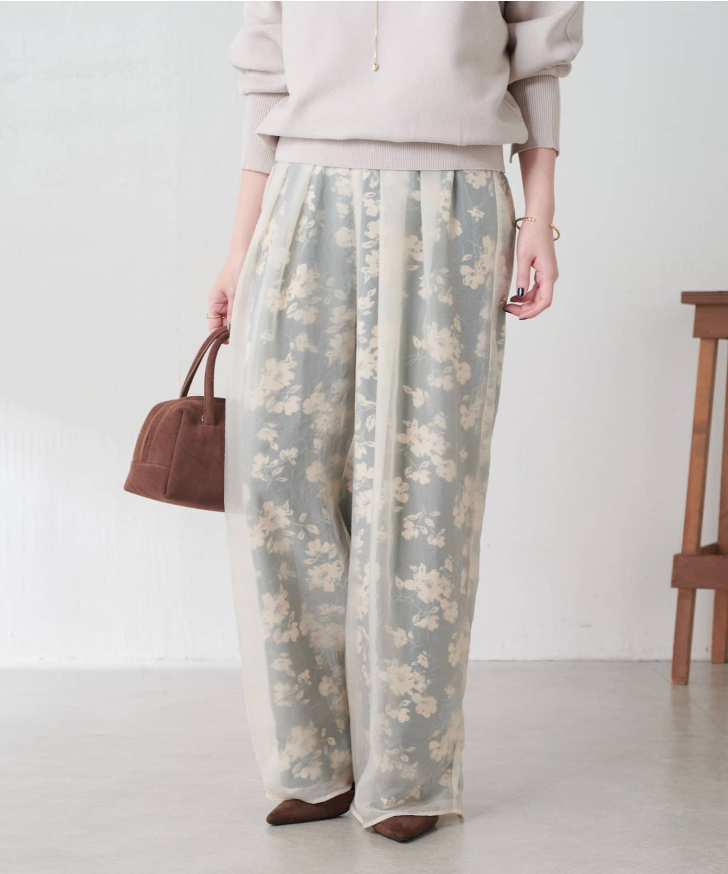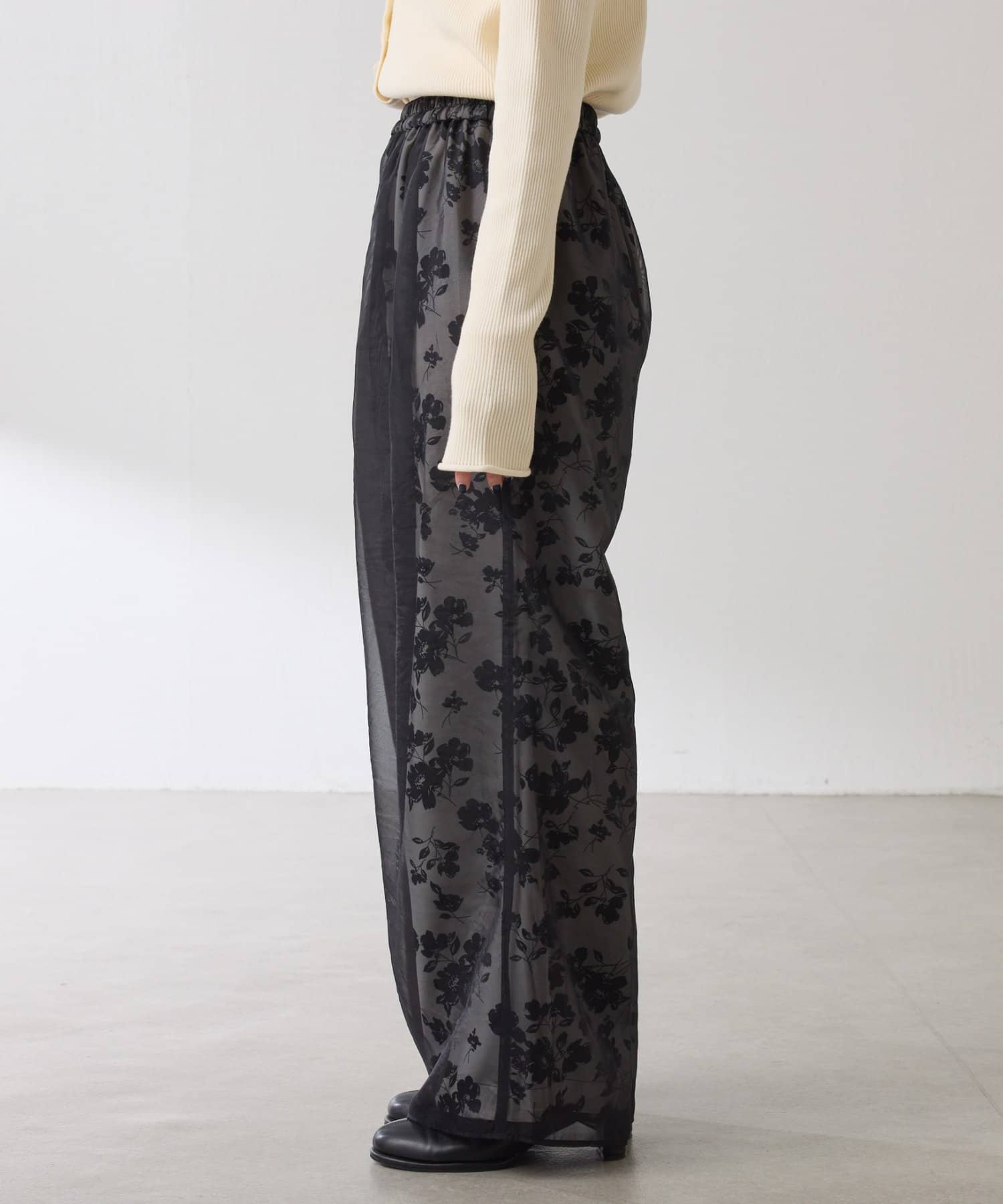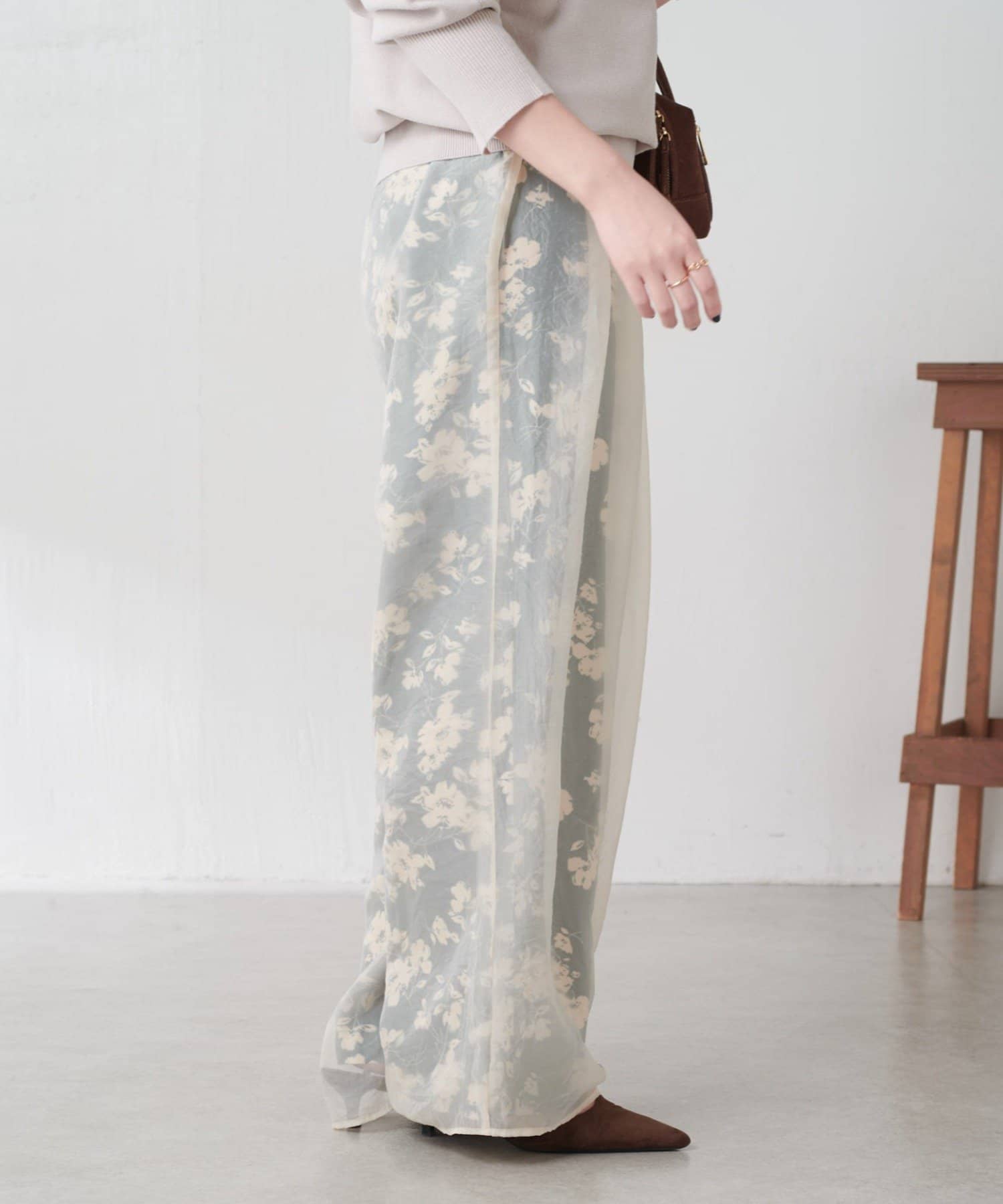 ・花柄の上にシアーをレイヤードした、冬でもシアーを楽しめるセミワイドパンツ。
