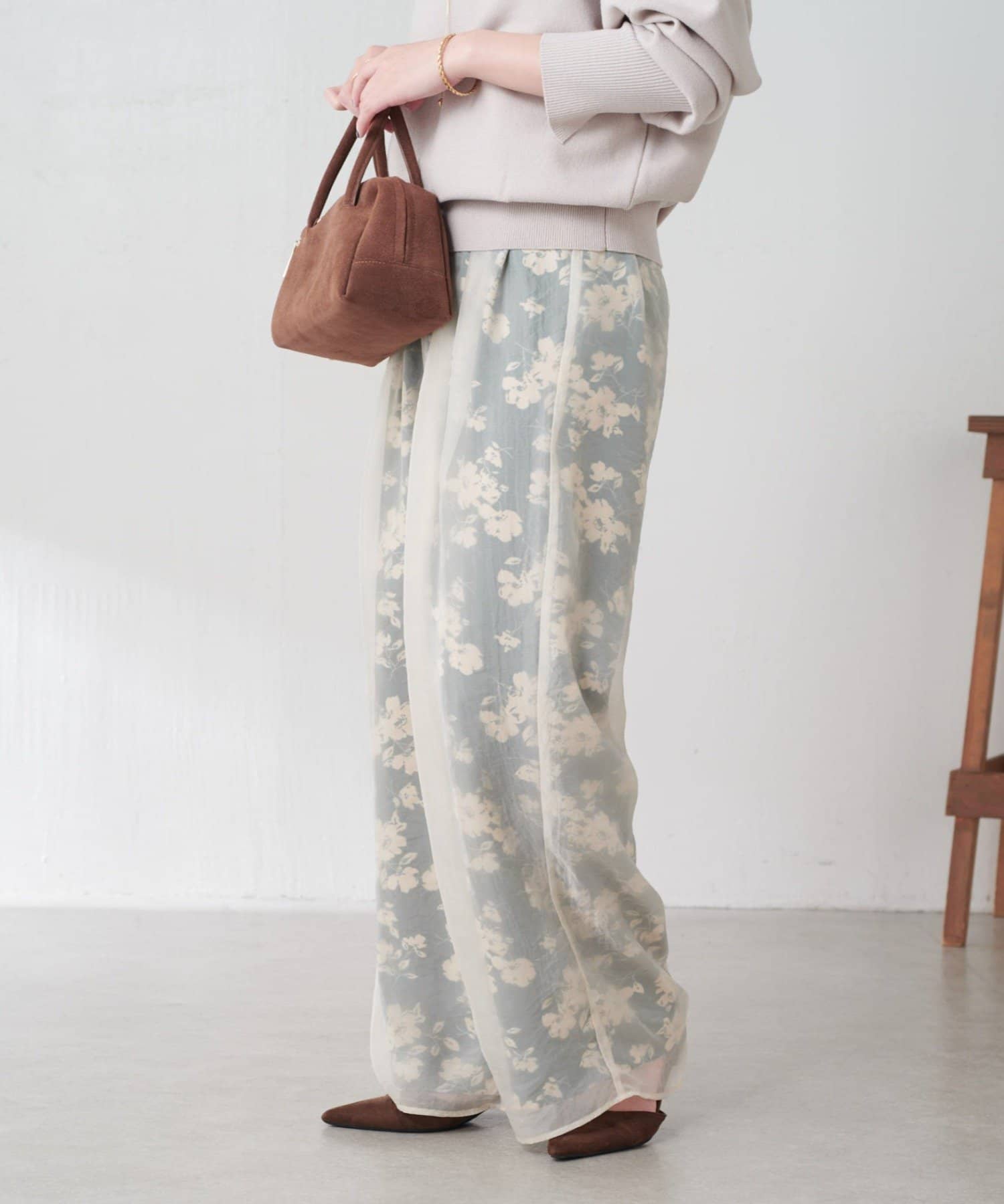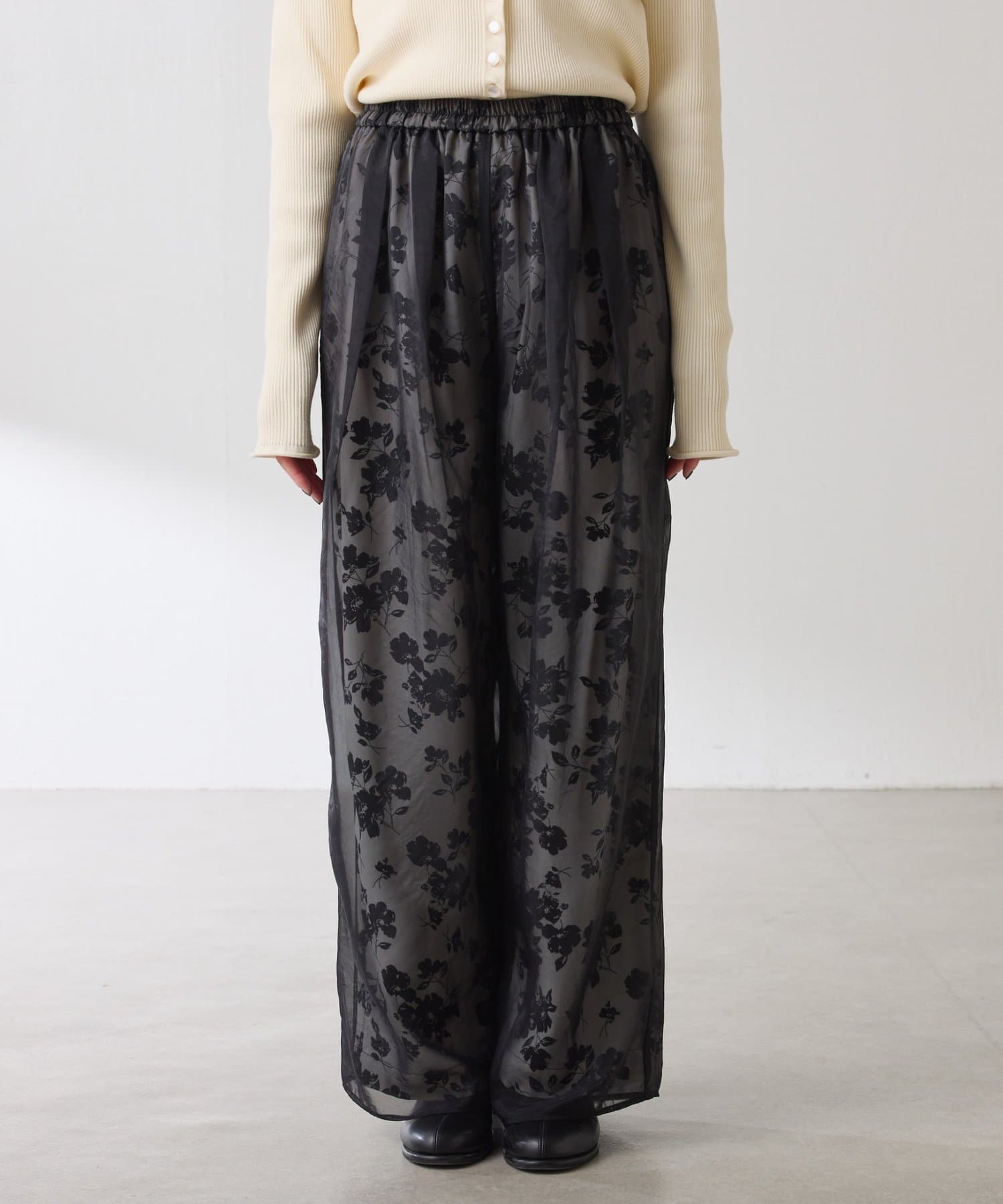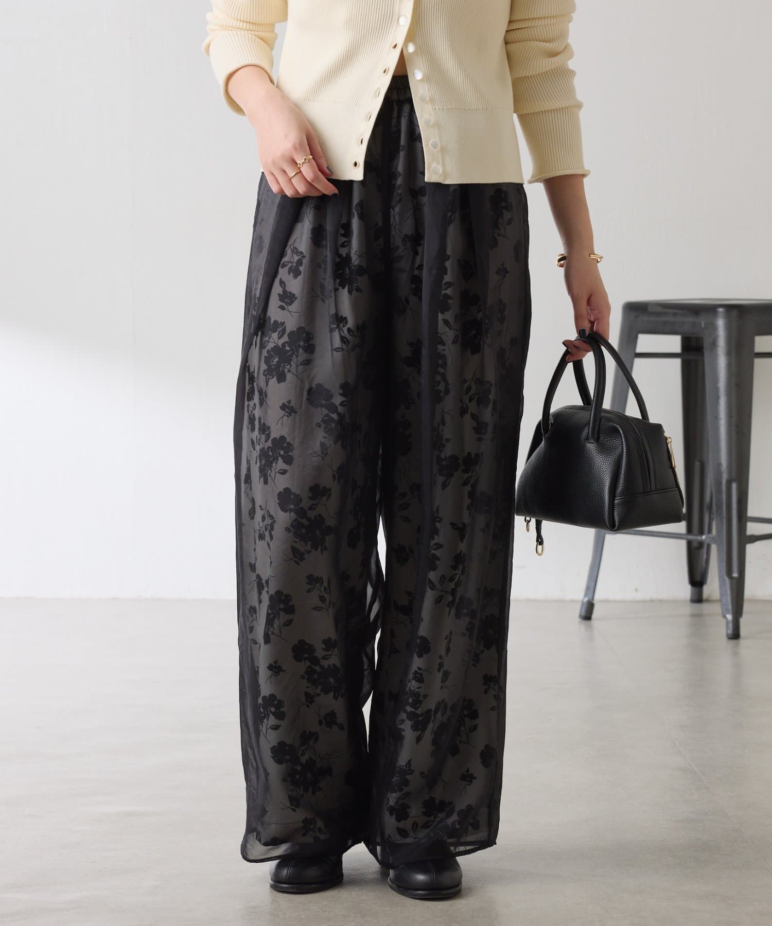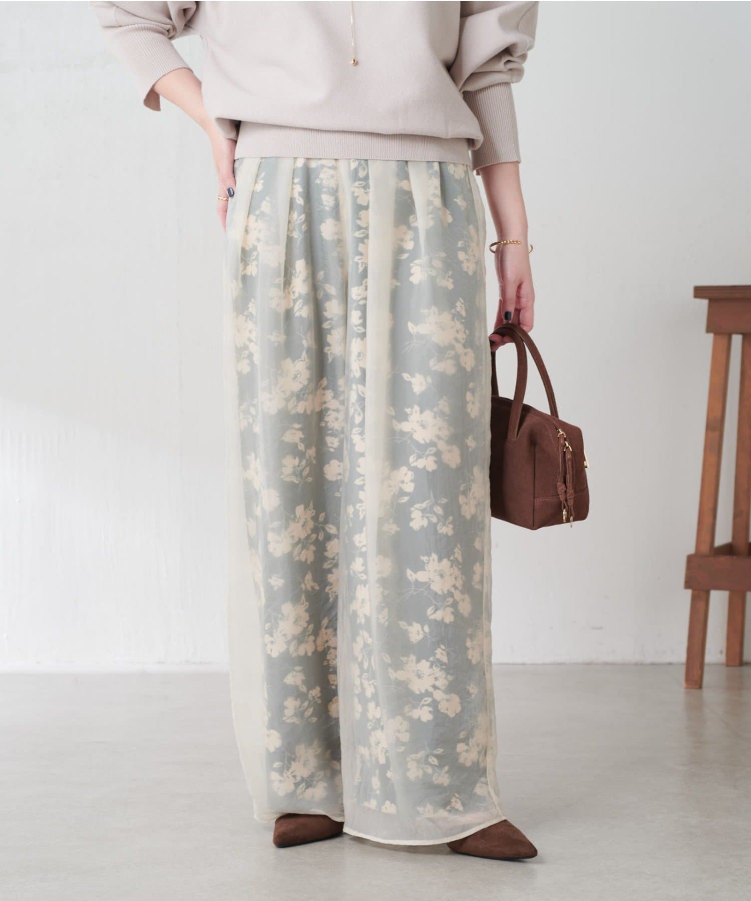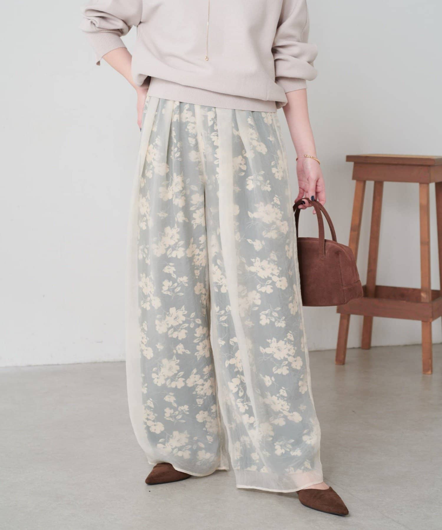 ・花柄の上にシアーをレイヤードした、冬でもシアーを楽しめるセミワイドパンツ。