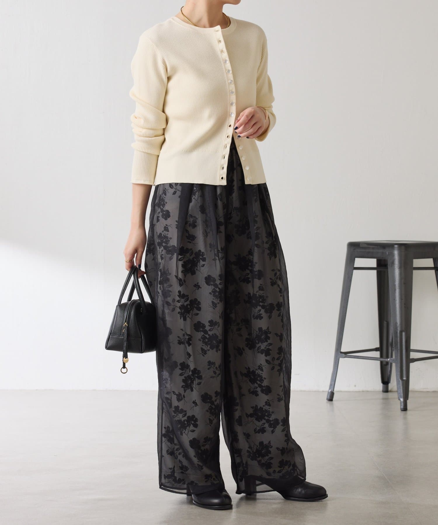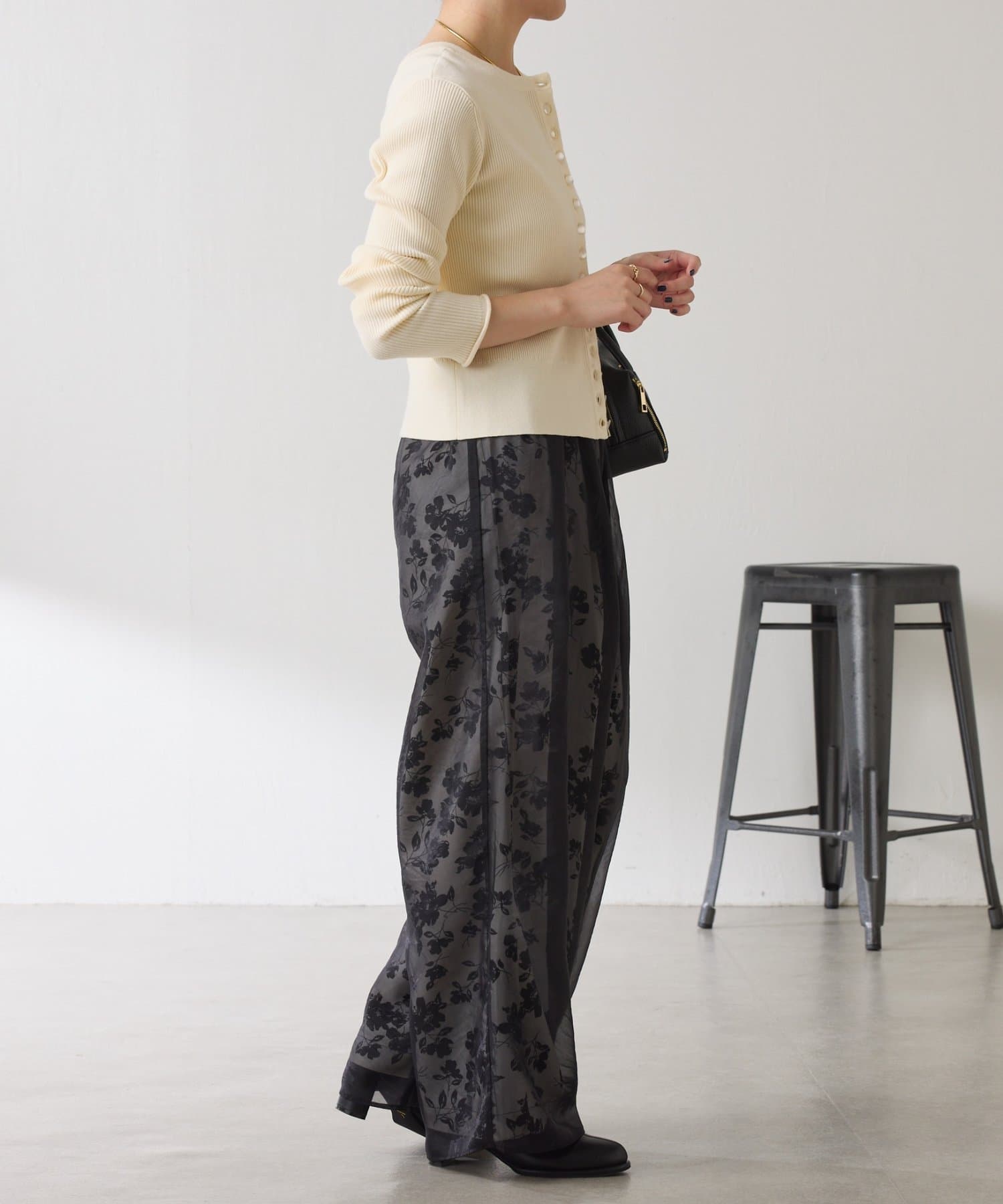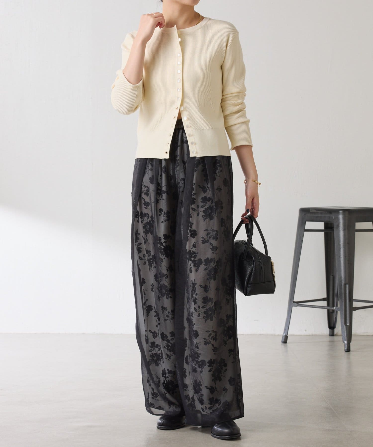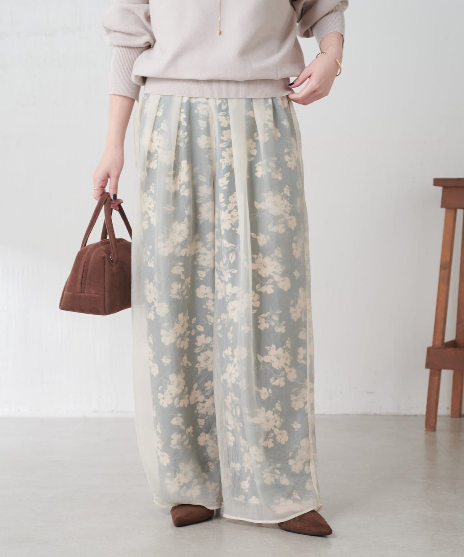 ・花柄の上にシアーをレイヤードした、冬でもシアーを楽しめるセミワイドパンツ。