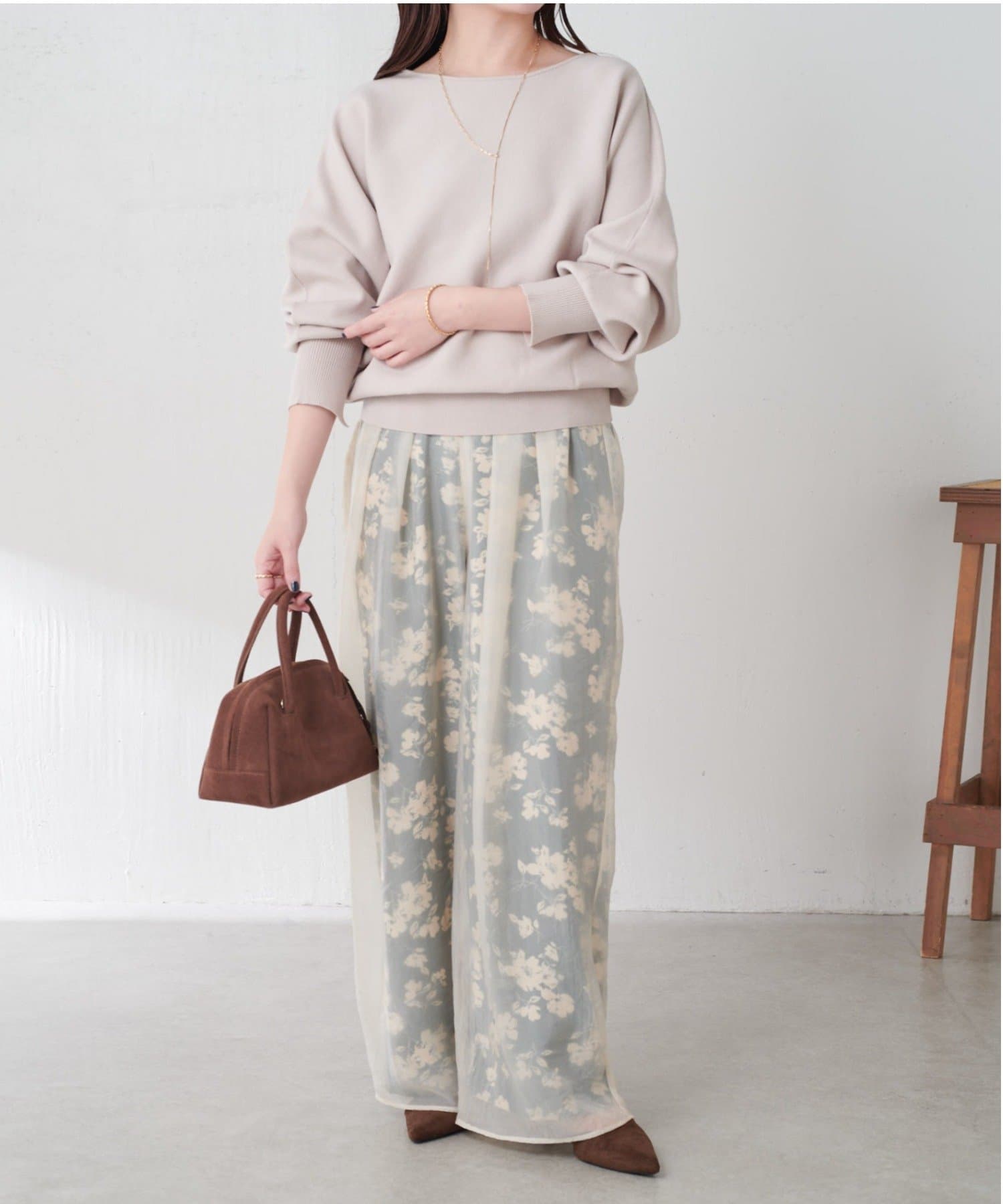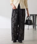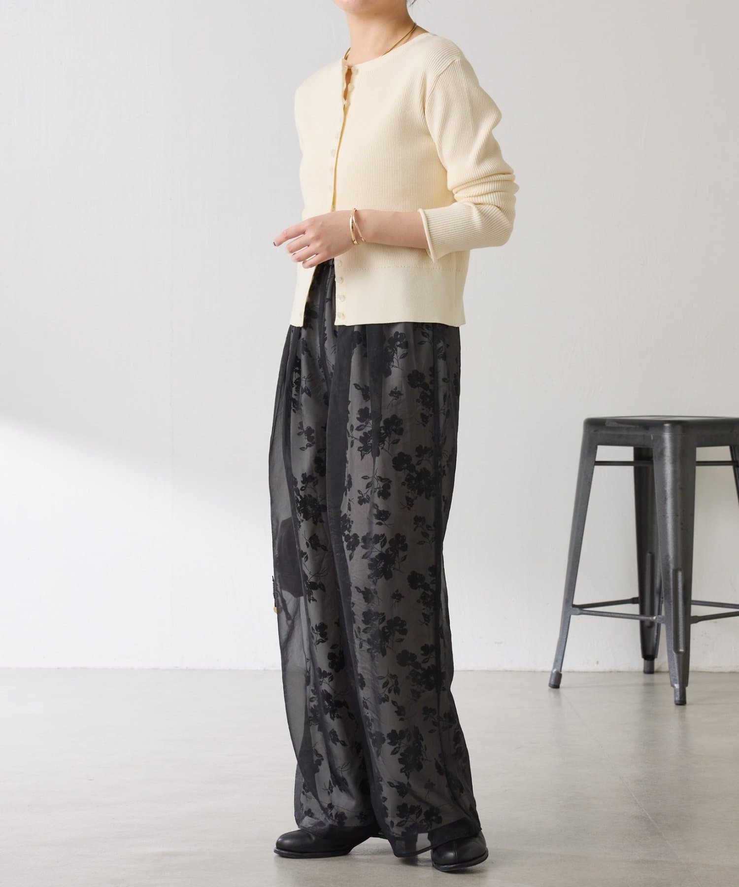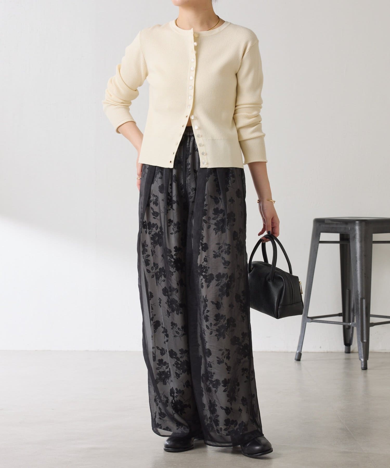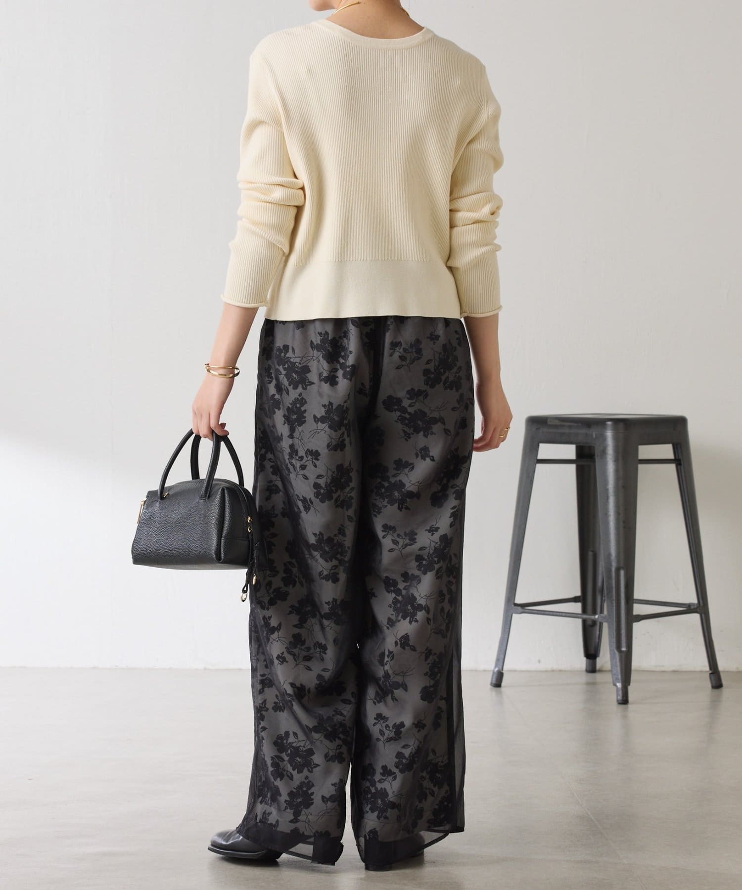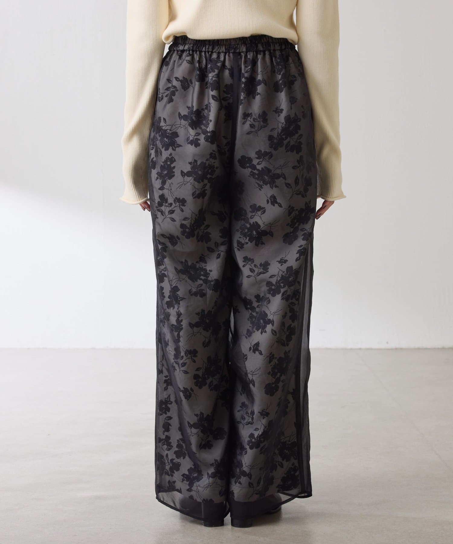 ・花柄の上にシアーをレイヤードした、冬でもシアーを楽しめるセミワイドパンツ。