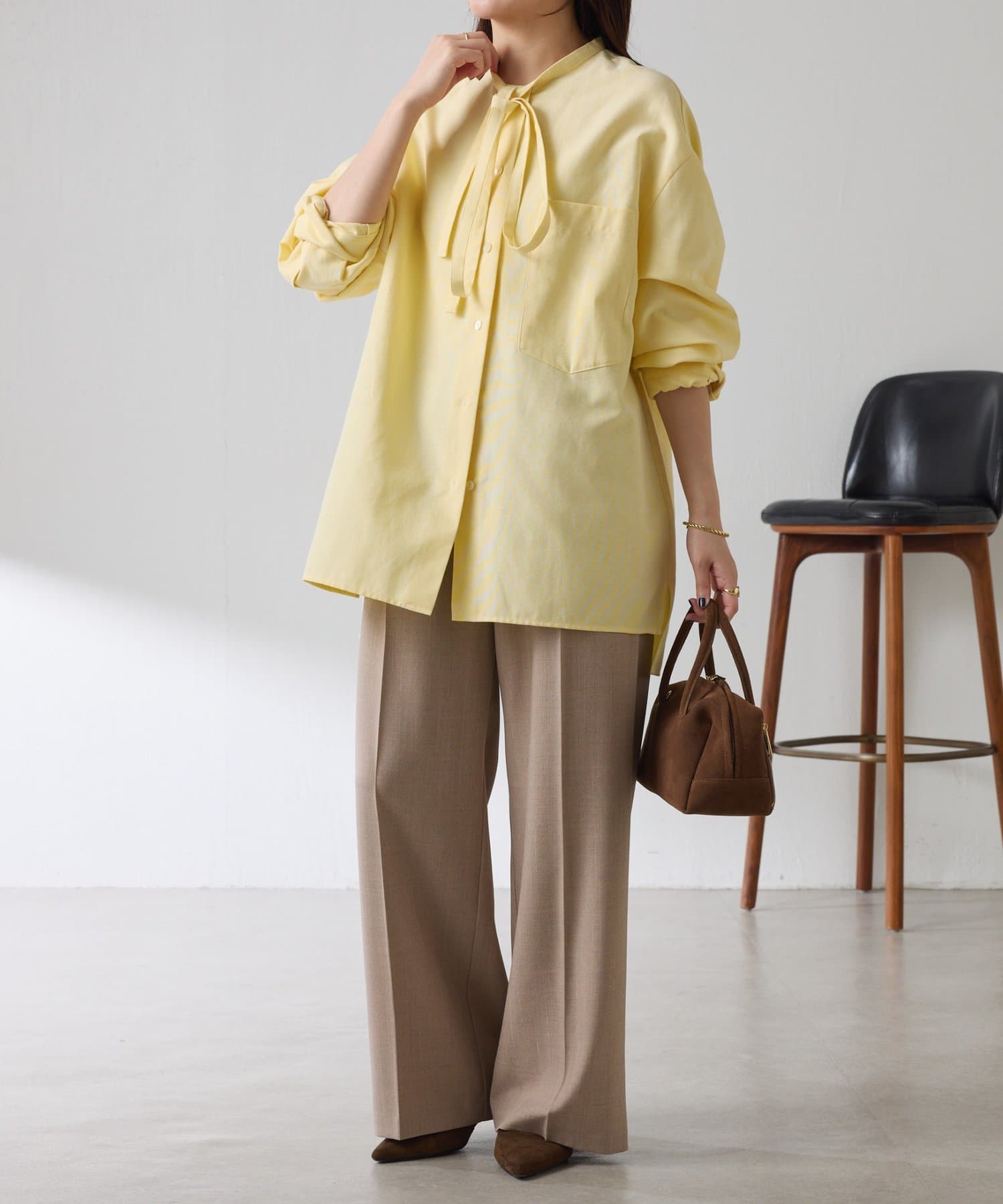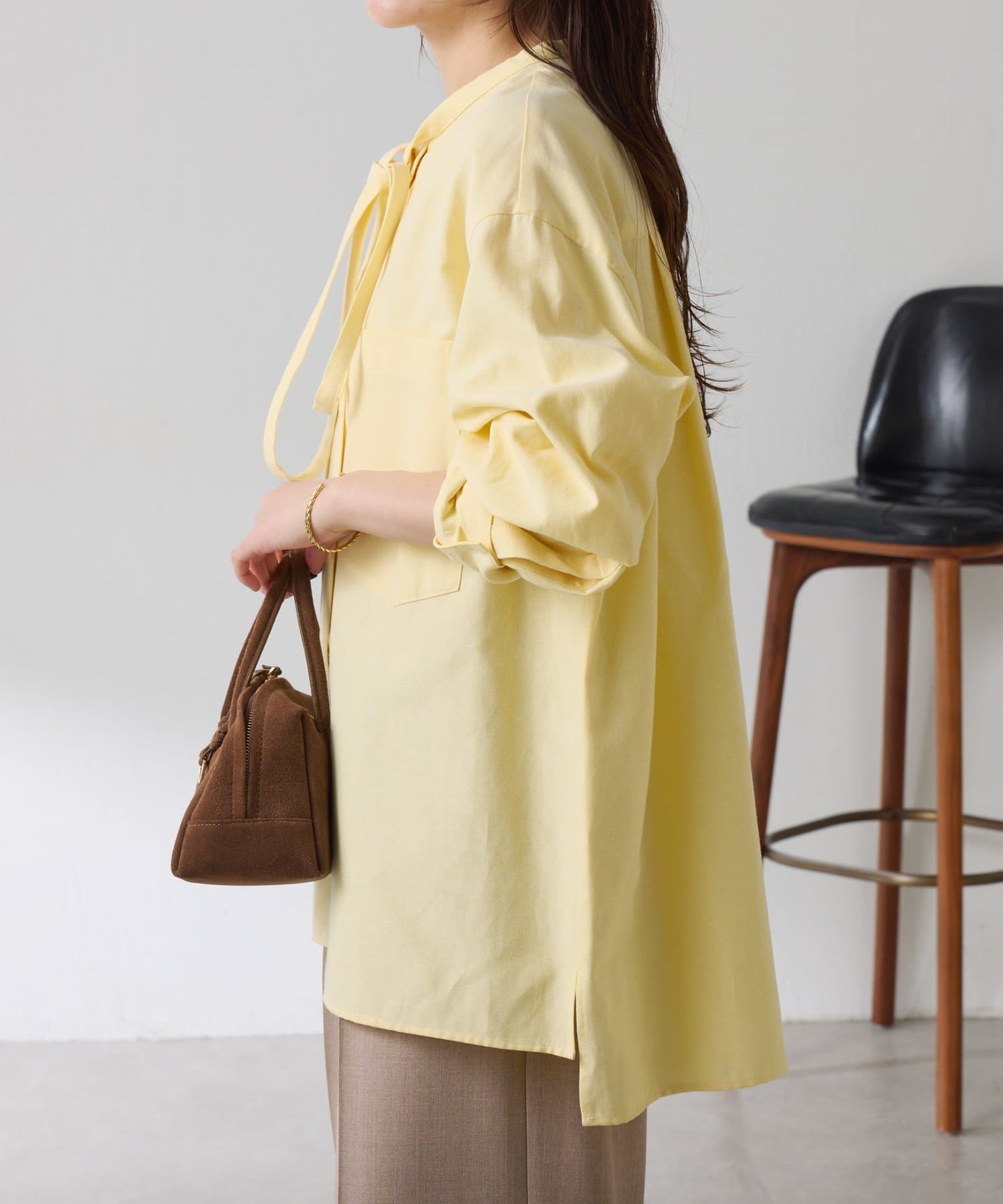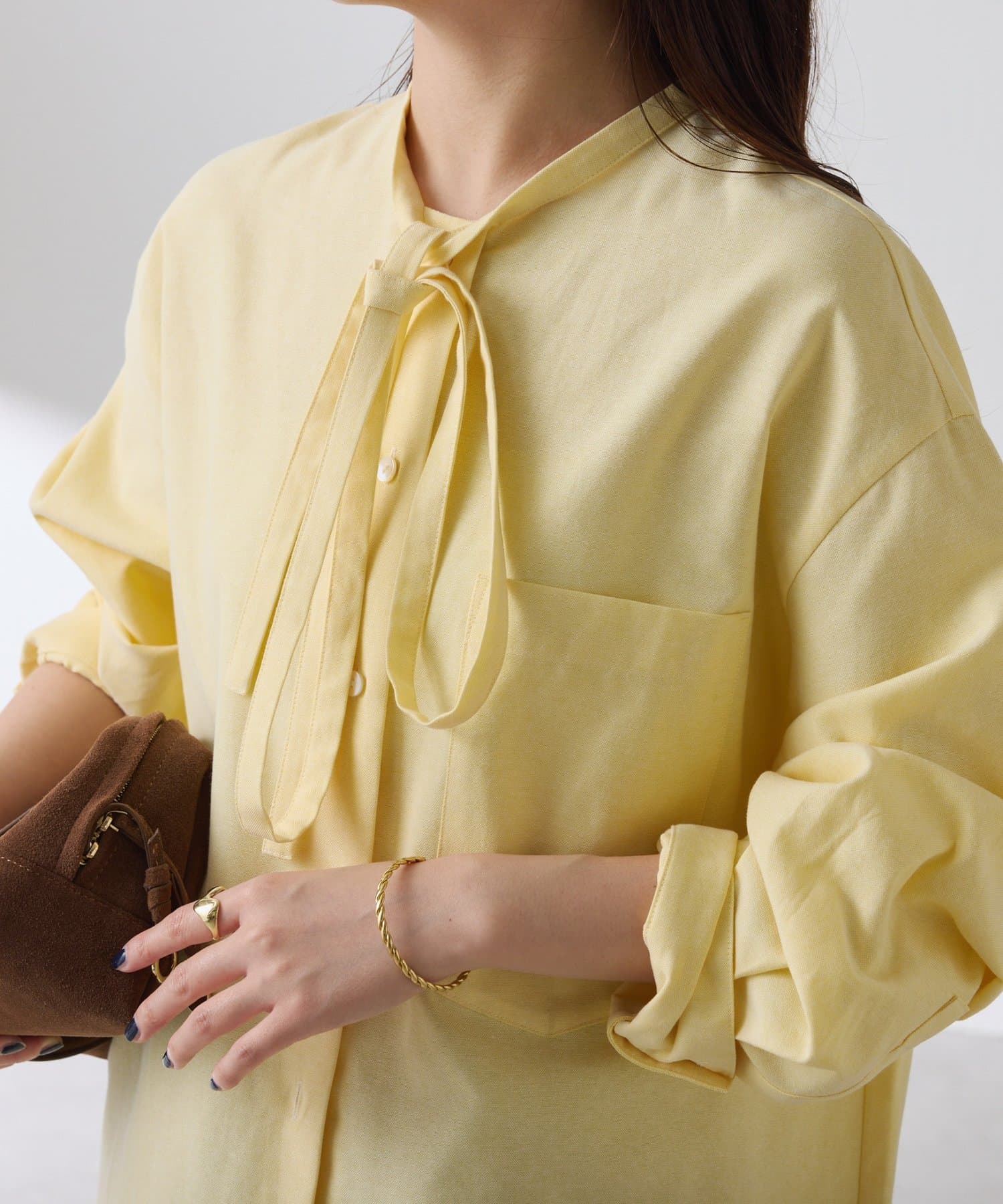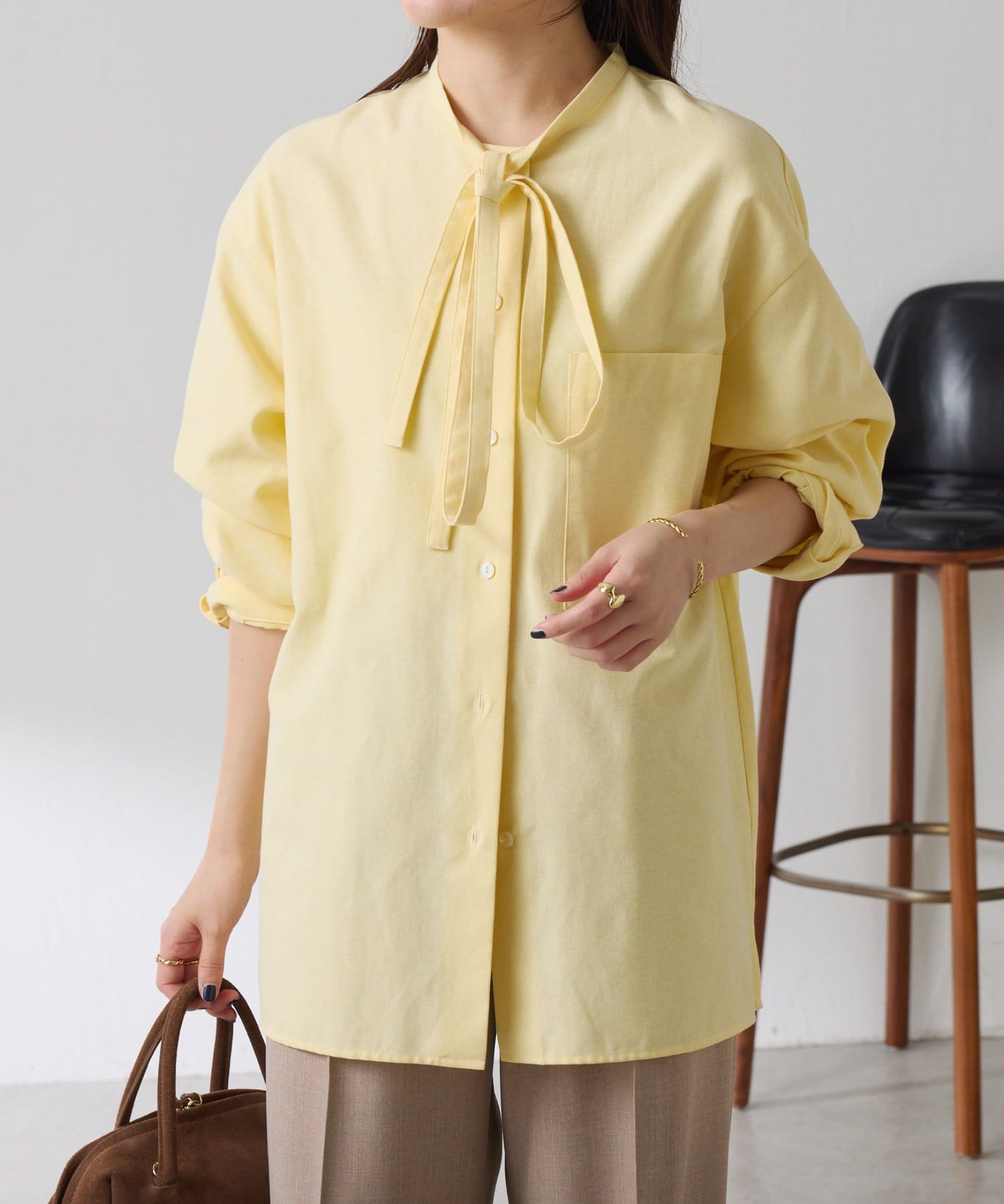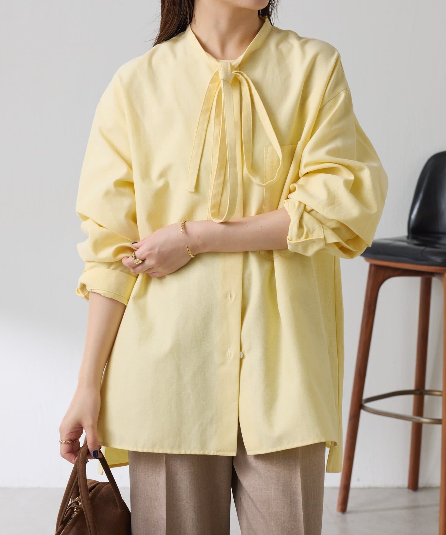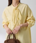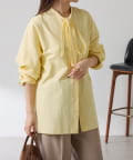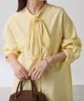 リラックス感のあるシルエットが魅力のボウタイ付きシャツ