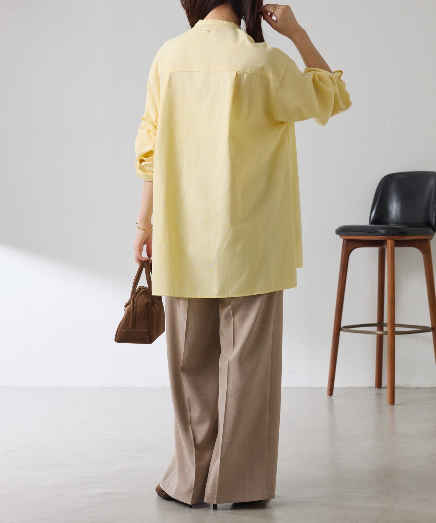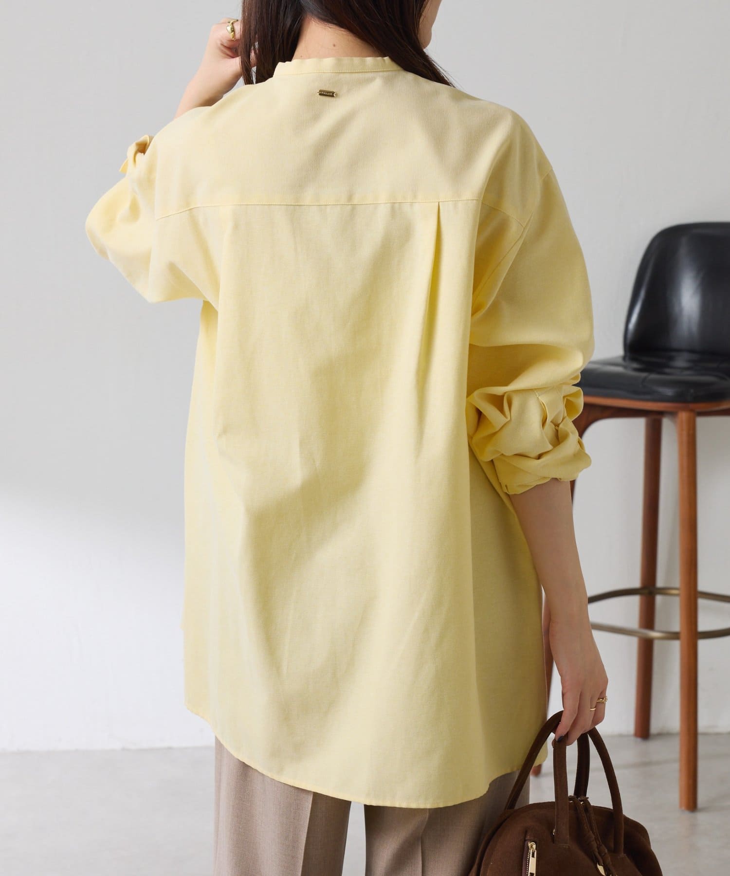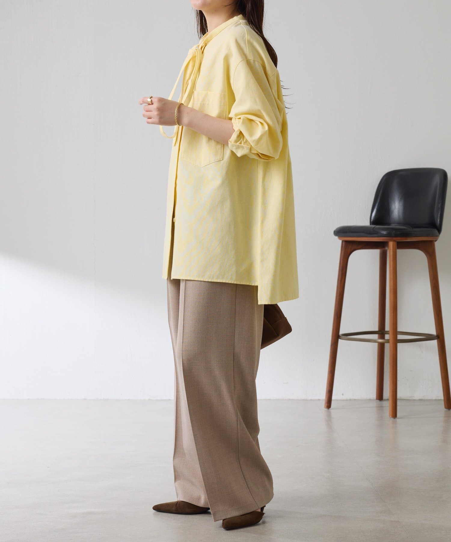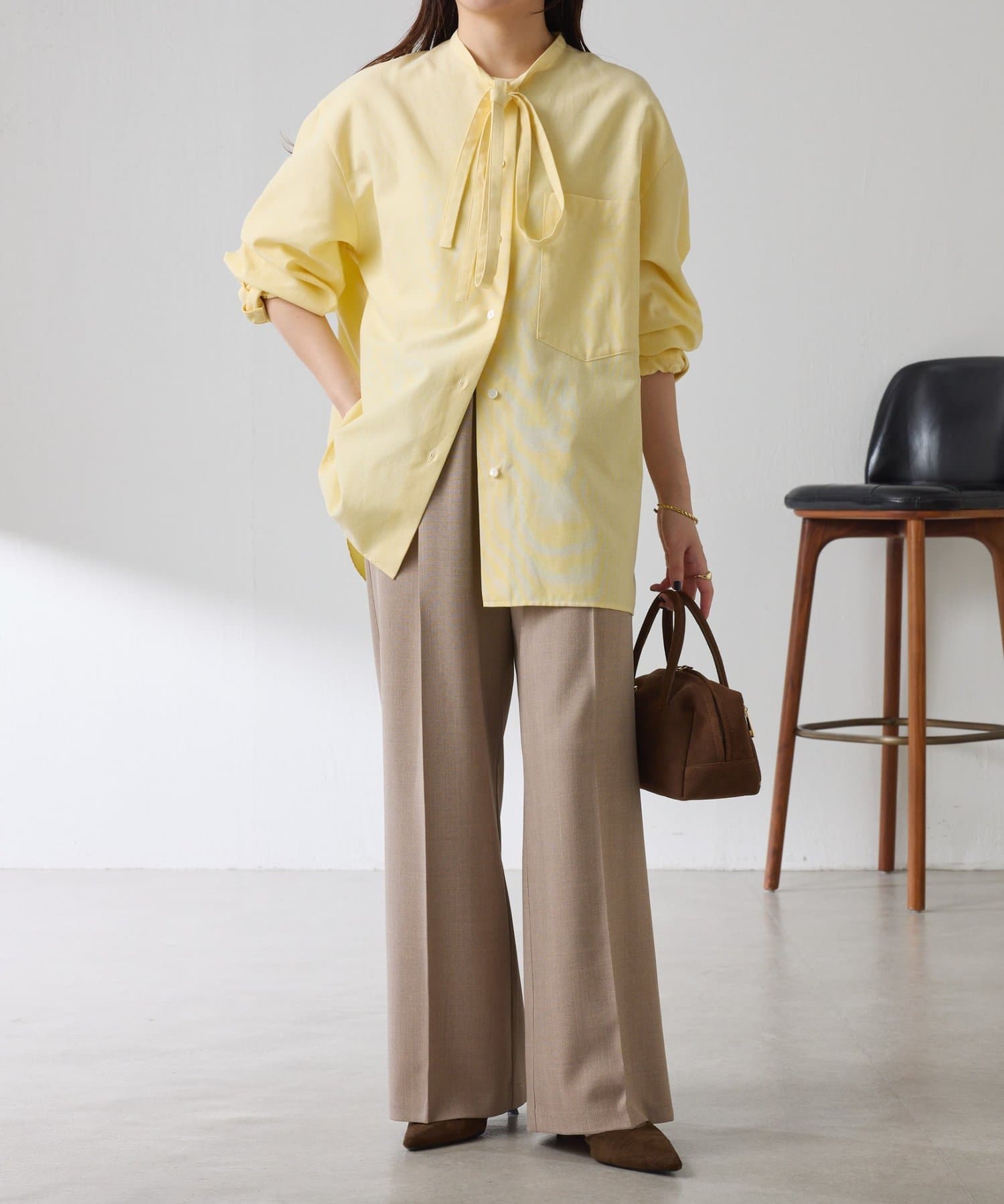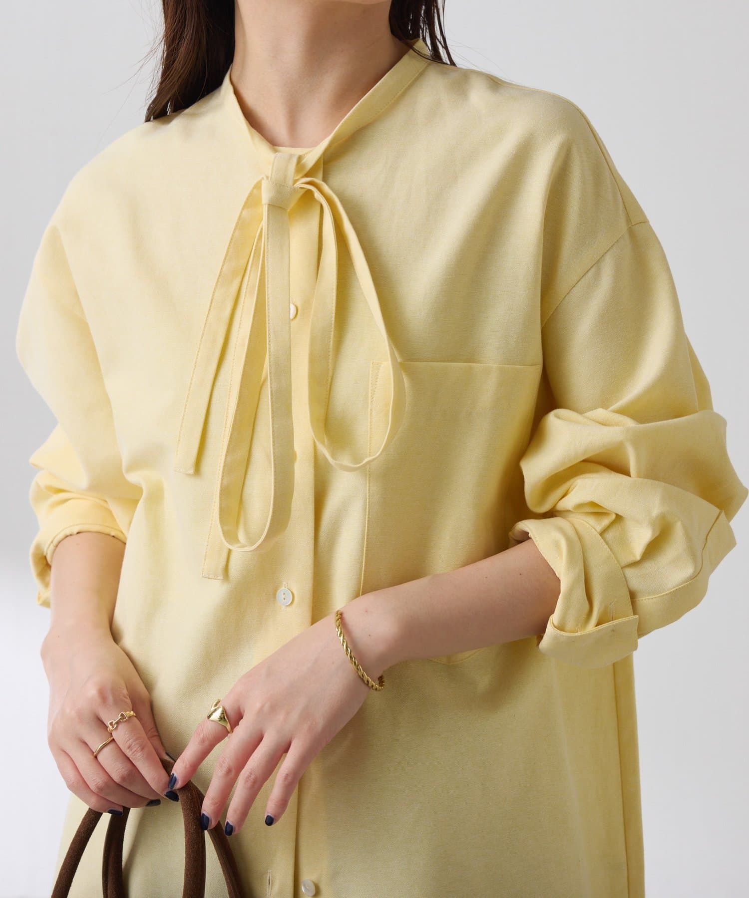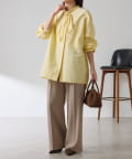 リラックス感のあるシルエットが魅力のボウタイ付きシャツ