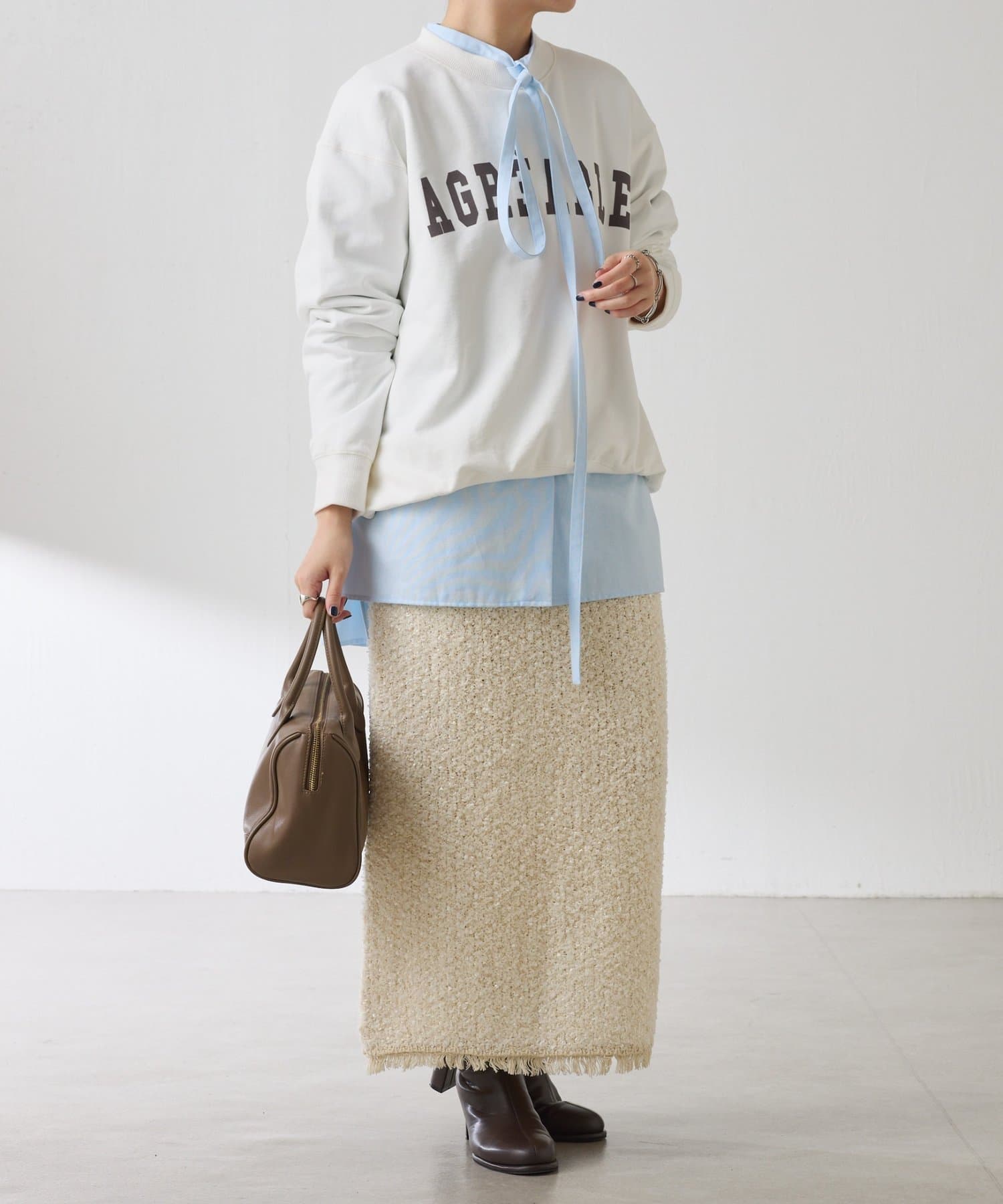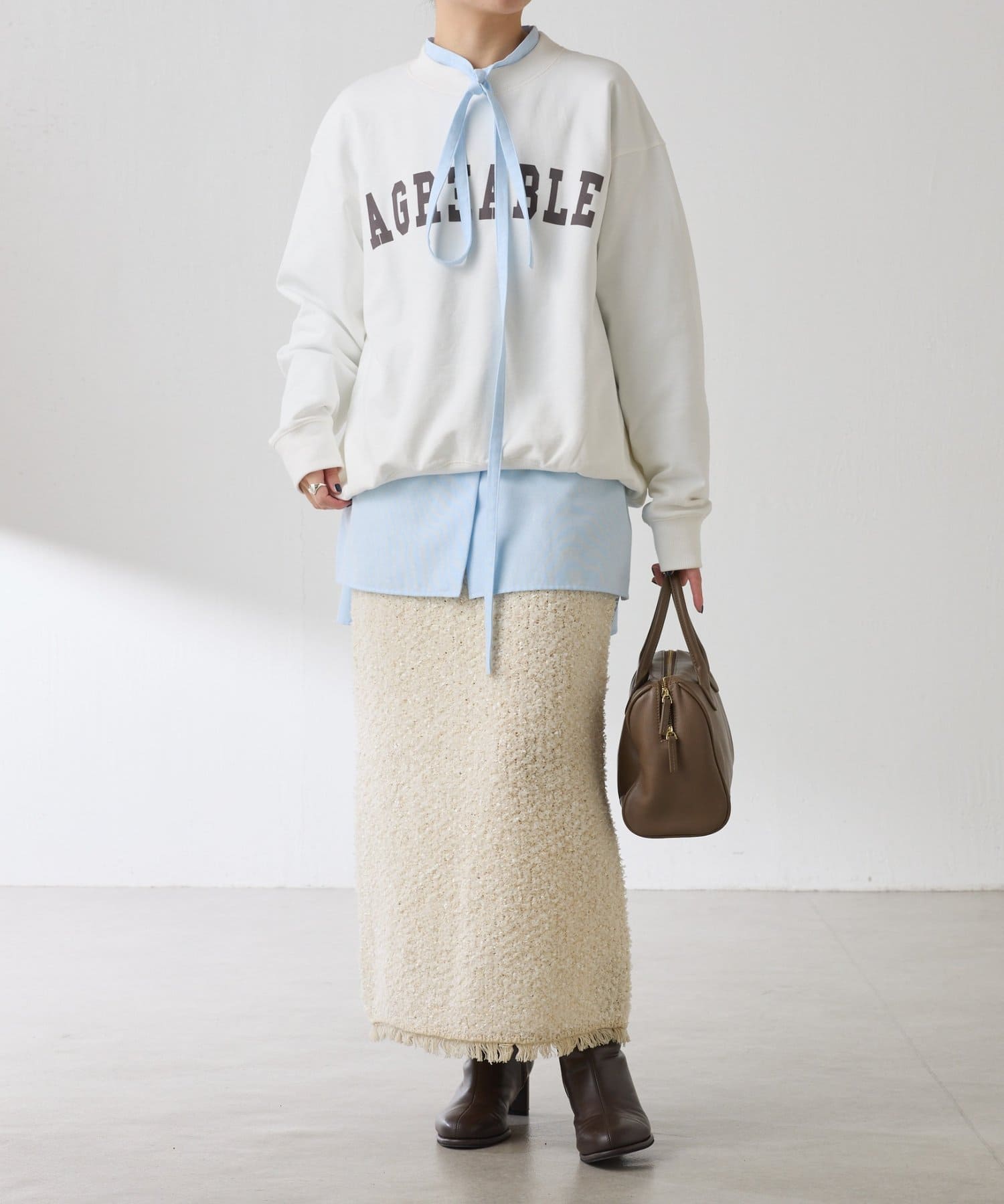 丈も長いのでベストやスウェットと合わせて裾やリボンをチラ見せしてレイヤードするのがおすすめです。
