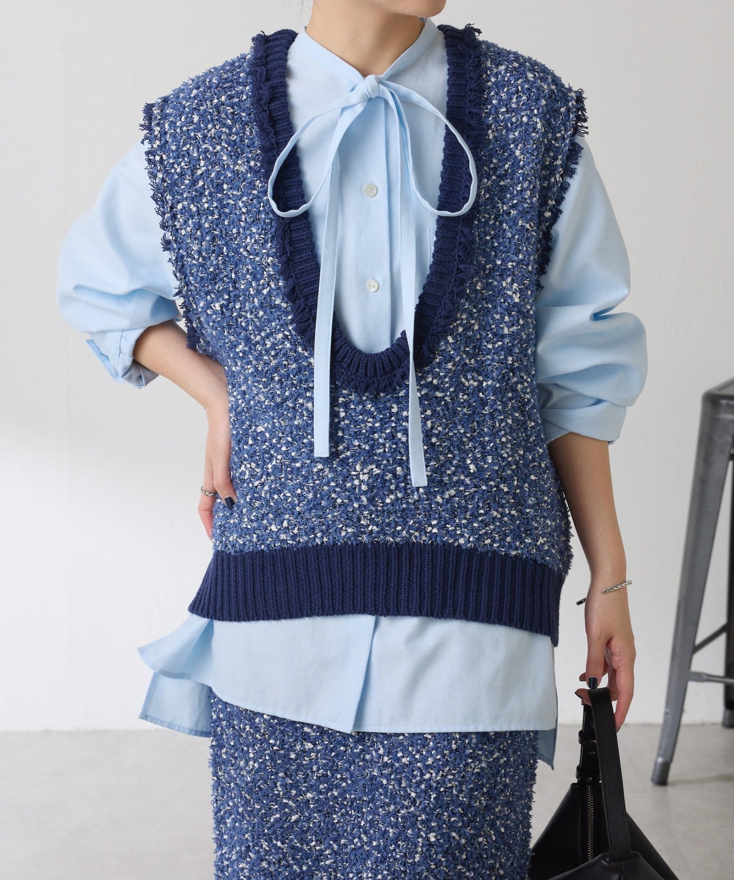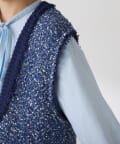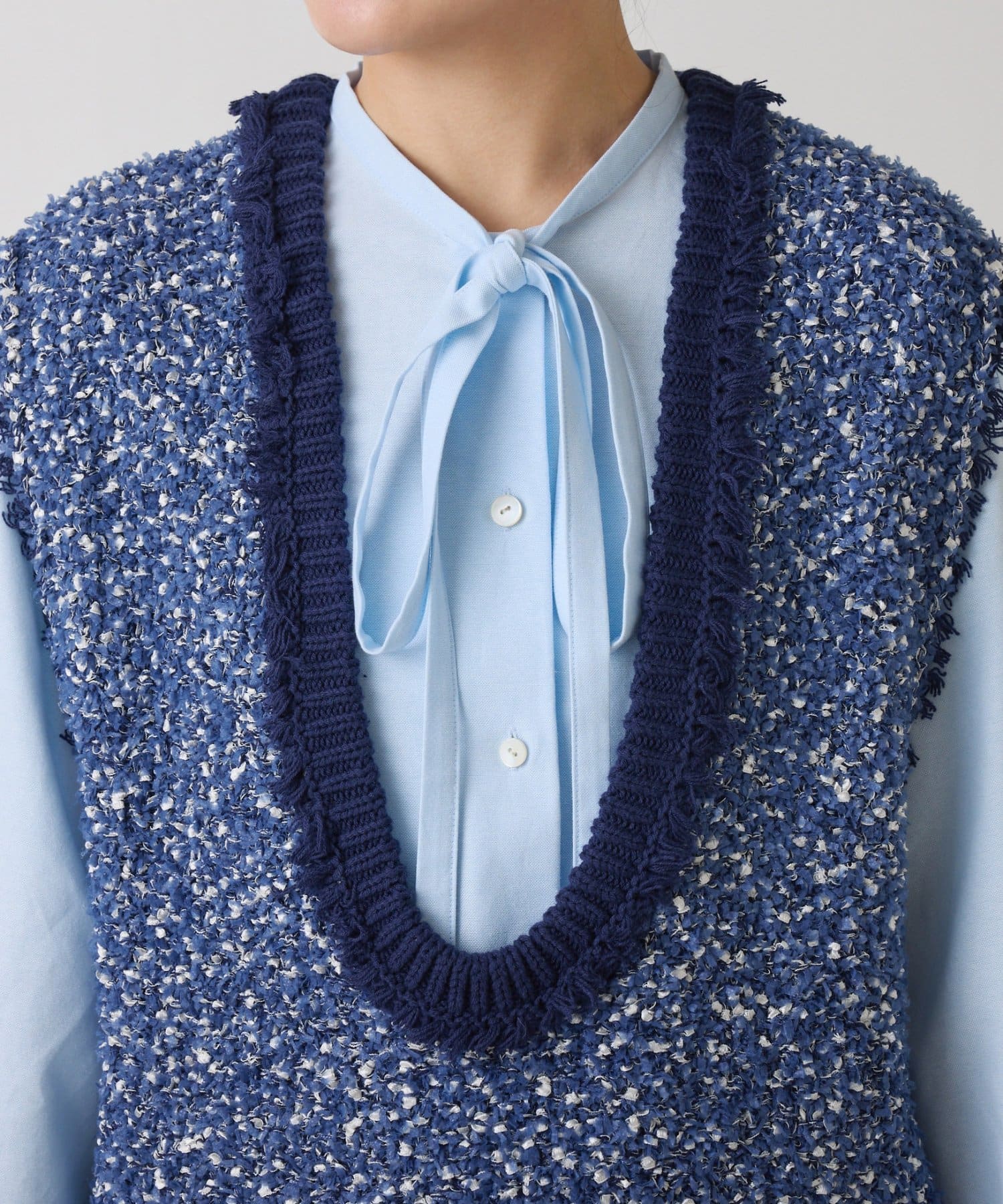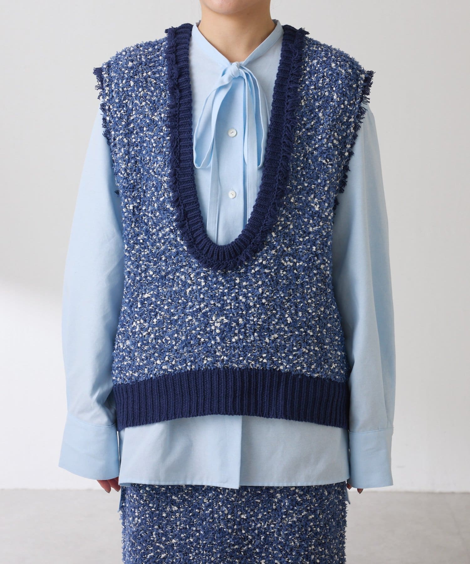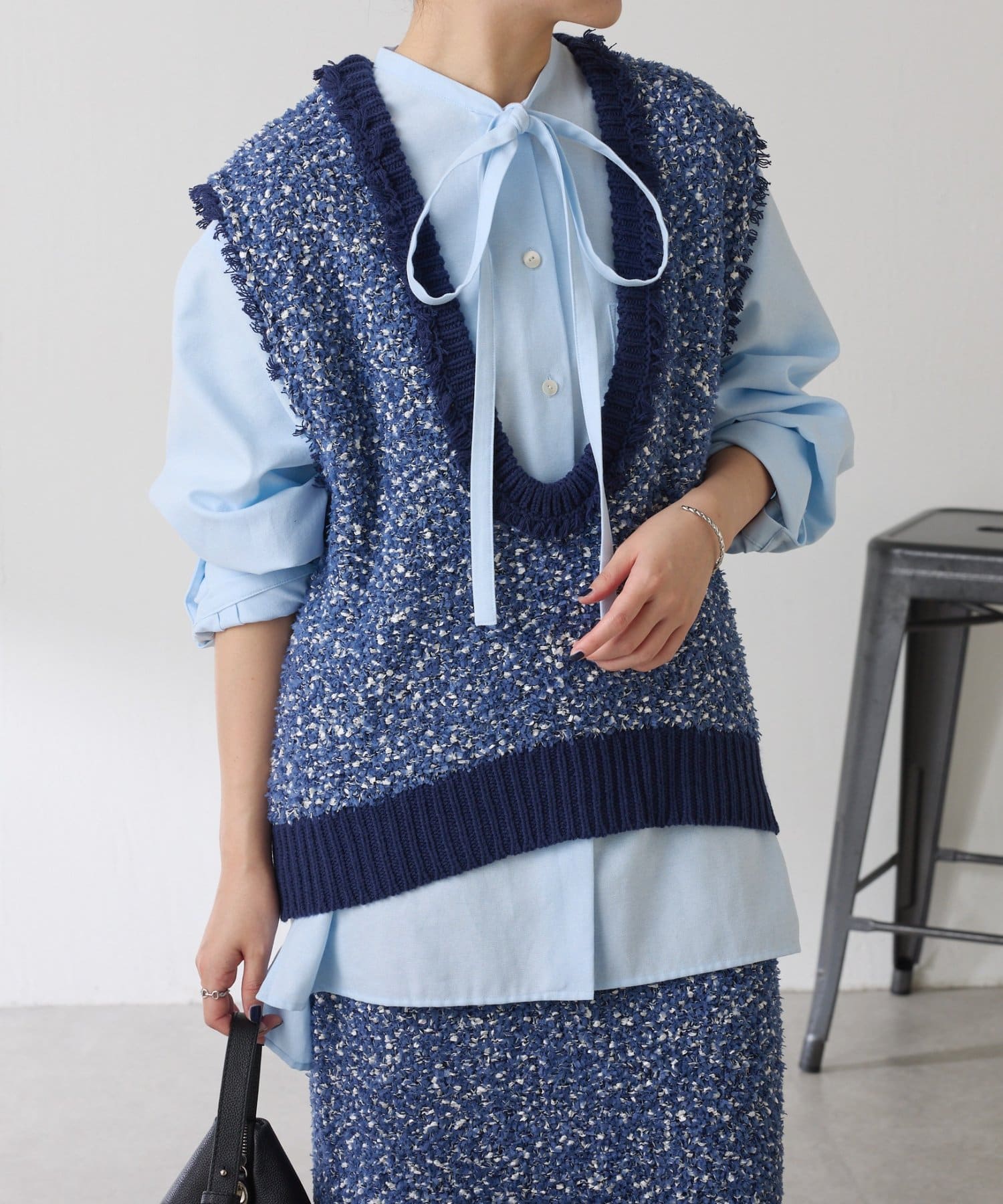・3種類の糸で凹凸感と色のミックス感を表現したツイード見えする深Uニットベスト。