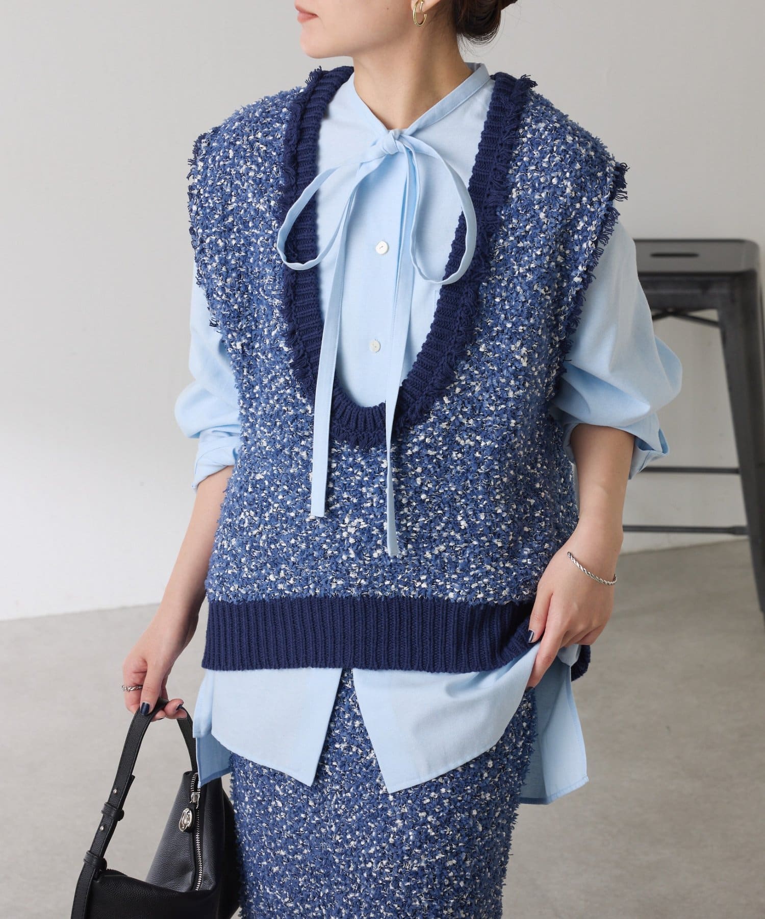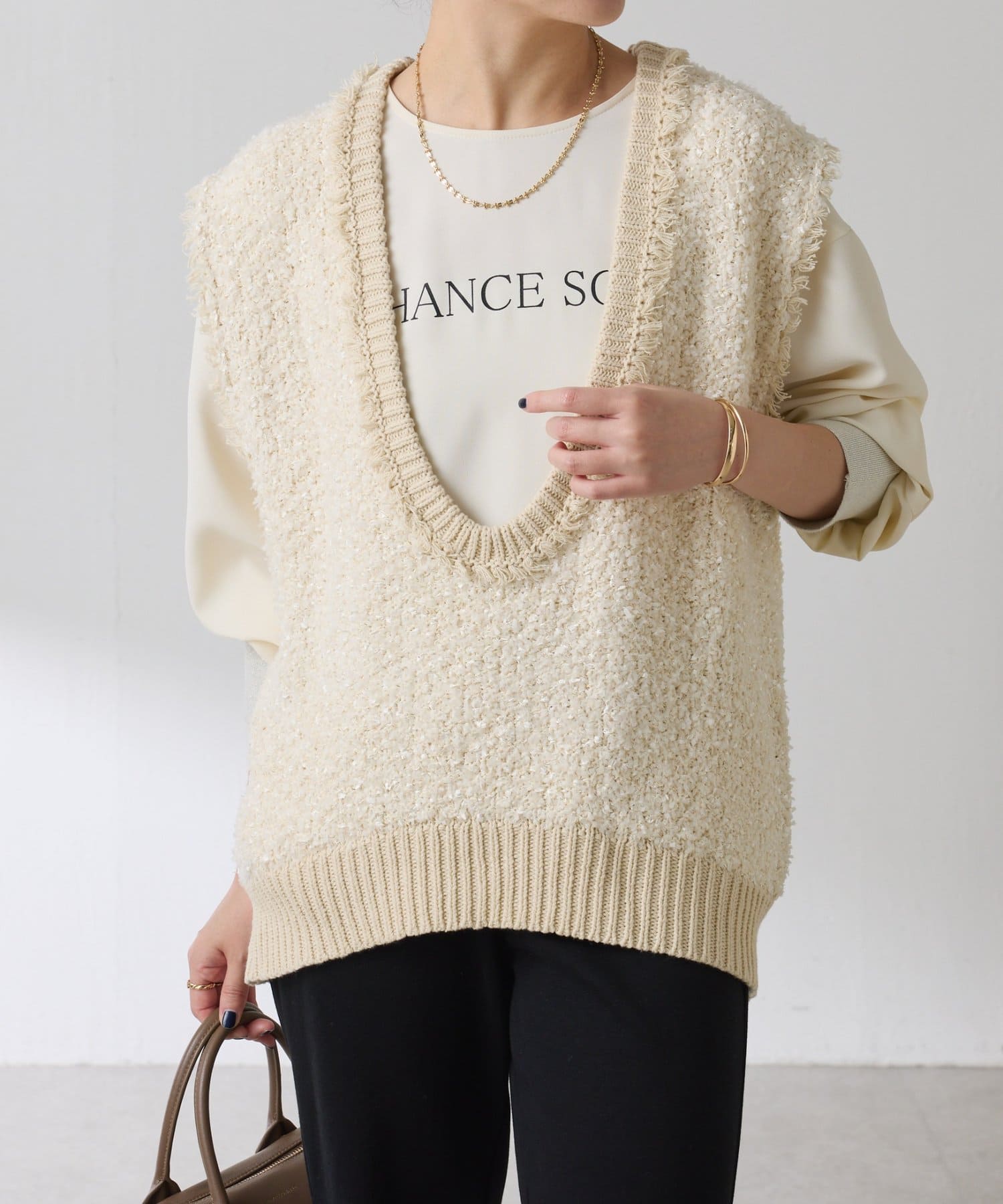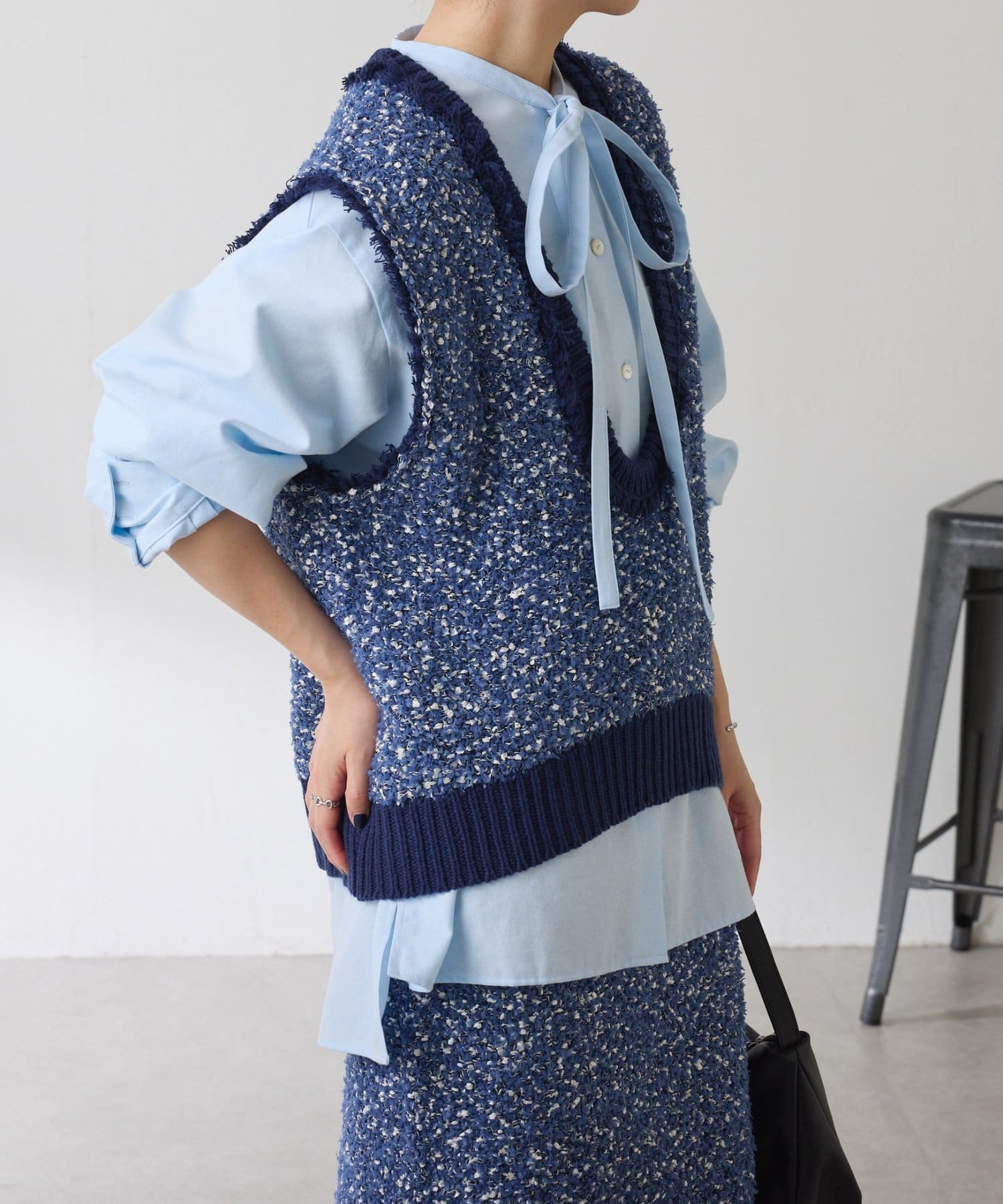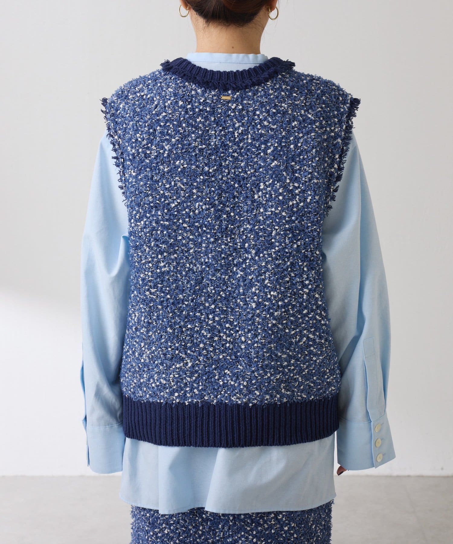 ・3種類の糸で凹凸感と色のミックス感を表現したツイード見えする深Uニットベスト。