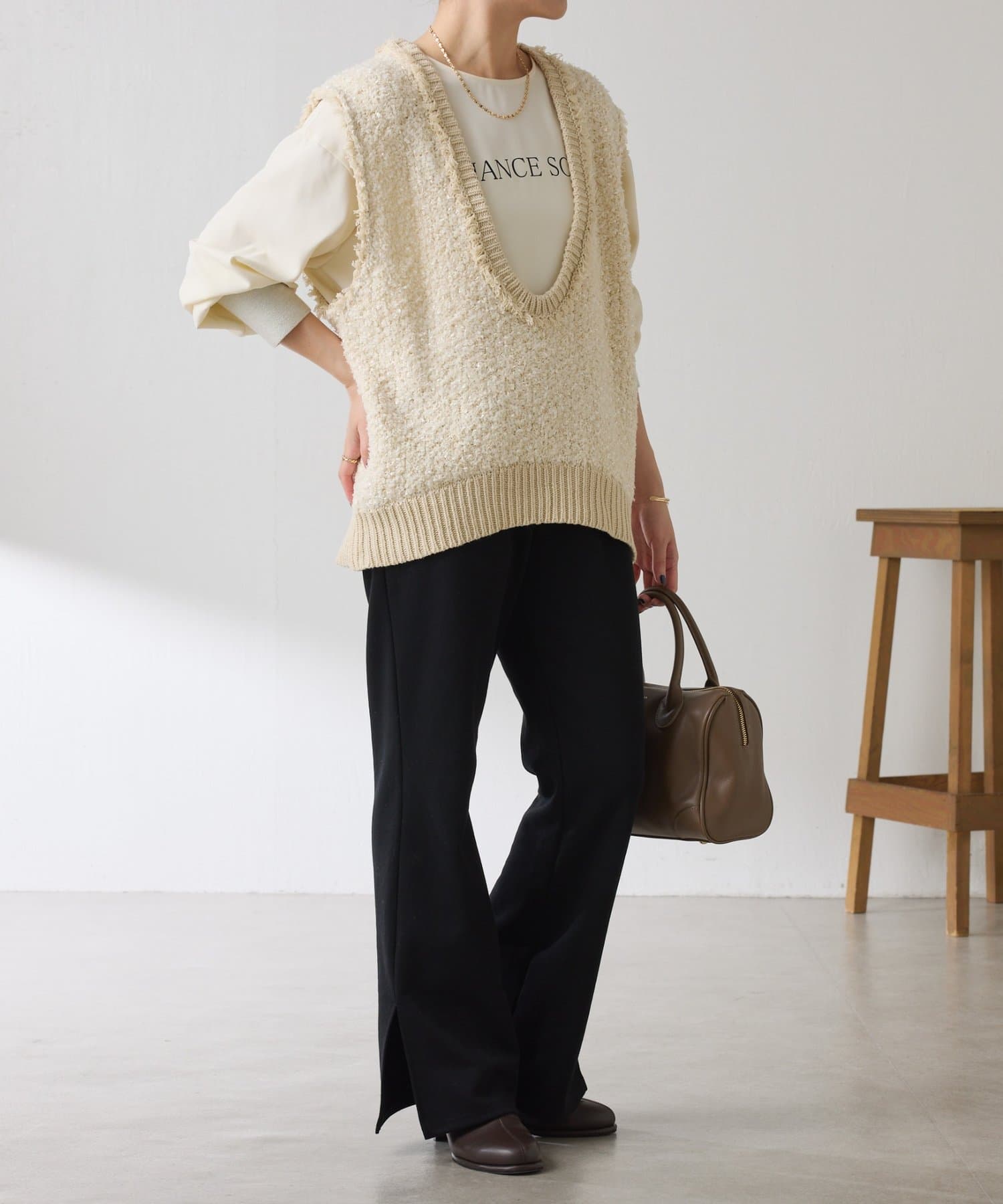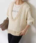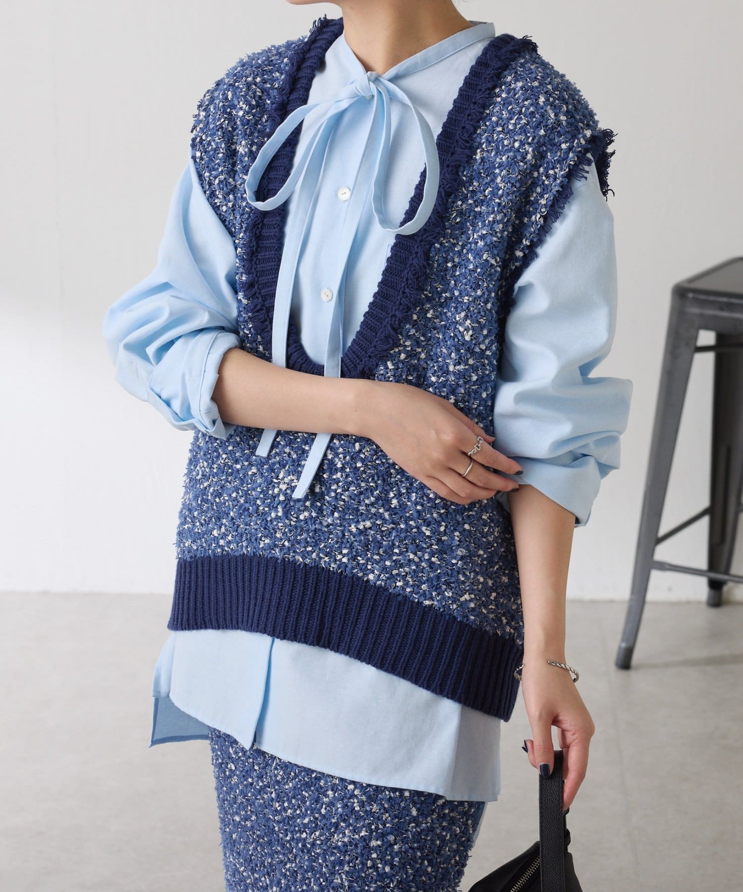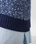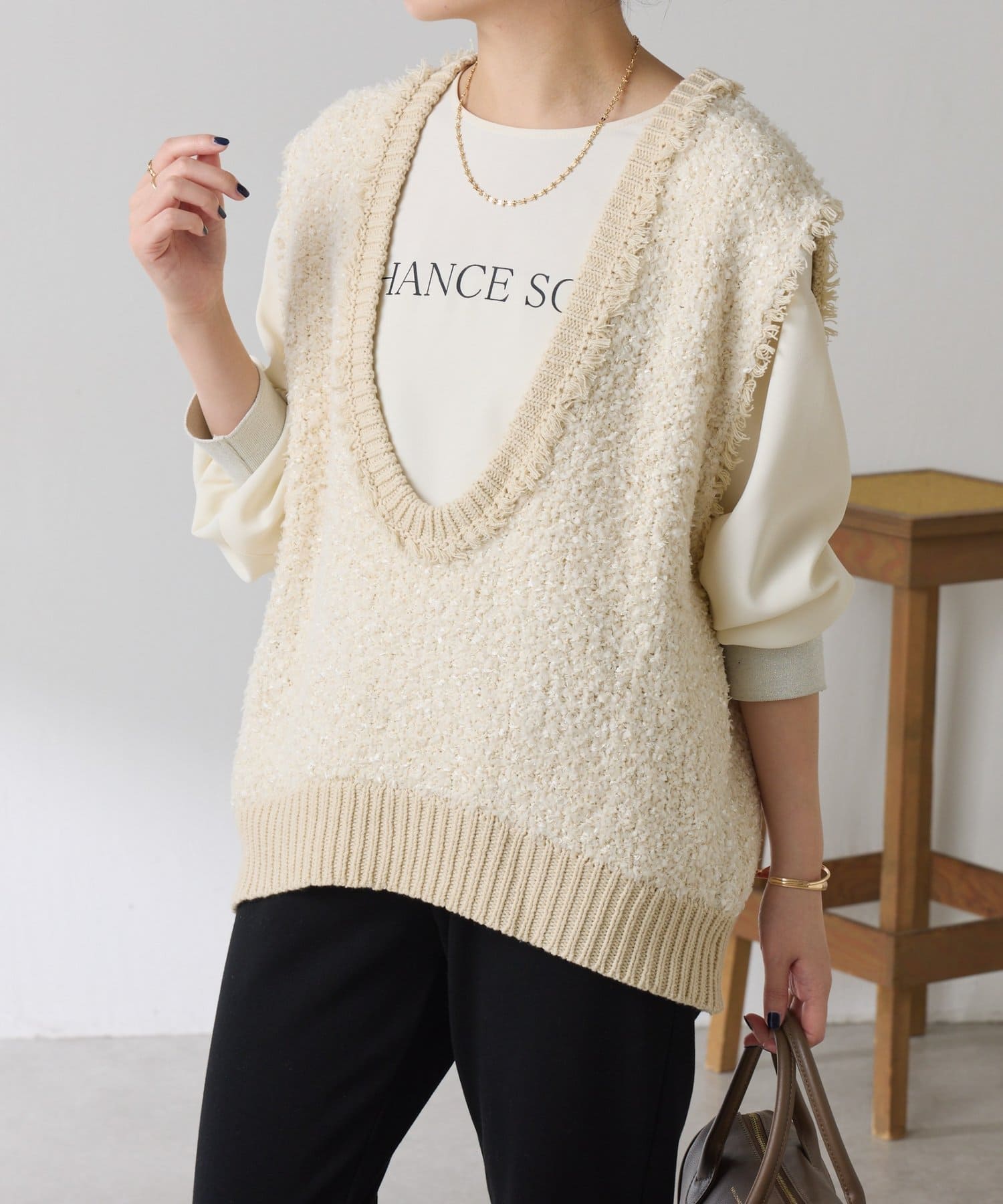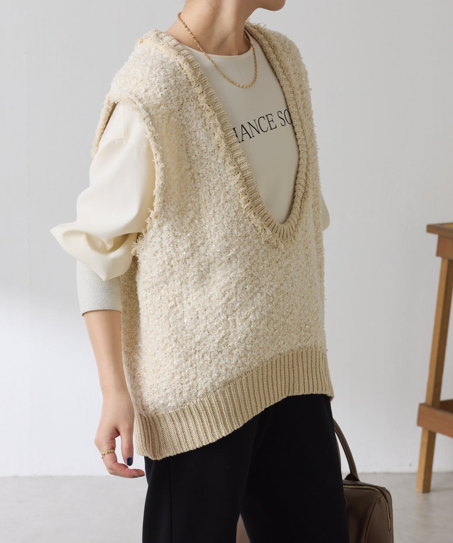 ・3種類の糸で凹凸感と色のミックス感を表現したツイード見えする深Uニットベスト。