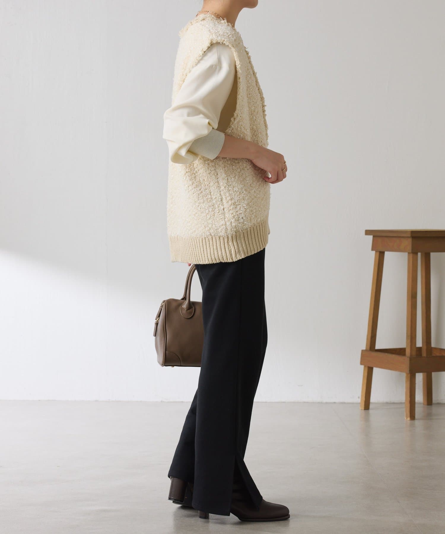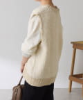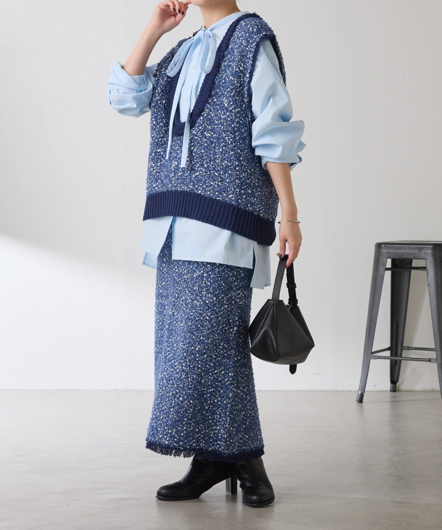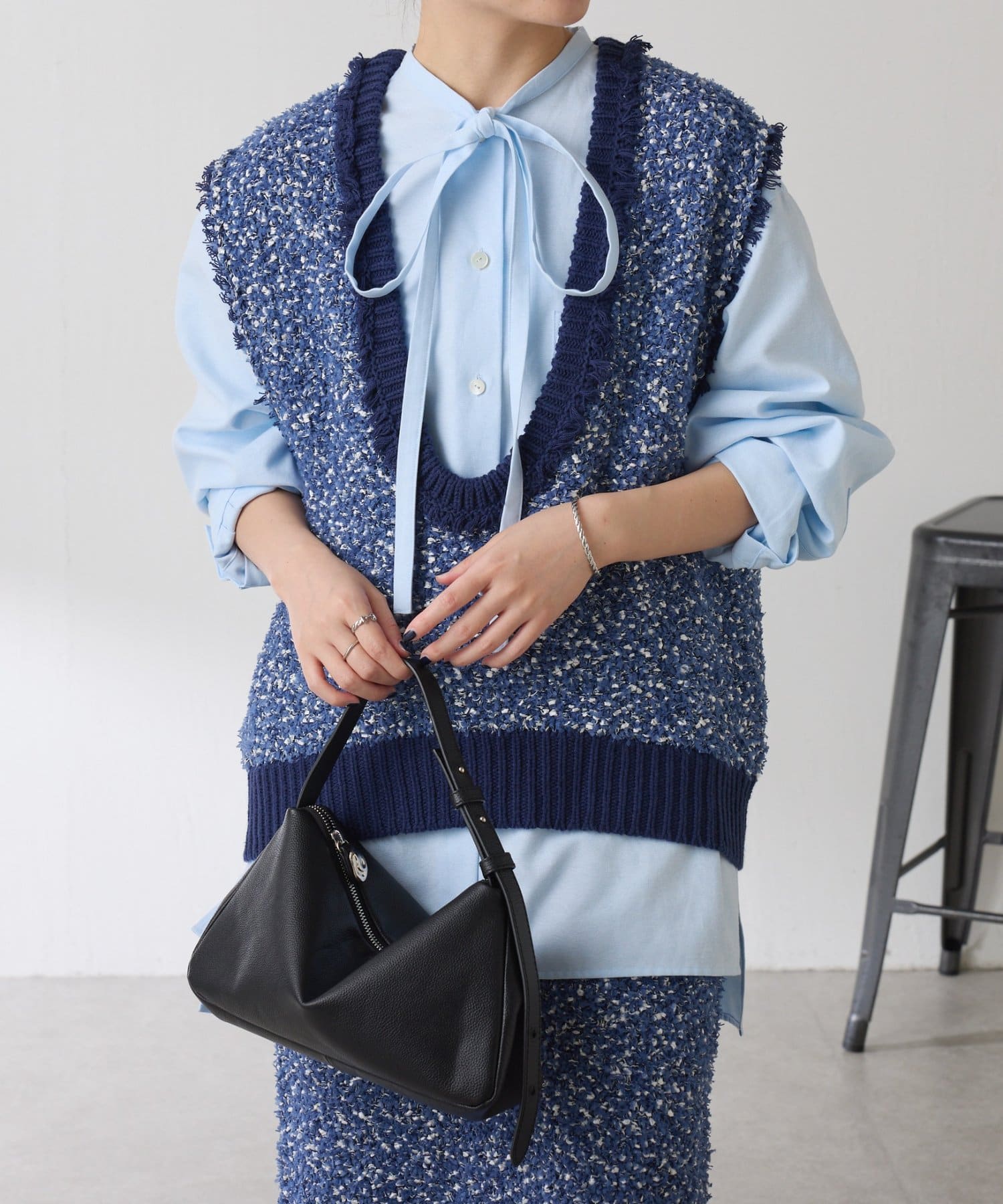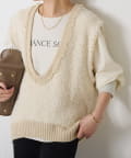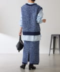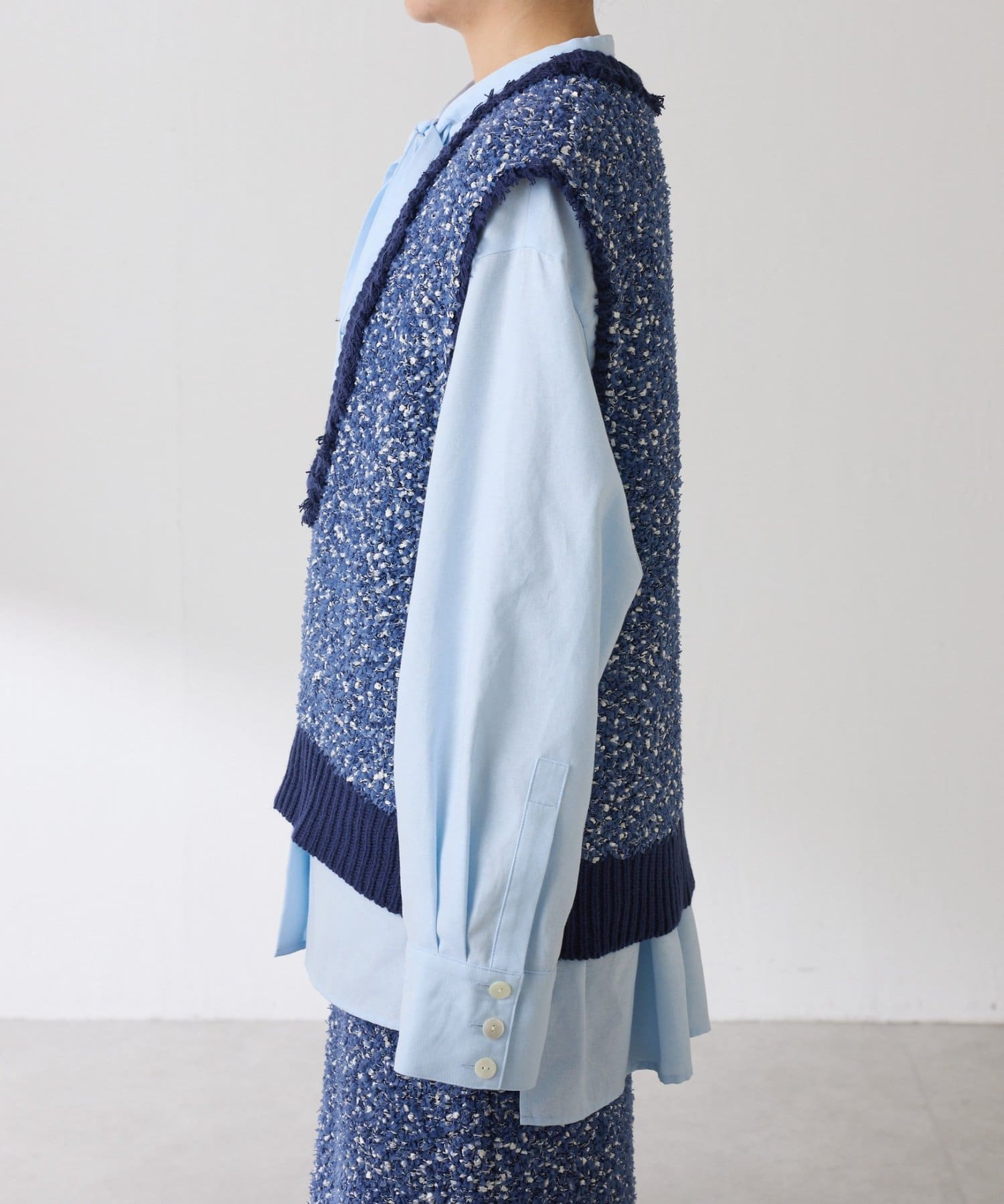 ・3種類の糸で凹凸感と色のミックス感を表現したツイード見えする深Uニットベスト。