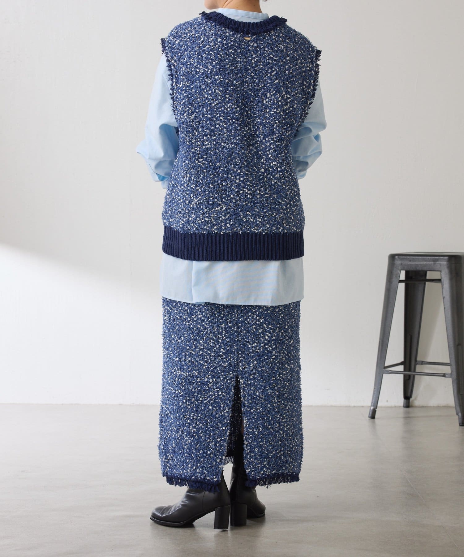 ・襟ぐりとアームホールのフリンジがよりツイード感を出してくれます◎