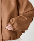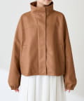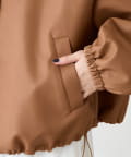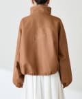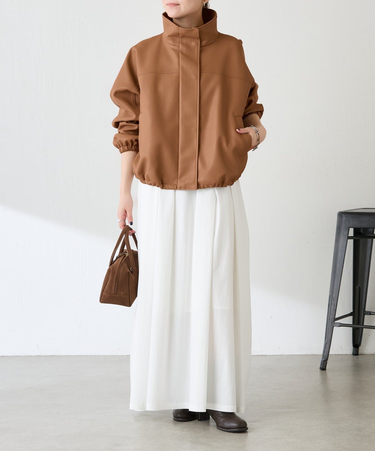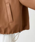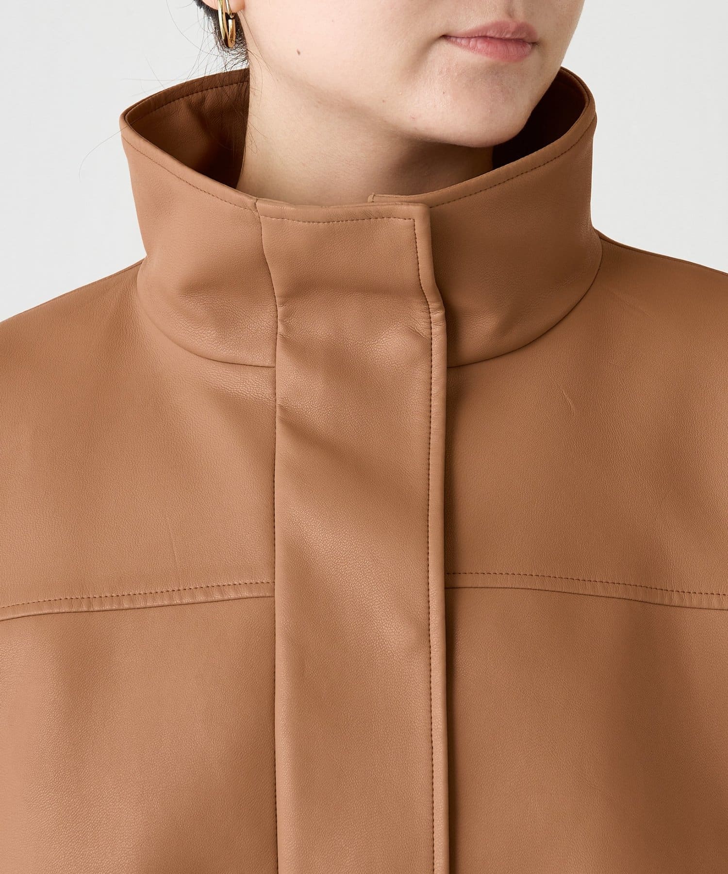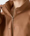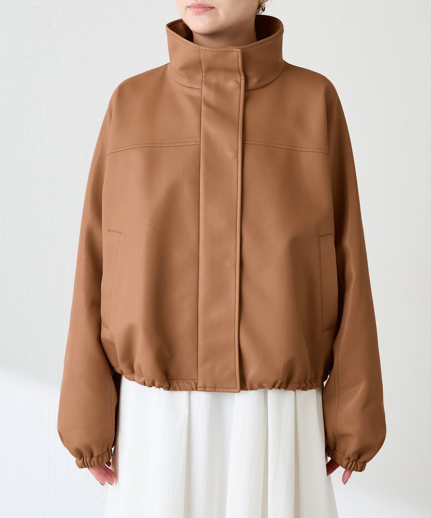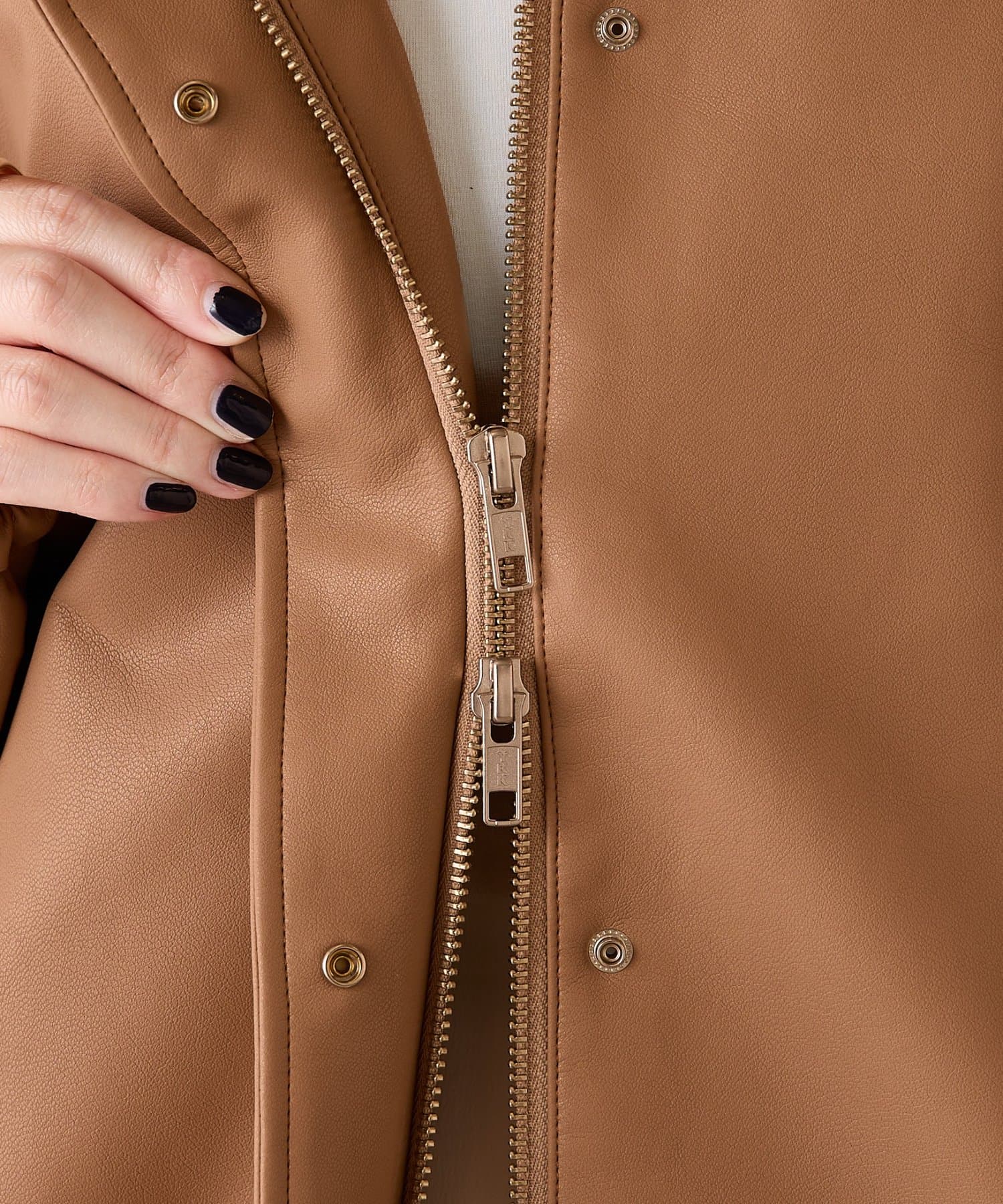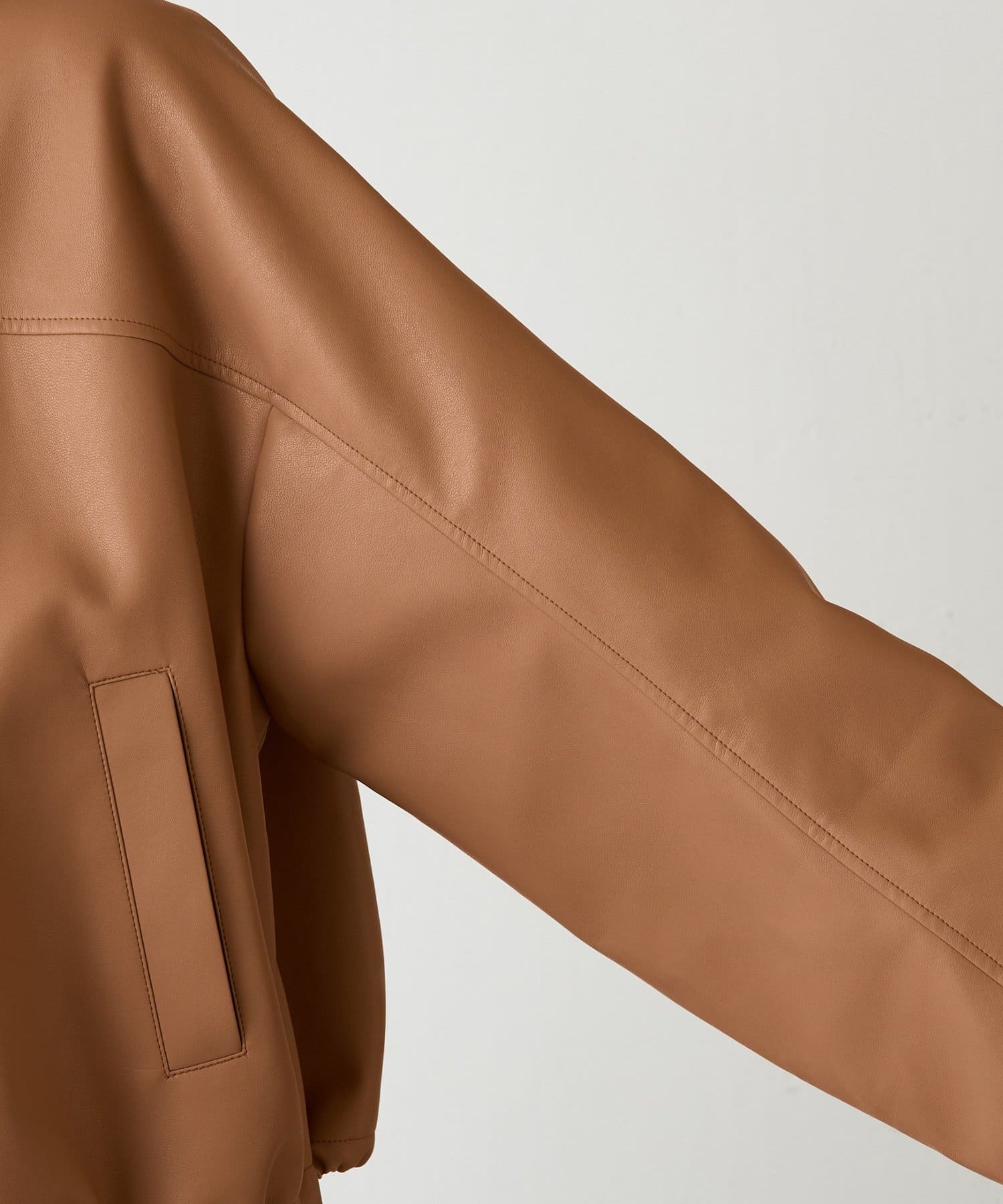 ・本物のレザーのような滑らかさと光沢感を再現したショートブルゾン。軽さのある着用感もポイント。
