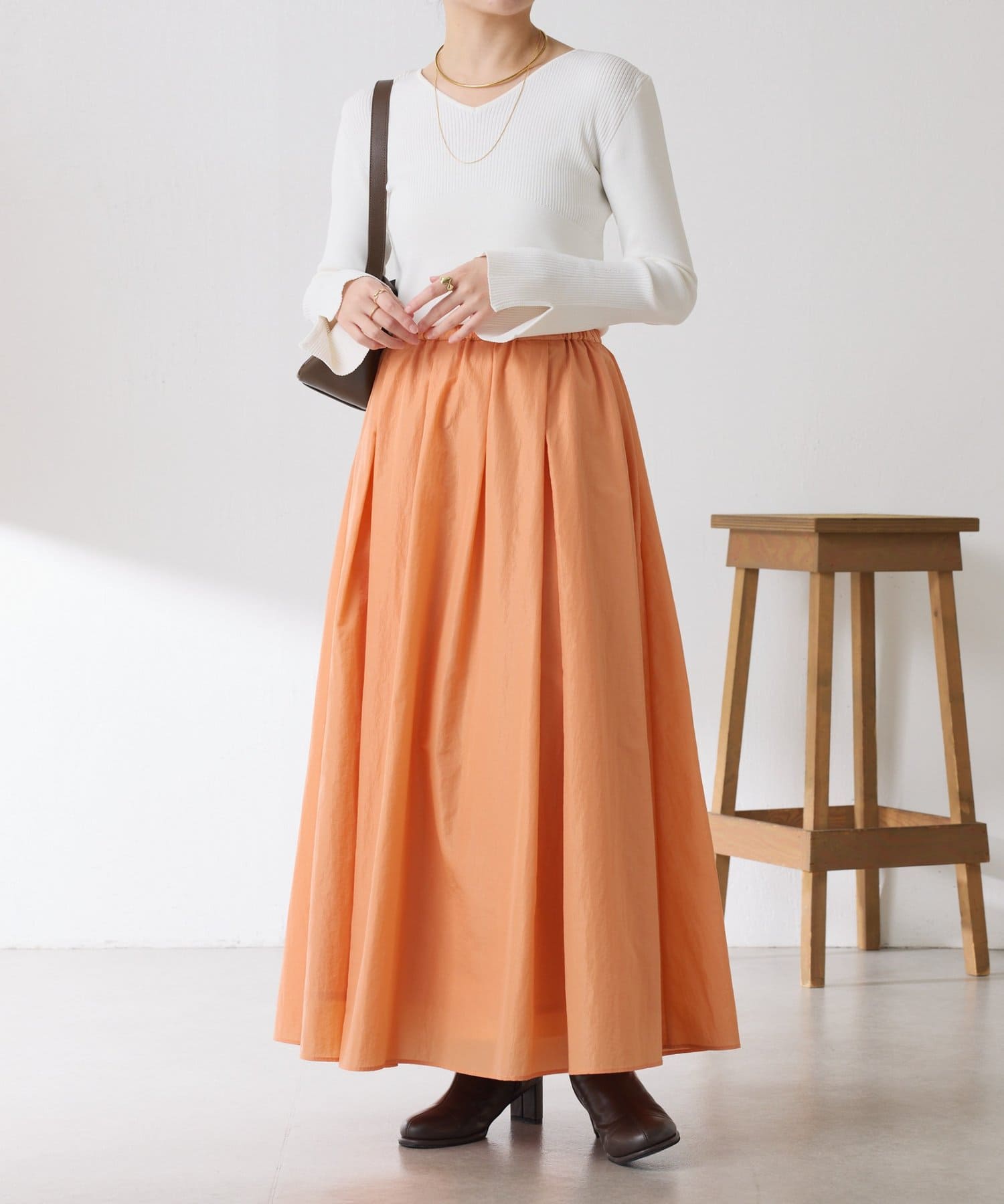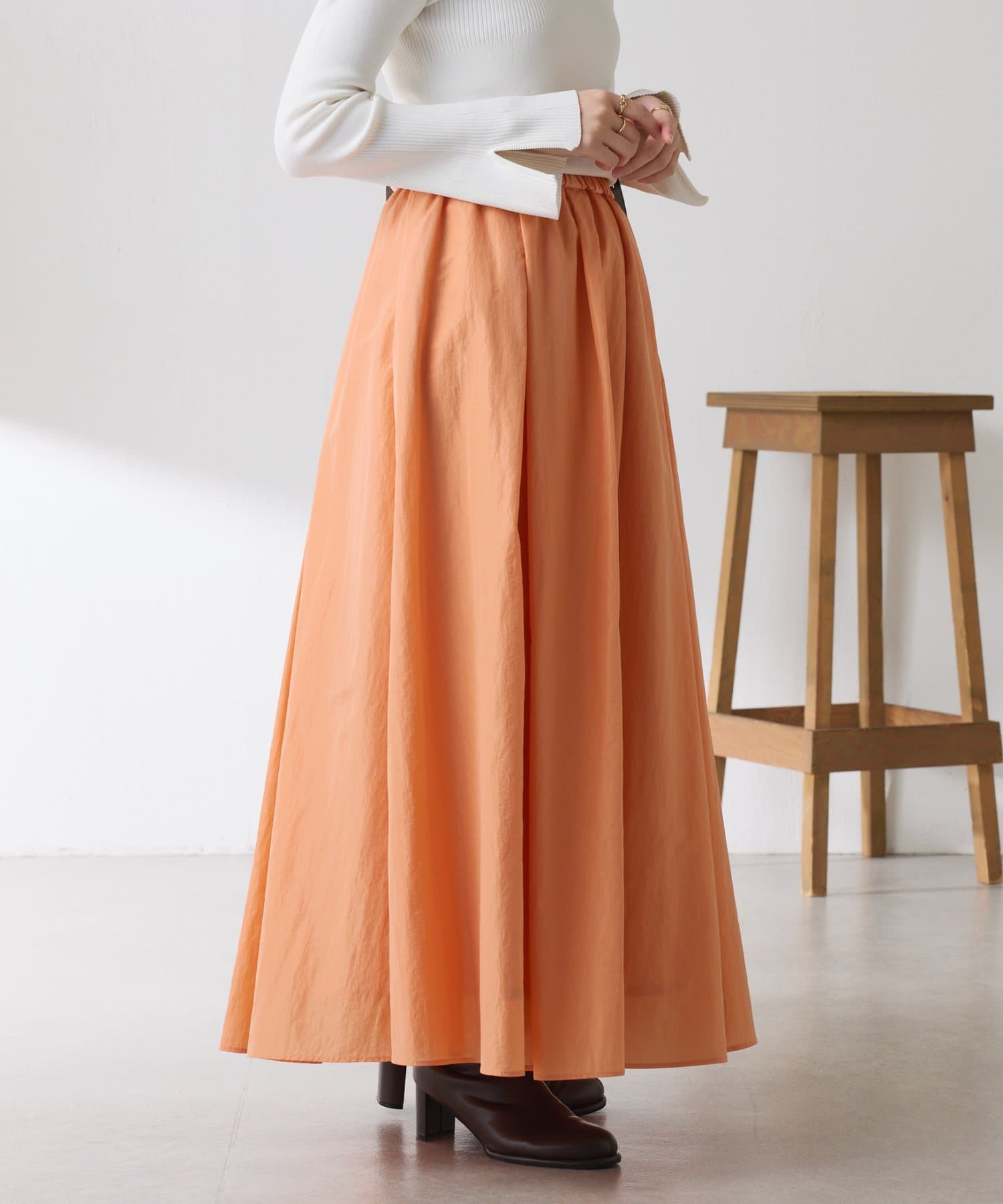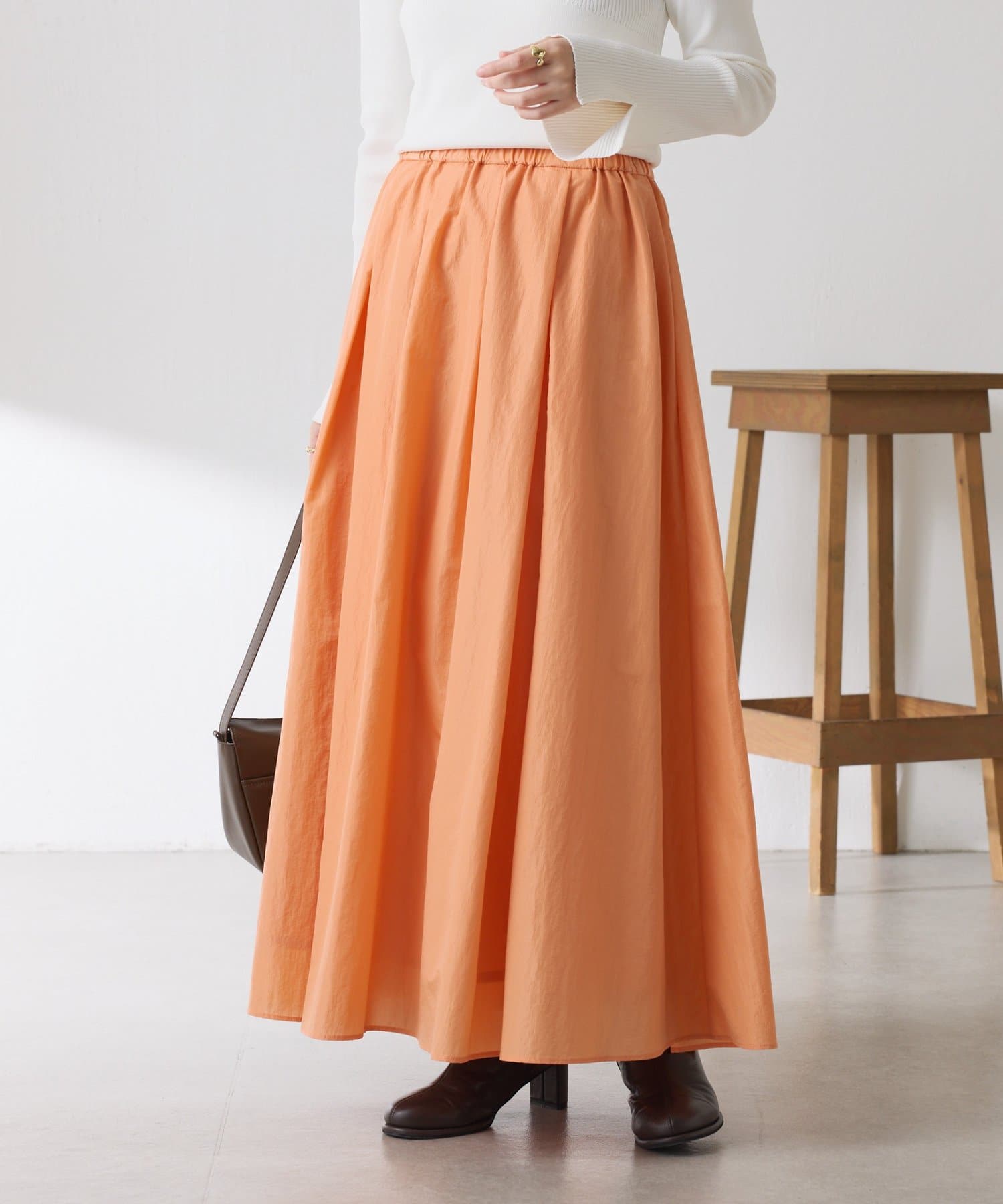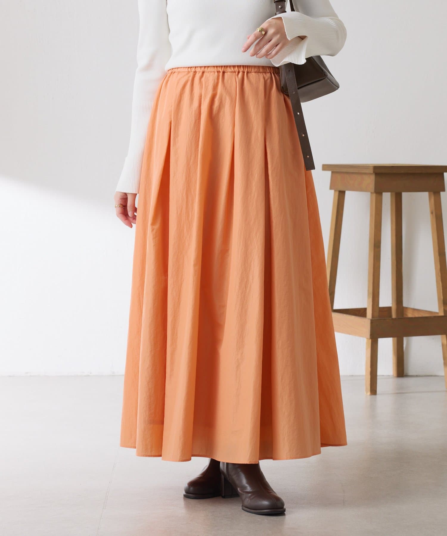 ・タックとギャザーでボリュームを出したコーデの主役になる華やかスカート。